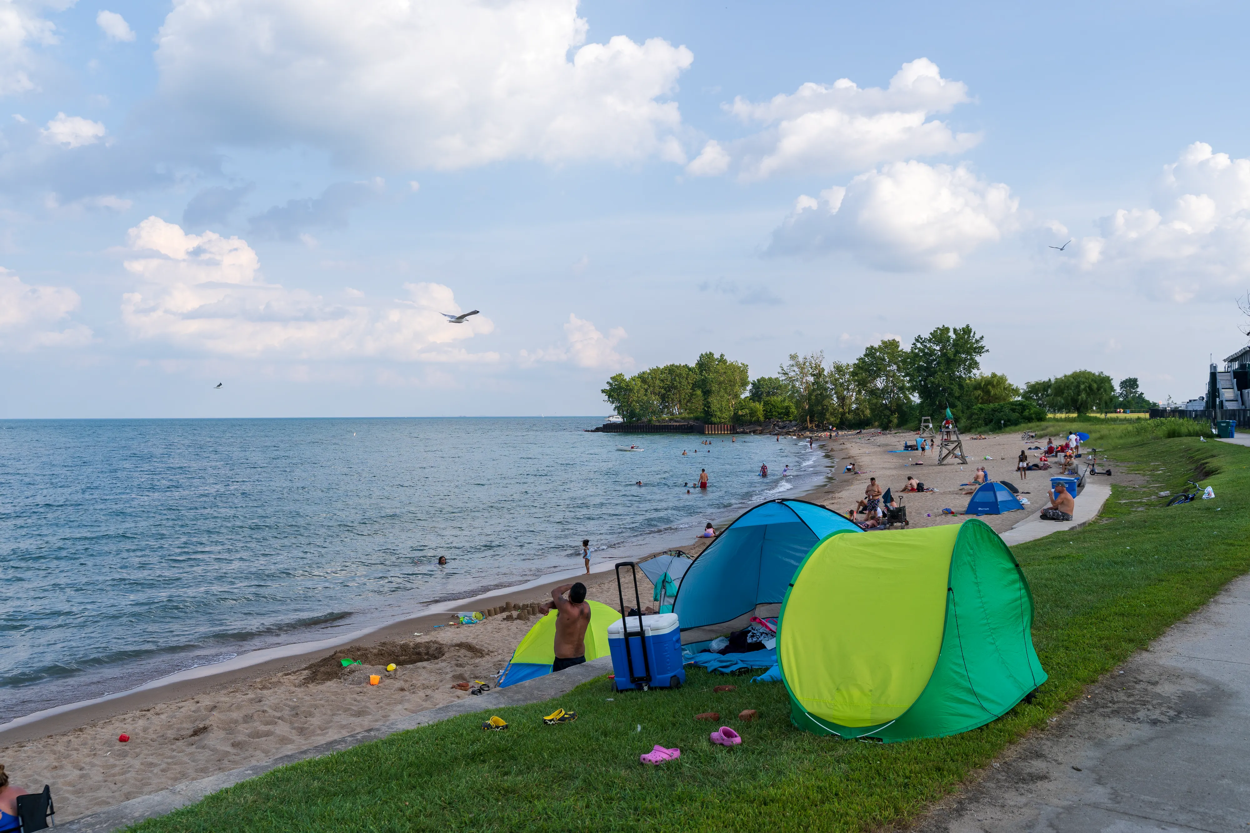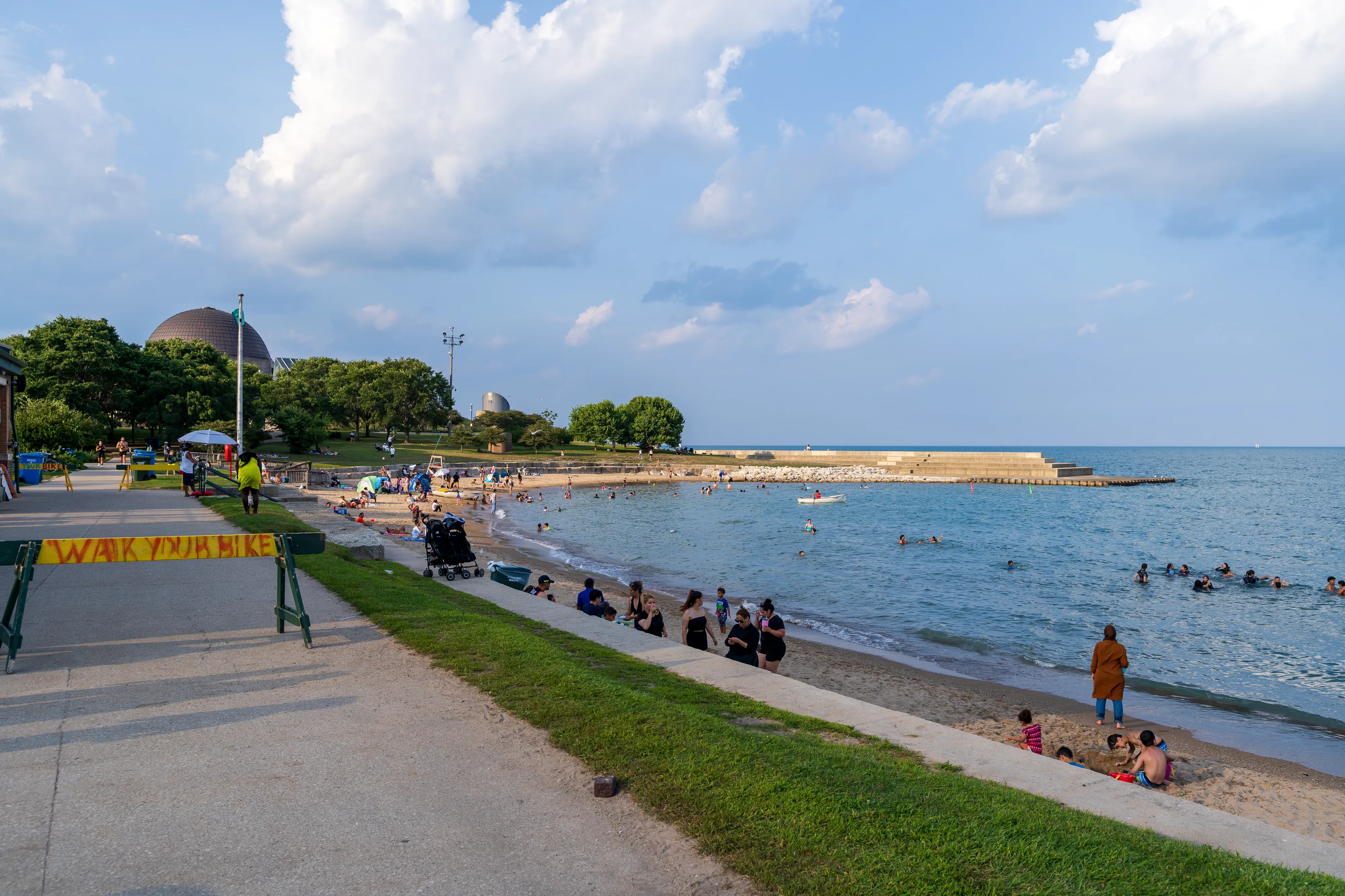 Nach einem kurzen Zwischenstopp im Hotel, um unsere Badesachen zu holen, spazieren wir zum Buckingham Fountain, folgen dem Lake Front Trail zum Shedd Aquarium und dem Adler Planetarium, bis wir schließlich am 12th Street Beach ankommen. Hier kann man ganz sicher unter der Aufsicht von vier Lifeguards baden - allerdings darf man nur (sehr) wenige Meter hinausschwimmen, bis einen einer der Bademeister aus seinem Ruderboot zurückpfeift. Trotz mehrfacher Versuche gelingt es mir nicht, mich in Wasser tiefer als 1,50m zu begeben. Punkt 19 Uhr allerdings ist Schichtende und die Badenden werden sich selbst überlassen.