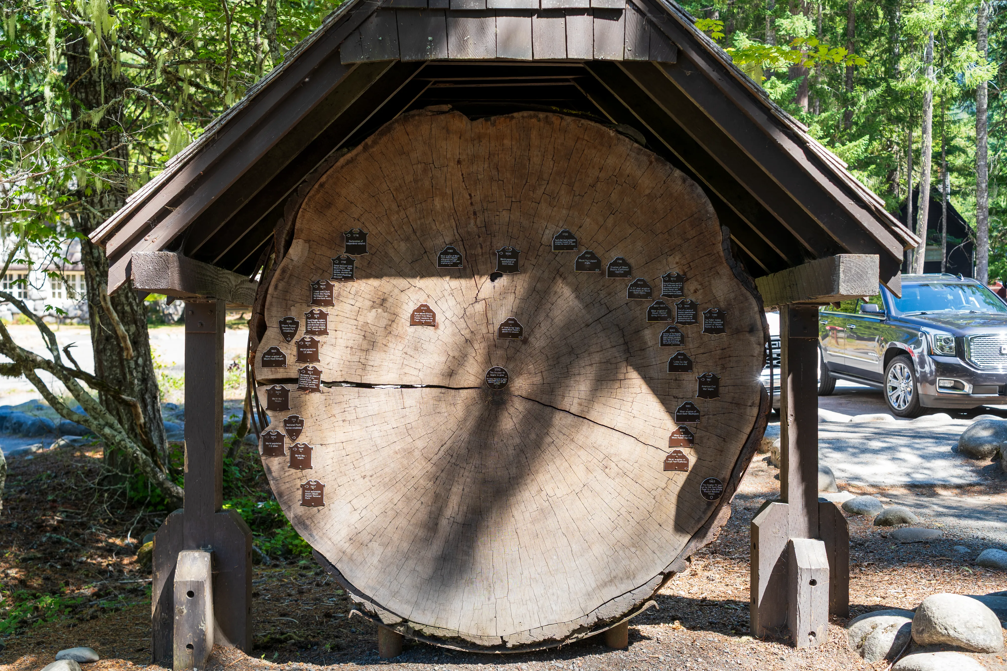Diese gigantische Douglasie begann 1293 zu wachsen und tat dies, bis sie 1963 gefällt wurde. Währendessen hat sie ziemlich viel erlebt, was mit den Markern bei den jeweiligen Jahresringen festgehalten ist.