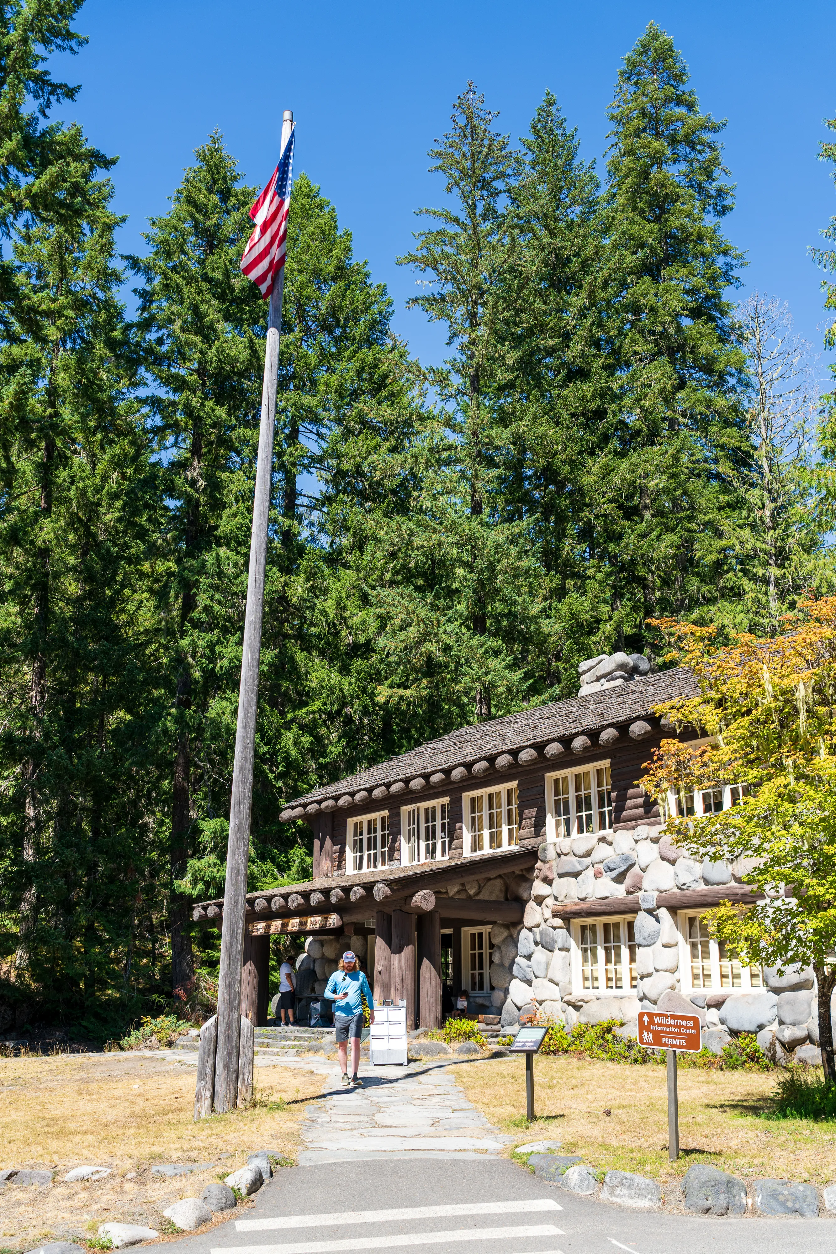 Nachdem wir uns im Longmire Museum über den Vulkan und seine Gletscher informiert haben, machen wir einen Stopp im Wilderness Center, um nach Walk-up Permits zu fragen. Dies sind Campingberechtigungen (“Backcountry Permits”), die man spontan für die kommende Nacht direkt beim Ranger bekommen kann - also das Gegenstück zu den bereits vorab online gebuchten Permits. Und siehe da, wir haben Glück: Es sind sogar noch einige attraktive Permits vorhanden. Wir entscheiden uns für das Glacier Basin Camp, welches in der Sunrise Area liegt, die sich wiederum im subalpinen Parkteil befindet. Eigentlich wollten wir uns noch die Region Paradise anschauen, welche in den Wäldern unterhalb des Mount Rainier liegt, aber dazu fehlt uns leider die Zeit. Denn die Anfahrt zum Glacier Basin Trail - von wo wir zu unserem Camp wandern wollen - führt einmal quer durch den Park, wird zusätzlich durch Bauarbeiten behindert und deshalb noch ca. 2 Stunden in Anspruch nehmen.