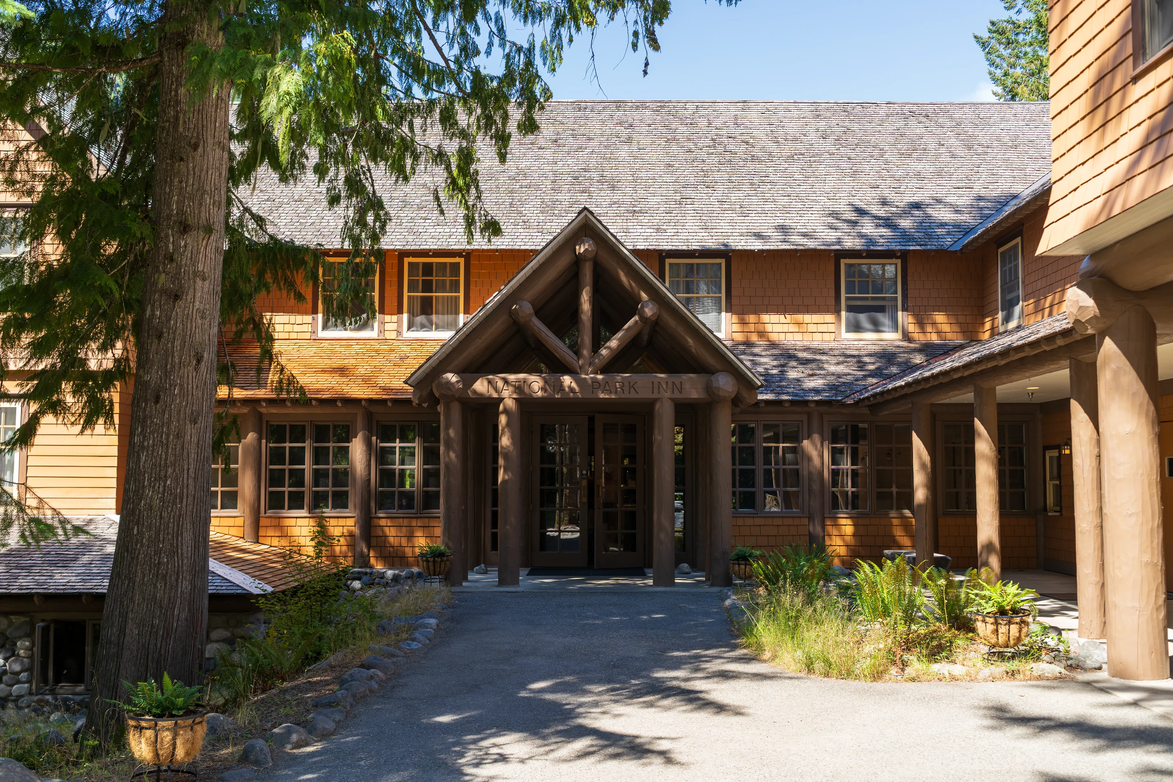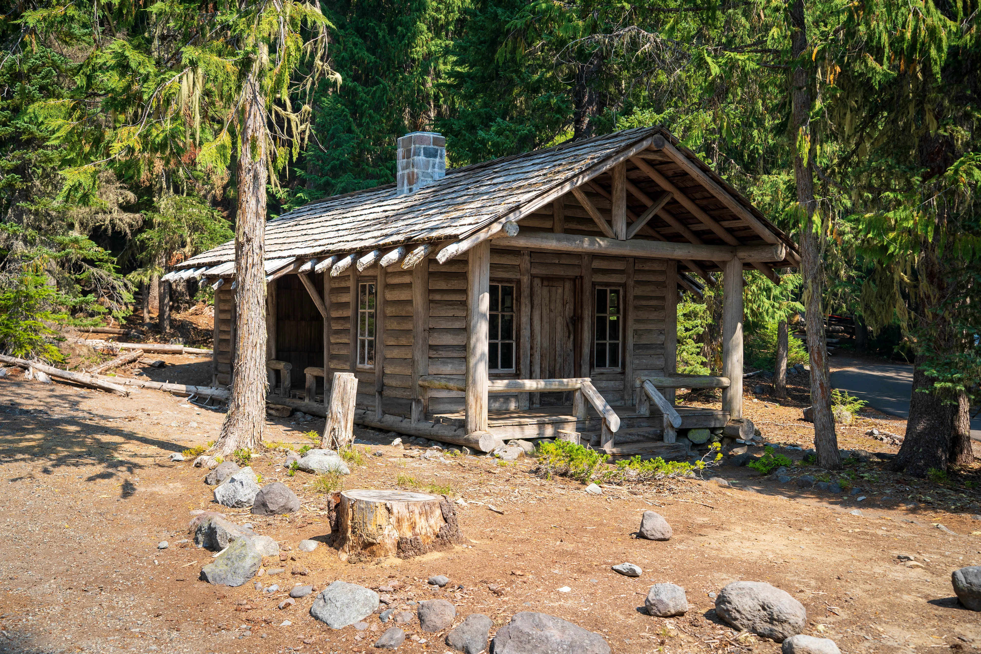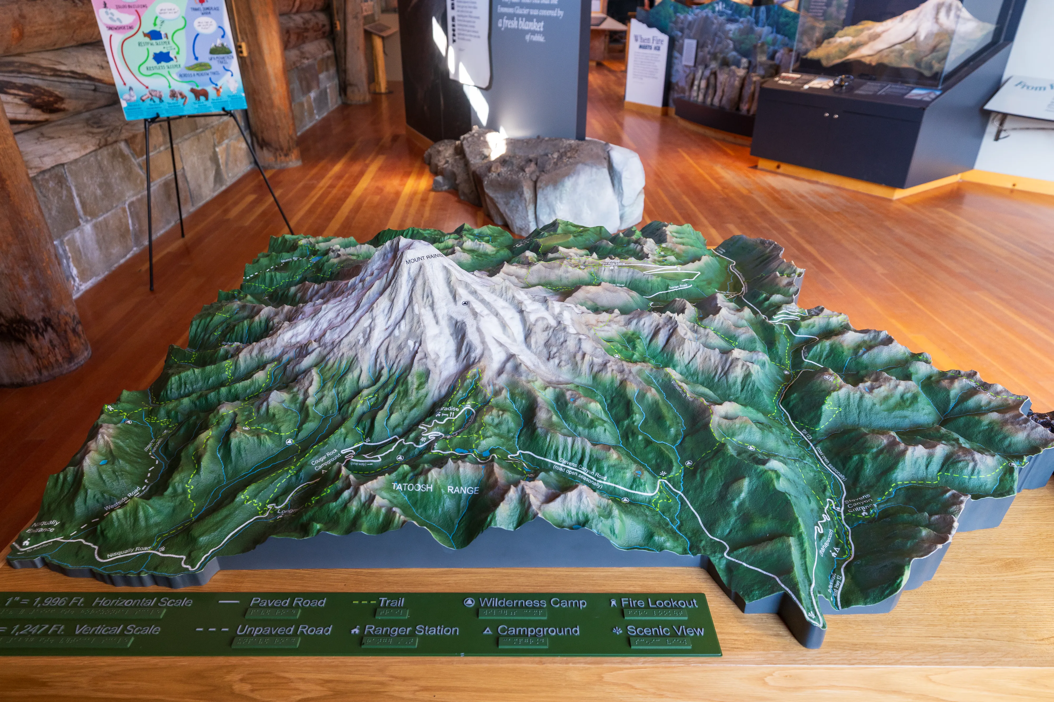 Wir erreichen, nach einem kleinen Stau beim Parkeingang, das Longmire Visitor Center. Hier befindet sich das Wilderness Center, ein kleines Museum sowie ein Shop und ein Hotel - alles im Stil von historischen Blockhütten.