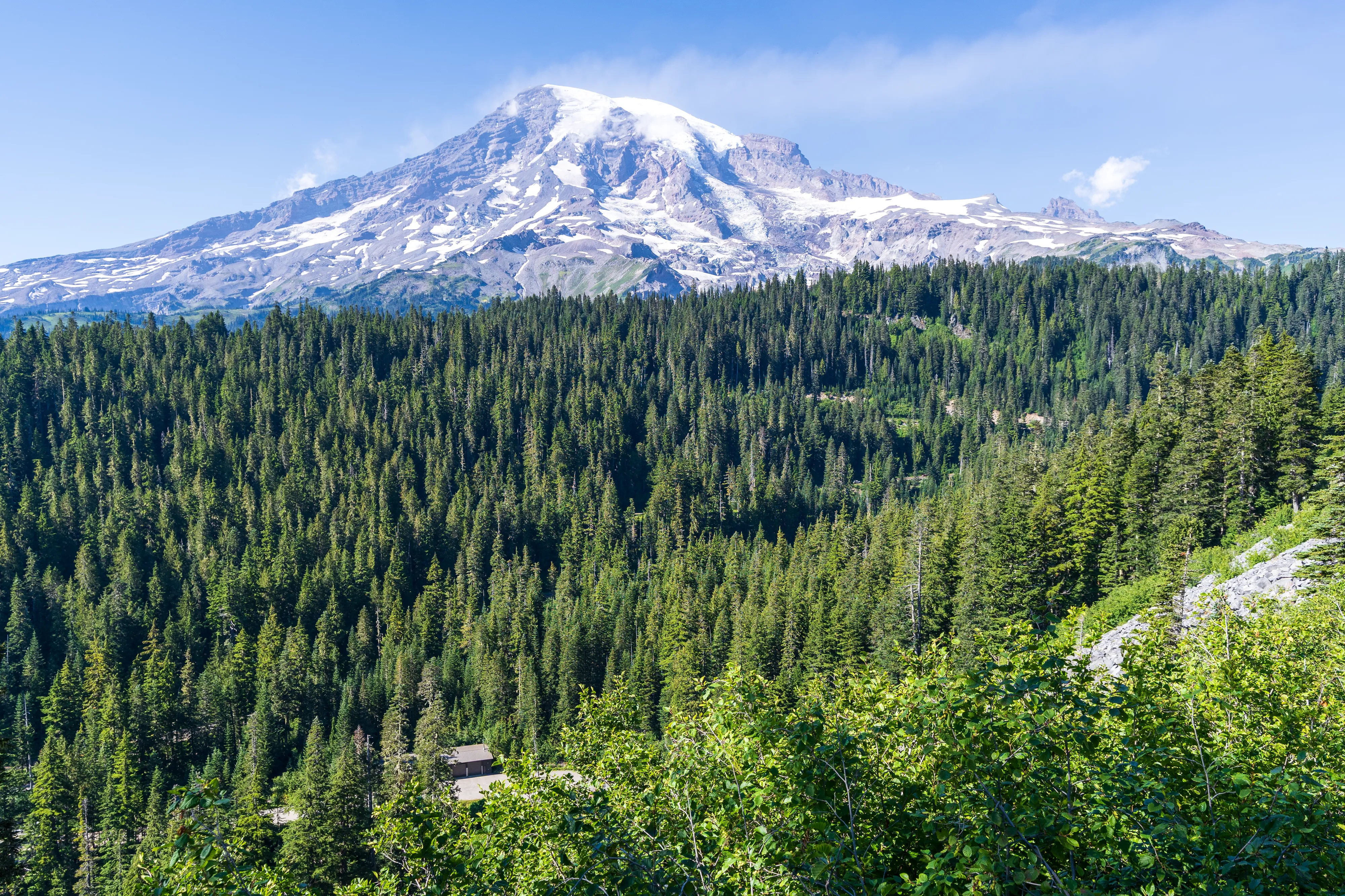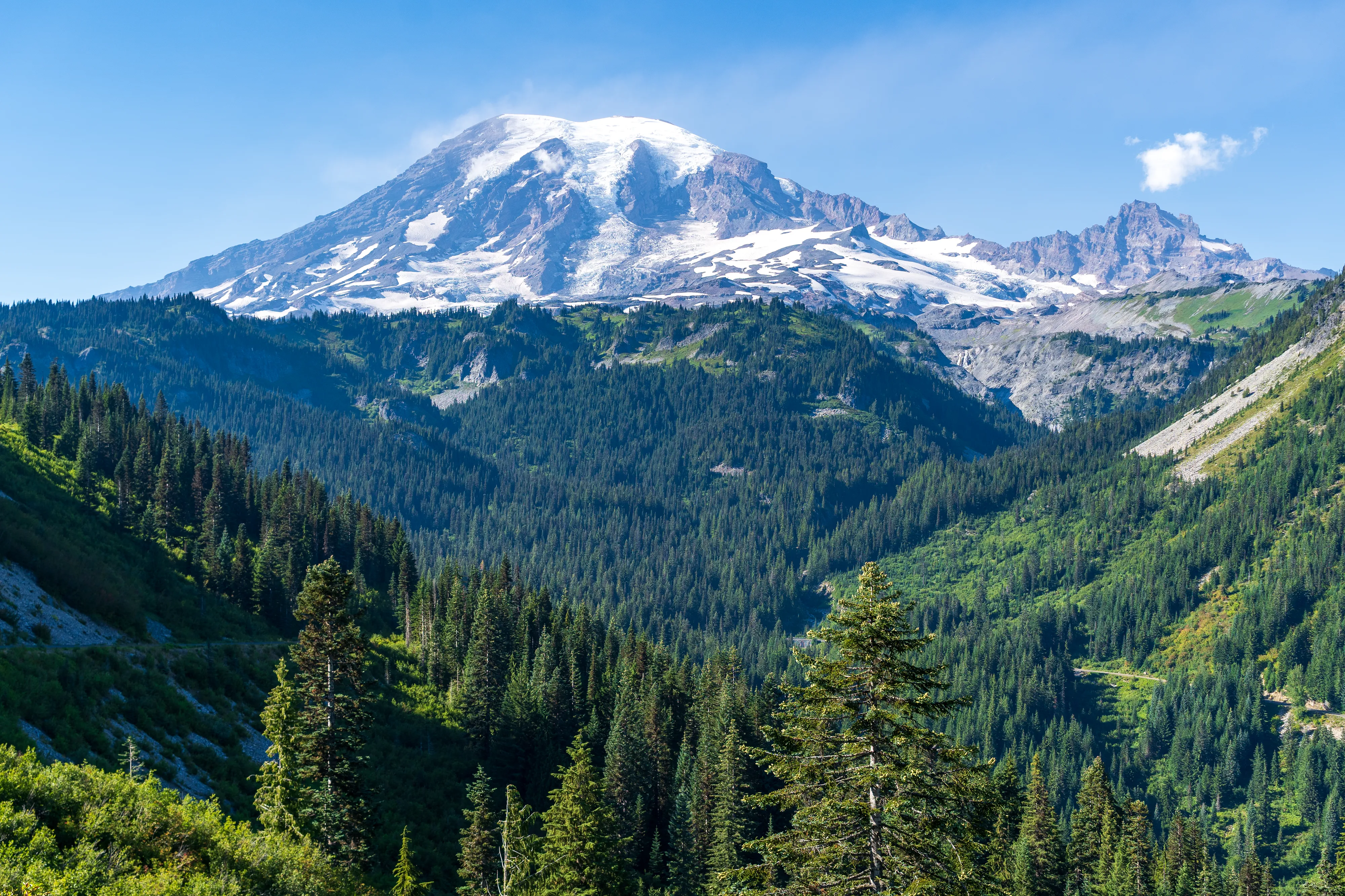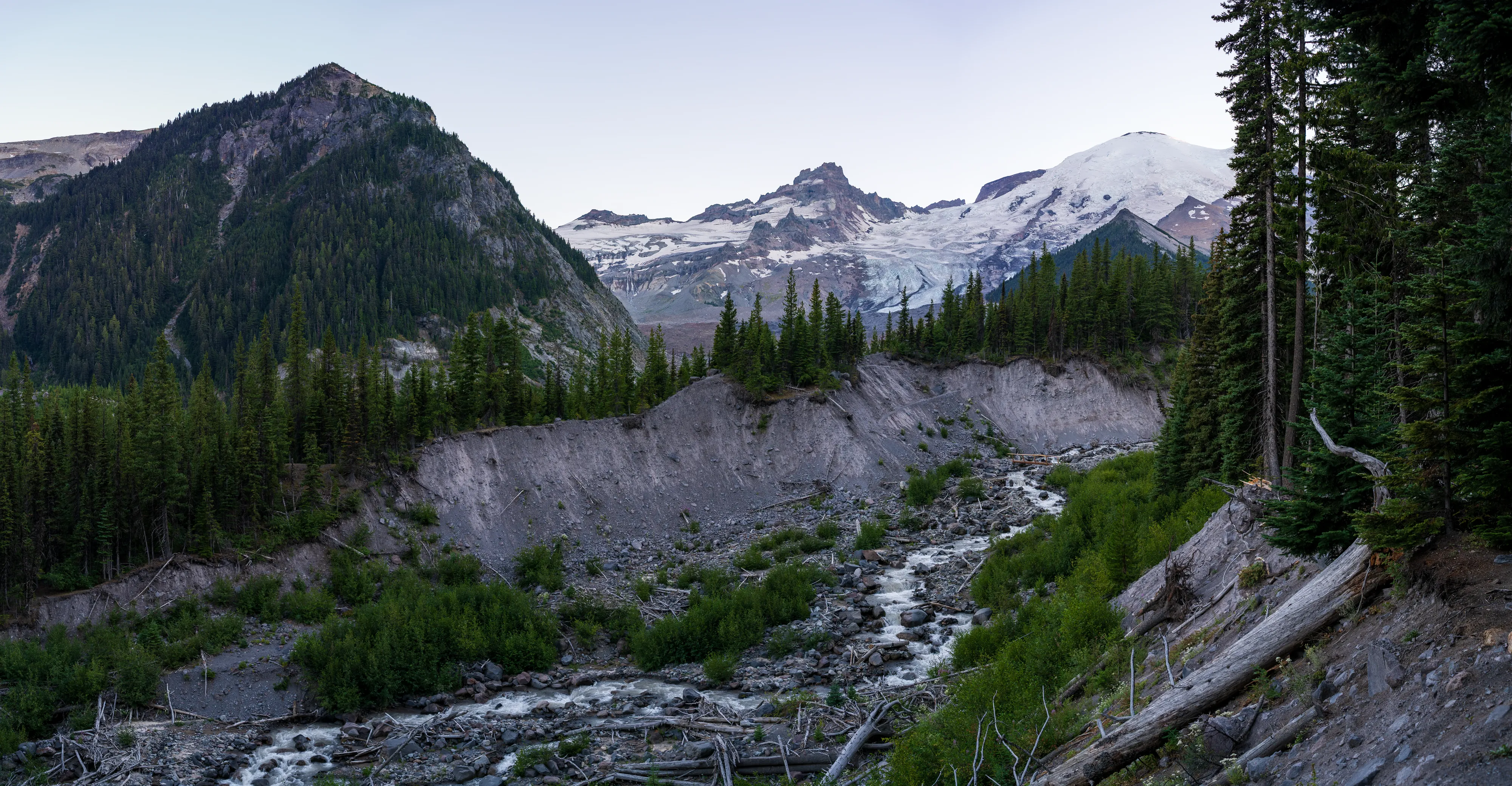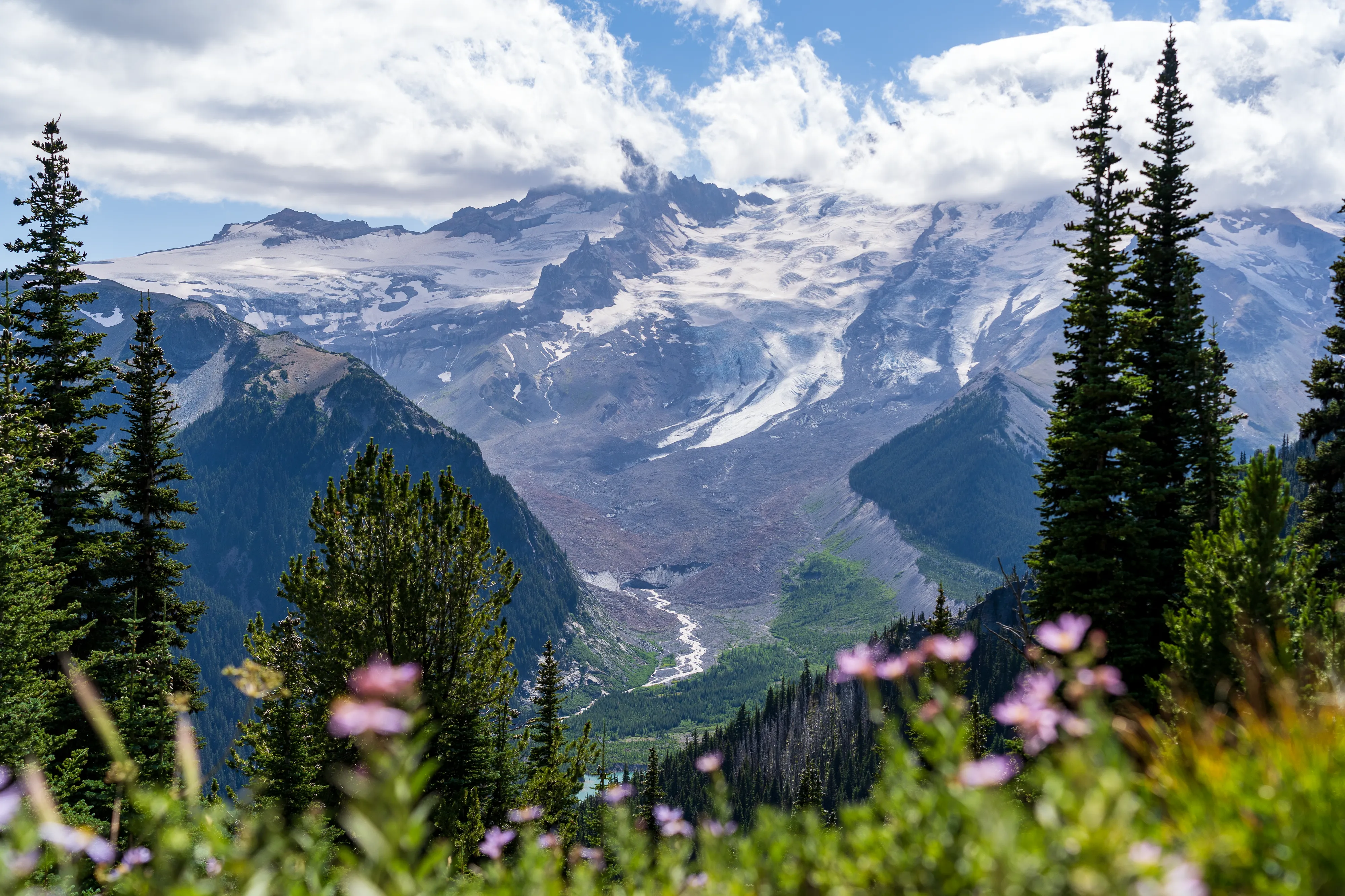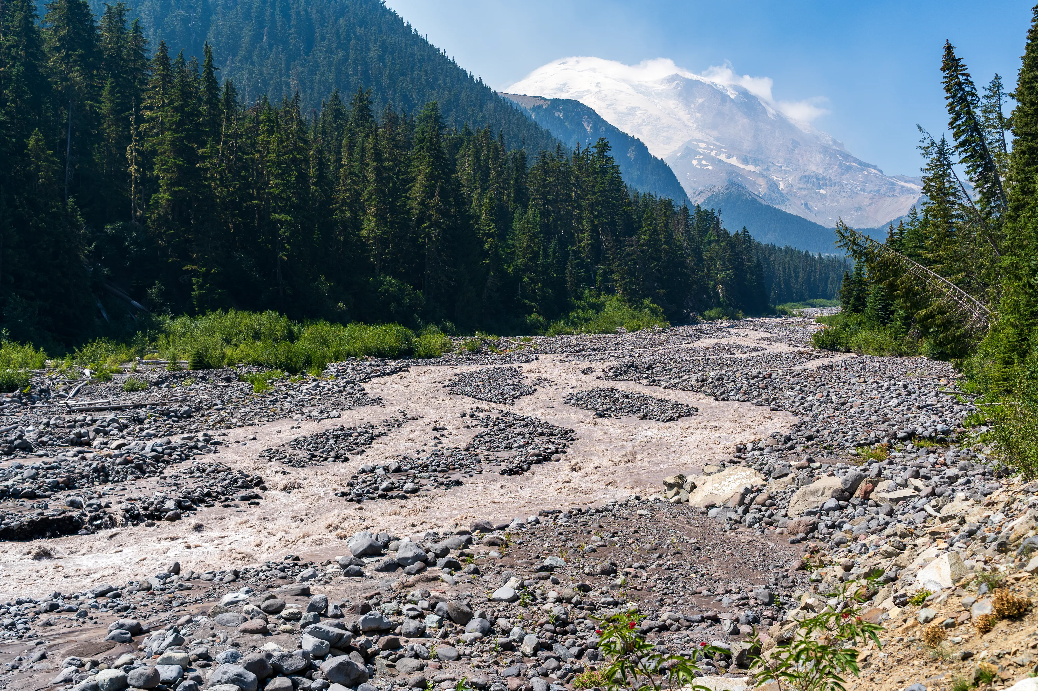 Der Mount Rainier ist ein aktiver Vulkan mit der größten Gletscheranzahl in den “Lower 48”, das heißt in den 48 zusammenhängenden US-Staaten - also ohne Alaska und Hawaii (diesen Begriff verwendet man hier gerne, um Superlative zu definieren - die, in der Regel Alaska, ansonsten trumpfen würde). Ganze 25 Gletscher bedecken den Mount Rainier, wobei der Emmons Gletscher der Größte ist - auch in den “Lower 48”. Durch einen Erdrutsch des nahegelegenen Tacoma Peaks ist der untere Teil des Gletschers von einer Geröllschicht bedeckt - dies führt dazu, dass im Sommer weniger des Gletschers abschmilzt, wenn auch leider immer noch genug, um ihn im Jahresmittel schrumpfen zu lassen. In den tieferen Ebenen des Nationalparks befinden sich alte Wälder, wohingegen Richtung Gletscher ein subalpines Klima herrscht.