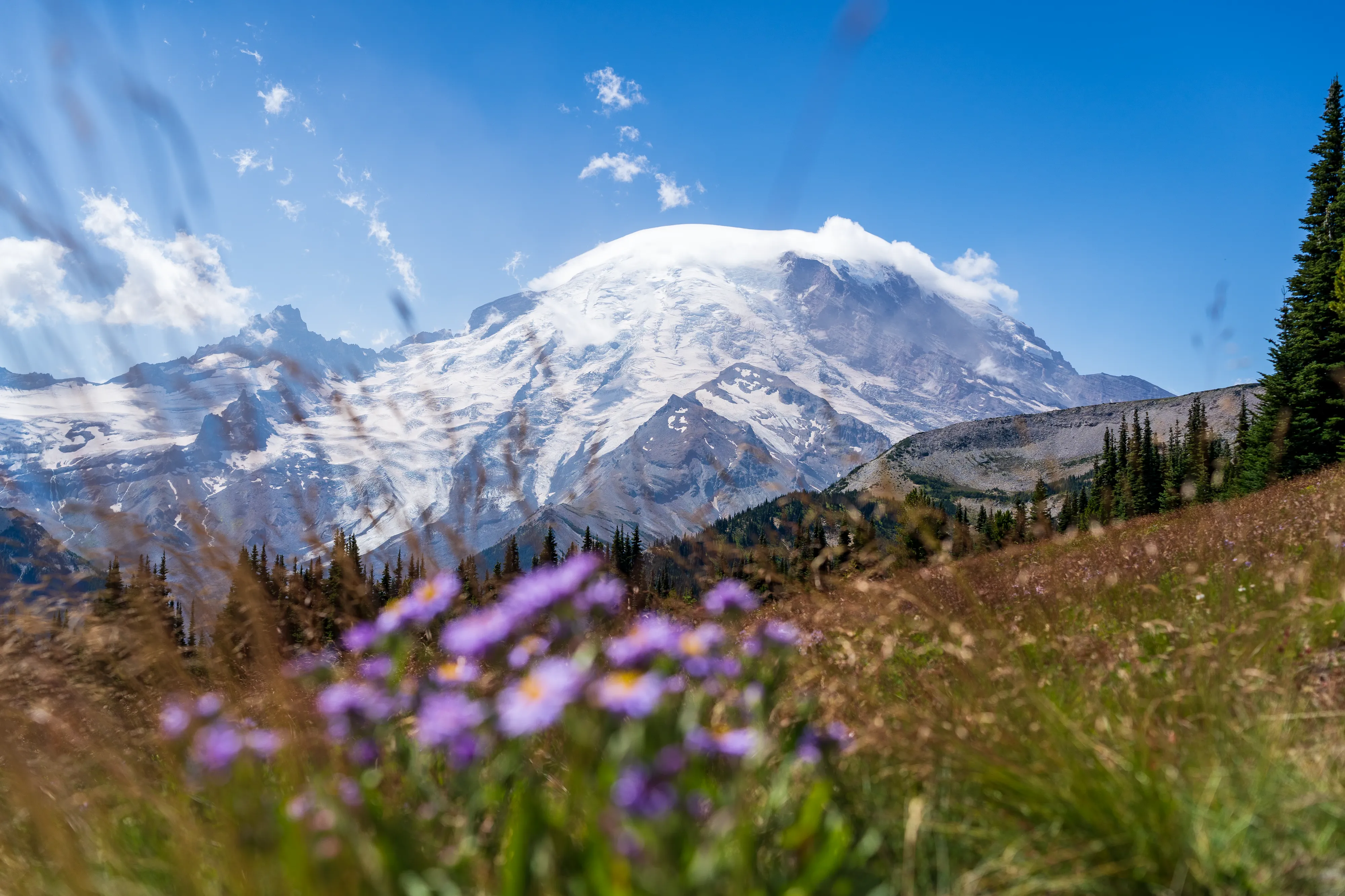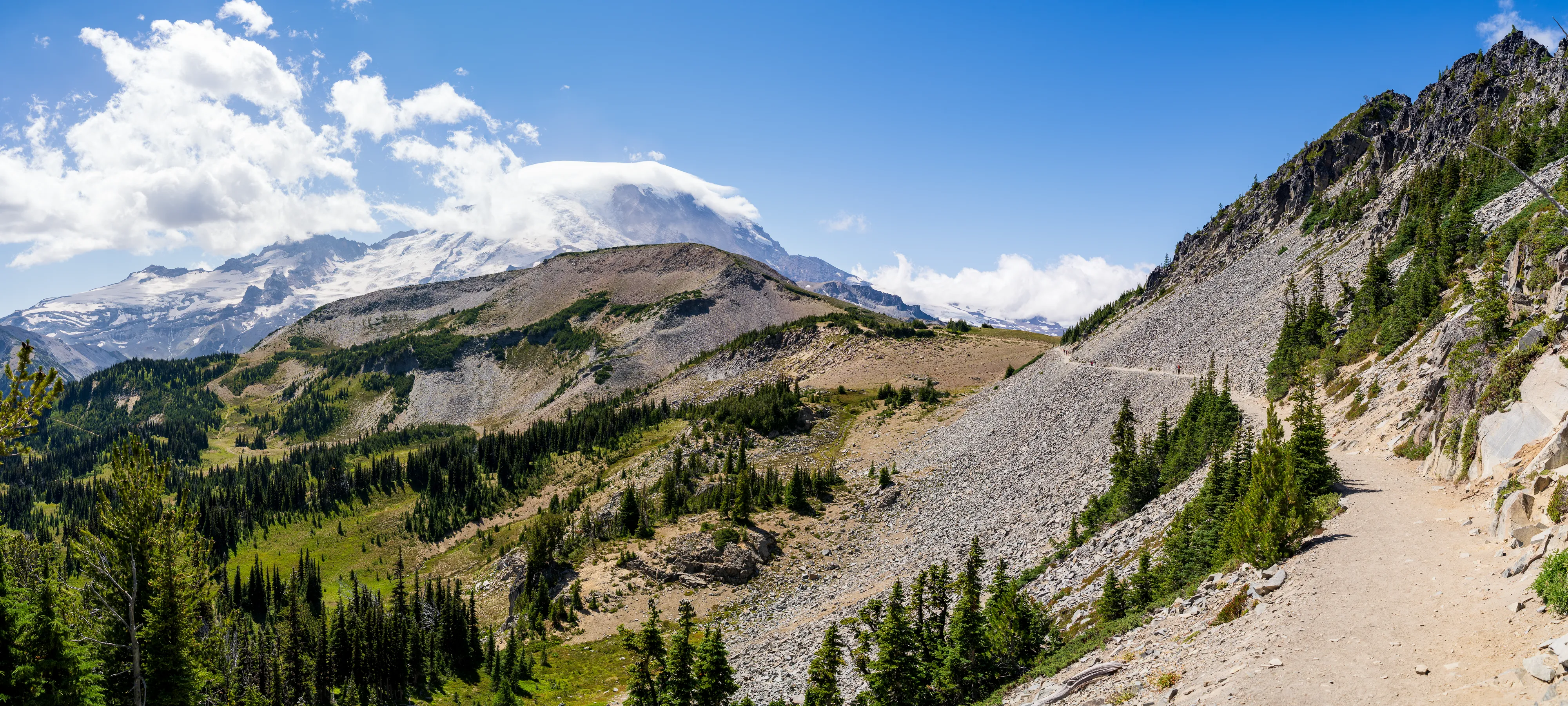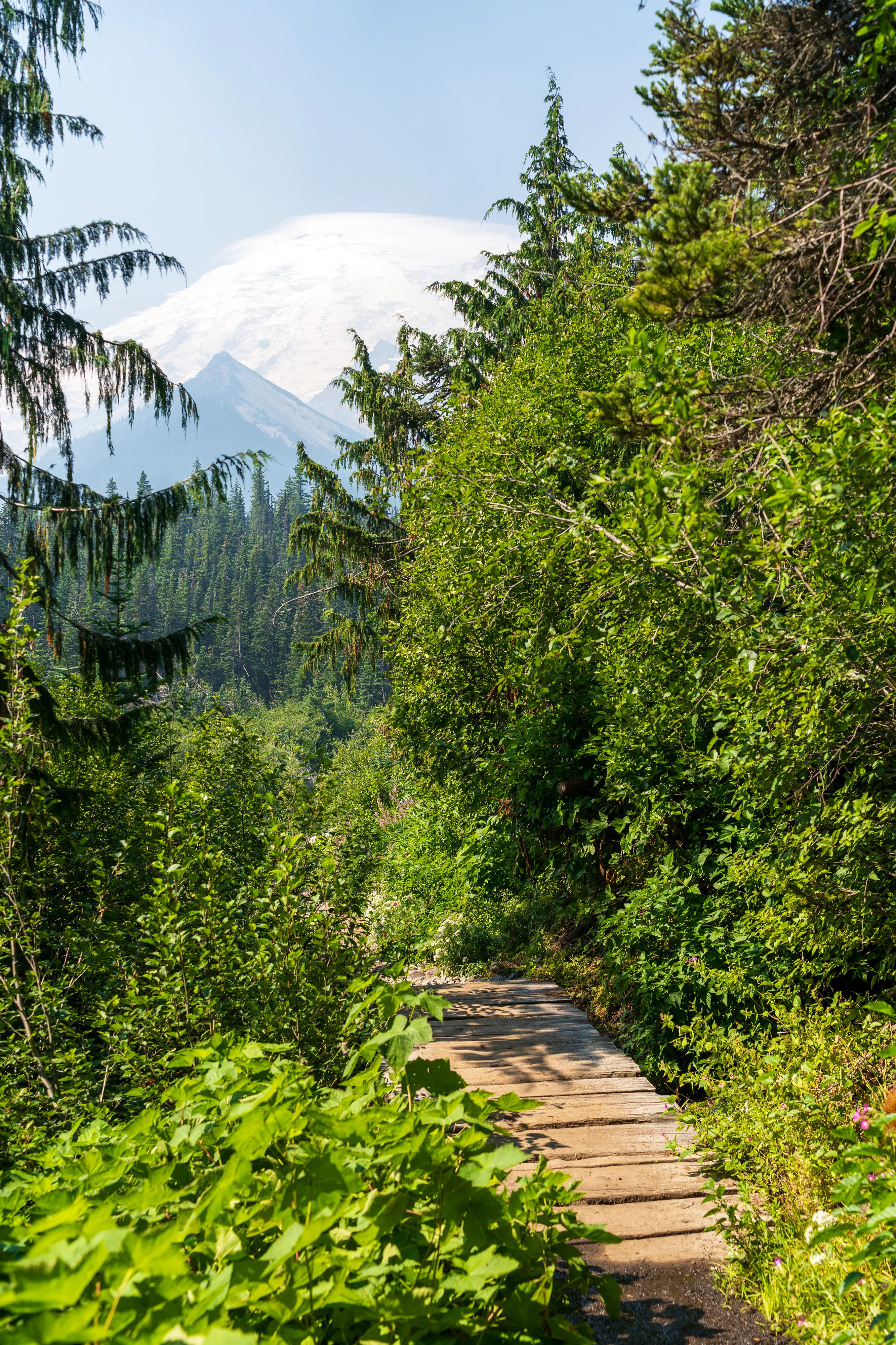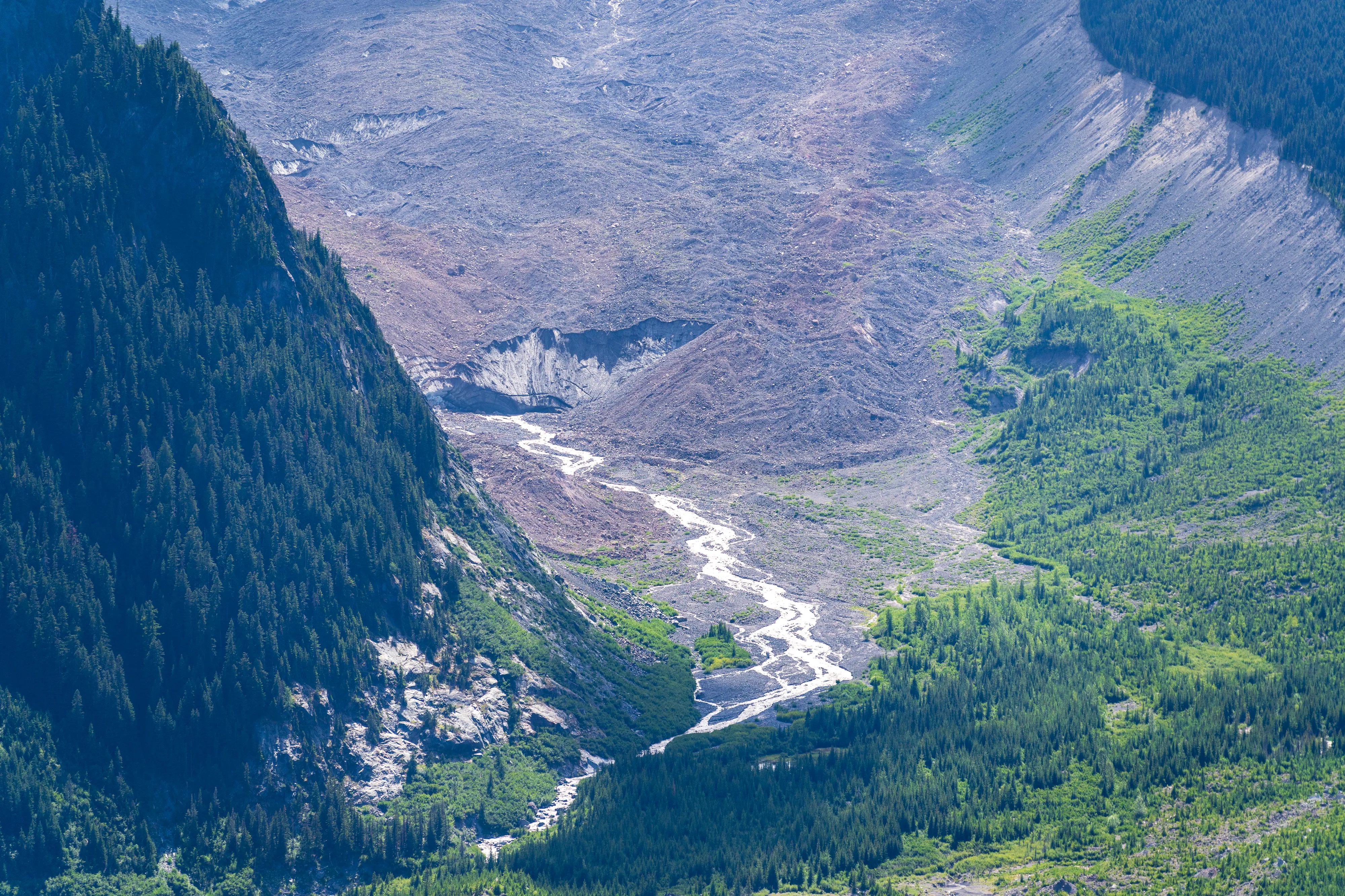 Der Mount Rainier ist ein aktiver Vulkan mit der größten Gletscheranzahl in den “Lower 48”, das heißt in den 48 zusammenhängenden US-Staaten - also ohne Alaska und Hawaii (diesen Begriff verwendet man hier gerne, um Superlative zu definieren - die, in der Regel Alaska, ansonsten trumpfen würde). Ganze 25 Gletscher bedecken den Mount Rainier, wobei der Emmons Gletscher der Größte ist - auch in den “Lower 48”. Durch einen Erdrutsch des nahegelegenen Tacoma Peaks ist der untere Teil des Gletschers von einer Geröllschicht bedeckt - dies führt dazu, dass im Sommer weniger des Gletschers abschmilzt, wenn auch leider immer noch genug, um ihn im Jahresmittel schrumpfen zu lassen. In den tieferen Ebenen des Nationalparks befinden sich alte Wälder, wohingegen Richtung Gletscher ein subalpines Klima herrscht.