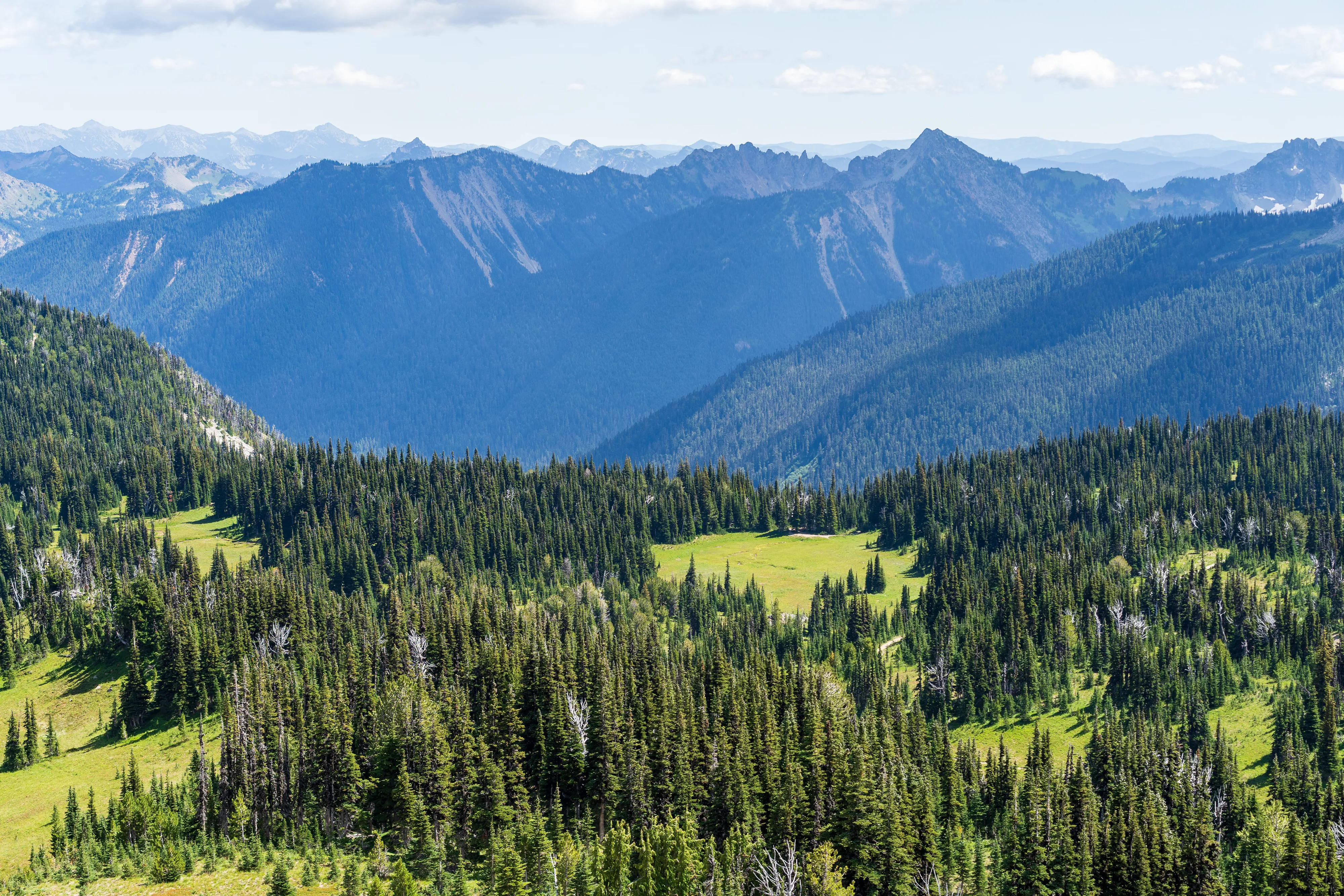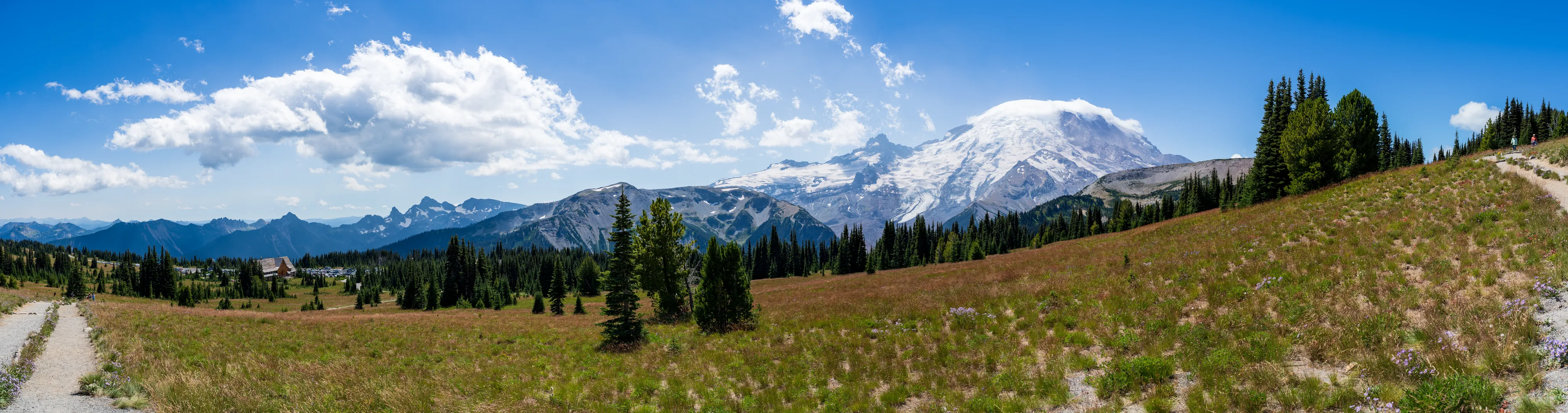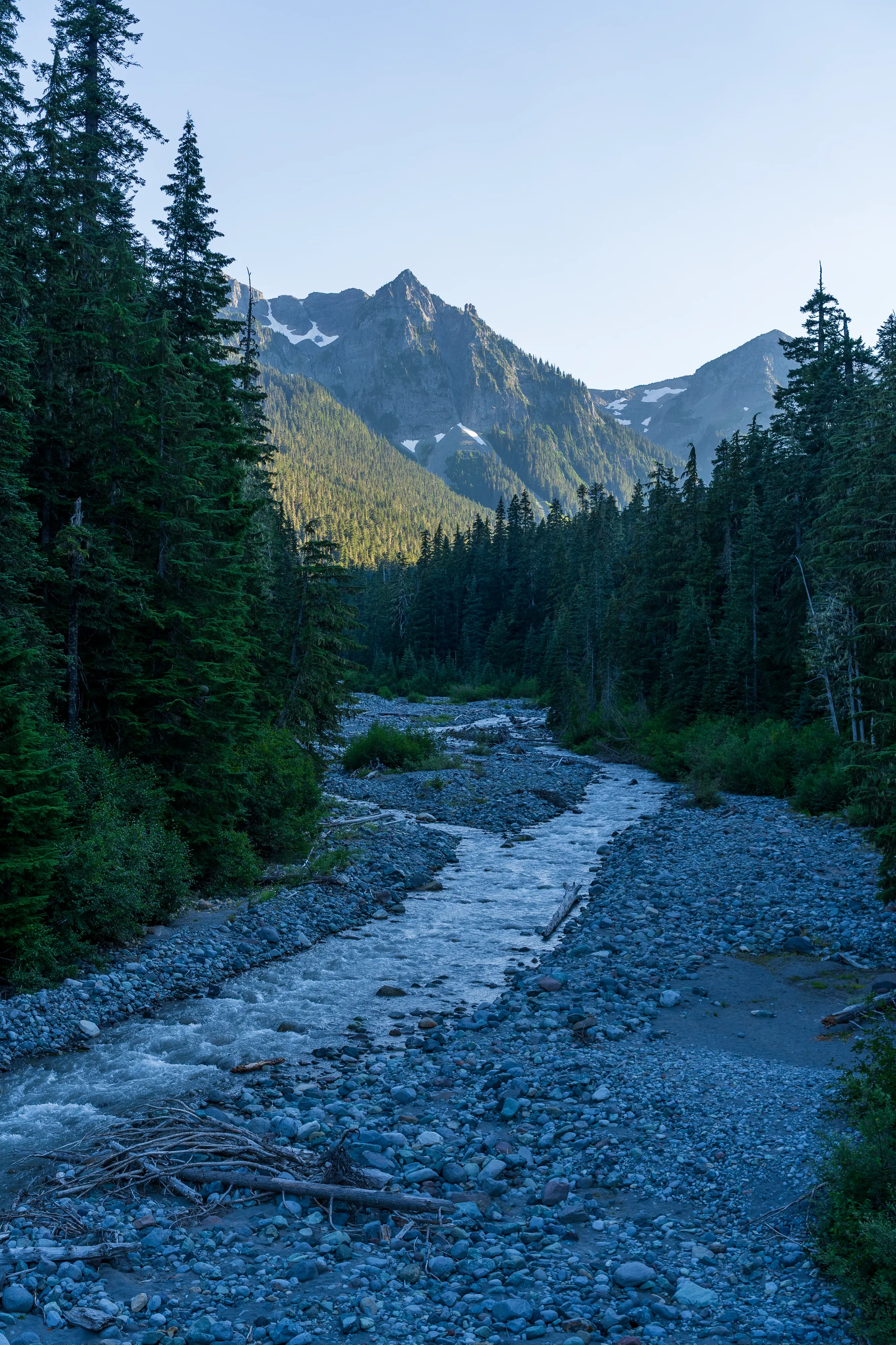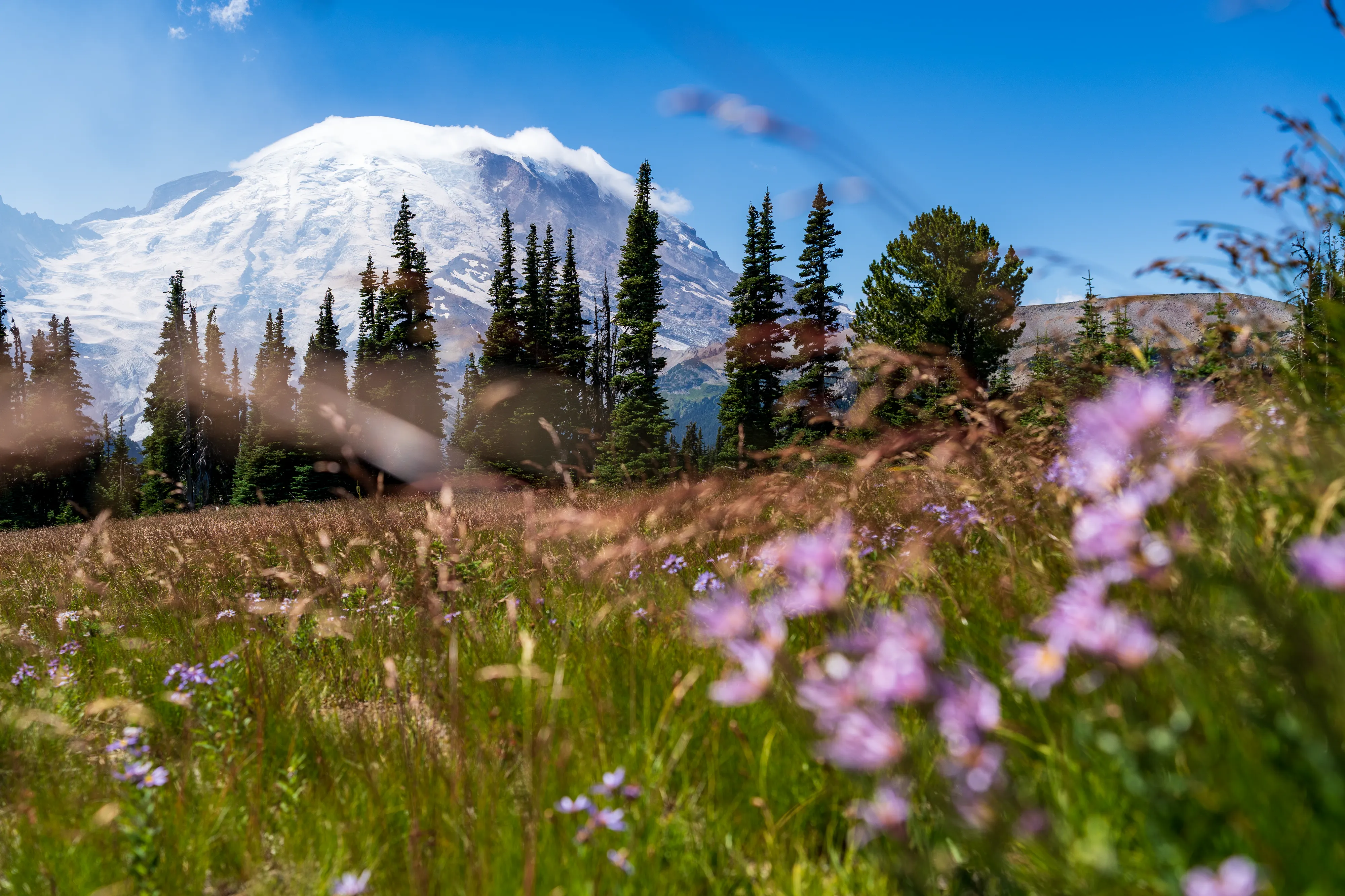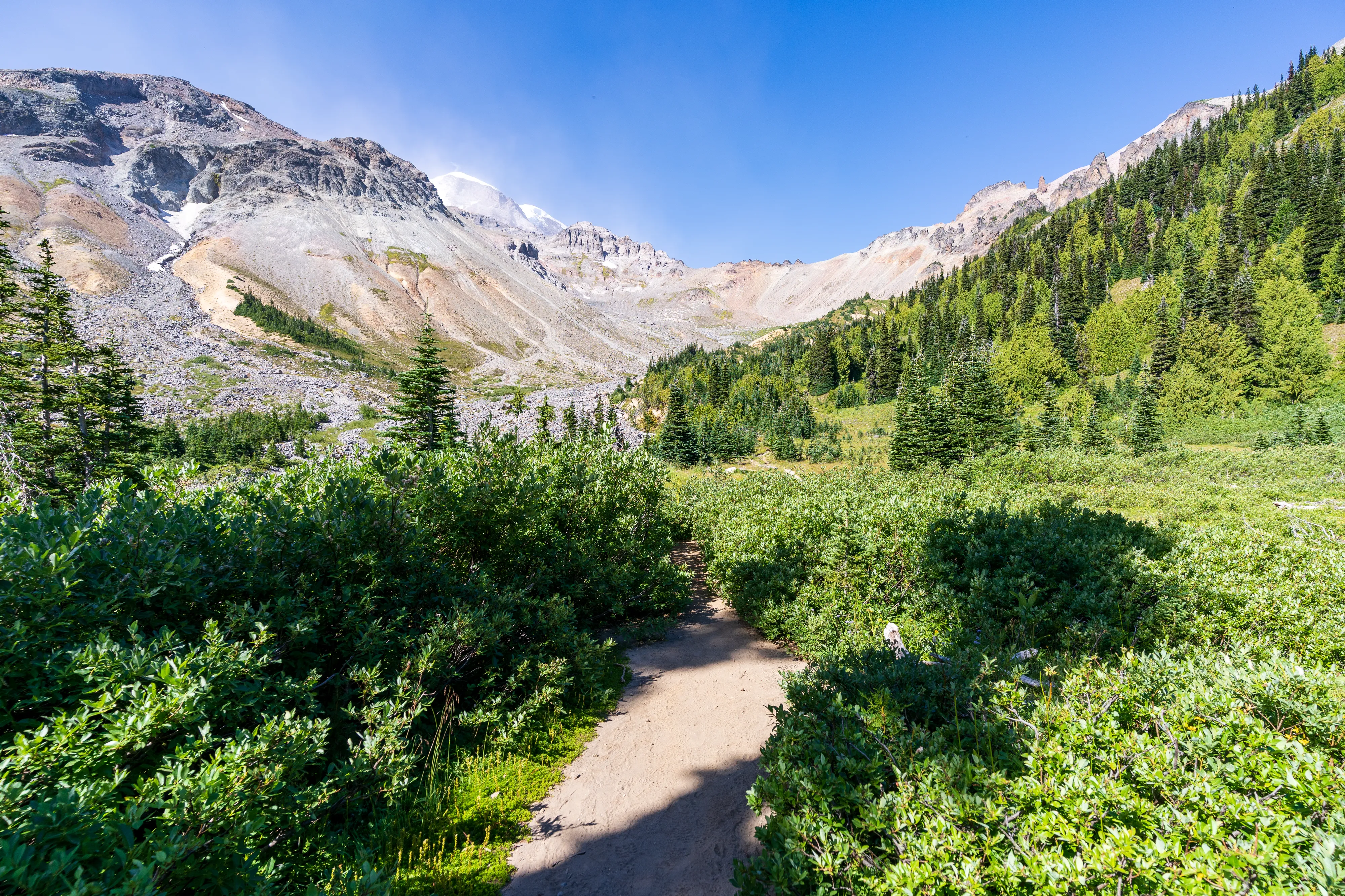 Der Mount Rainier ist ein aktiver Vulkan mit der größten Gletscheranzahl in den “Lower 48”, das heißt in den 48 zusammenhängenden US-Staaten - also ohne Alaska und Hawaii (diesen Begriff verwendet man hier gerne, um Superlative zu definieren - die, in der Regel Alaska, ansonsten trumpfen würde). Ganze 25 Gletscher bedecken den Mount Rainier, wobei der Emmons Gletscher der Größte ist - auch in den “Lower 48”. Durch einen Erdrutsch des nahegelegenen Tacoma Peaks ist der untere Teil des Gletschers von einer Geröllschicht bedeckt - dies führt dazu, dass im Sommer weniger des Gletschers abschmilzt, wenn auch leider immer noch genug, um ihn im Jahresmittel schrumpfen zu lassen. In den tieferen Ebenen des Nationalparks befinden sich alte Wälder, wohingegen Richtung Gletscher ein subalpines Klima herrscht.