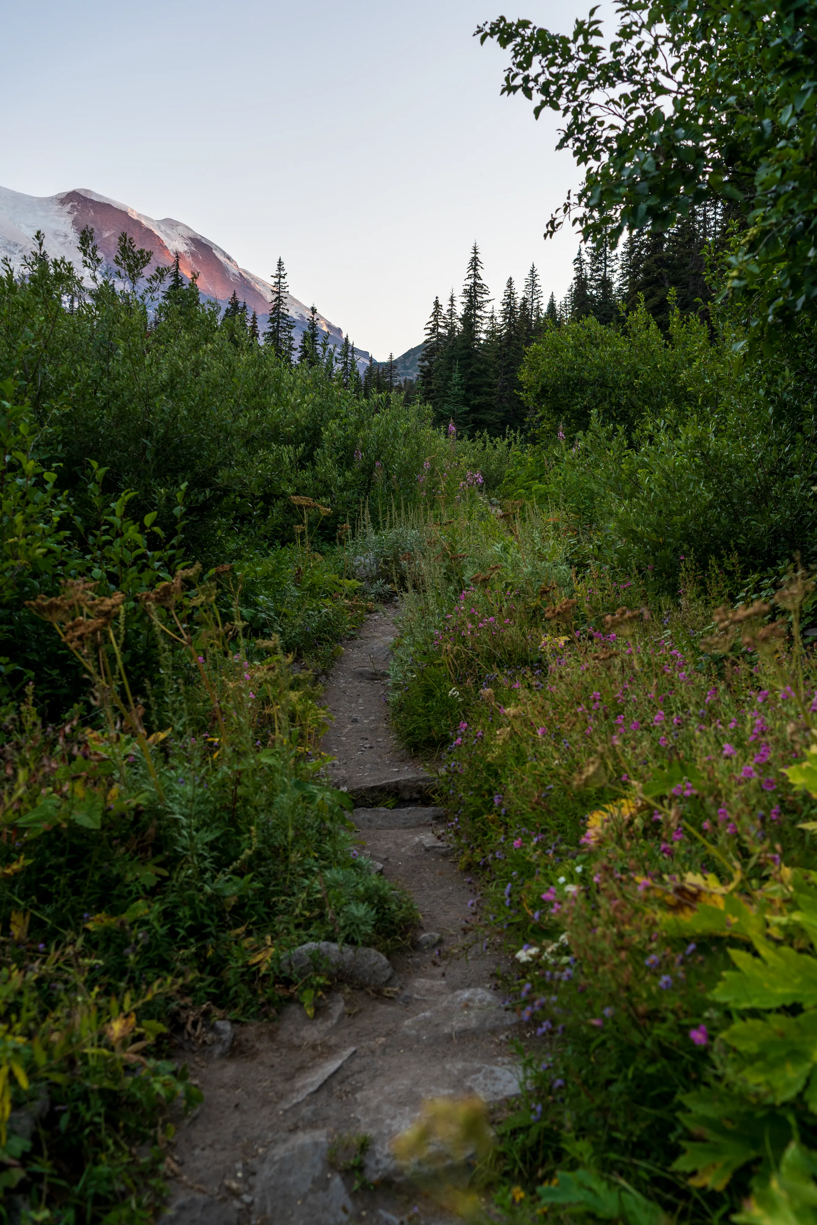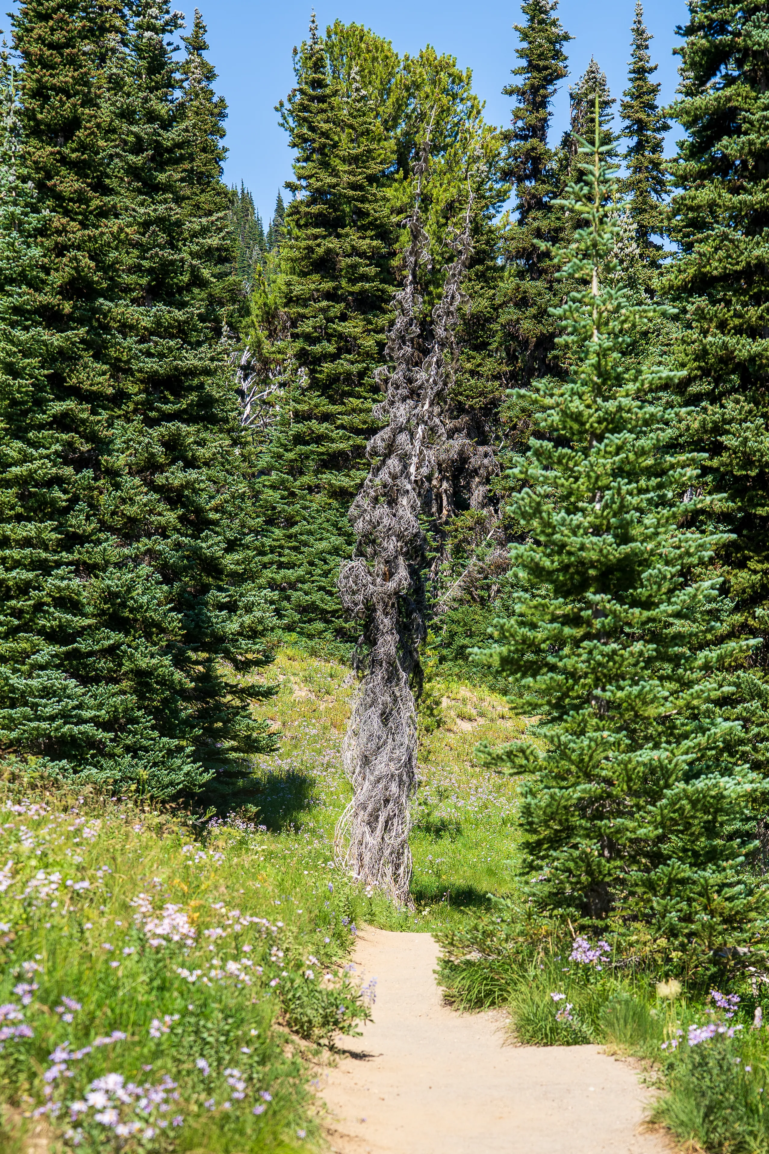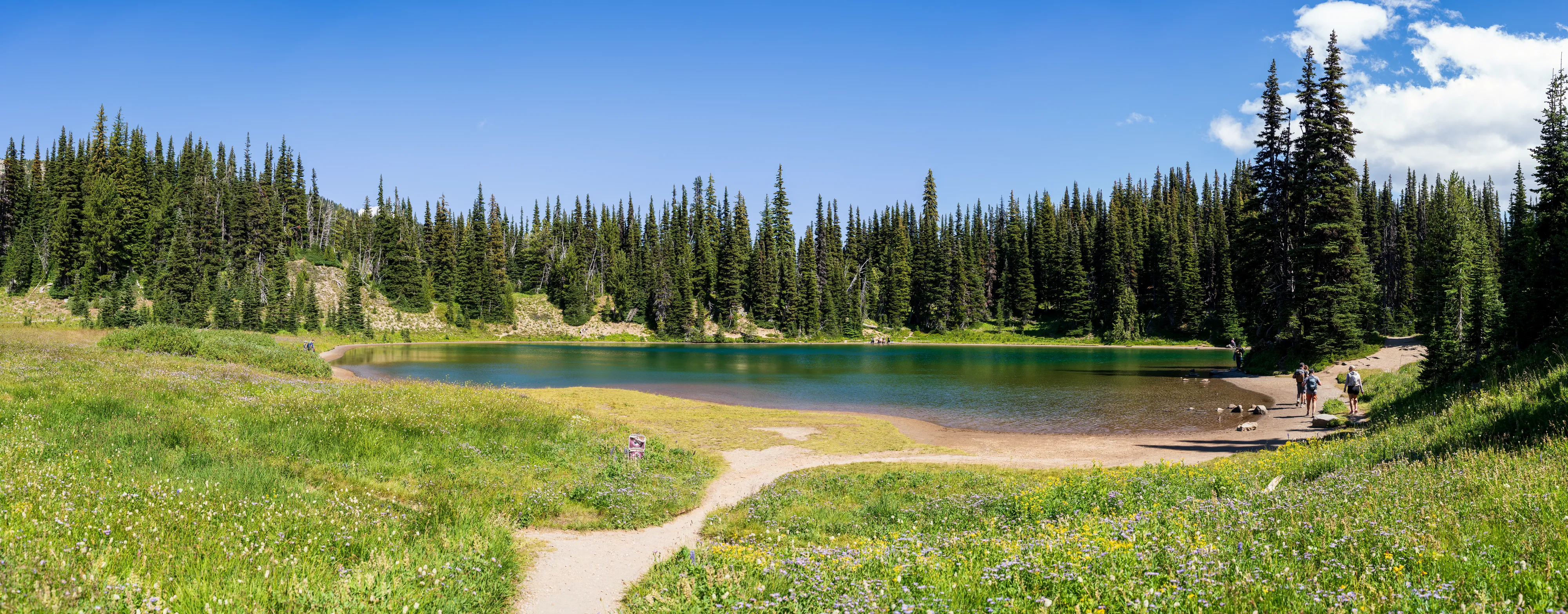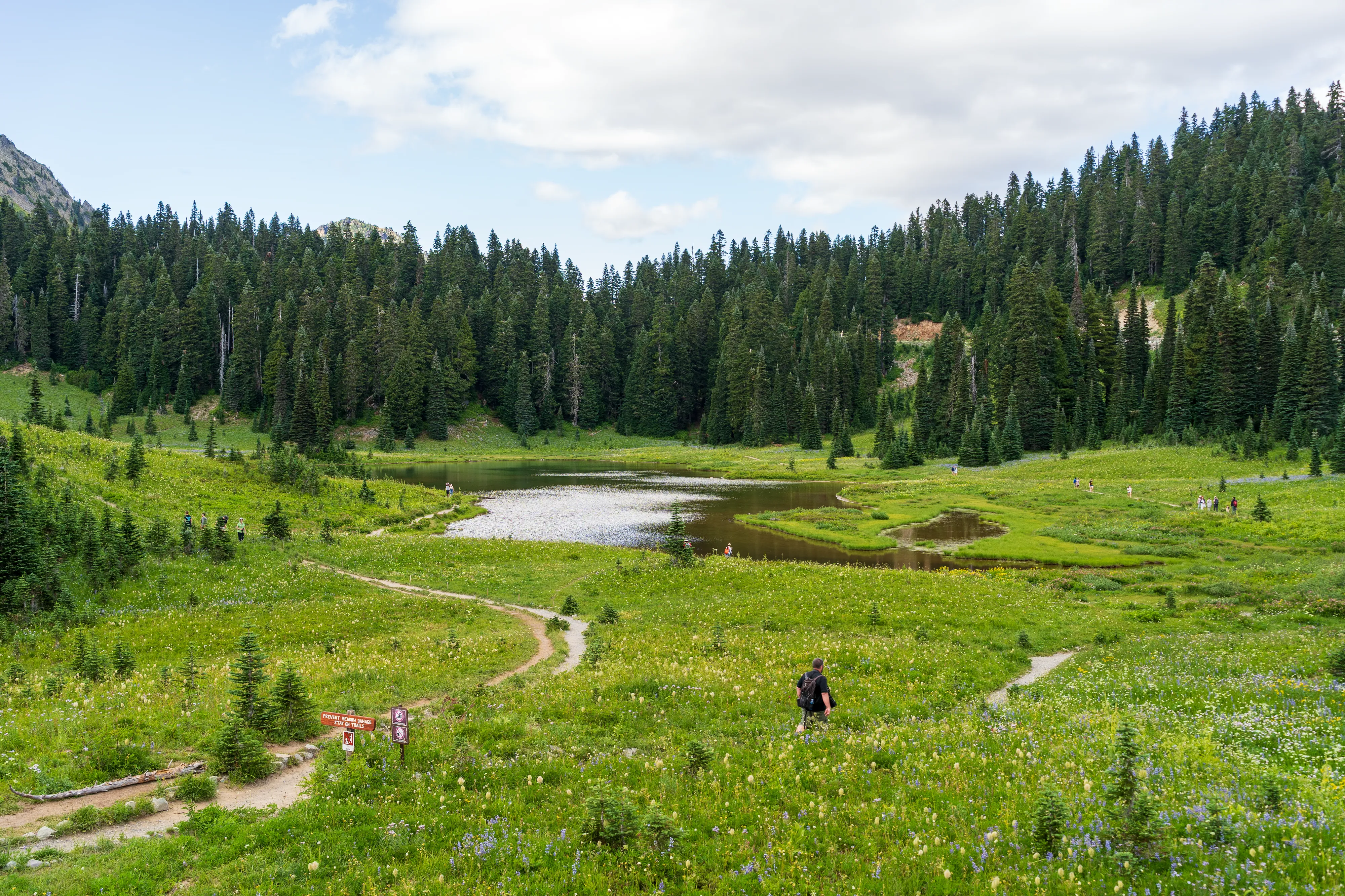 Wir passieren den Frozen Lake und biegen auf den Wonderland Trail ab. Kleiner Einschub: der Wonderland Trail führt über 136 km und über 1800 hm einmal komplett um den Mount Rainier herum. Hier oben stehen die Wildblumen in voller Blüte, was zu tollen bunten Bergwiesen führt.