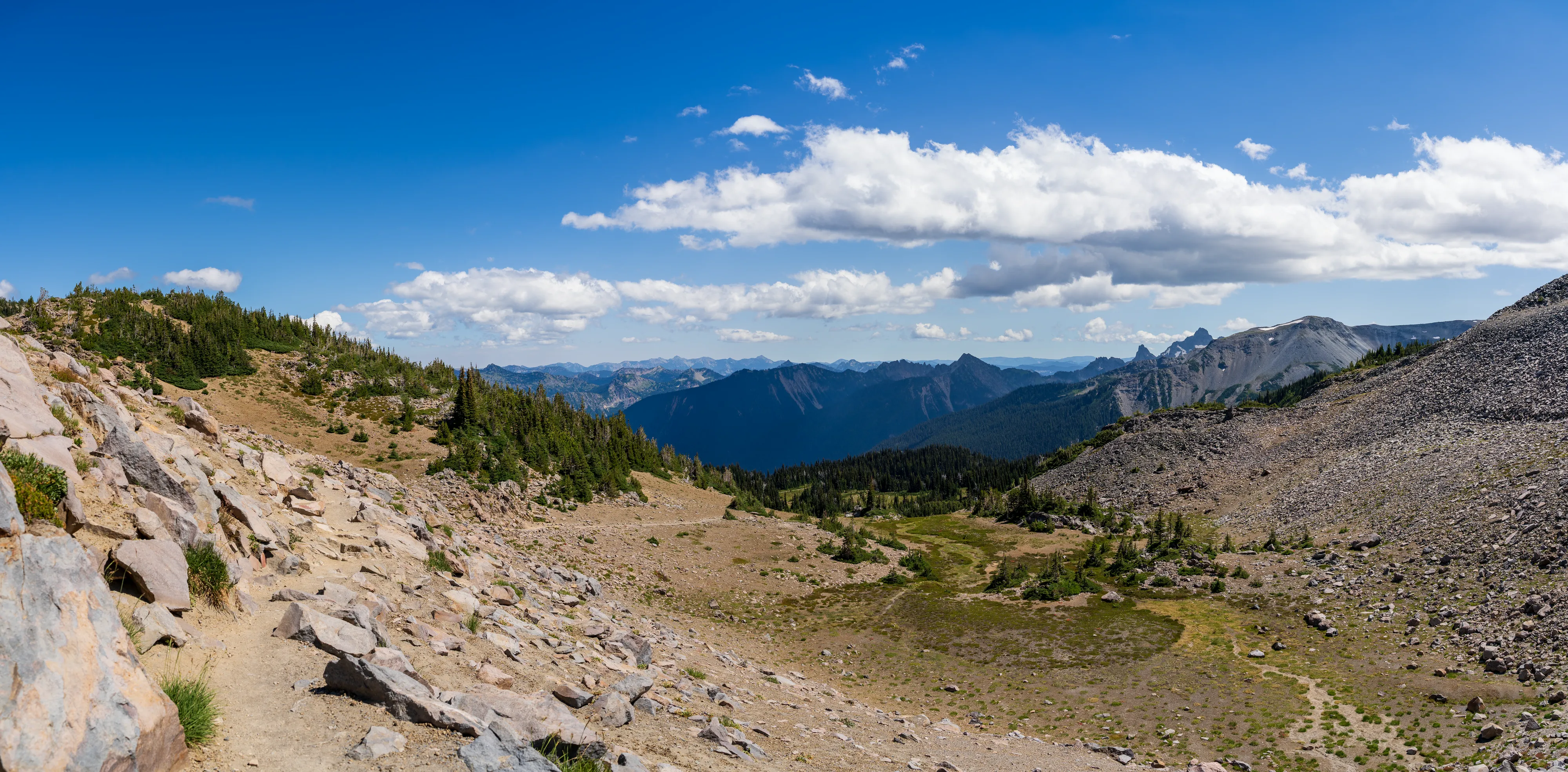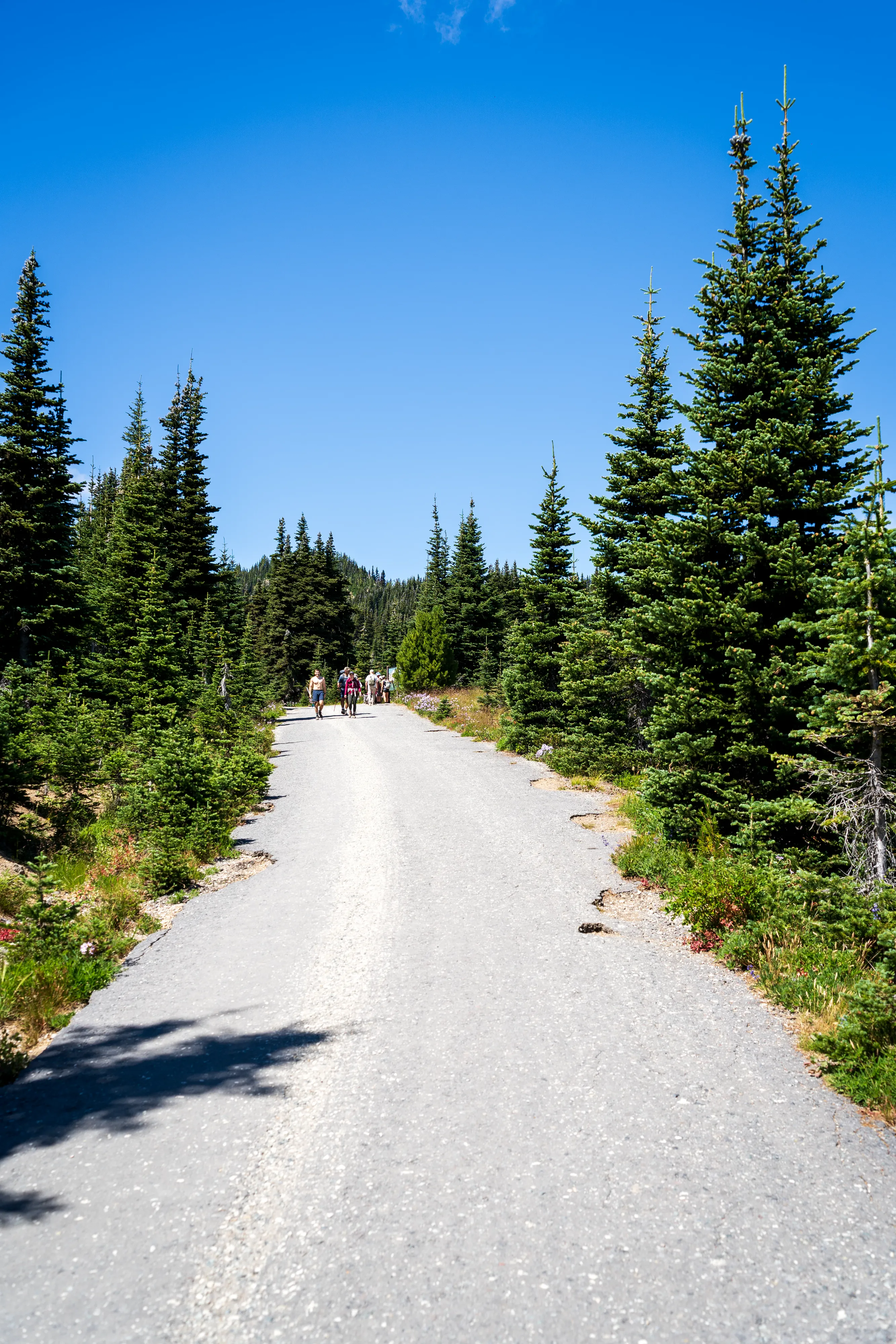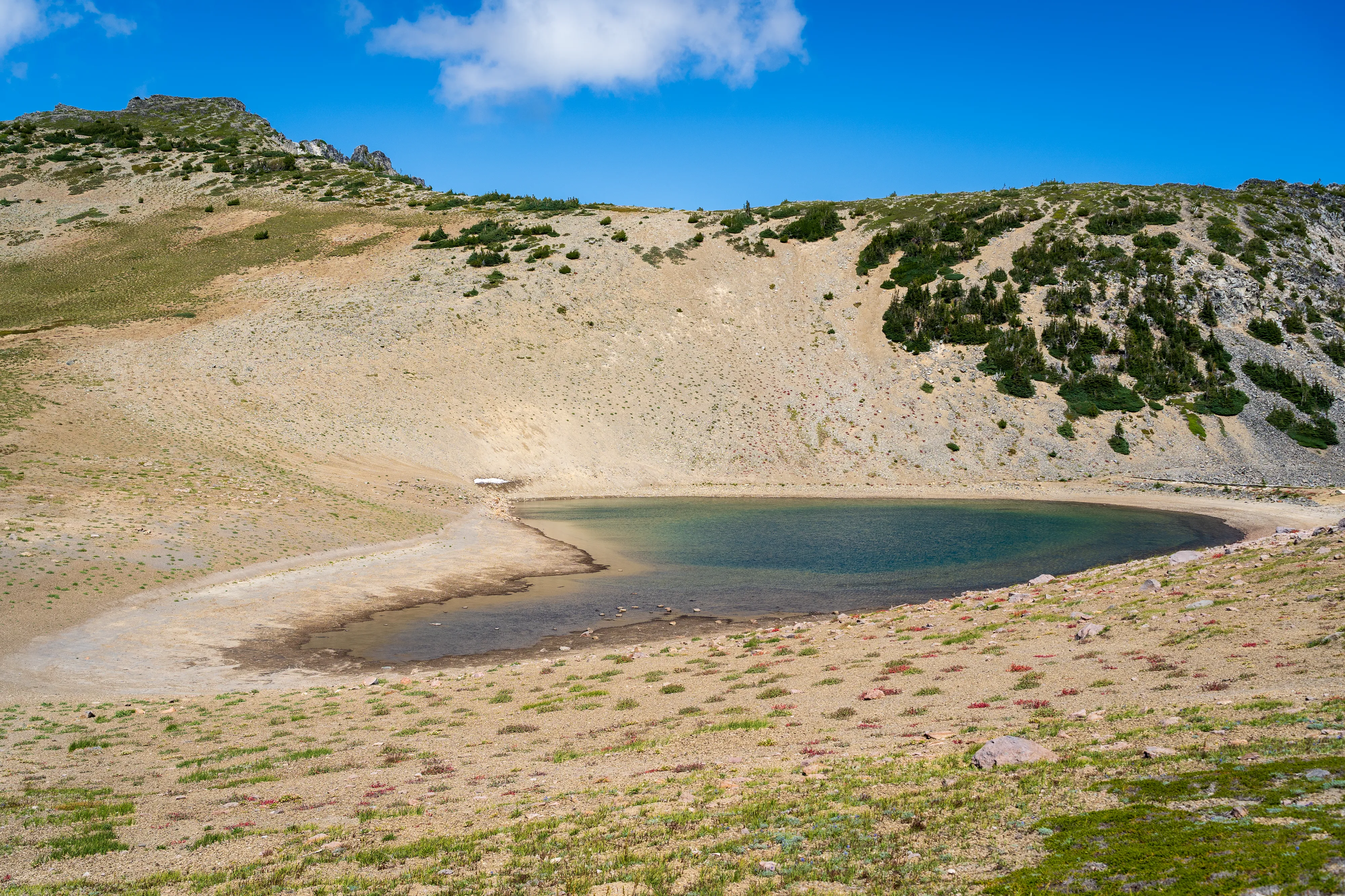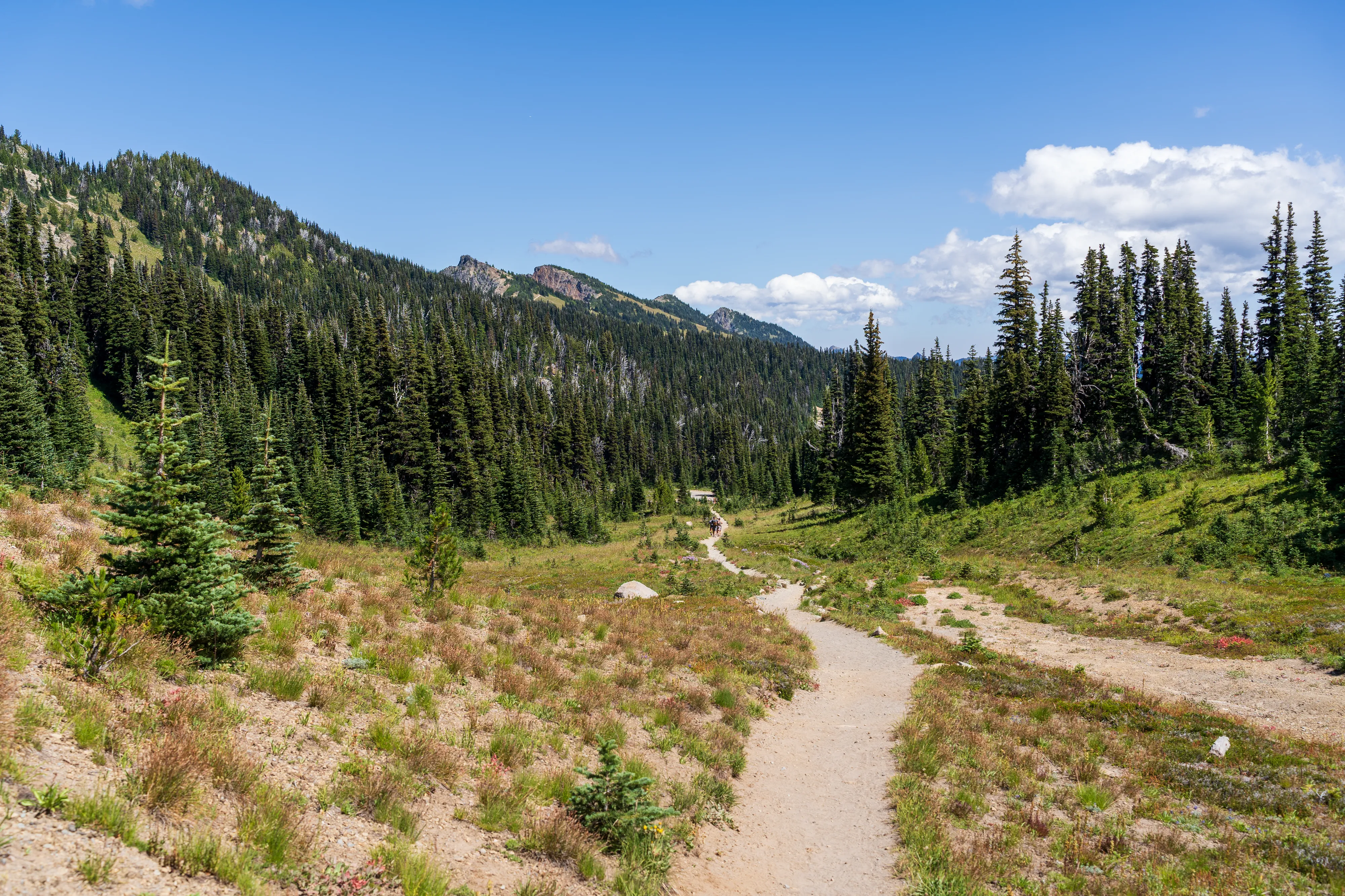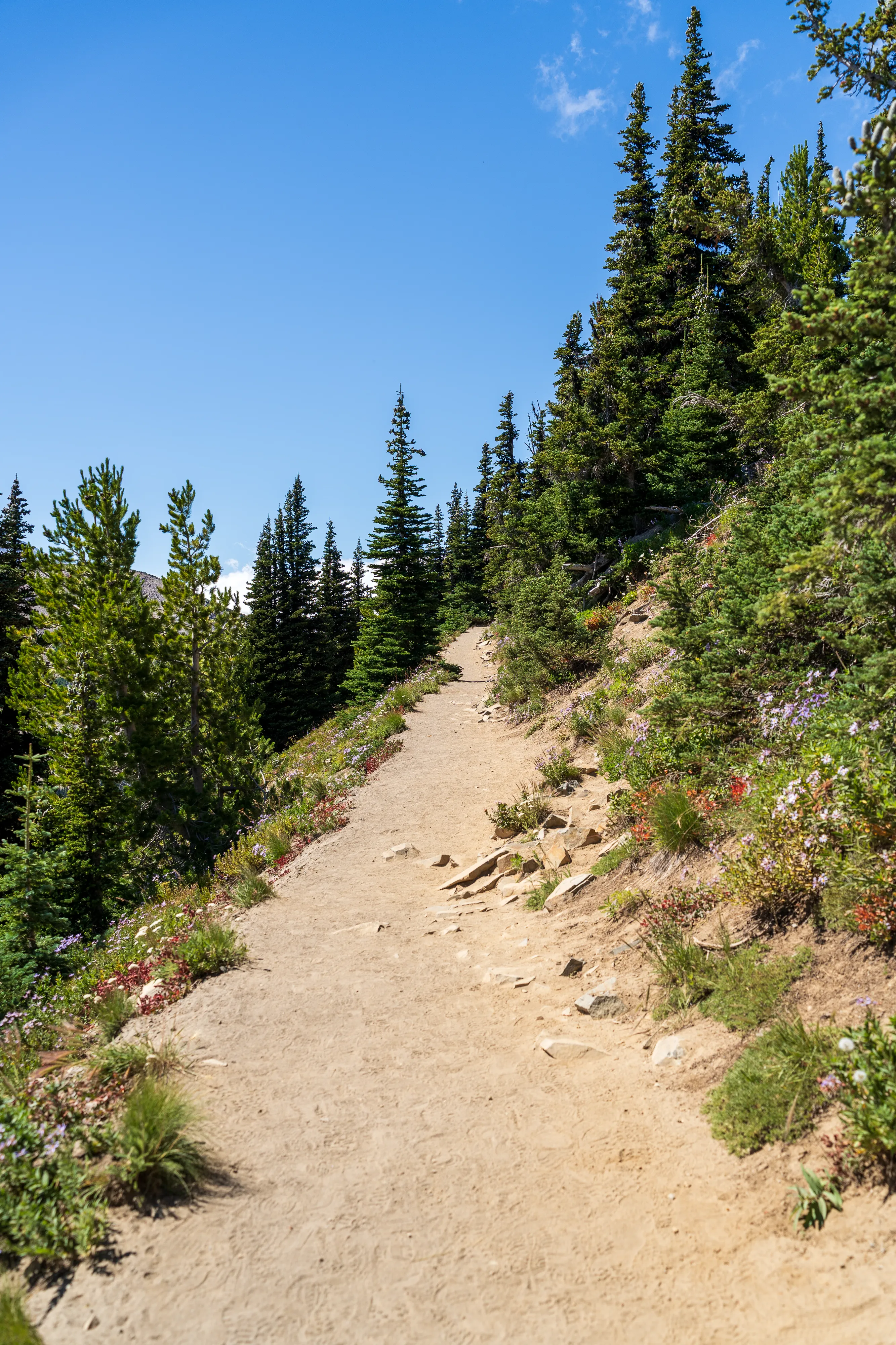 Wir passieren den Frozen Lake und biegen auf den Wonderland Trail ab. Kleiner Einschub: der Wonderland Trail führt über 136 km und über 1800 hm einmal komplett um den Mount Rainier herum. Hier oben stehen die Wildblumen in voller Blüte, was zu tollen bunten Bergwiesen führt.