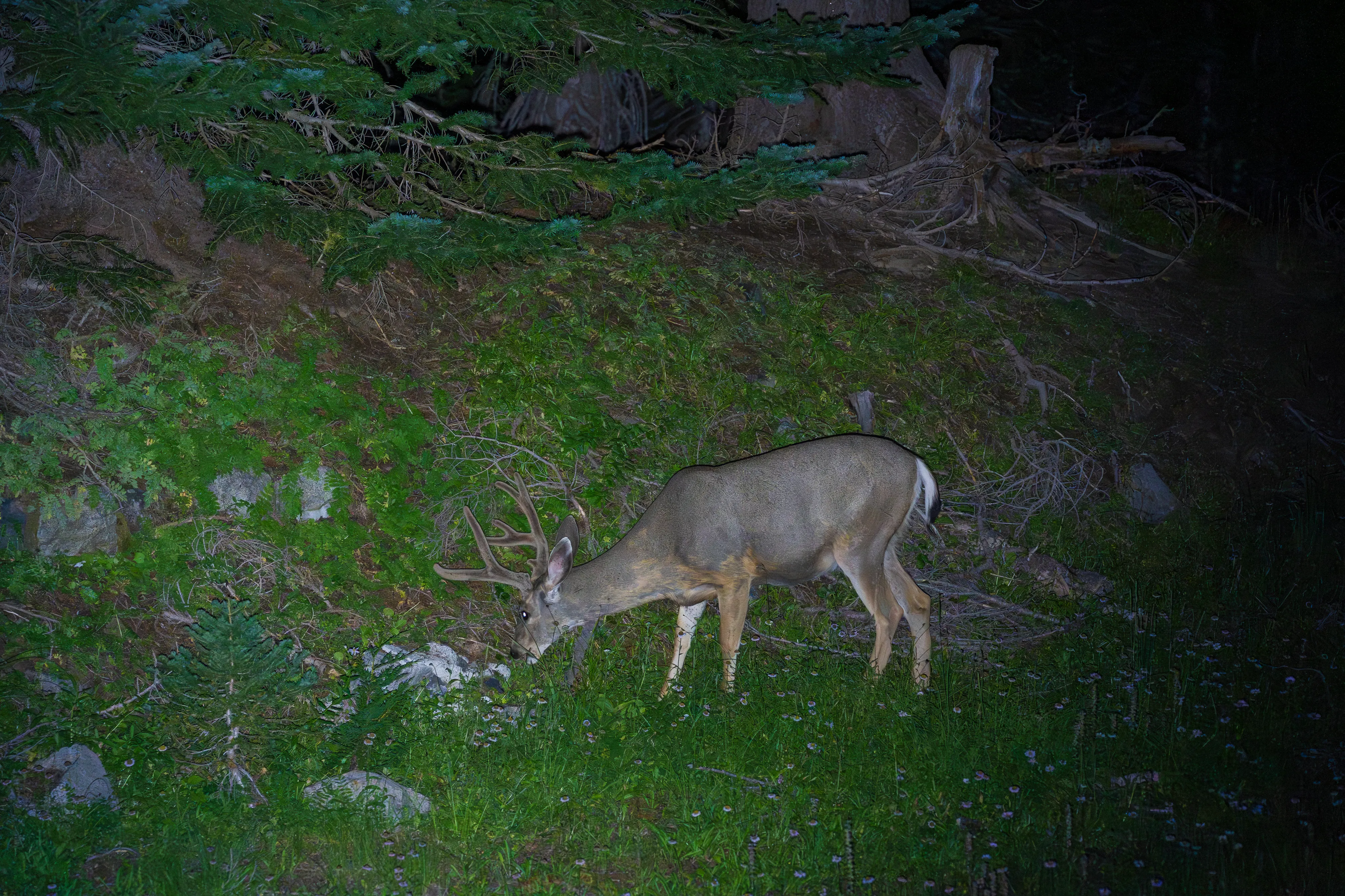 Erschöpft, hungrig und leider im Dunkeln, erreichen wir unser Camp. Nicht ohne ein paar Schreckmomente und viel Lärm, um uns vor Bären und Pumas zu schützen - natürlich sind wir aber keinem von beiden begegnet. Nach einem schnellen Abendessen ziehen wir uns in unser Zelt zurück, nicht jedoch bevor wir noch einige Rothirsche gesehen haben, die so gar nicht scheu zu sein scheinen und direkt neben unserem Zelt durchs Unterholz gestreift sind.