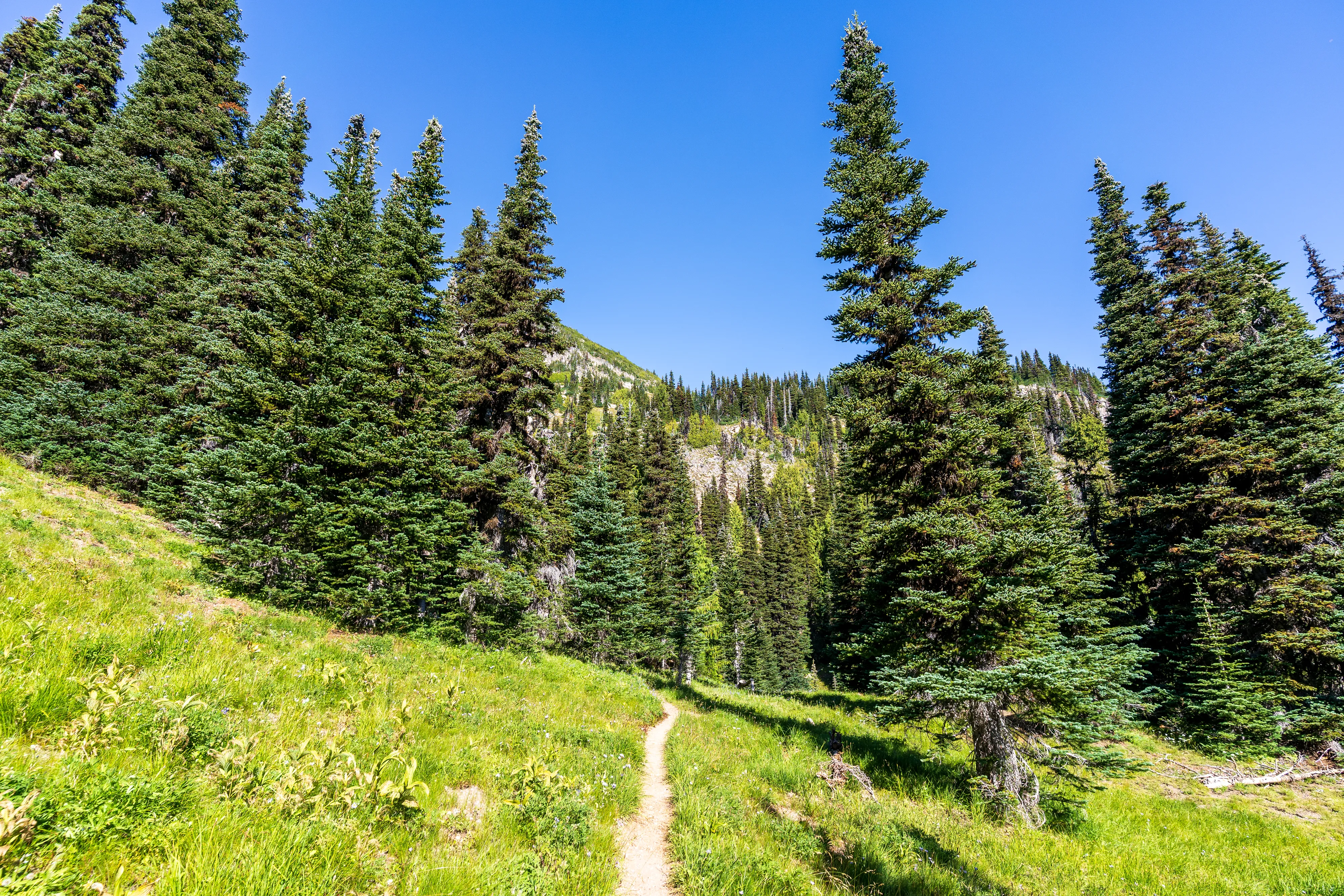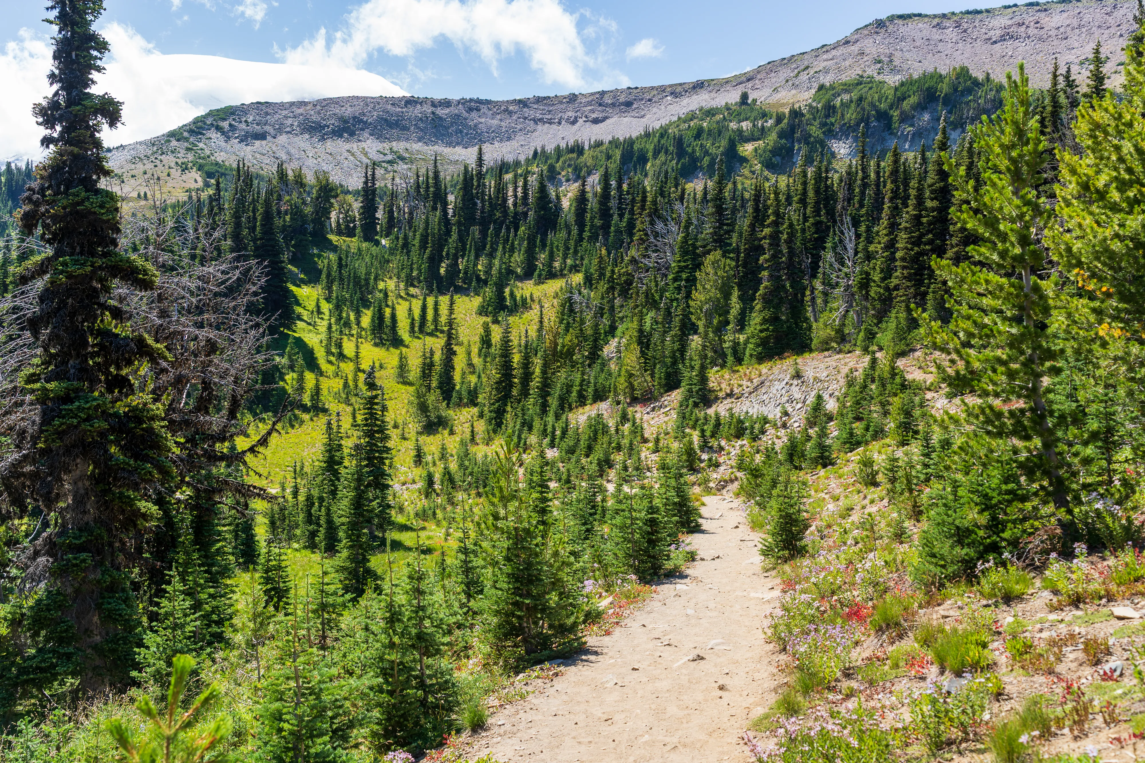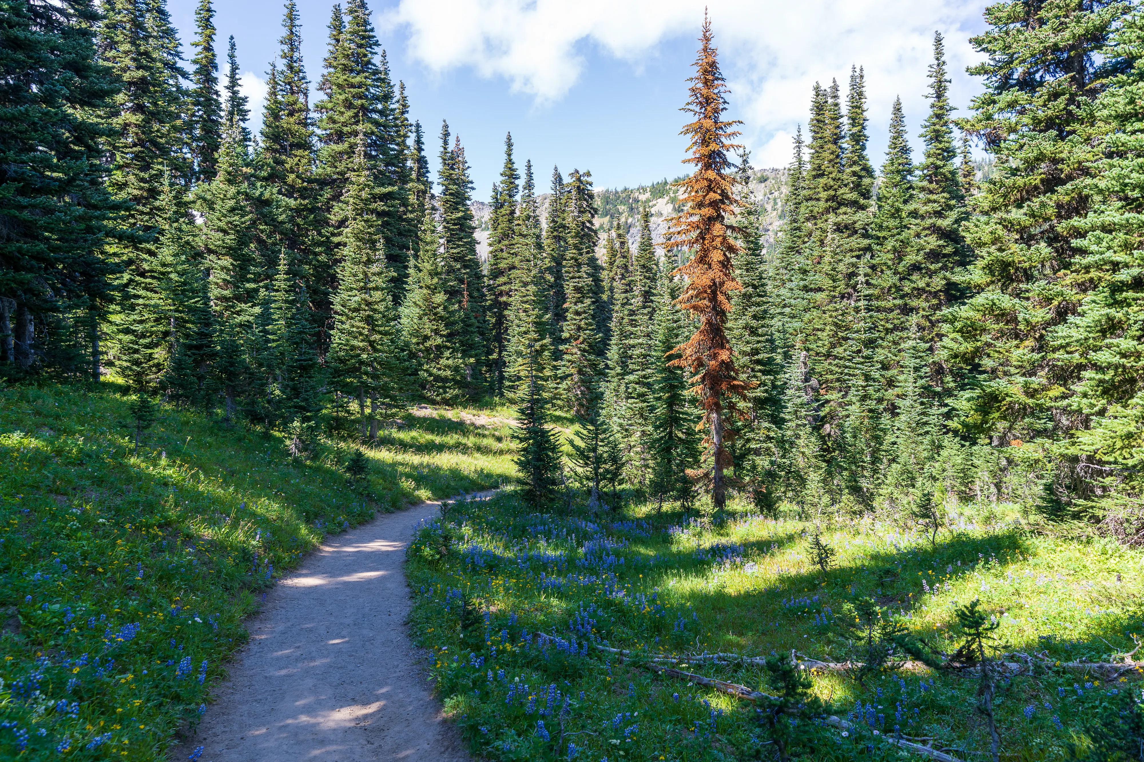 Für die 5 km des Glacier Basin Trail brauchen wir fast 2 Stunden, denn es geht ziemlich bergauf. Der Weg führt uns erst entlang des Inter Fork Flusses und dann im Wechsel durch dichte Nadelwälder und blühende Bergwiesen, vorbei an kleinen Bächen und Wasserfällen.