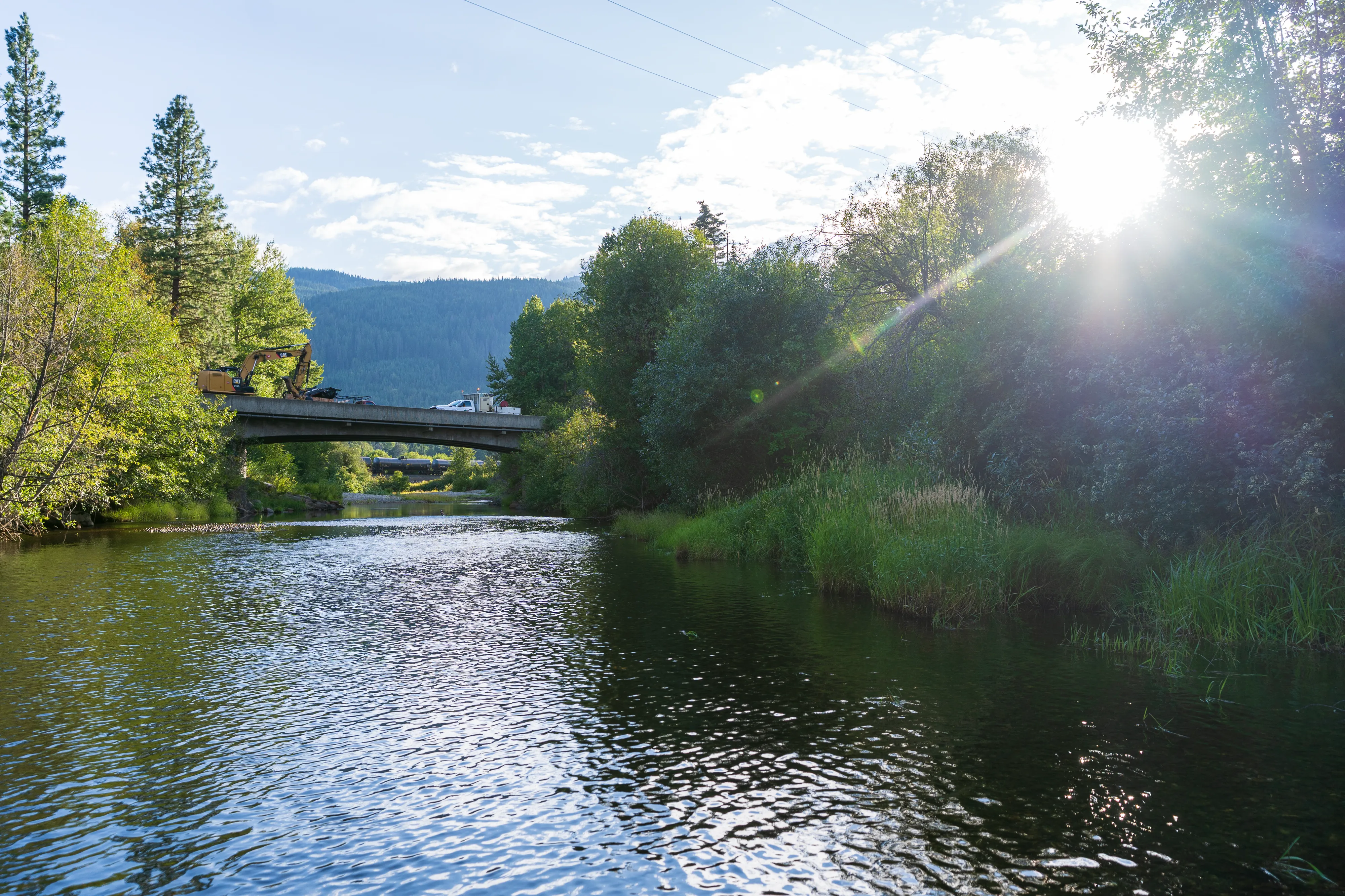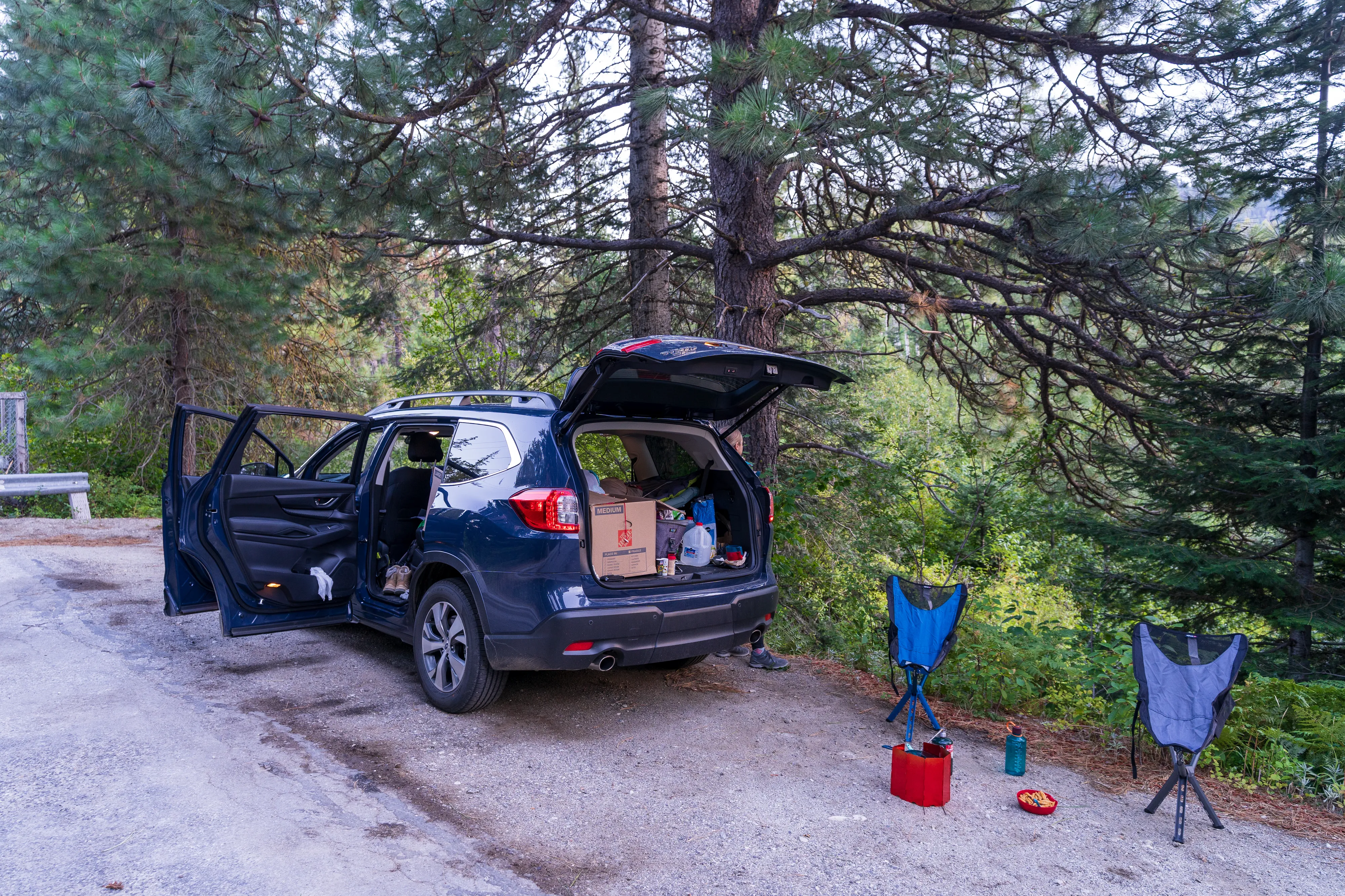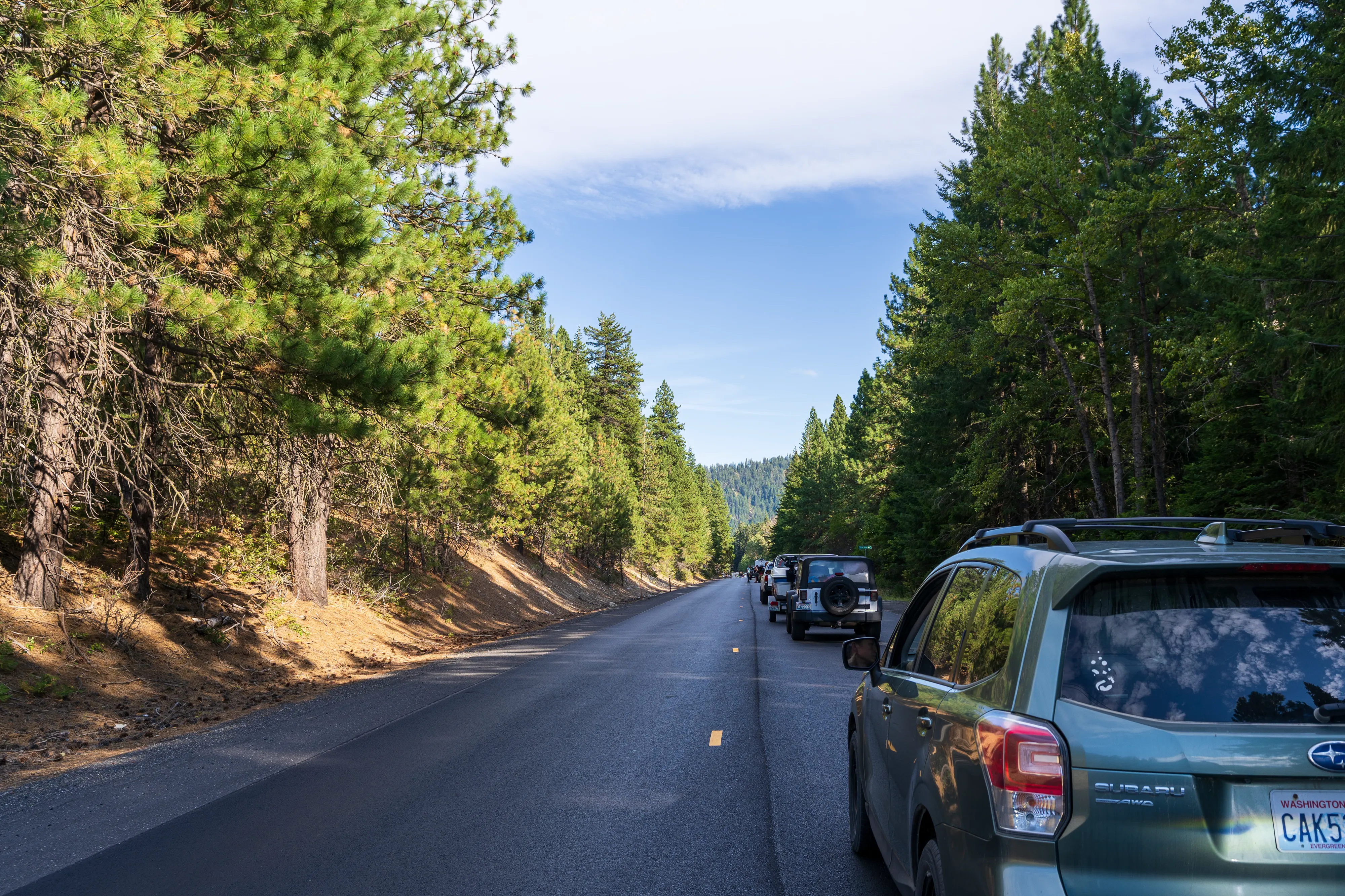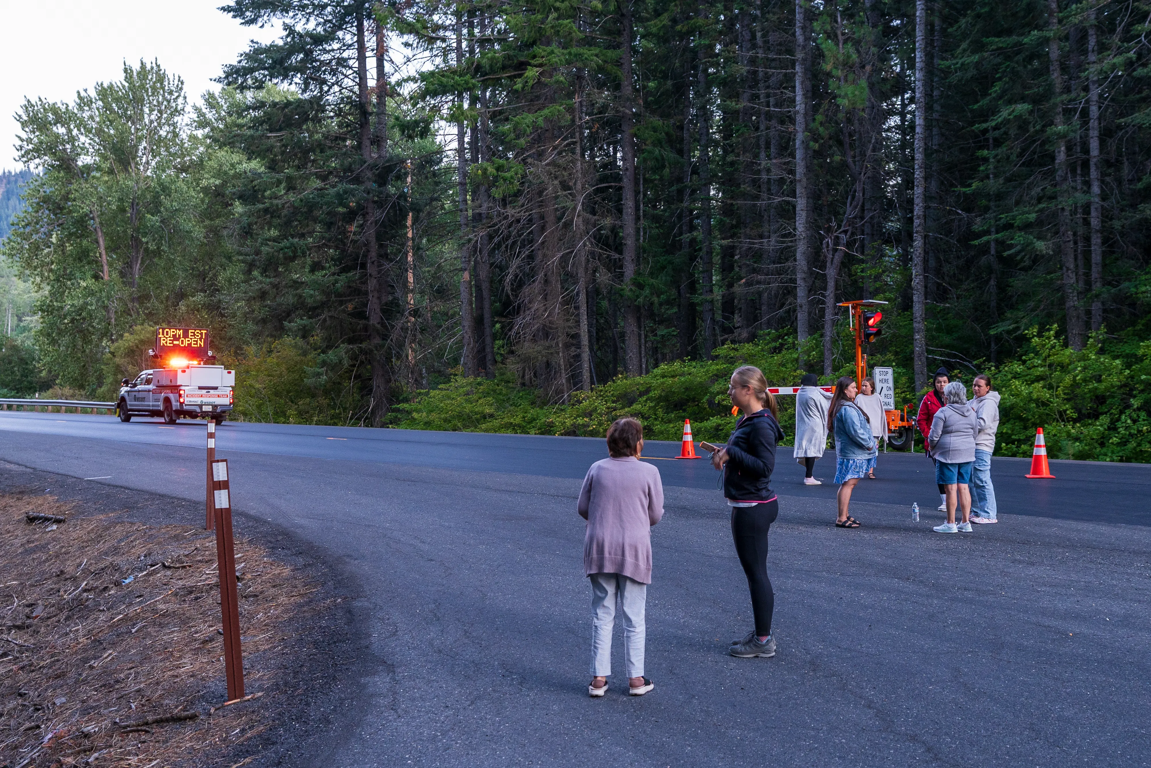 Kurz vor 17:00 Uhr stoppt unsre Fahrt leider unfreiwillig zwischen dem Stevens Pass und Leavenworth. Aufgrund eines Unfalls ist die Straße in beide Richtungen gesperrt und eine Umleitung ist schlicht nicht möglich bzw. würde diese erfordern, dass man deutlich über 100 Km zurückfährt, um zur nächsten größeren Kreuzung zu gelangen. Da unklar ist, was genau passiert ist und wann mit einer Aufhebung der Sperrung zu rechnen ist, verbringen wir ein paar Stunden an einem nahegelegenen Fluss mit entspannen und kochen uns etwas zu essen. Hier entschließen wir uns auch, wieder ein paar Kilometer zurückzufahren und im nahegelegenen National Forest zu übernachten. Mittlerweile sind Infoschilder aufgestellt worden, dass erst gegen 22:00 Uhr mit einer Straßenöffnung zu rechnen ist. Je nachdem wann man die Unfallstelle erreicht hat stand man also bis zu knapp sechs Stunden hier - krass. Gut also, dass wir uns nicht für eine Weiterfahrt entschieden haben. Am nächsten Morgen ist der Straßenabschnitt wieder offen, allerdings erwartet uns eine weitere Straßensperrung, diesmal zum Glück jedoch mit einer Umleitung (ironischerweise eine reguläre Baustelle, die am Vortag noch nicht eingerichtet gewesen wäre).