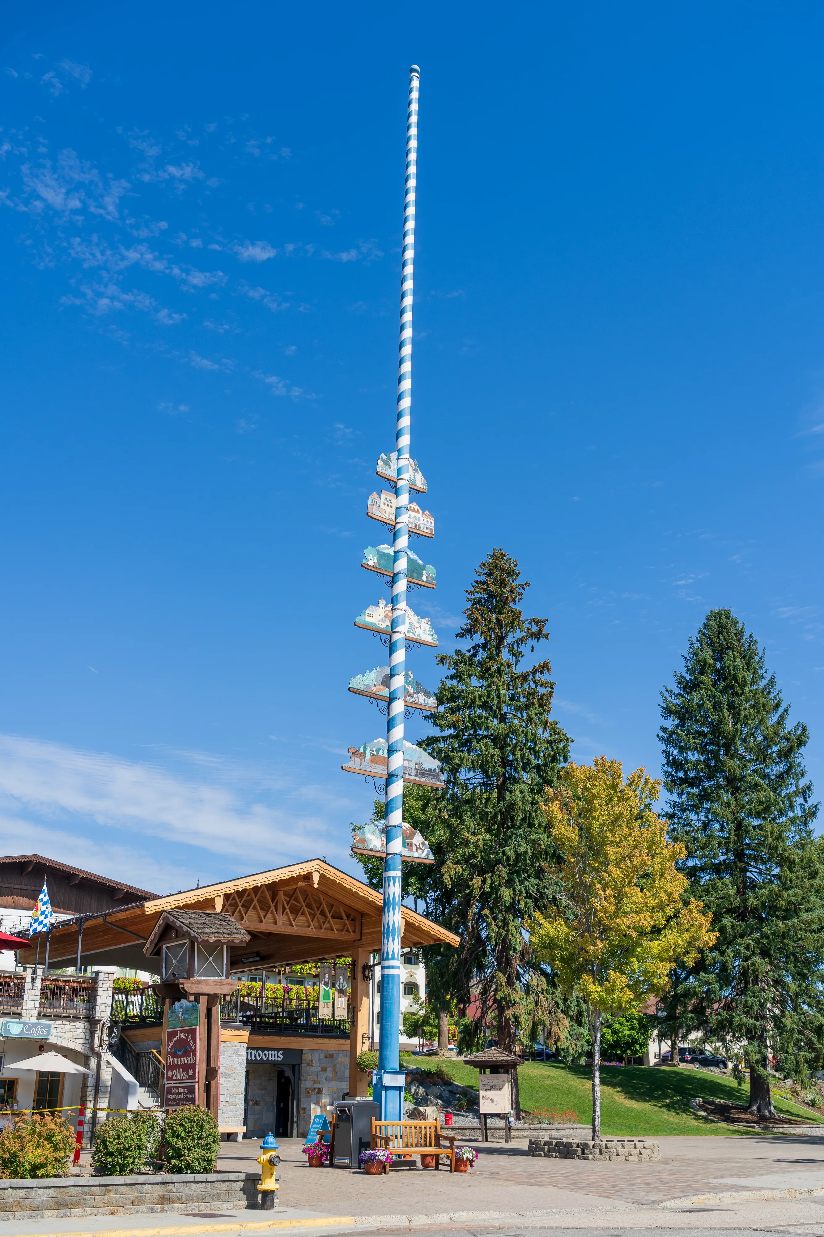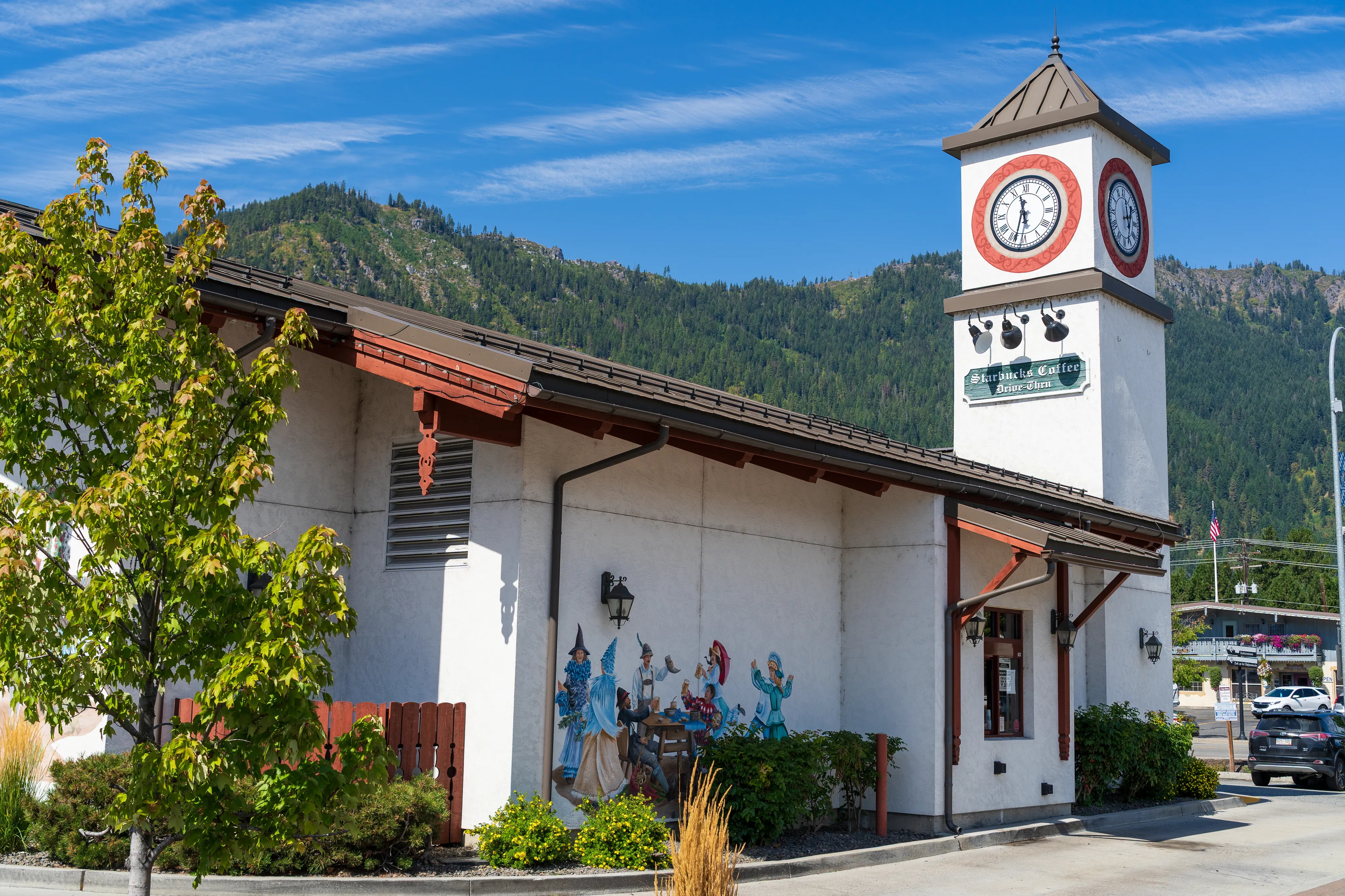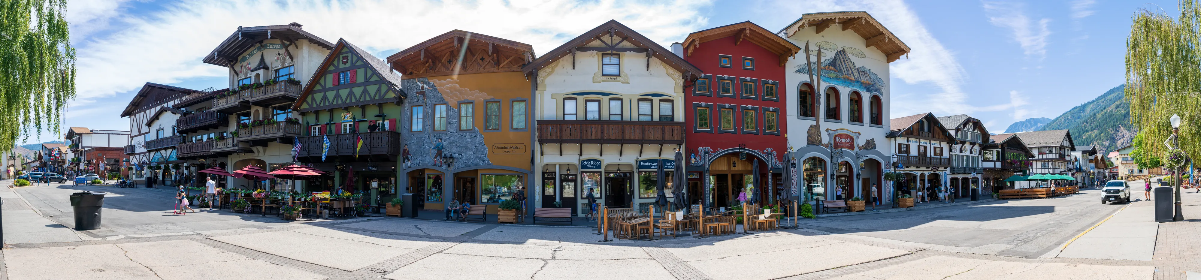 Wir erreichen Leavenworth, das “Bavarian Village”, welches sich zum Ziel gesetzt hat Touristen damit zu locken, dass es hier vermeintlich wie in Bayern ist. Die Häuser sind im alpenländischen Stil (allerdings sind die entsprechenden Stilelemente zumeist aufgemalt, die Gebäude also nicht wirklich authentisch), viele Straßenschilder sind bilingual und es gibt sogar einen Maibaum in der Dorfmitte. Natürlich ist die bayrische Flagge auch häufiger zu finden. Und auch bei den angebotenen Gerichten versuchen die Amerikaner authentisch zu sein, was ihnen bei Gerichten wie Schnitzel (zumindest dem Namen nach) gelingen mag. Sogar die Unterscheidung zwischen Wienerschnitzel und Schnitzel Wiener Art wird beherrscht. Bei der Brezel hört es dann aber auch schon wieder auf: Diese sieht eindeutig zu sehr aus wie ein Weckmann mit Salz in Form einer Brezel als das klassische Laugengebäck. Lustig ist das Dorf jedoch allemal, zumal auch Kaffeehausketten, Supermärkte und Tankstellen mitziehen.