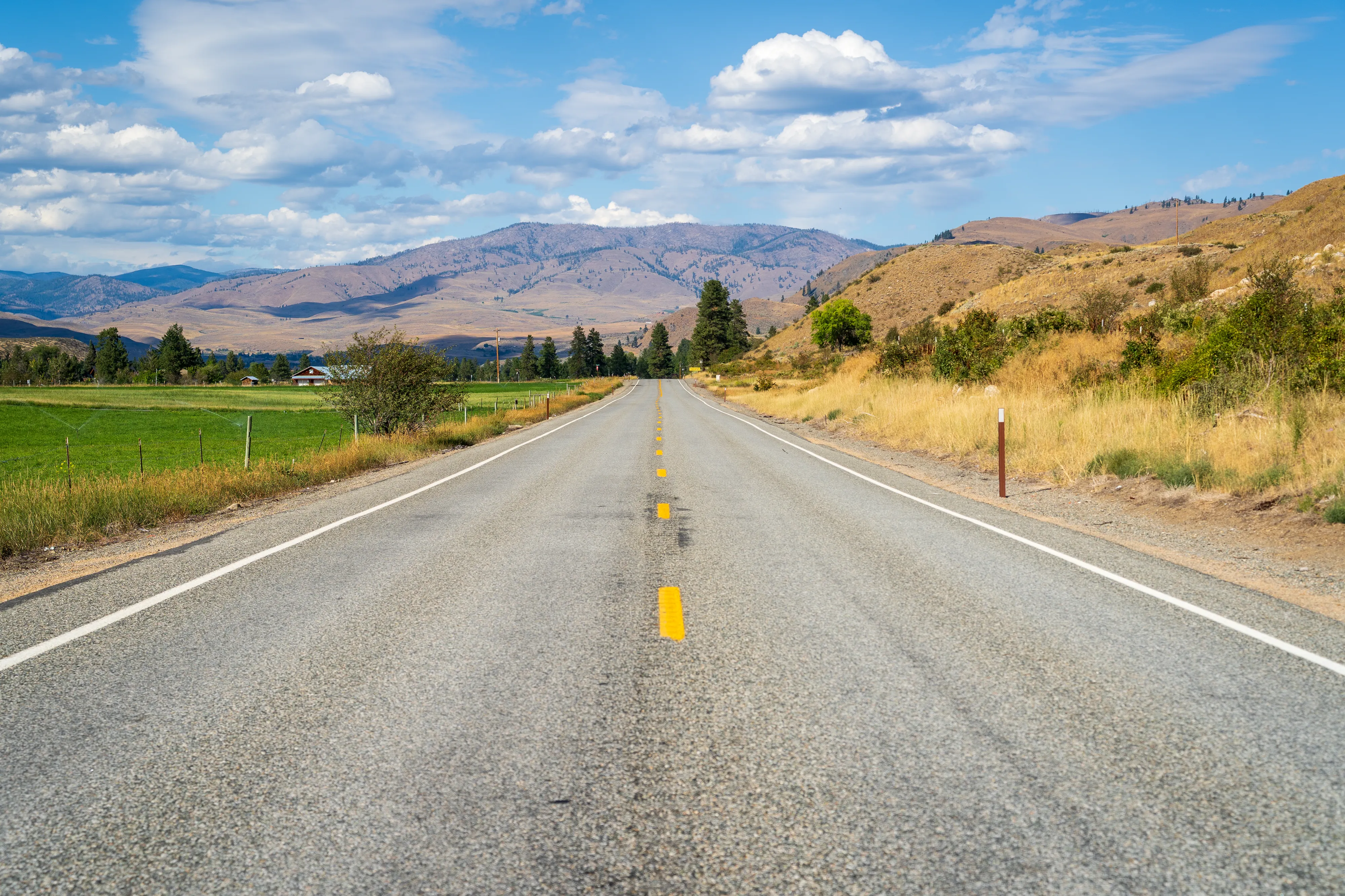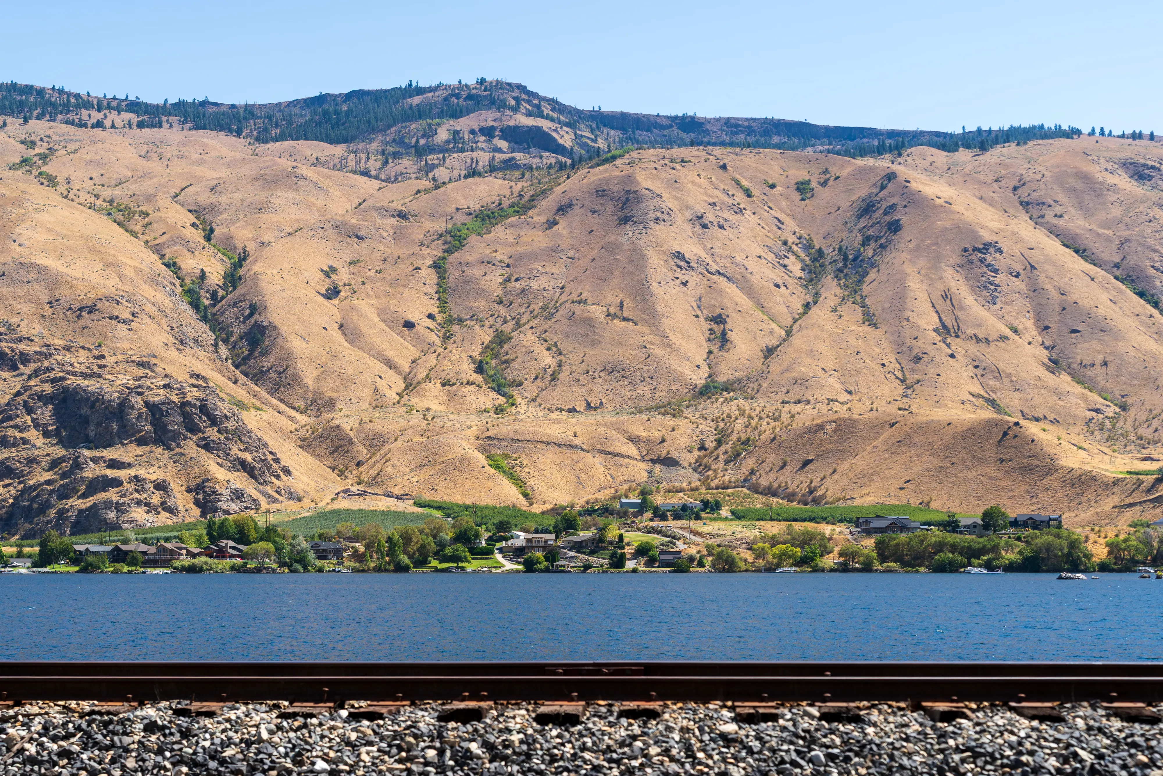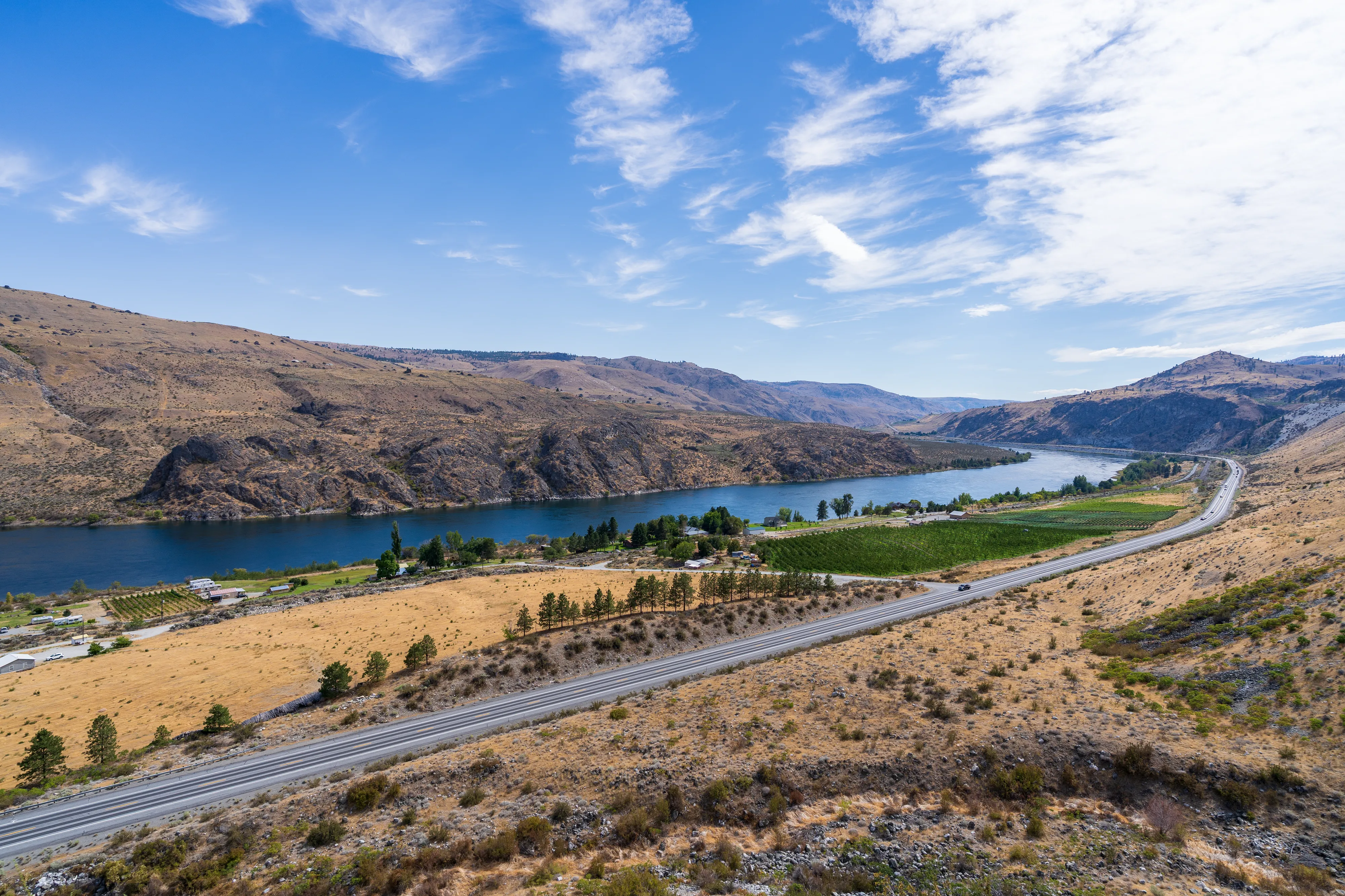 Hinter Leavenworth ändert sich die Landschaft recht schlagartig: statt bewaldeter Berghänge prägen nun hügelige, karge Wiesen mit vereinzelten grünen Oasen in Wassernähe und unzähligen Obstplantagen das Bild.