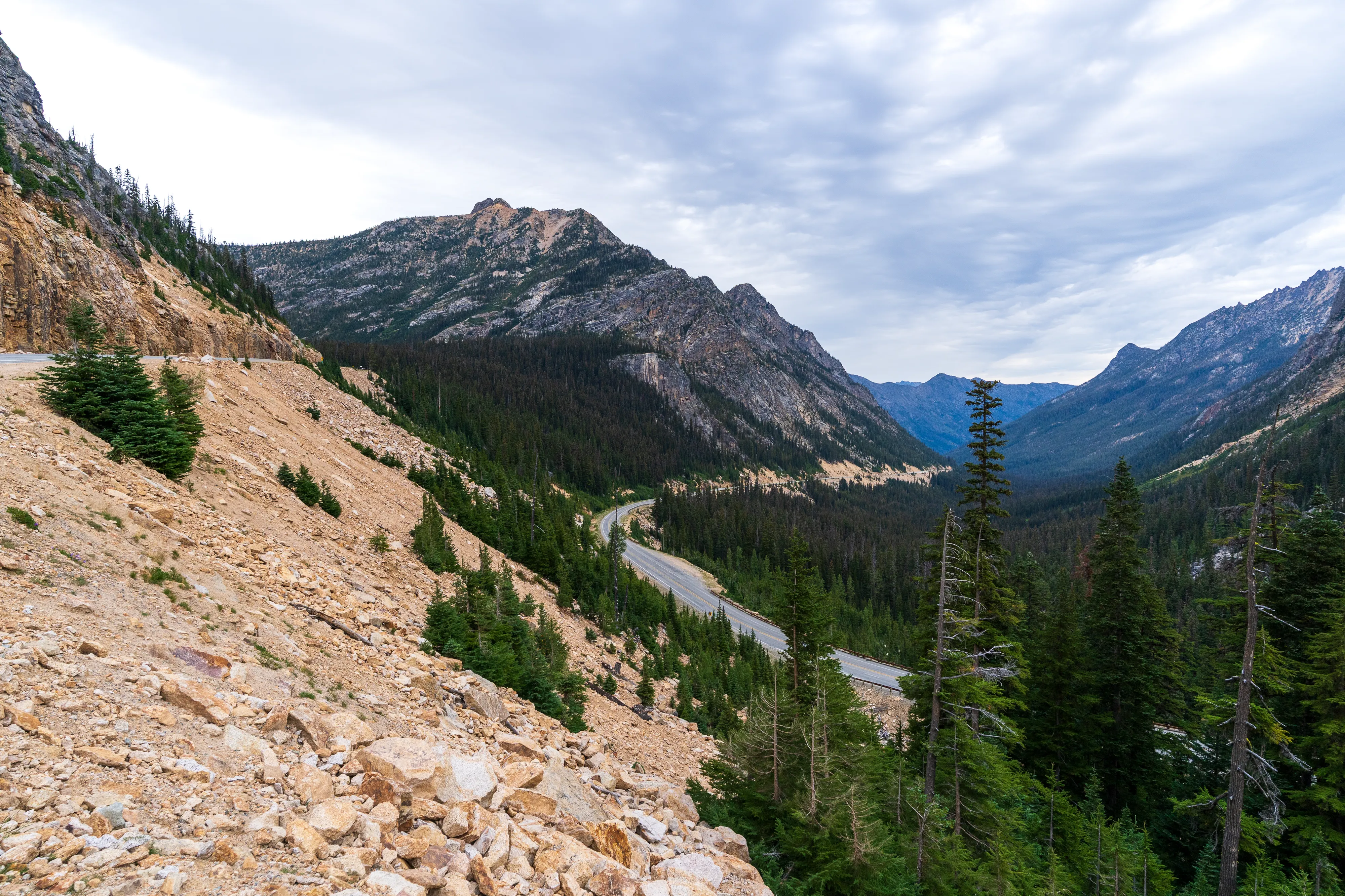 Die WA-20 führt uns zurück Richtung Westen. Sie ist Teil des Cascade Loop und auch als North Cascade Highway bekannt, denn sie führt um die Cascade Mountains herum bzw. hindurch: einer westlich von den Rocky Mountains gelegenen, sich vom Süden Britisch-Kolumbiens bis Nordkalifornien ziehende Gebirgskette, die in der Frühzeit der USA das letzte große Hindernis auf dem Weg an die Westküste dargestellt hat. Tolle Aussichten ergeben sich vom Washington Pass, aber auch dem restlichen Teil der Strecke.