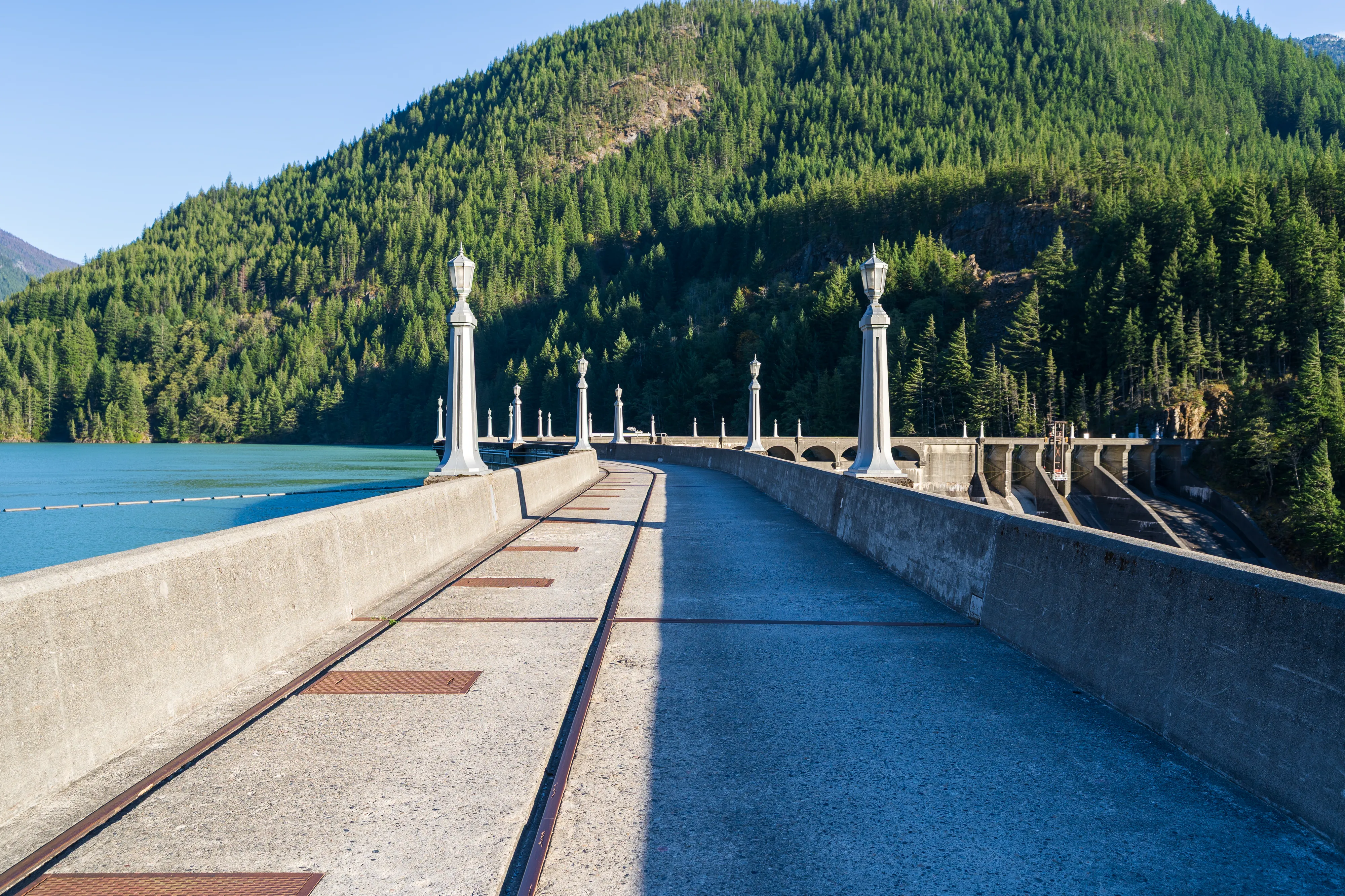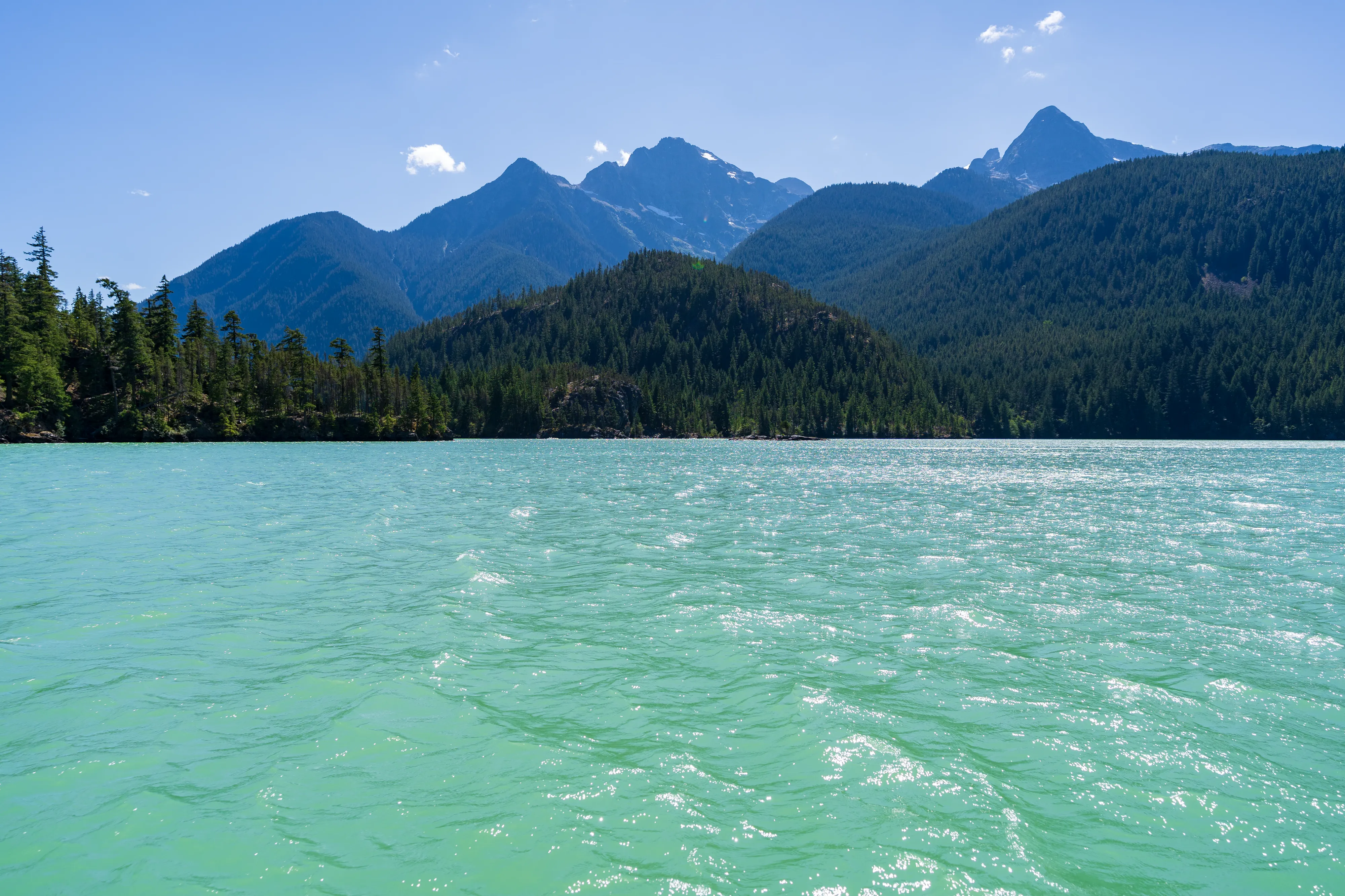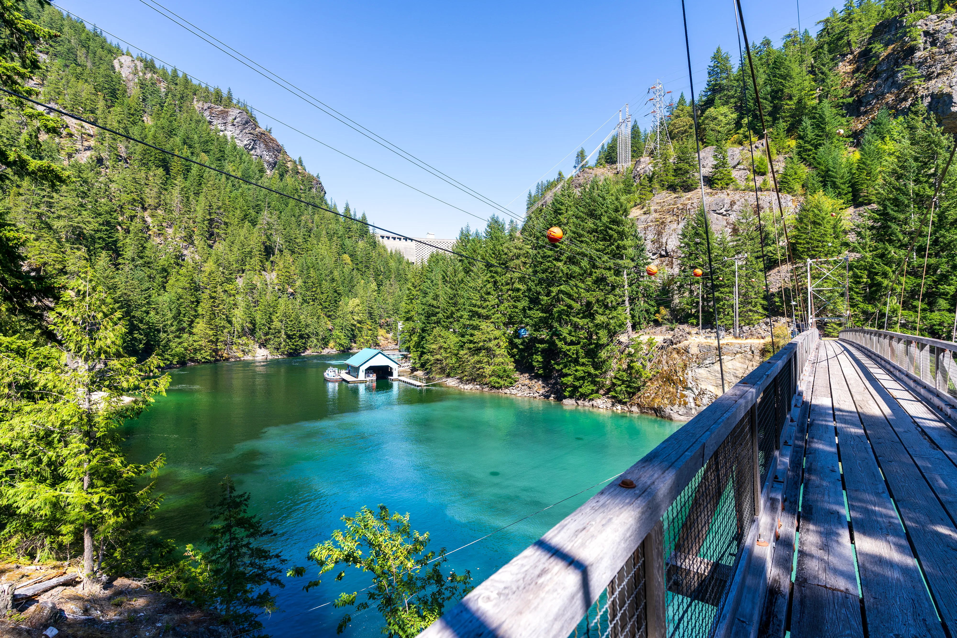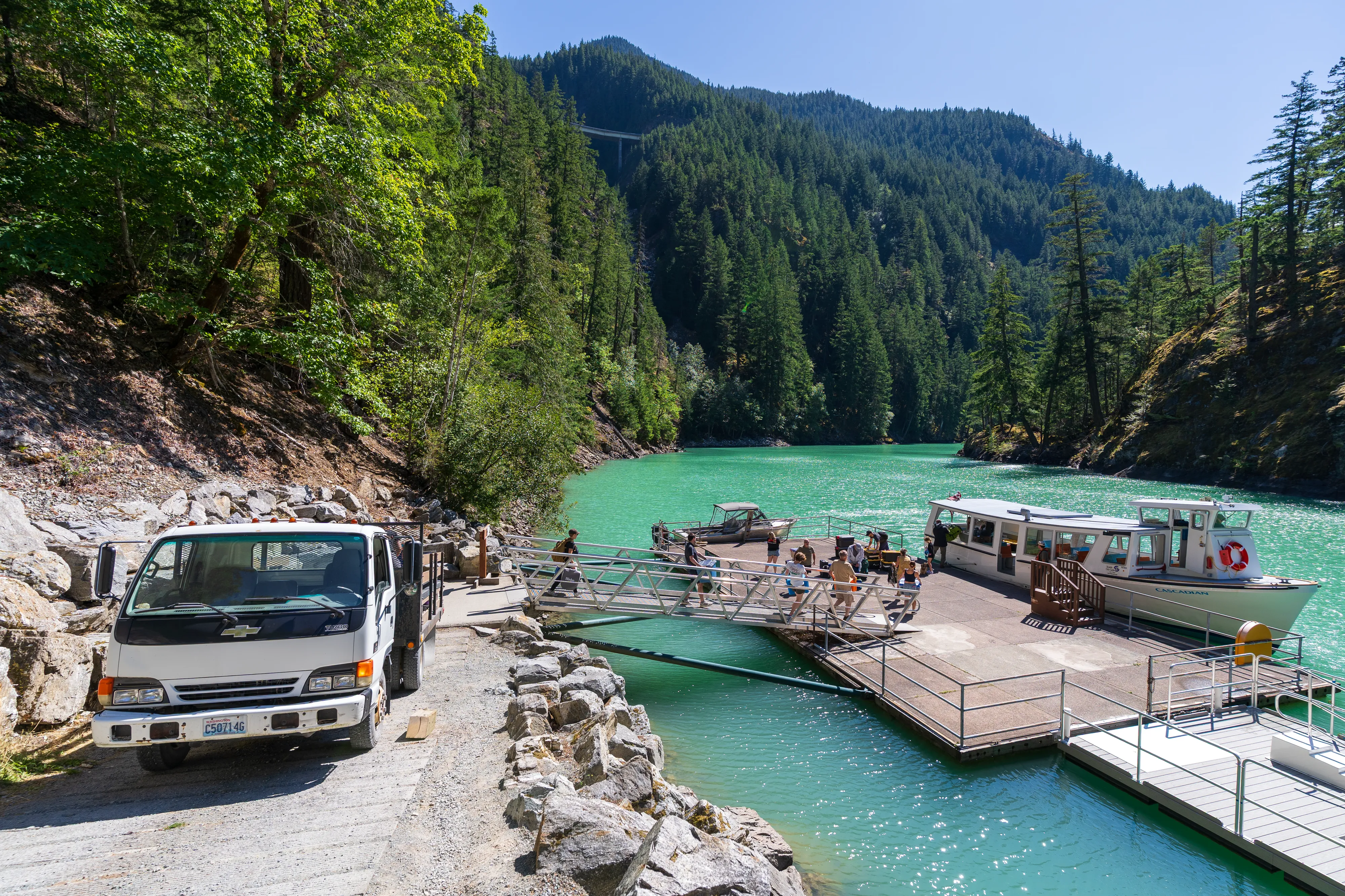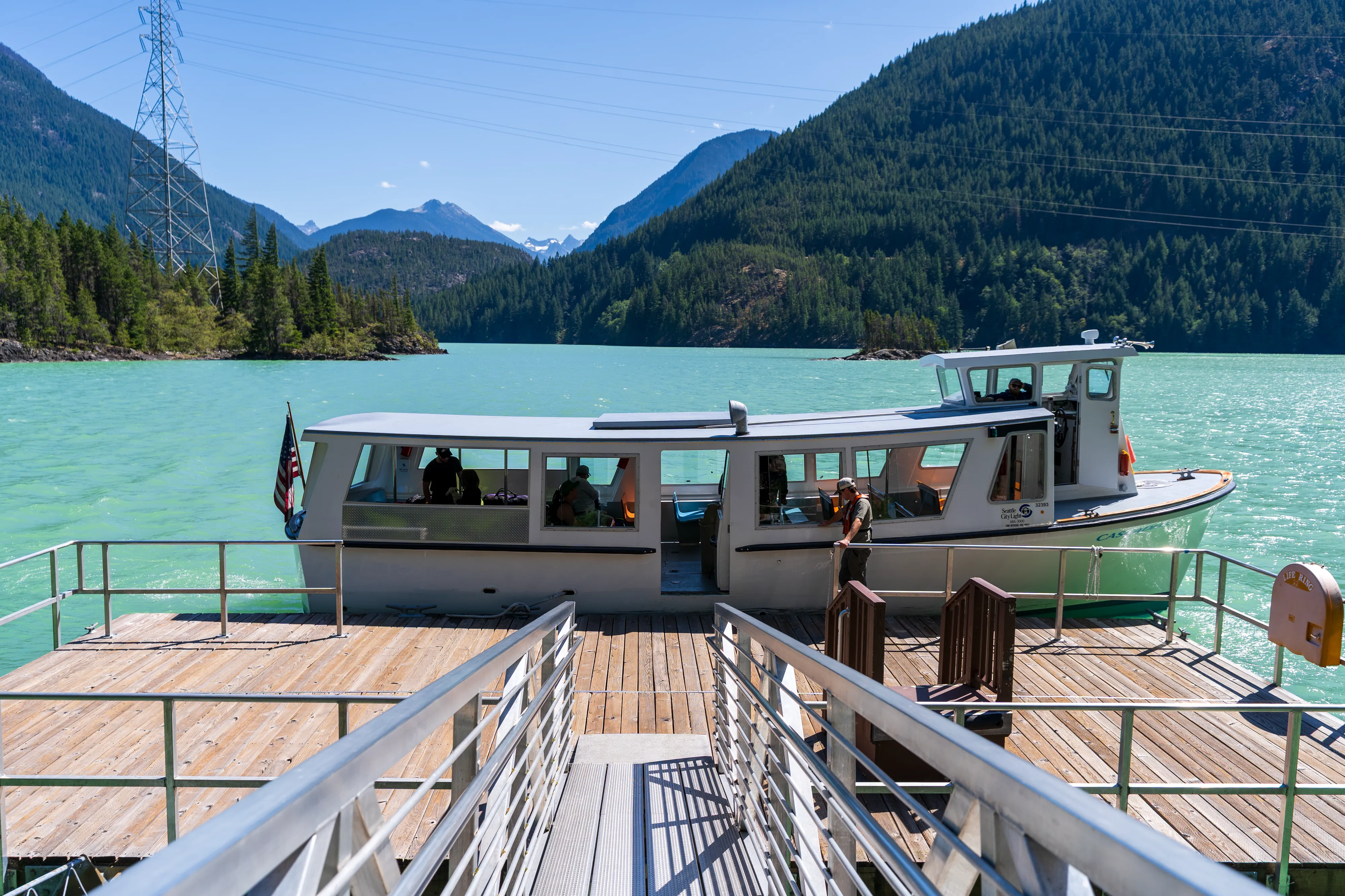 Am Westufer des Diablo Lake fährt zweimal täglich eine Fähre zum Ross Dam (betrieben von den öffentlichen Elektrizitätswerken von Seattle, welche auch die drei hiesigen Dämme gebaut haben und betreiben) - von wo aus man über den Diablo Lake Trail oberhalb des Sees zurücklaufen kann - wirklich eine empfehlenswerte Tour.