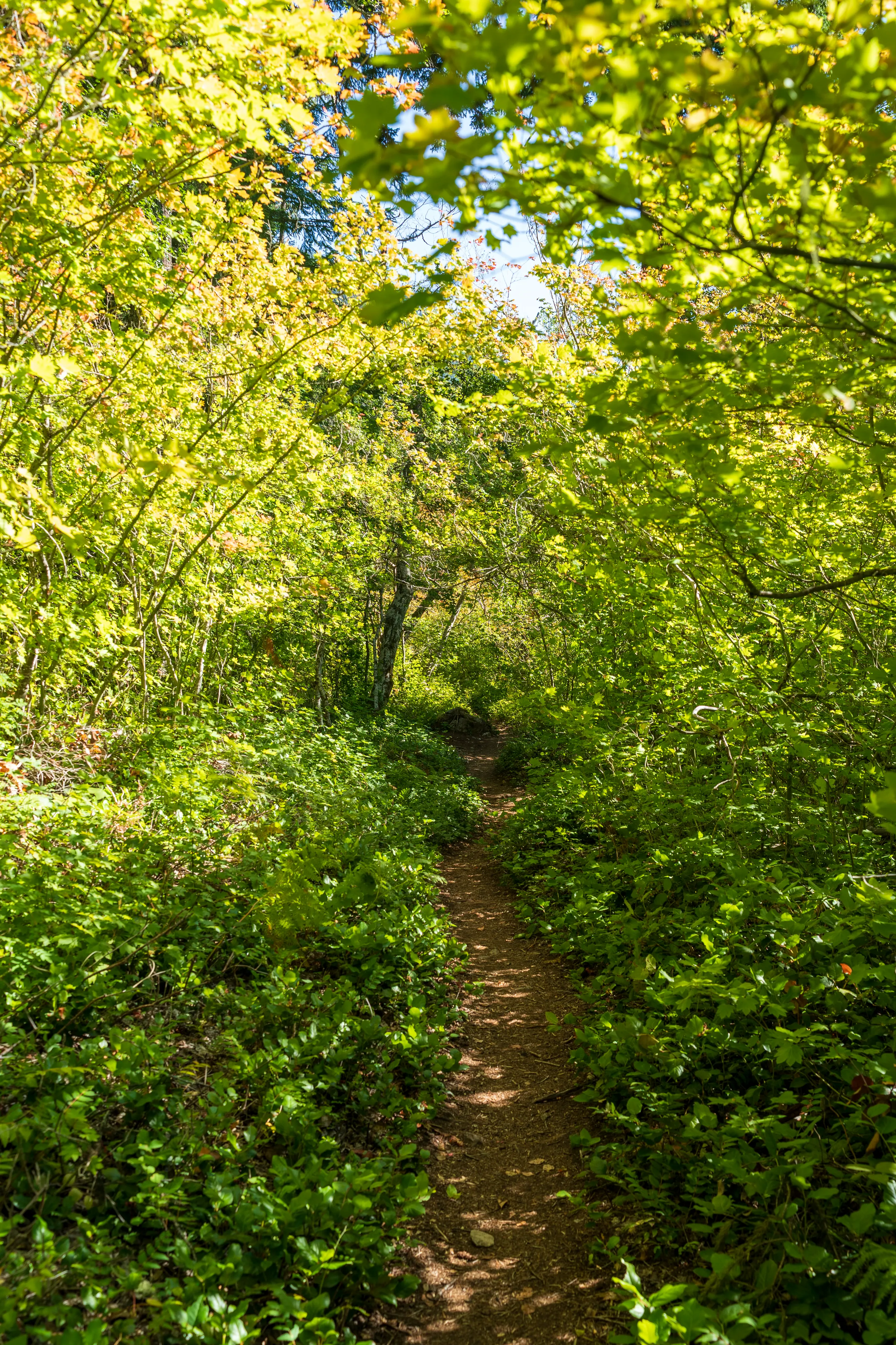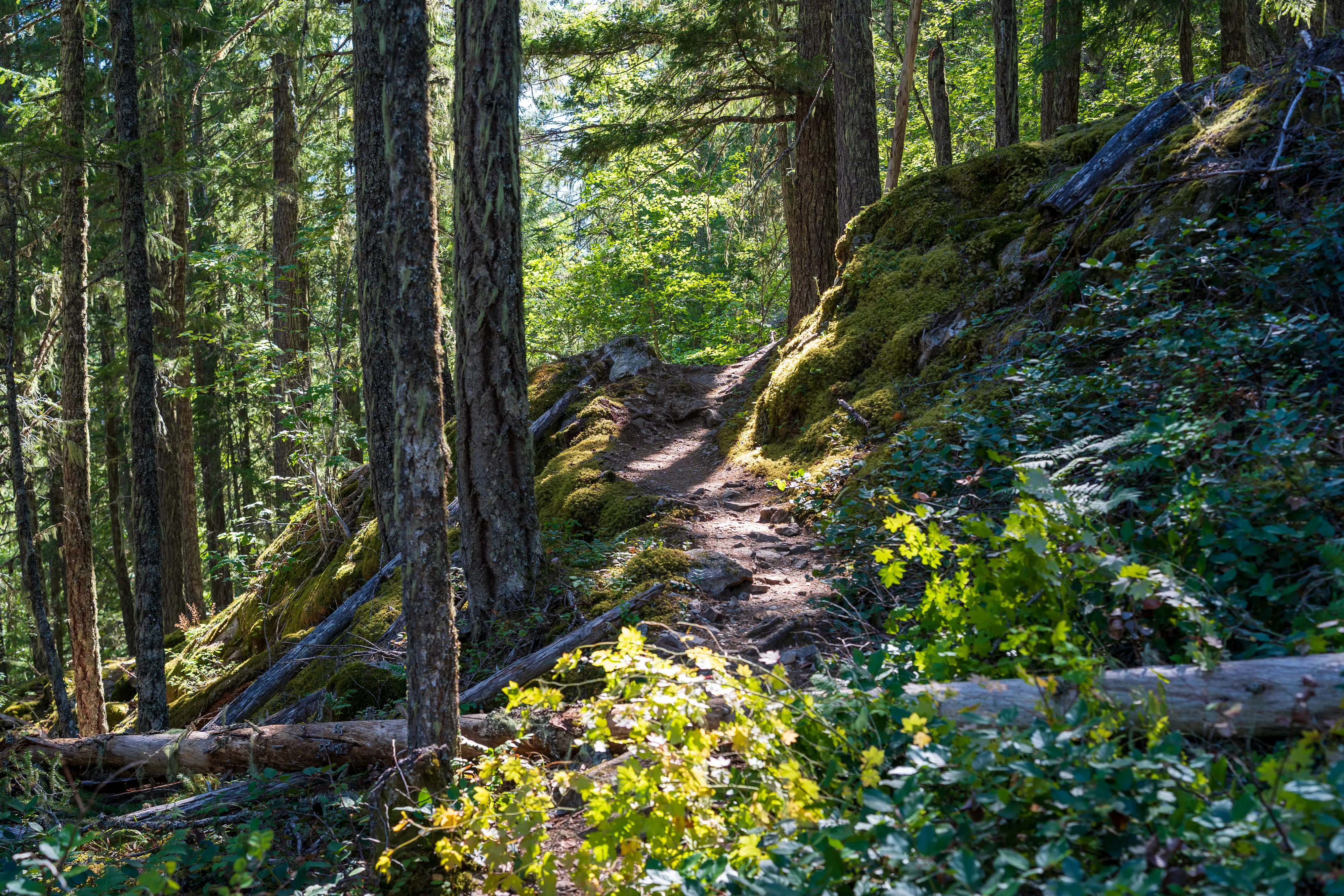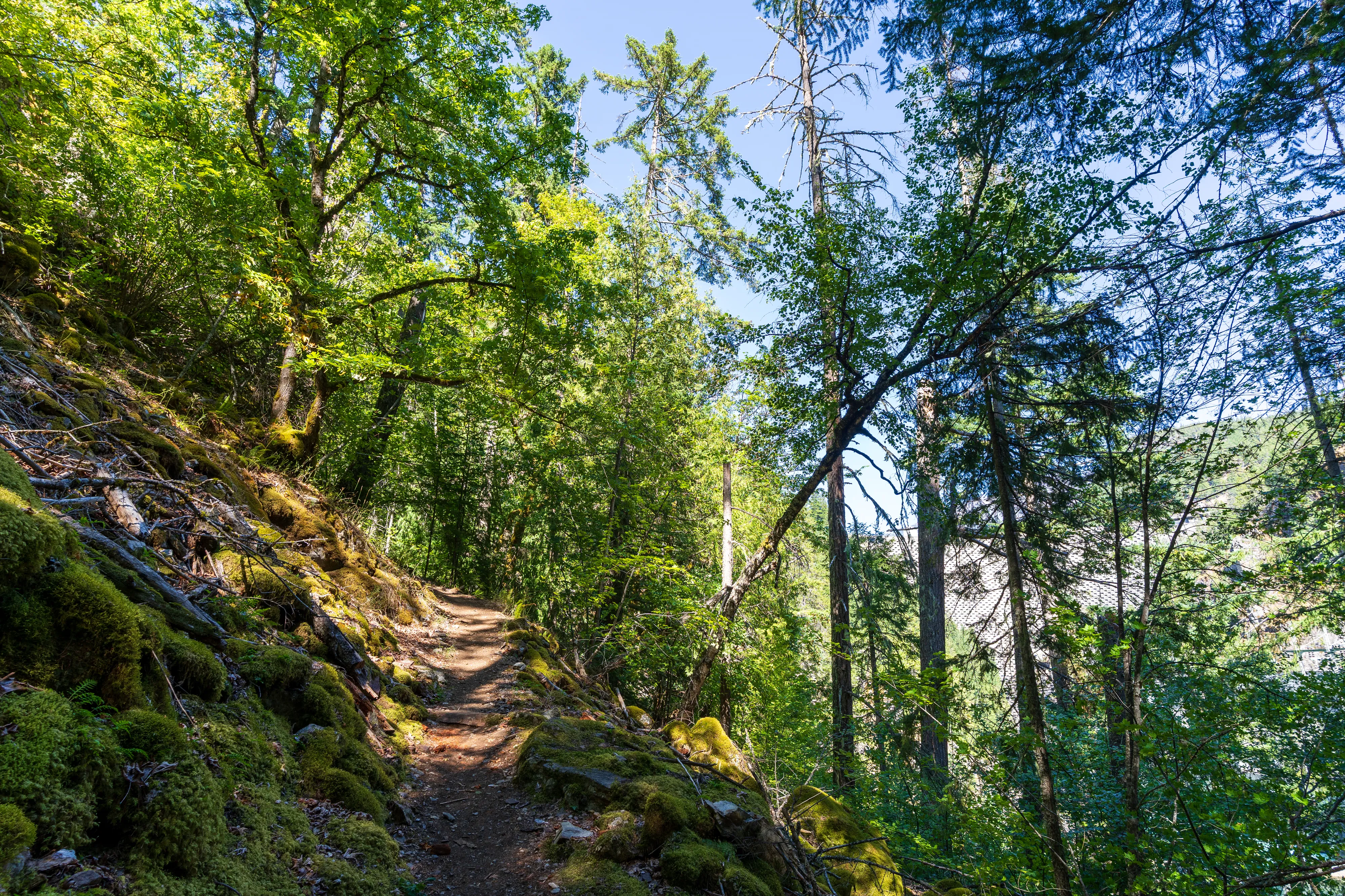 Der Wanderweg beginnt mit einer Hängebrücke und führt dann oberhalb des Sees durch wunderschöne, mal dichte, mal lichte, Wälder und gewährt ab und zu auch Blicke ins Tal.