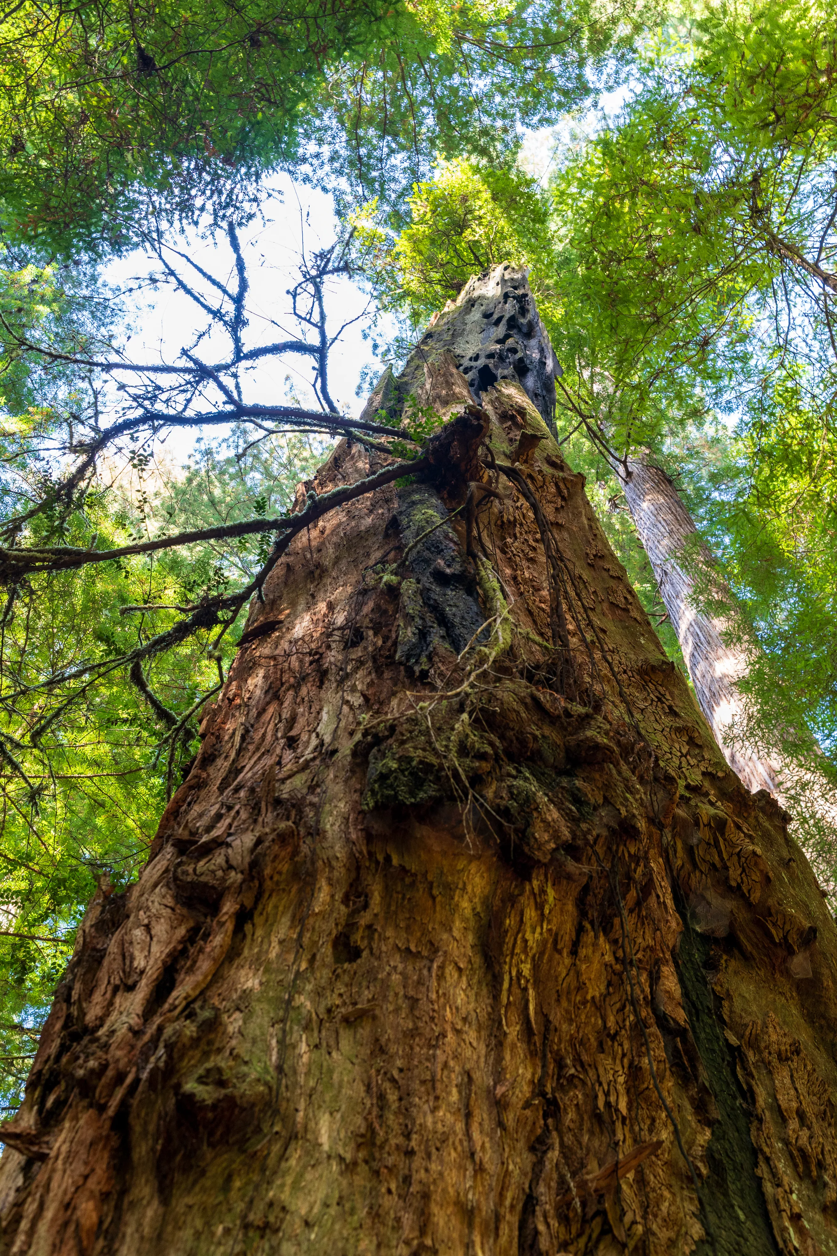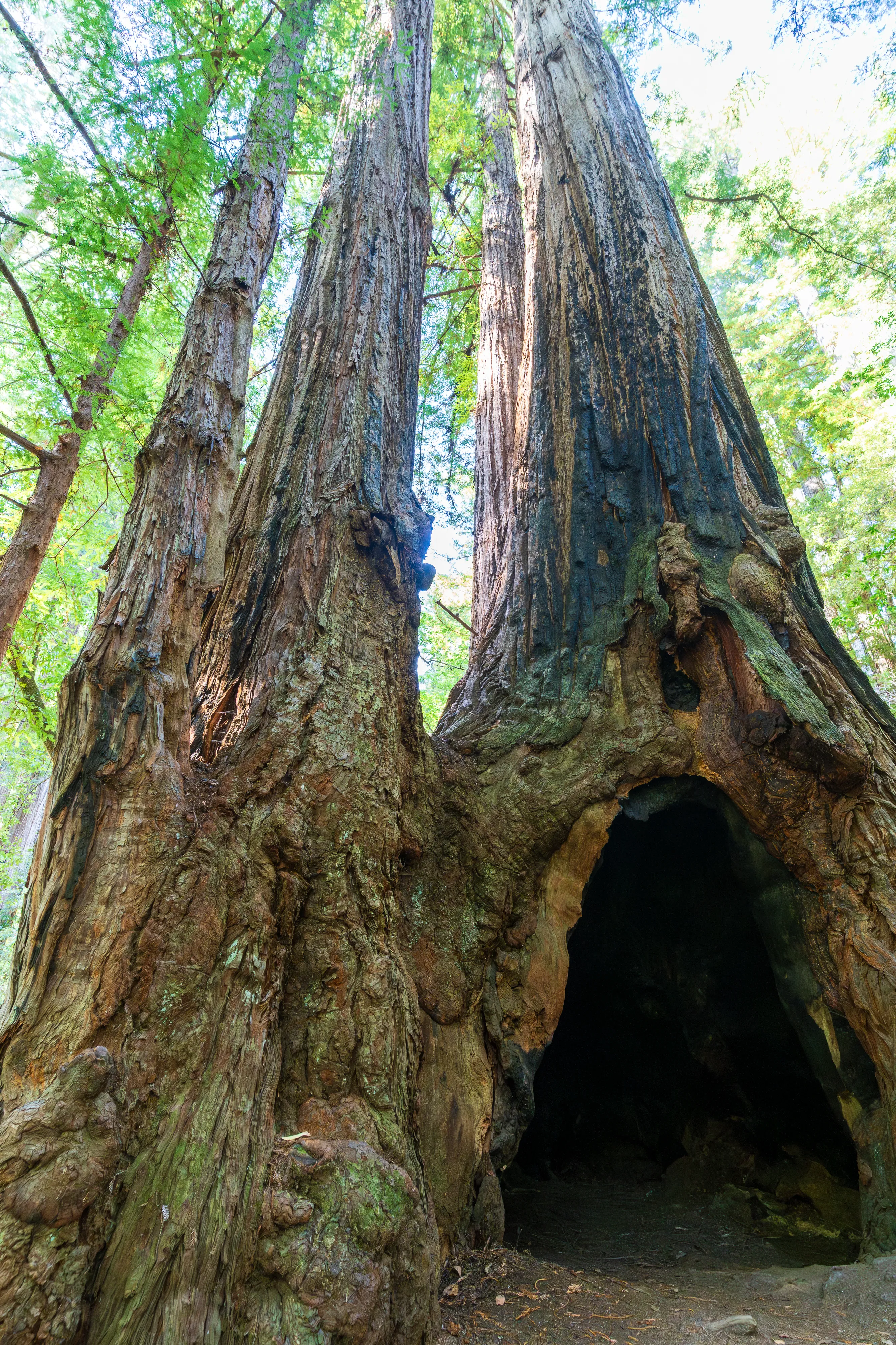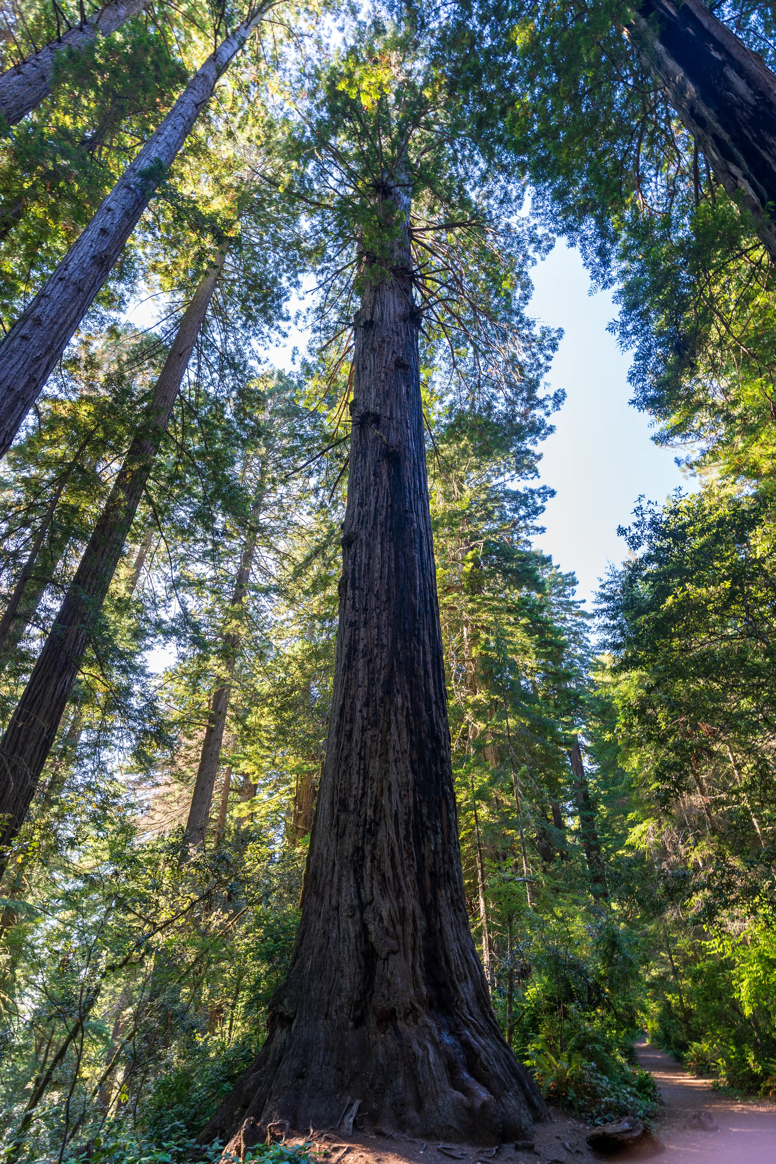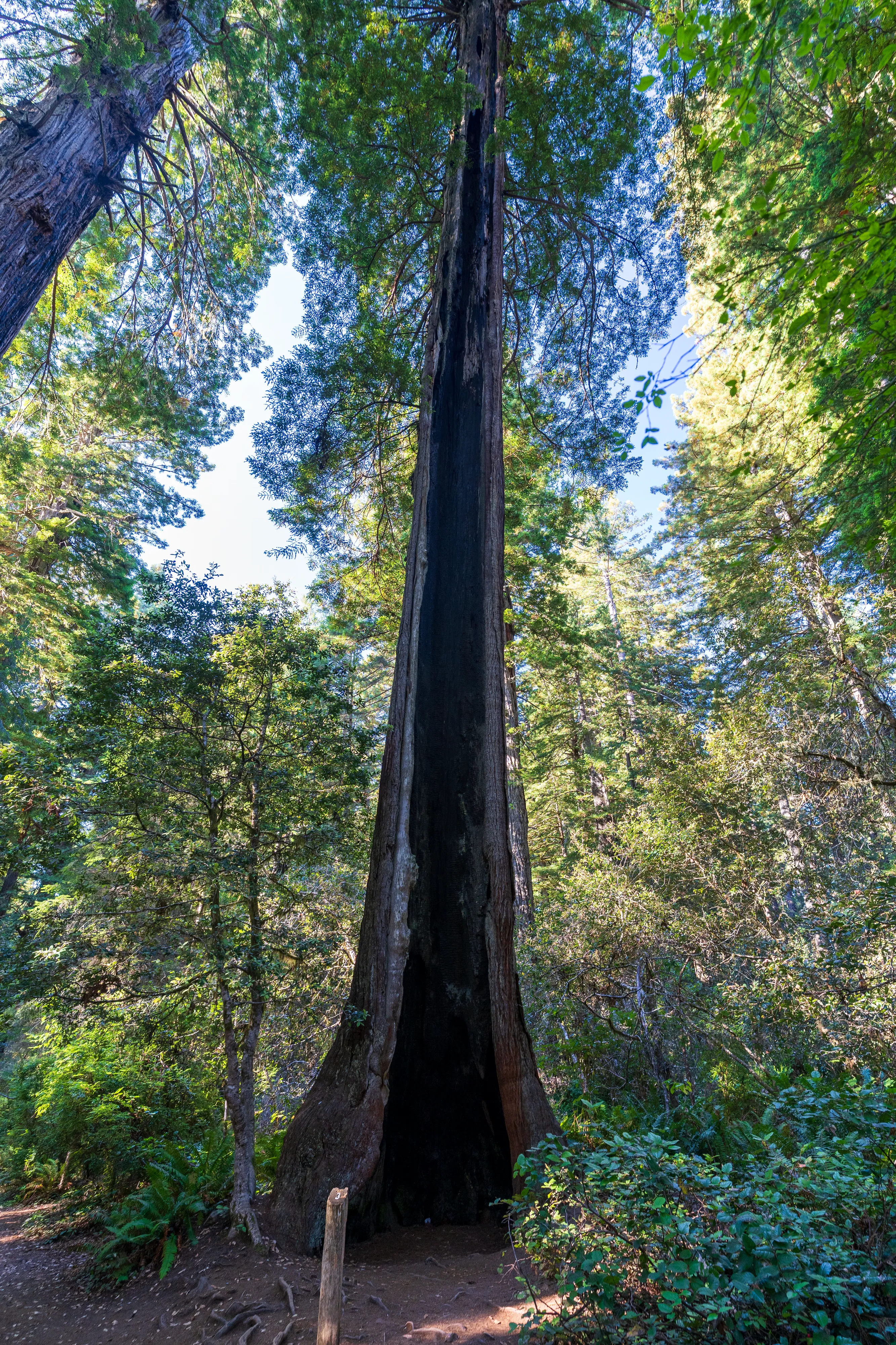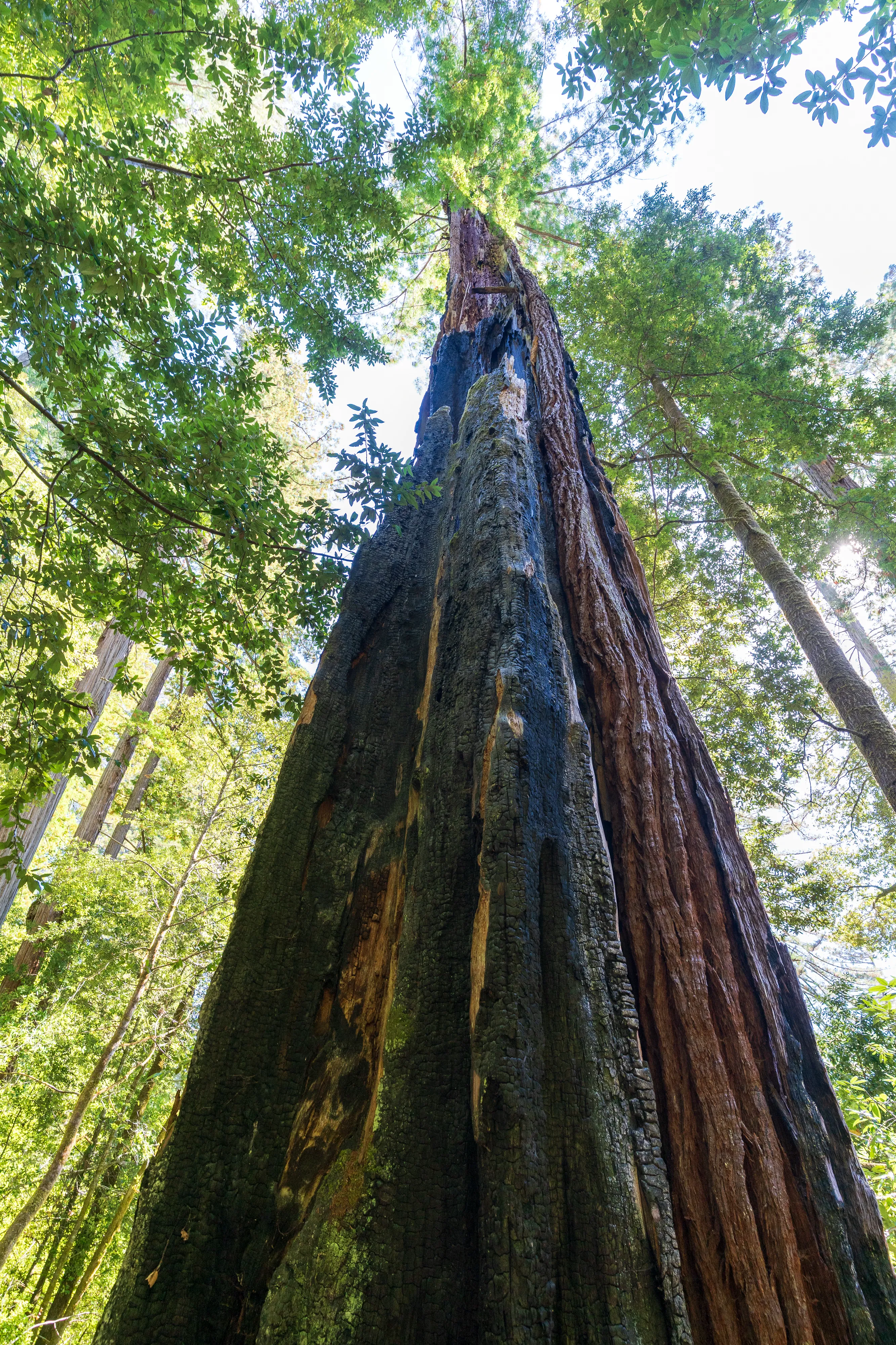 Der Küstenmammutbaum alias Coast Redwood (Sequoia sempervirens) ist vom Aussterben bedroht und nur noch an wenigen Orten zu finden, da sie in der Vergangenheit großflächig wegen ihres Holzes gefällt wurden. Das Holz ist wegen seiner Langlebigkeit und Feuerfestigkeit beliebt. Dadurch, dass Redwoods in ihrer Rinde hauptsächlich Wasser anstelle von Harz haben, ist die Rinde feuerfest und schmort eher als dass sie brennt. So kann es sein, dass ein Redwood durch wiederholte Waldbrände “innerlich” verkohlt und sogar hohl ausbrennt, die Rinde jedoch bestehen bleibt, den Baum weiterhin stützt und dieser weiterlebt. Die Mammutbäume können mehr als 2000 Jahre alt werden und während dieser Zeit eine stolze Größe von etwa 115 m und einen Umfang von 8 bis 9 m erreichen. Ganz schön beeindruckende Riesen.