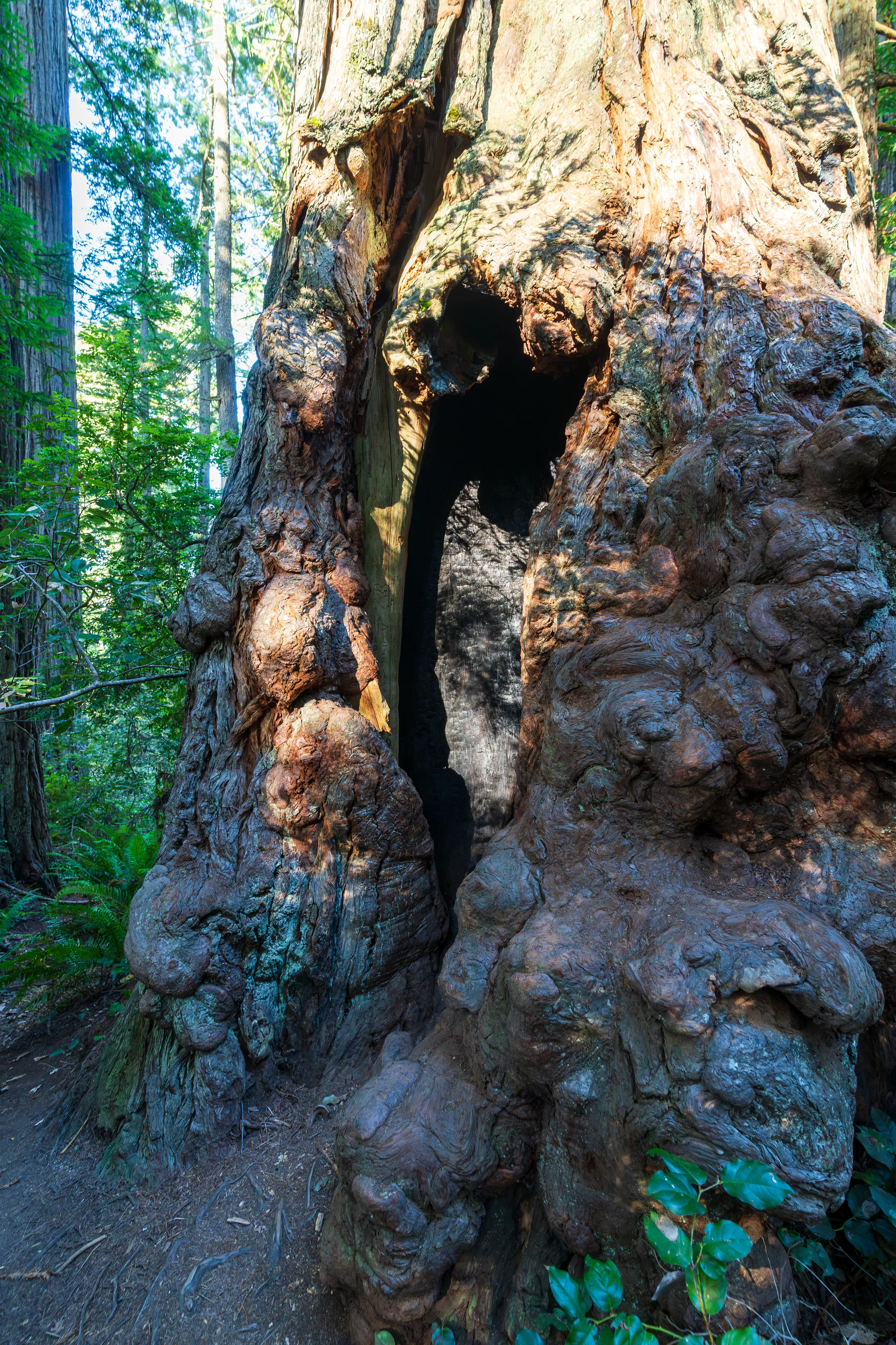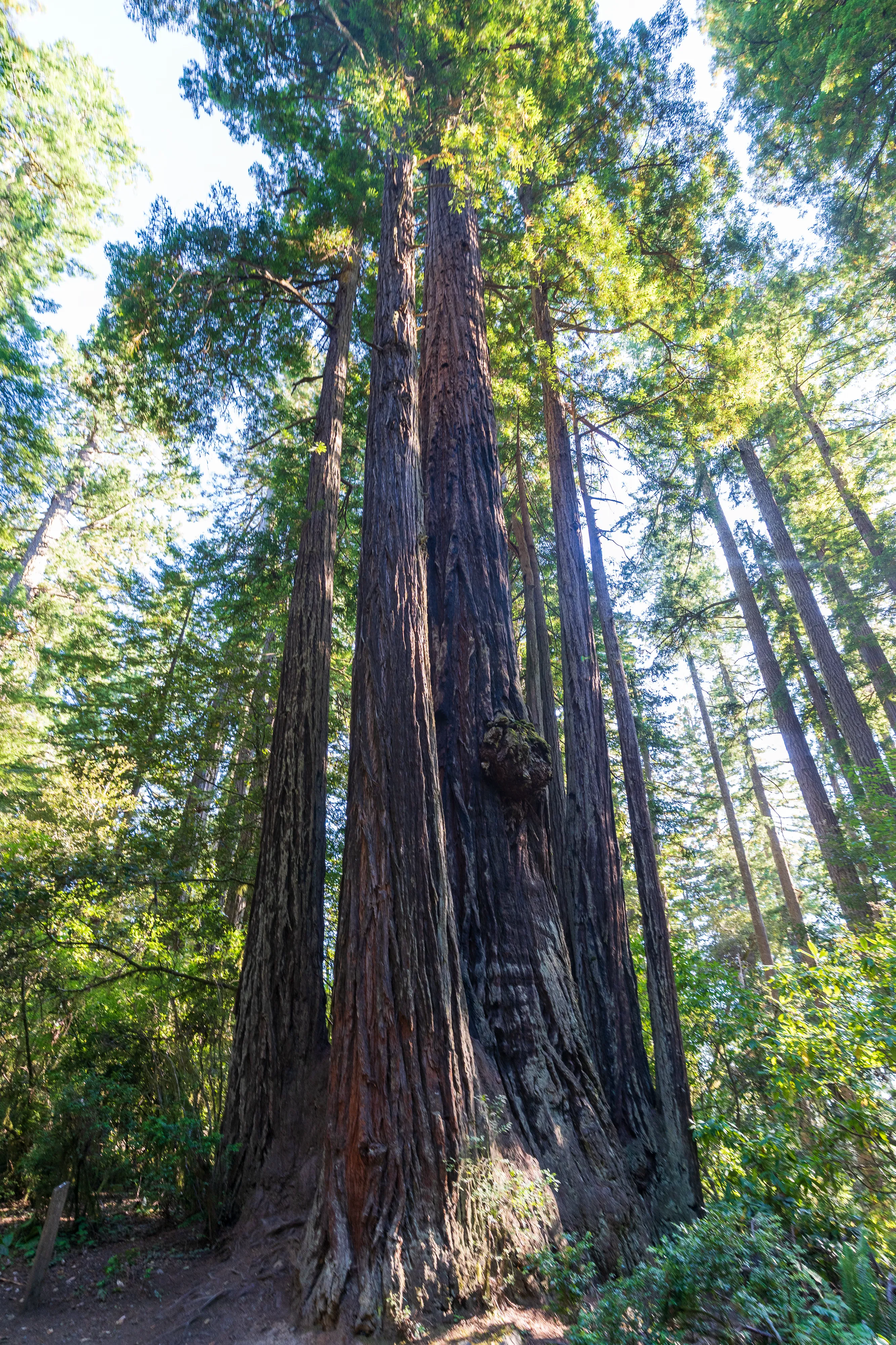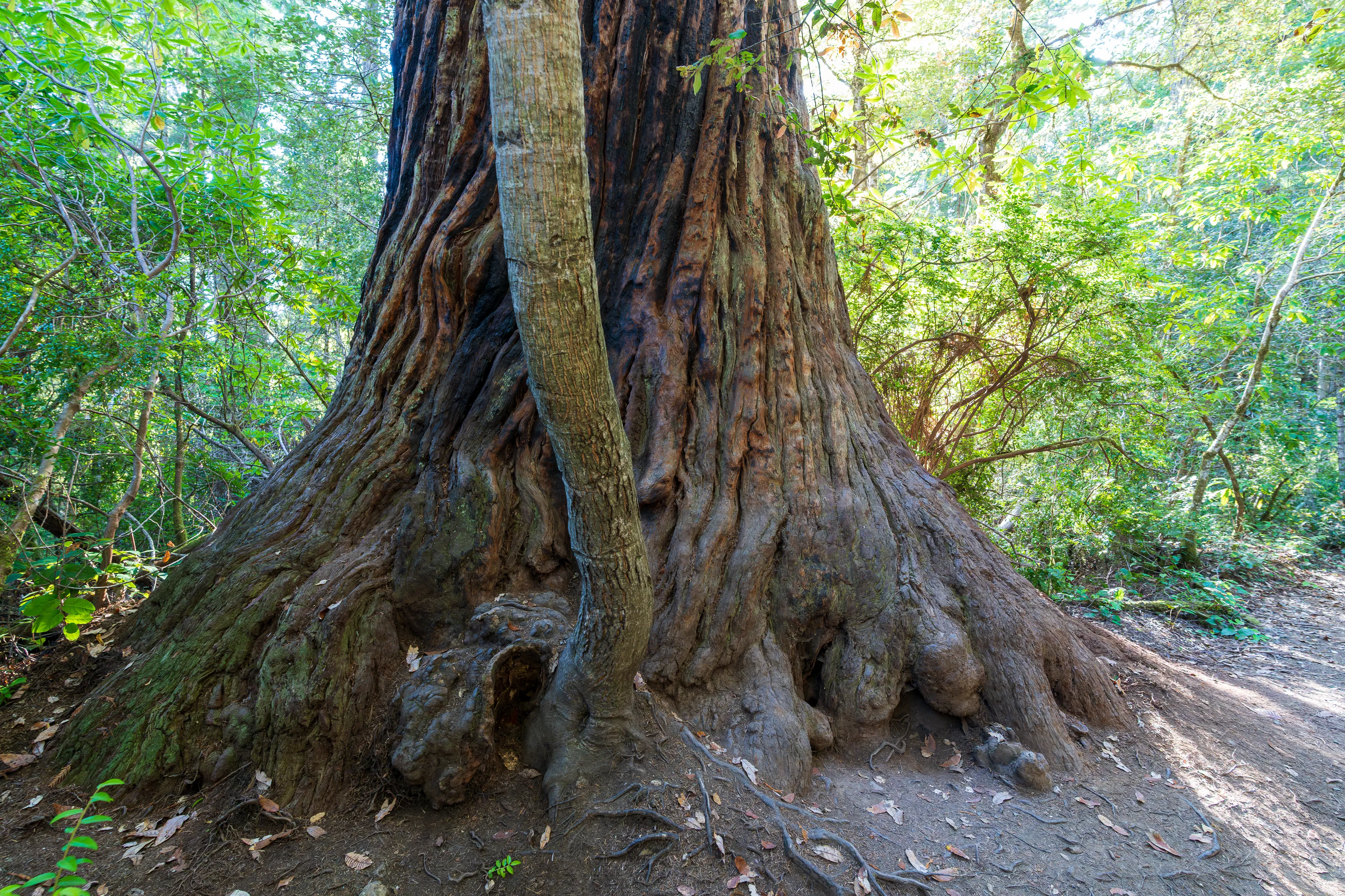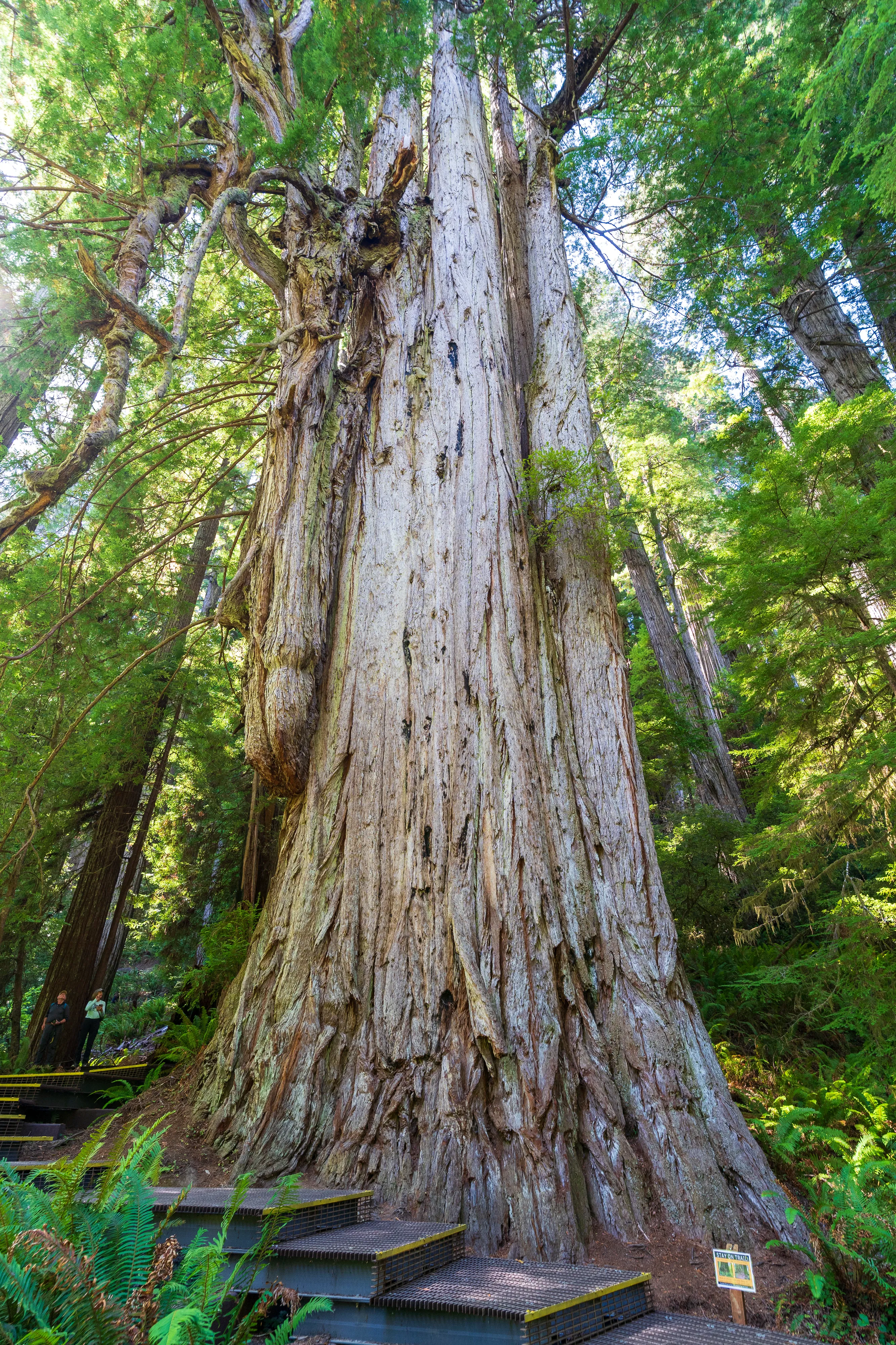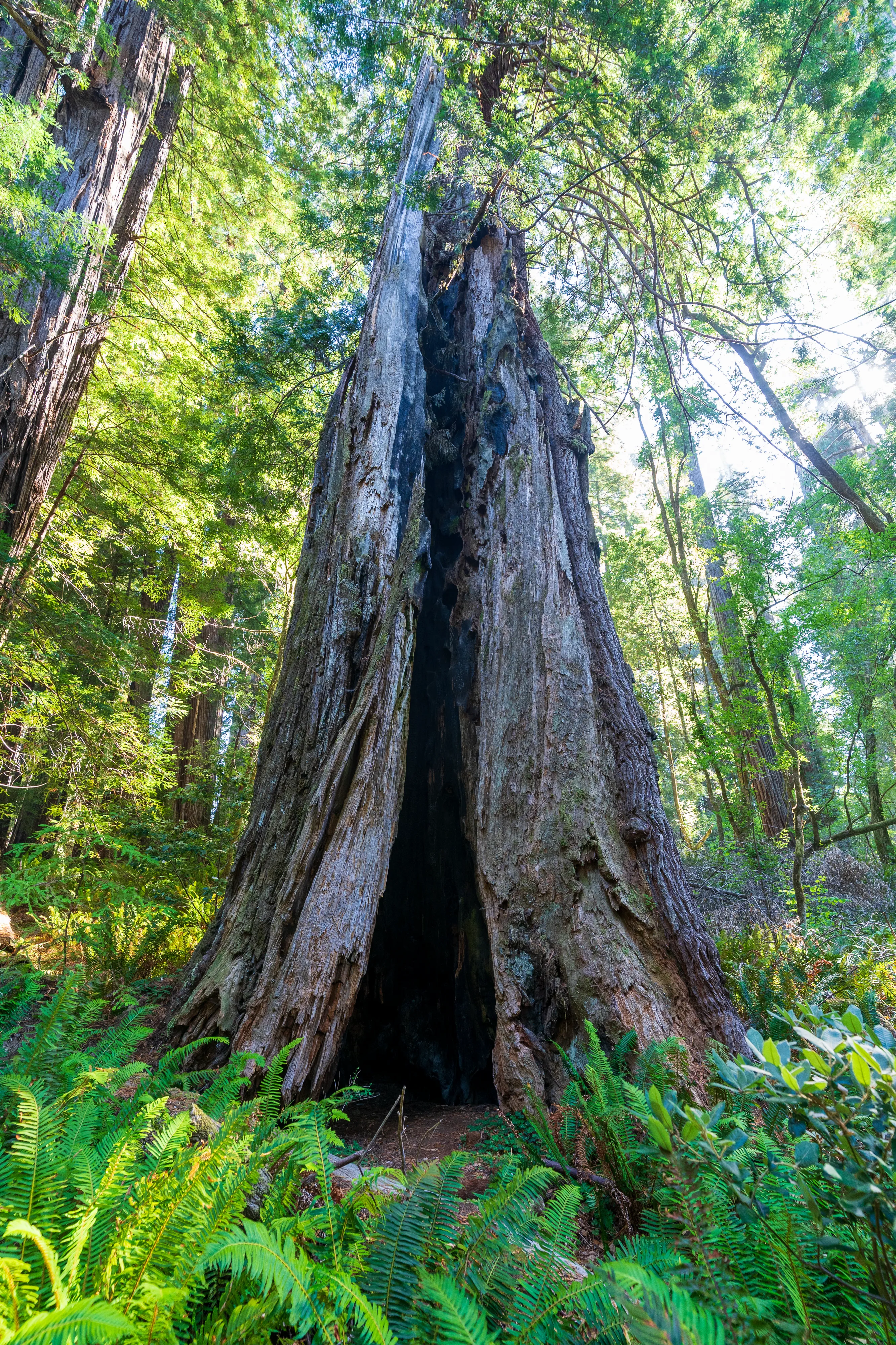 Der Küstenmammutbaum alias Coast Redwood (Sequoia sempervirens) ist vom Aussterben bedroht und nur noch an wenigen Orten zu finden, da sie in der Vergangenheit großflächig wegen ihres Holzes gefällt wurden. Das Holz ist wegen seiner Langlebigkeit und Feuerfestigkeit beliebt. Dadurch, dass Redwoods in ihrer Rinde hauptsächlich Wasser anstelle von Harz haben, ist die Rinde feuerfest und schmort eher als dass sie brennt. So kann es sein, dass ein Redwood durch wiederholte Waldbrände “innerlich” verkohlt und sogar hohl ausbrennt, die Rinde jedoch bestehen bleibt, den Baum weiterhin stützt und dieser weiterlebt. Die Mammutbäume können mehr als 2000 Jahre alt werden und während dieser Zeit eine stolze Größe von etwa 115 m und einen Umfang von 8 bis 9 m erreichen. Ganz schön beeindruckende Riesen.