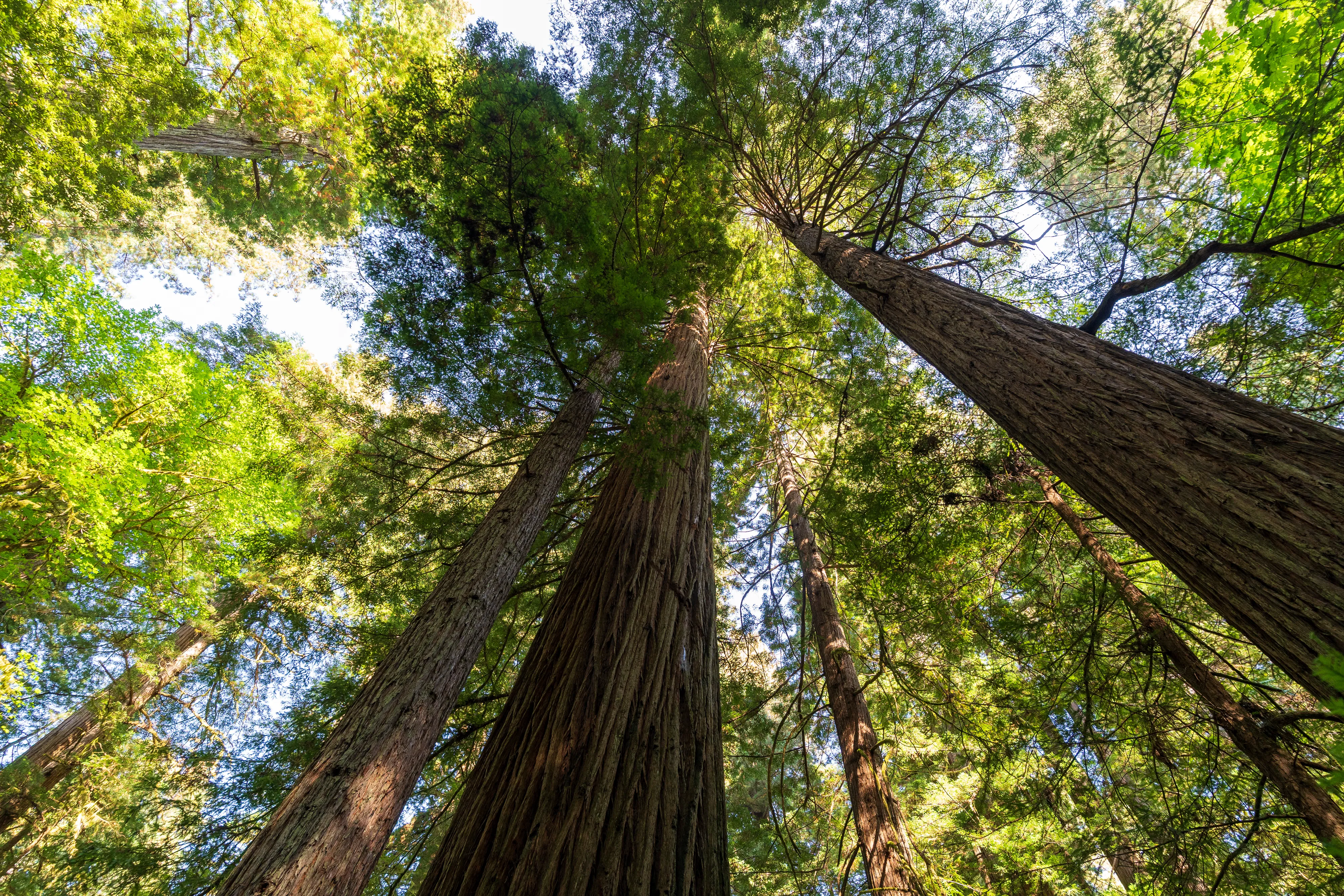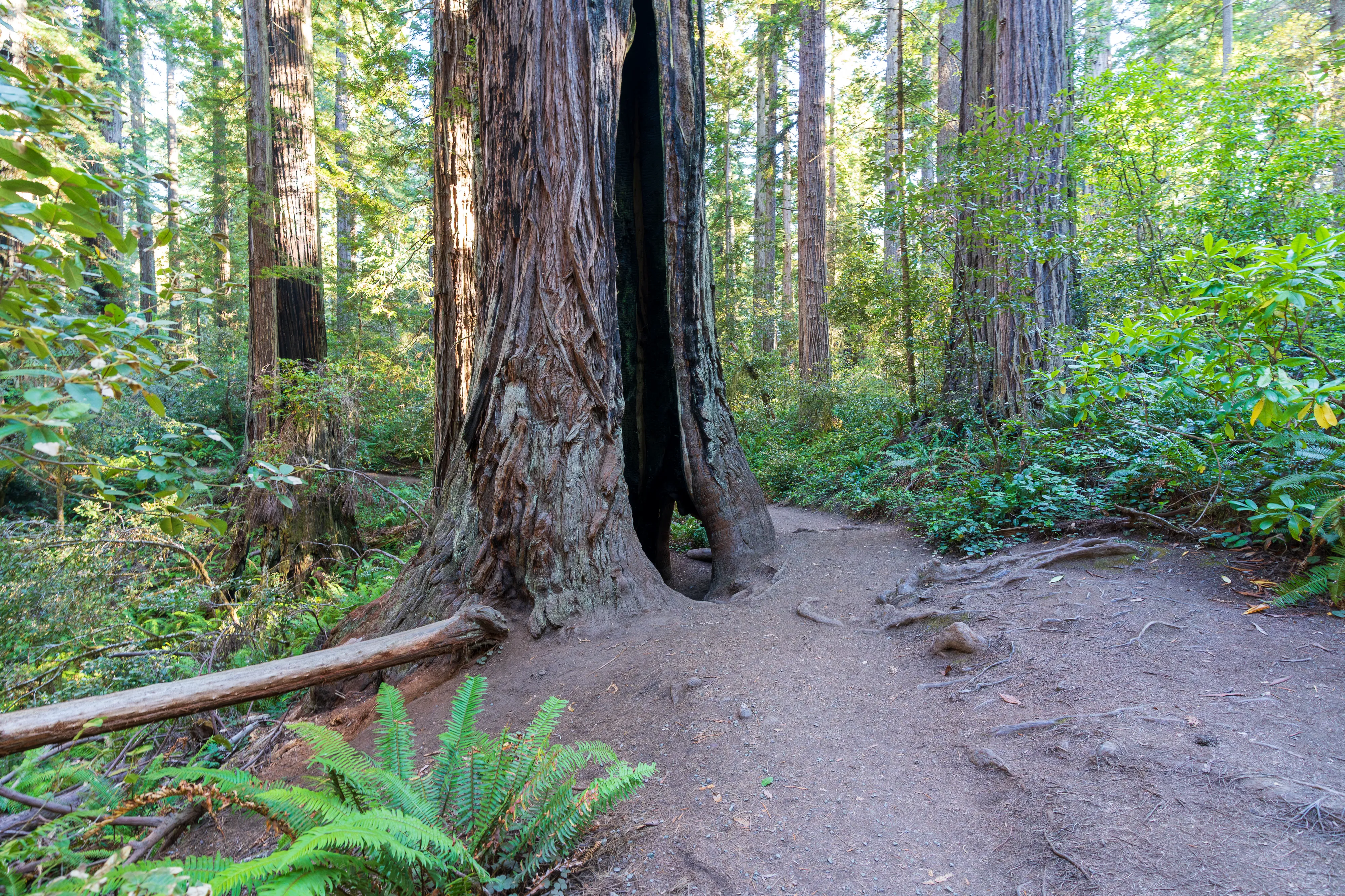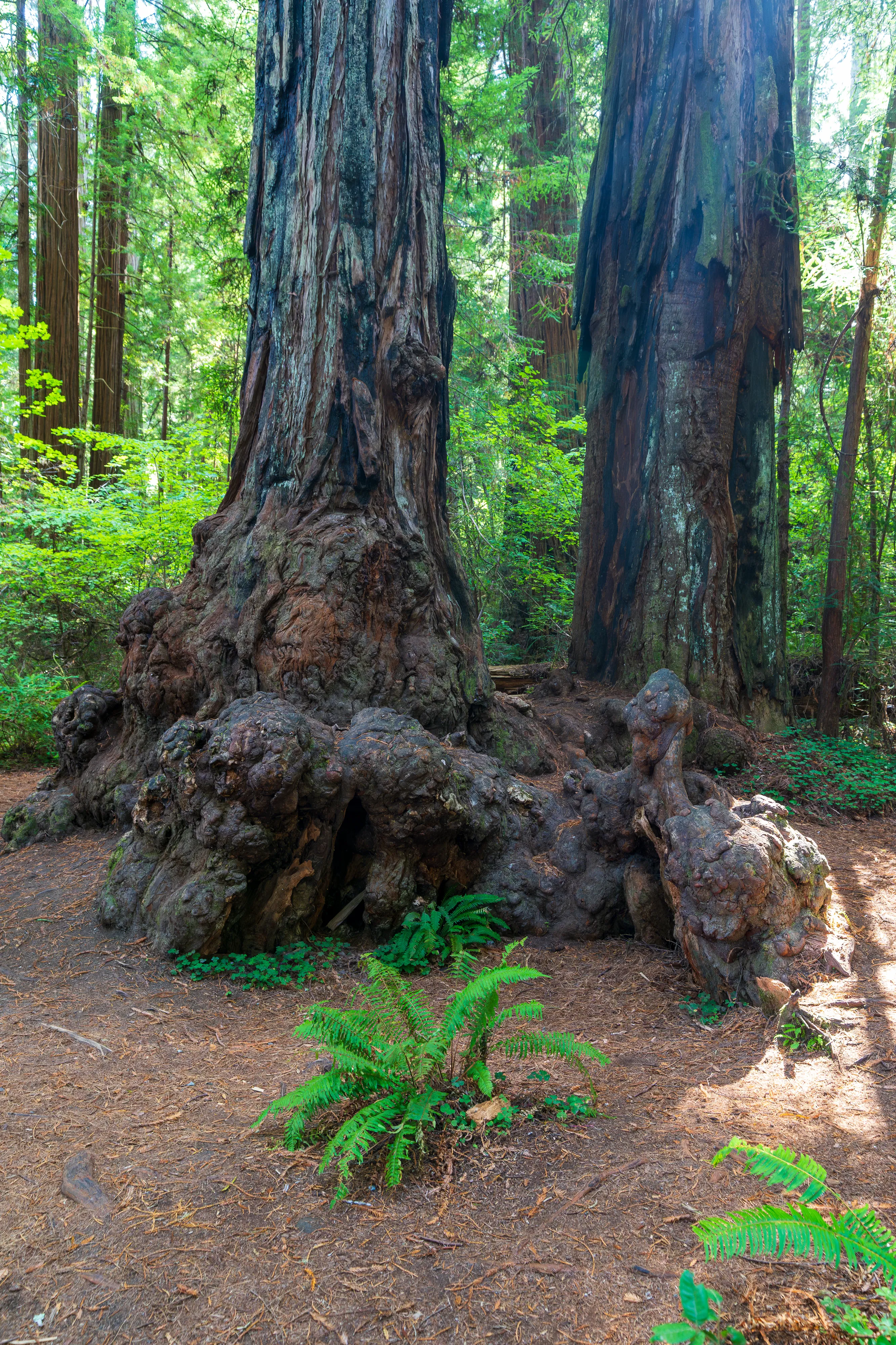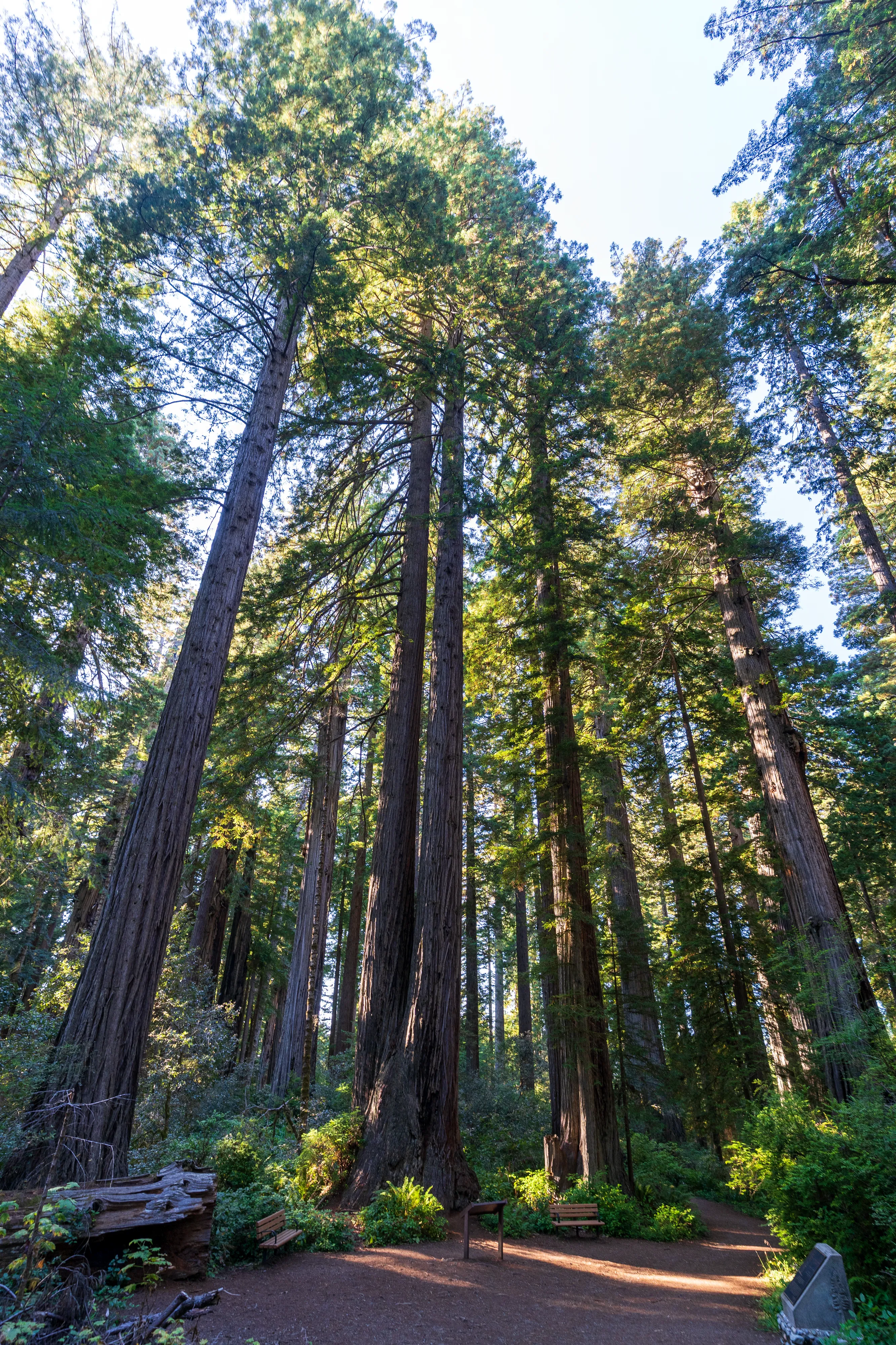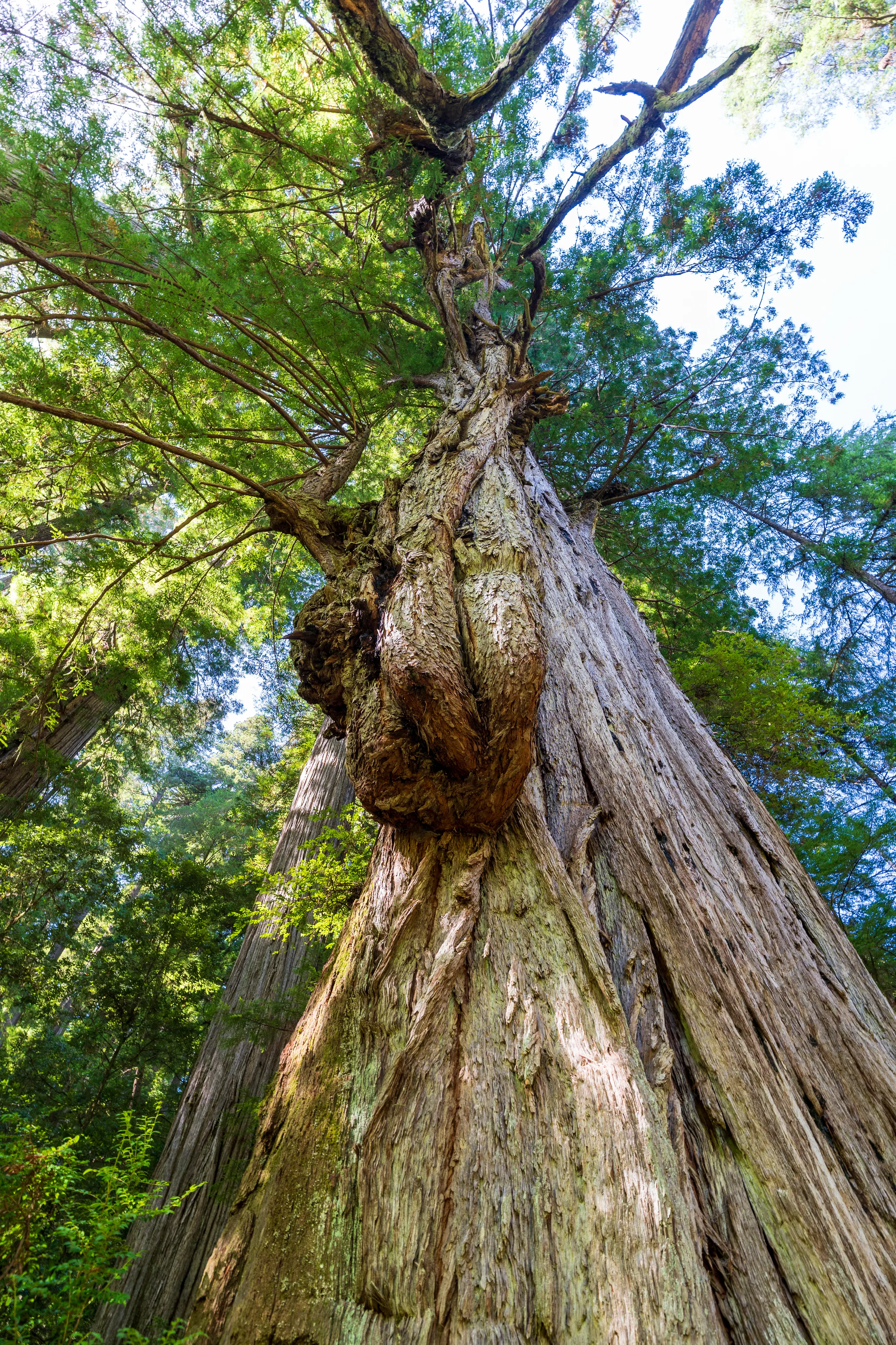 Der Küstenmammutbaum alias Coast Redwood (Sequoia sempervirens) ist vom Aussterben bedroht und nur noch an wenigen Orten zu finden, da sie in der Vergangenheit großflächig wegen ihres Holzes gefällt wurden. Das Holz ist wegen seiner Langlebigkeit und Feuerfestigkeit beliebt. Dadurch, dass Redwoods in ihrer Rinde hauptsächlich Wasser anstelle von Harz haben, ist die Rinde feuerfest und schmort eher als dass sie brennt. So kann es sein, dass ein Redwood durch wiederholte Waldbrände “innerlich” verkohlt und sogar hohl ausbrennt, die Rinde jedoch bestehen bleibt, den Baum weiterhin stützt und dieser weiterlebt. Die Mammutbäume können mehr als 2000 Jahre alt werden und während dieser Zeit eine stolze Größe von etwa 115 m und einen Umfang von 8 bis 9 m erreichen. Ganz schön beeindruckende Riesen.