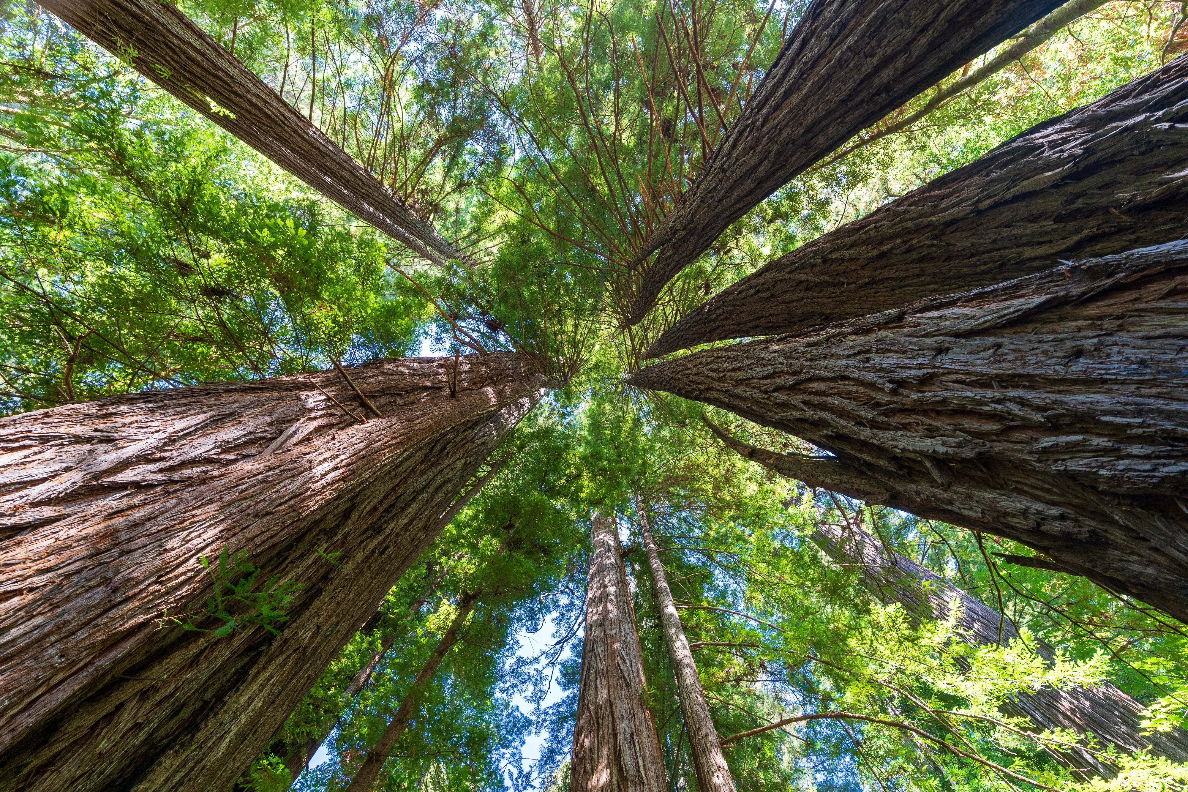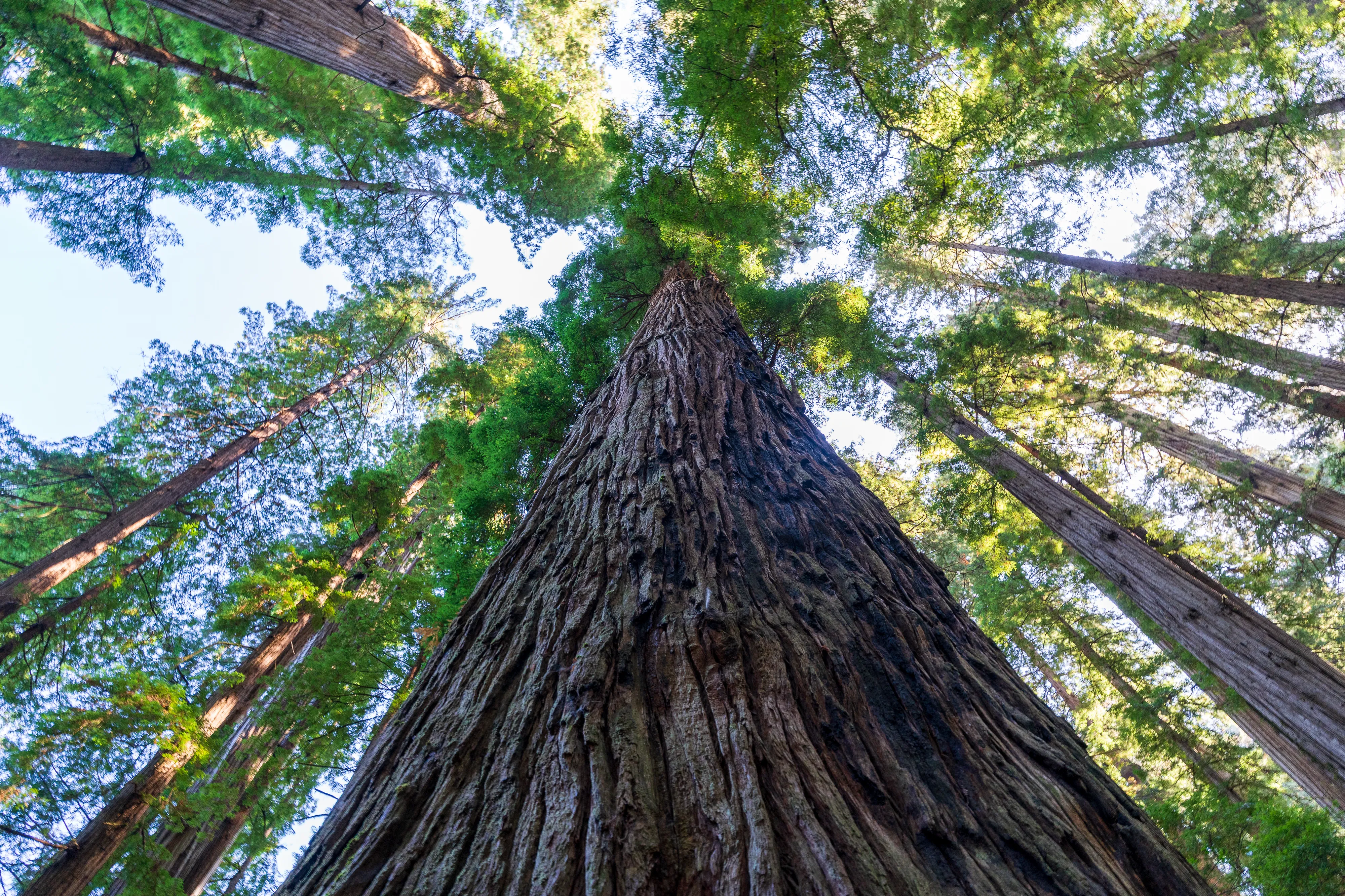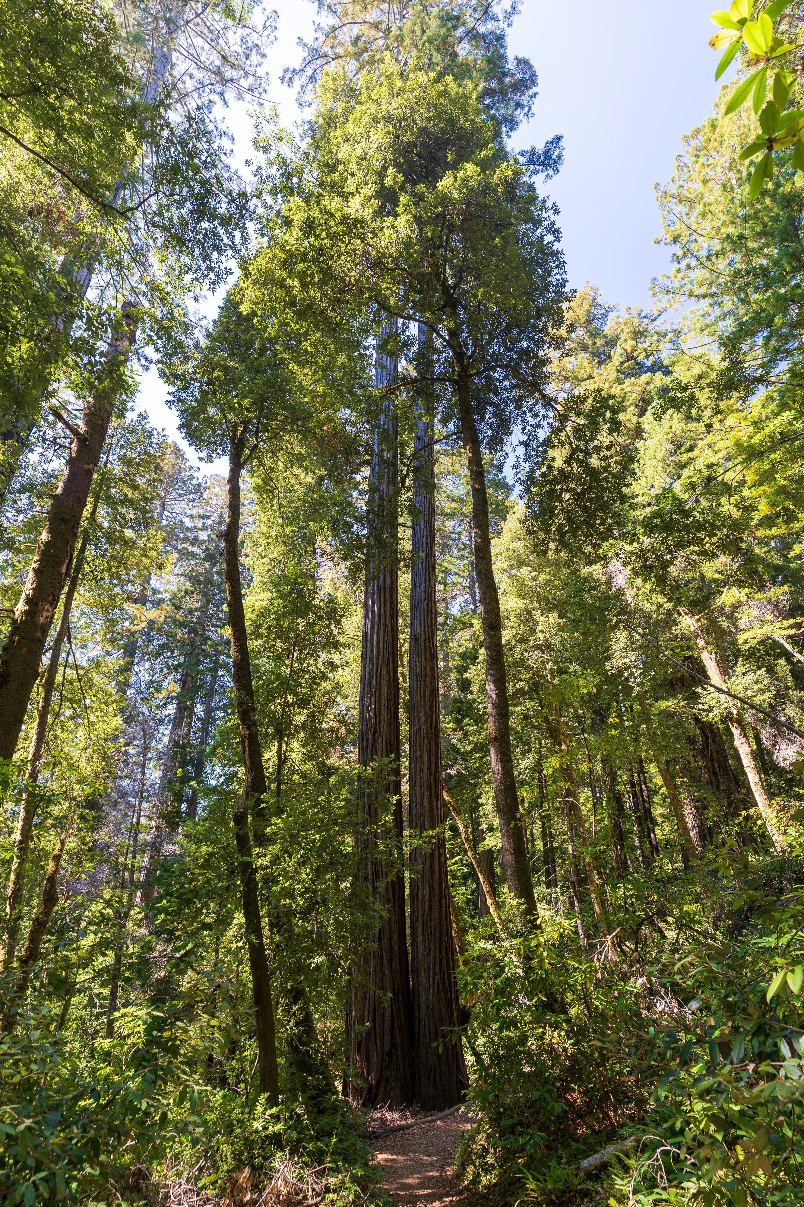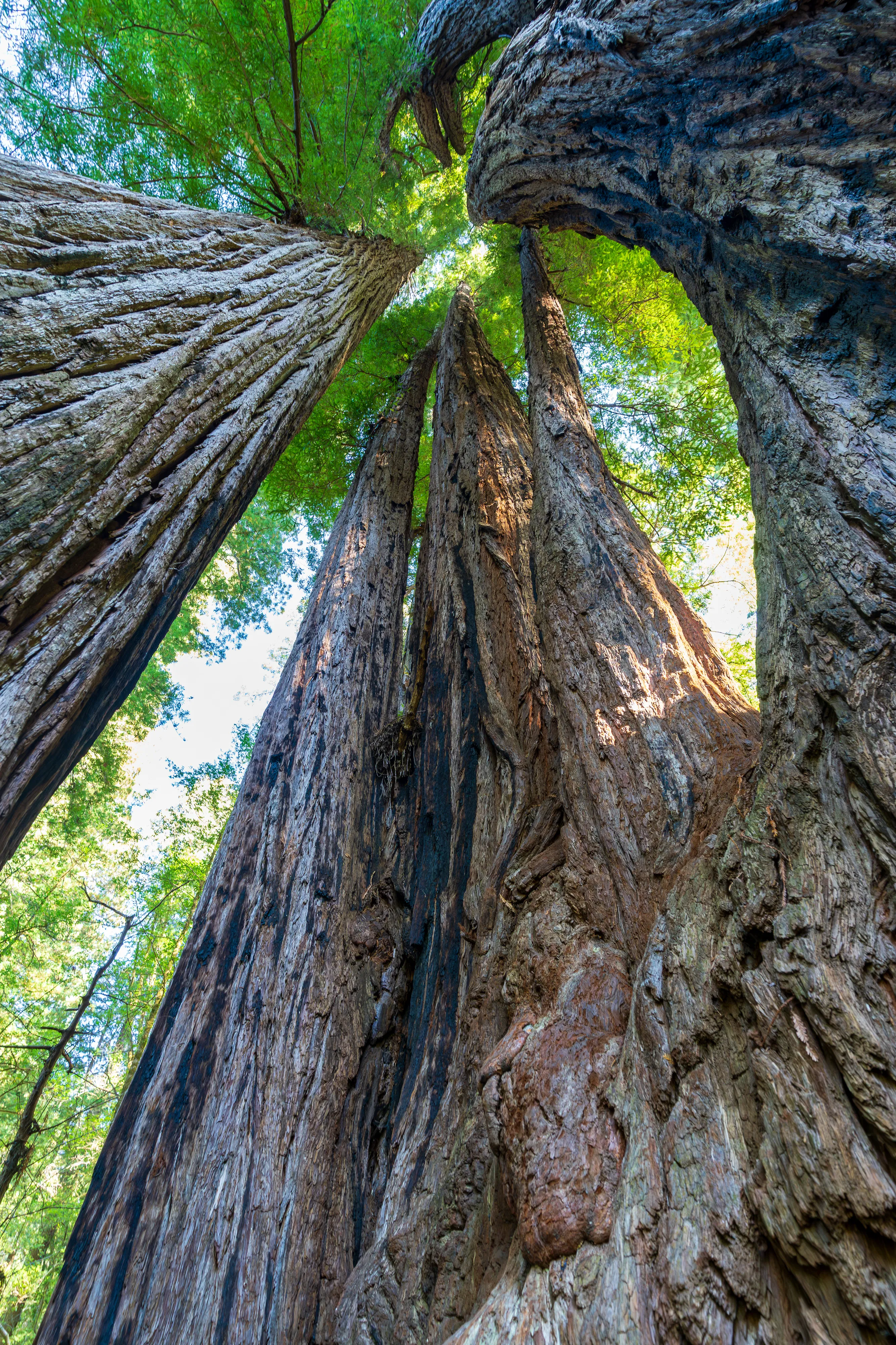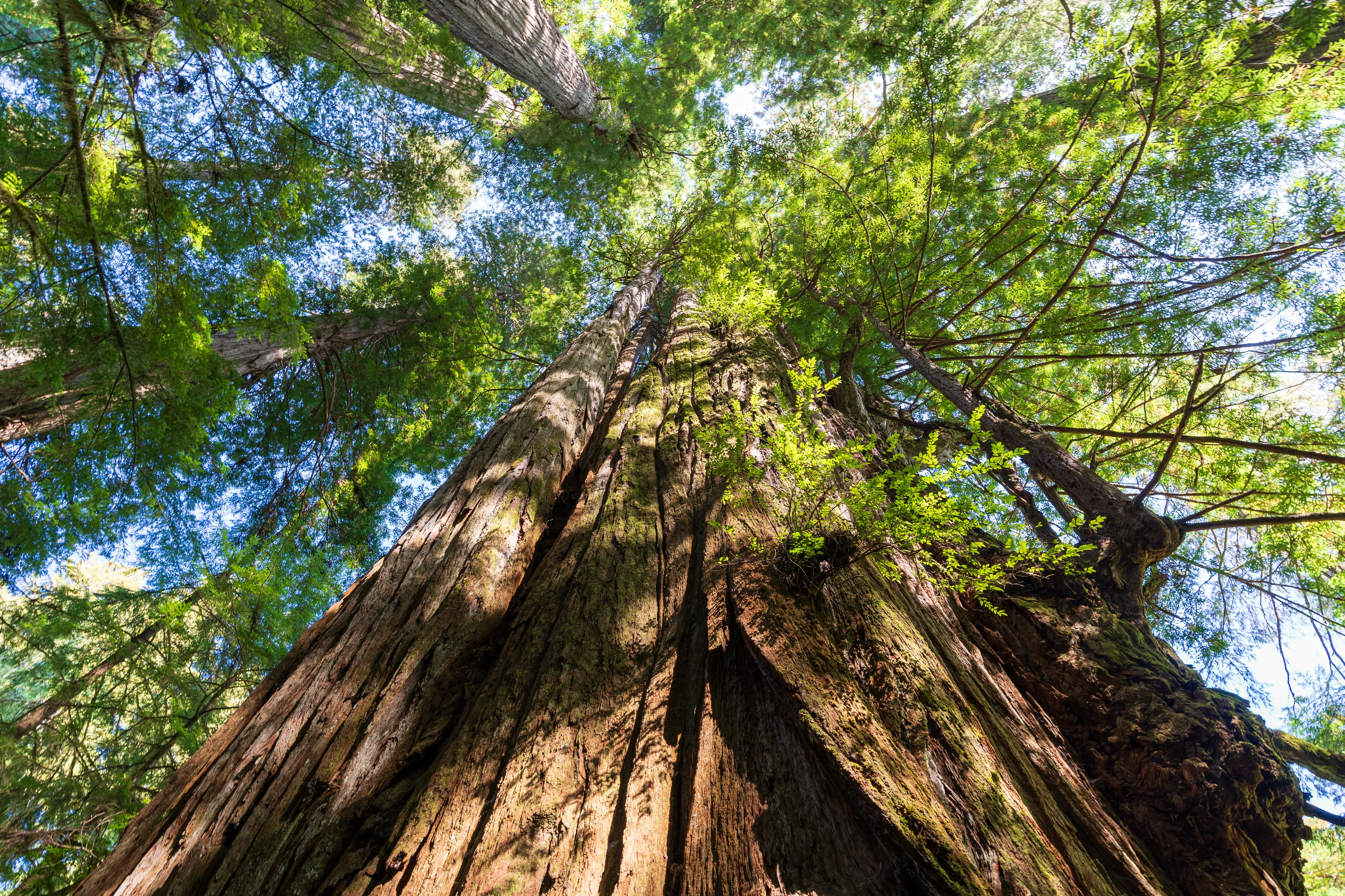 Der Küstenmammutbaum alias Coast Redwood (Sequoia sempervirens) ist vom Aussterben bedroht und nur noch an wenigen Orten zu finden, da sie in der Vergangenheit großflächig wegen ihres Holzes gefällt wurden. Das Holz ist wegen seiner Langlebigkeit und Feuerfestigkeit beliebt. Dadurch, dass Redwoods in ihrer Rinde hauptsächlich Wasser anstelle von Harz haben, ist die Rinde feuerfest und schmort eher als dass sie brennt. So kann es sein, dass ein Redwood durch wiederholte Waldbrände “innerlich” verkohlt und sogar hohl ausbrennt, die Rinde jedoch bestehen bleibt, den Baum weiterhin stützt und dieser weiterlebt. Die Mammutbäume können mehr als 2000 Jahre alt werden und während dieser Zeit eine stolze Größe von etwa 115 m und einen Umfang von 8 bis 9 m erreichen. Ganz schön beeindruckende Riesen.
