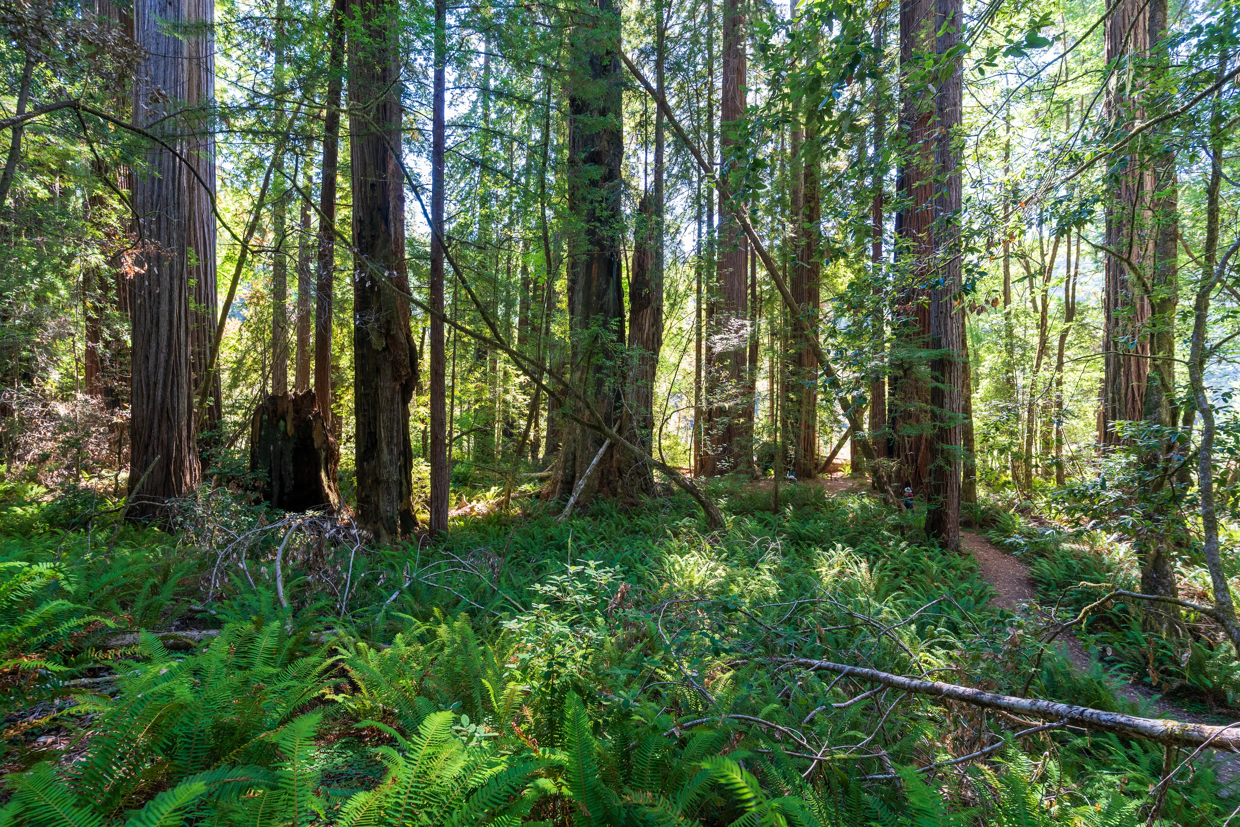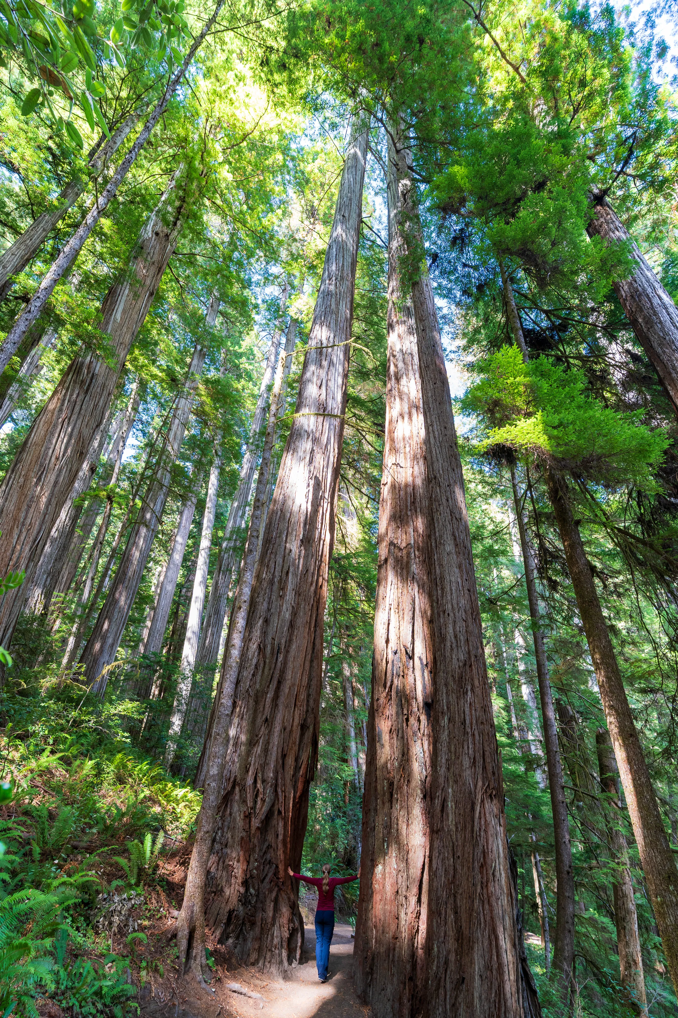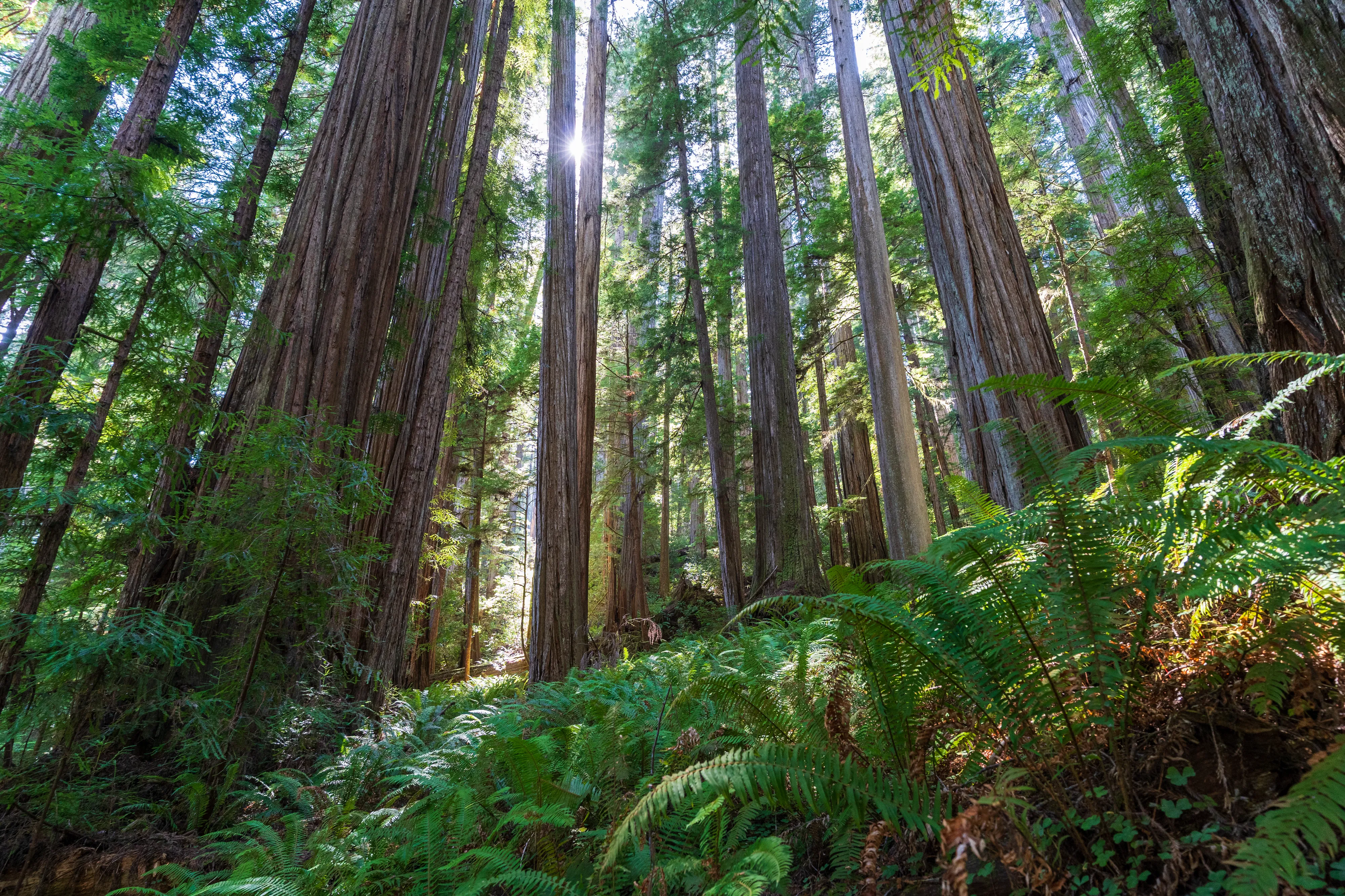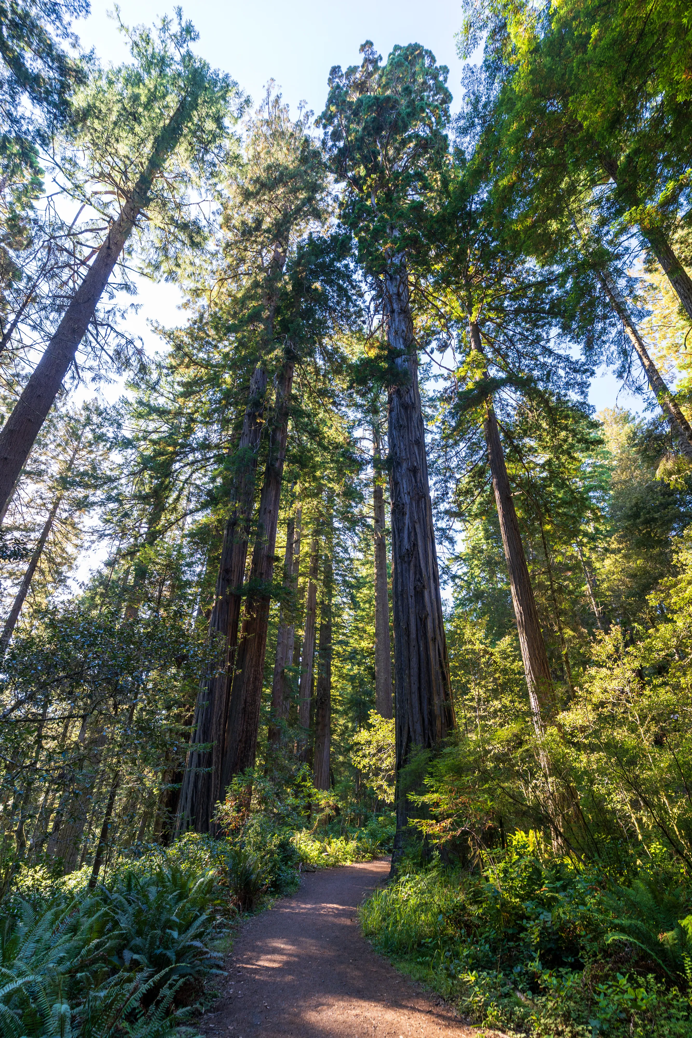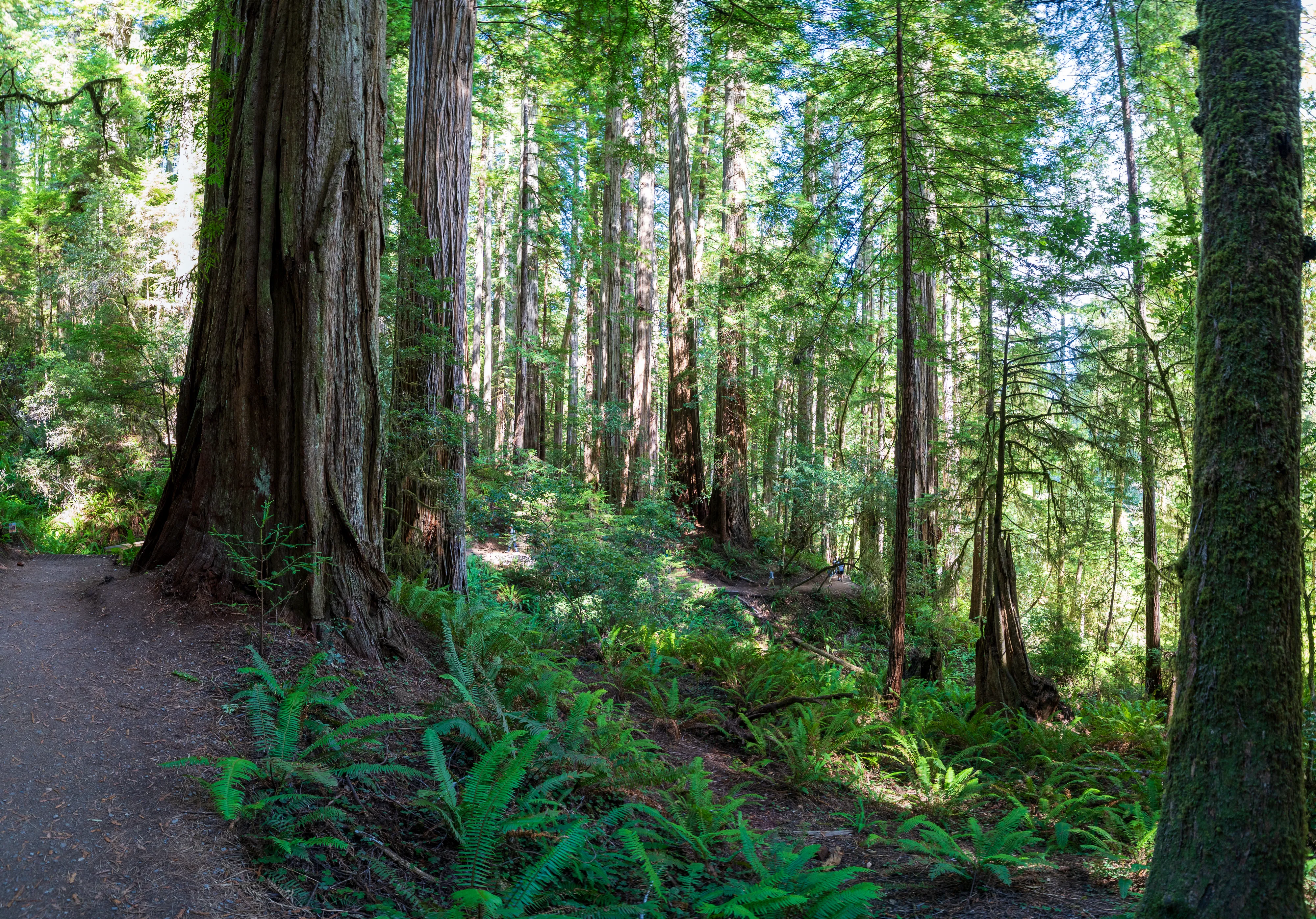 Der Küstenmammutbaum alias Coast Redwood (Sequoia sempervirens) ist vom Aussterben bedroht und nur noch an wenigen Orten zu finden, da sie in der Vergangenheit großflächig wegen ihres Holzes gefällt wurden. Das Holz ist wegen seiner Langlebigkeit und Feuerfestigkeit beliebt. Dadurch, dass Redwoods in ihrer Rinde hauptsächlich Wasser anstelle von Harz haben, ist die Rinde feuerfest und schmort eher als dass sie brennt. So kann es sein, dass ein Redwood durch wiederholte Waldbrände “innerlich” verkohlt und sogar hohl ausbrennt, die Rinde jedoch bestehen bleibt, den Baum weiterhin stützt und dieser weiterlebt. Die Mammutbäume können mehr als 2000 Jahre alt werden und während dieser Zeit eine stolze Größe von etwa 115 m und einen Umfang von 8 bis 9 m erreichen. Ganz schön beeindruckende Riesen.