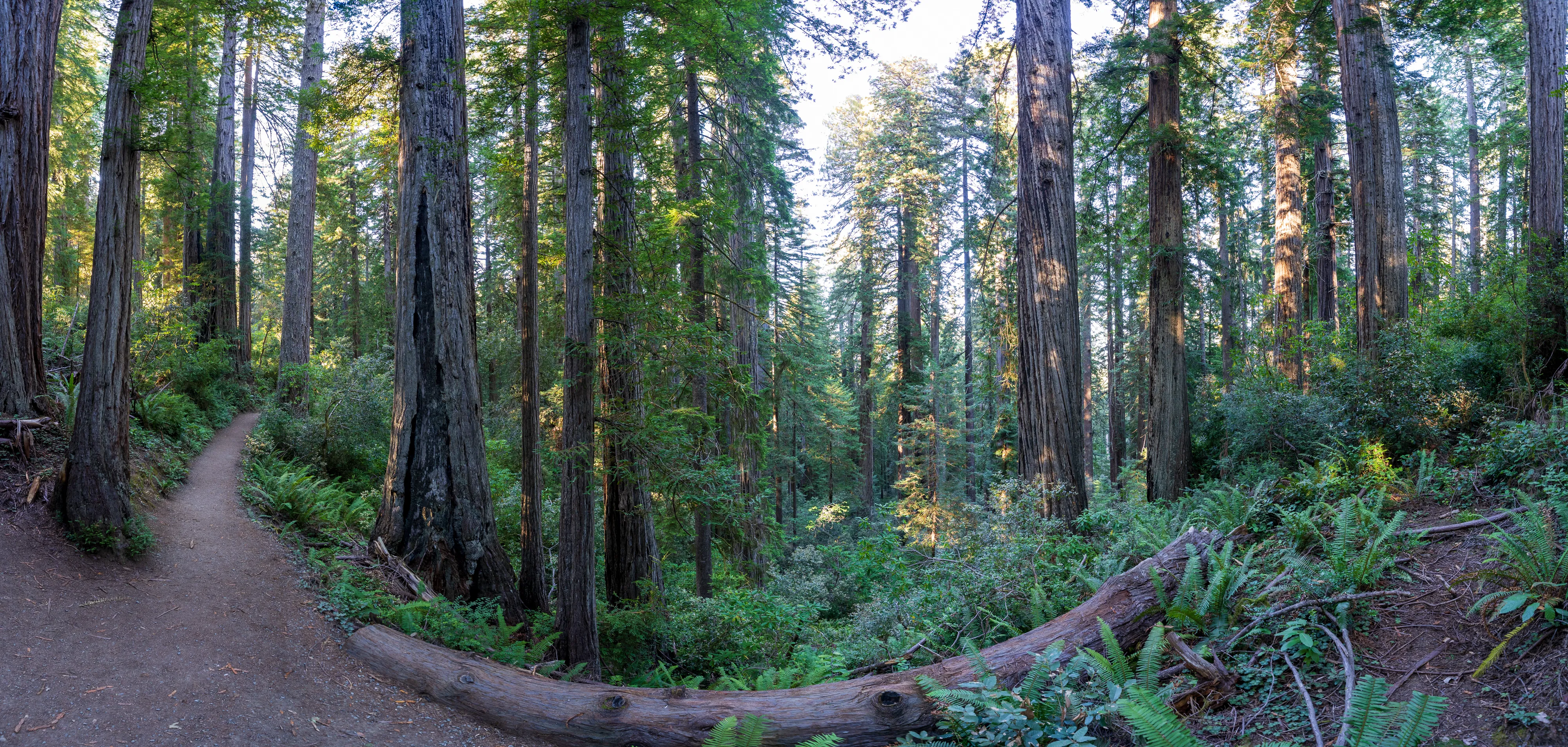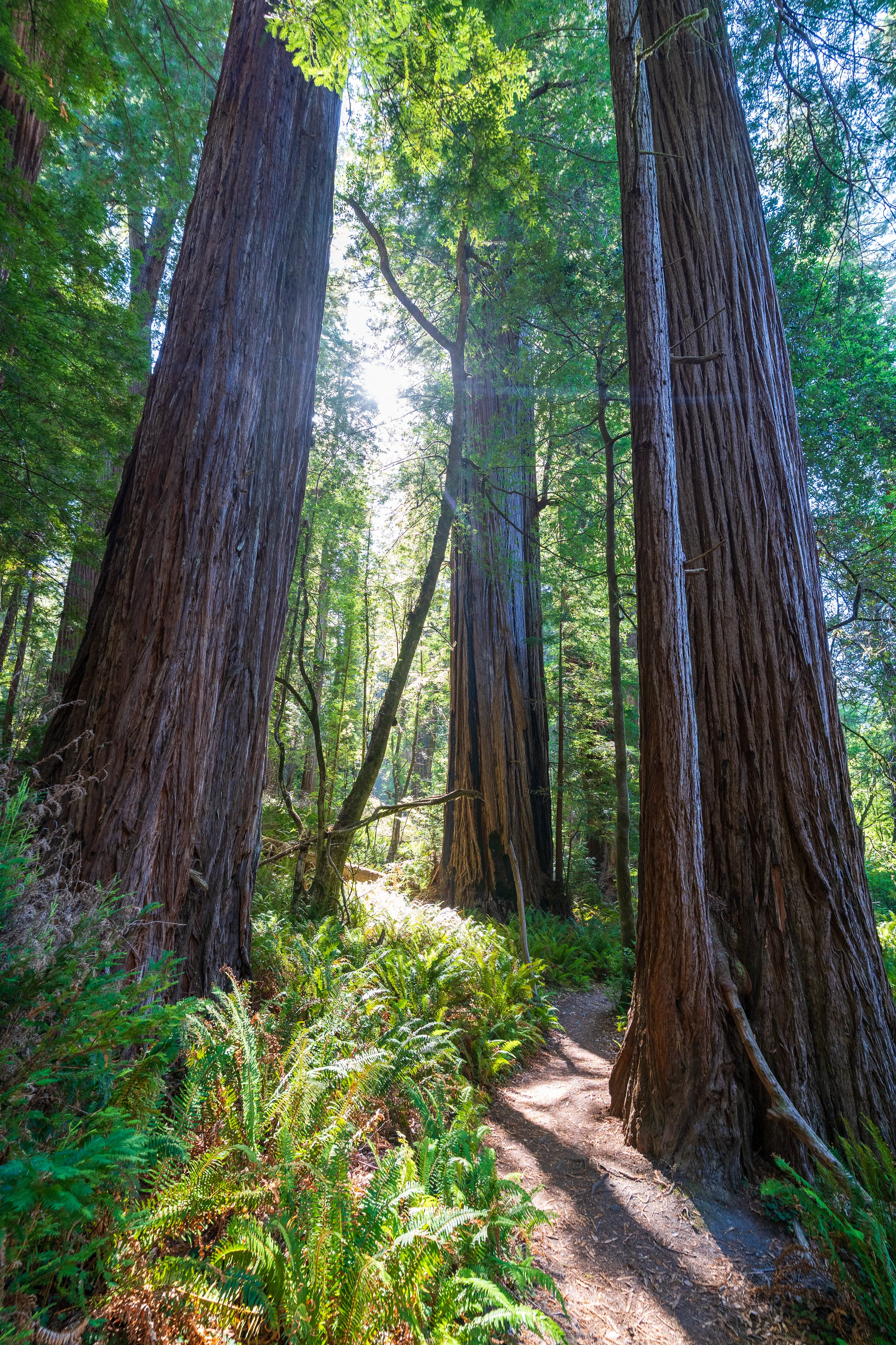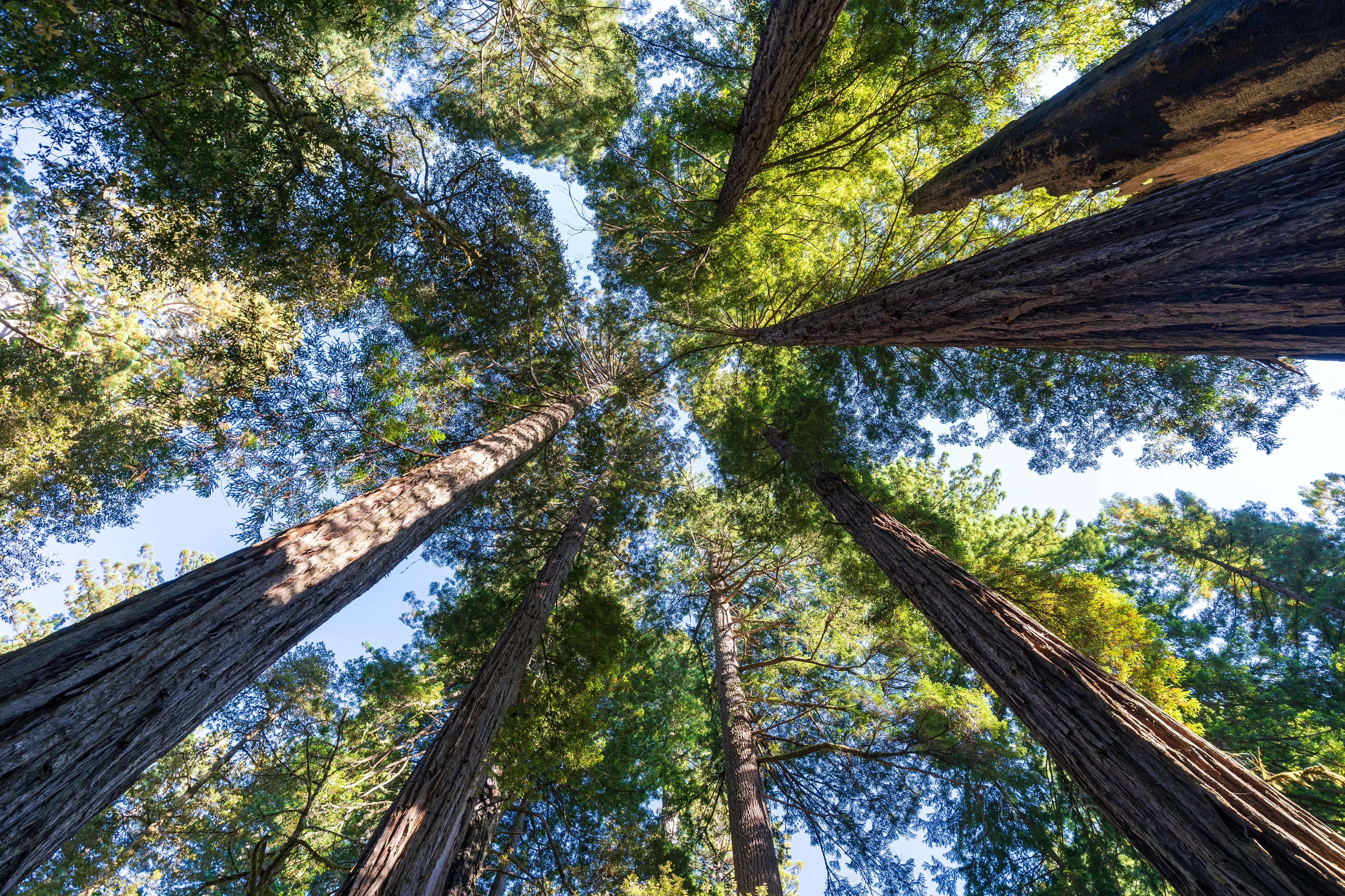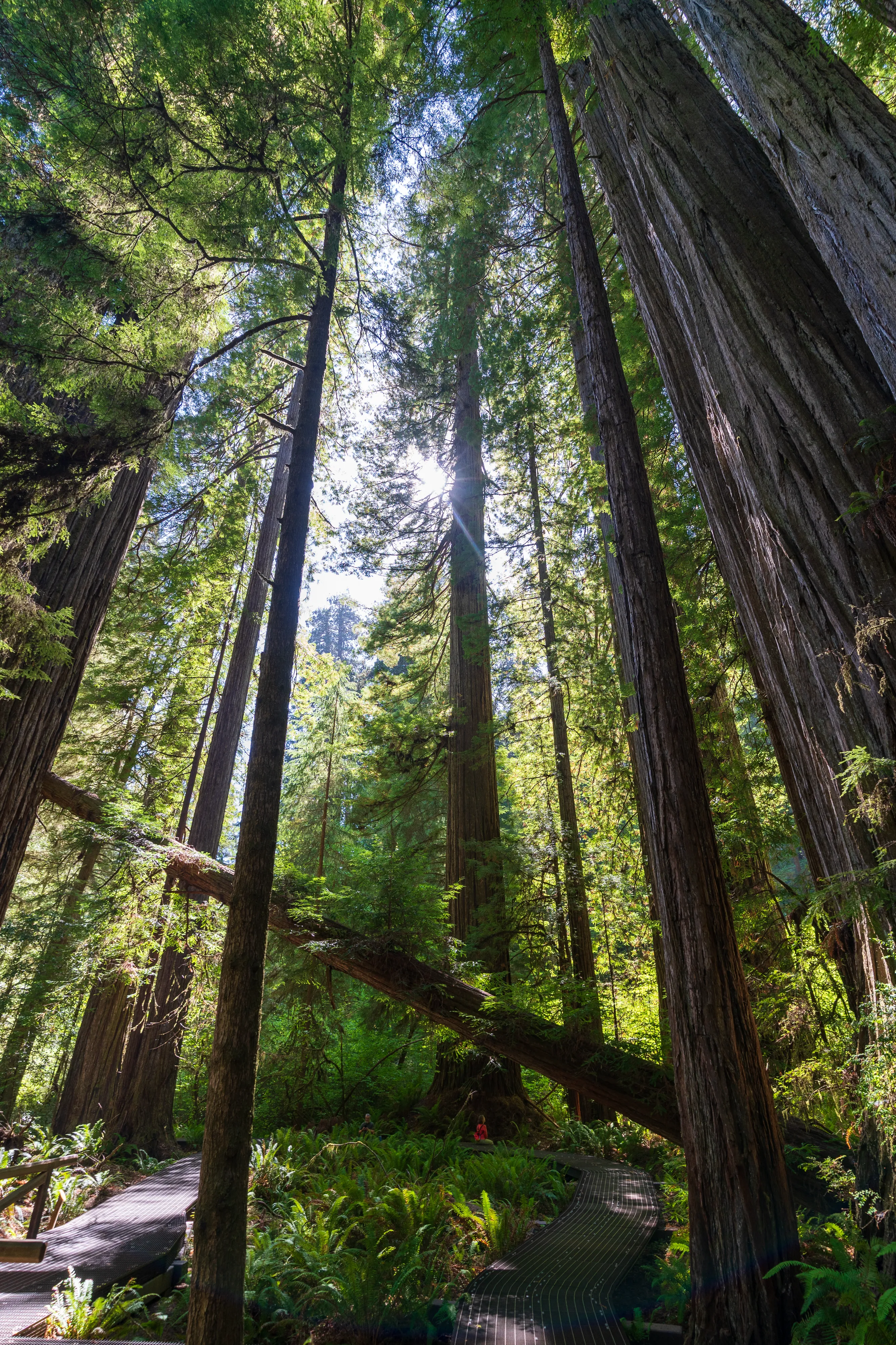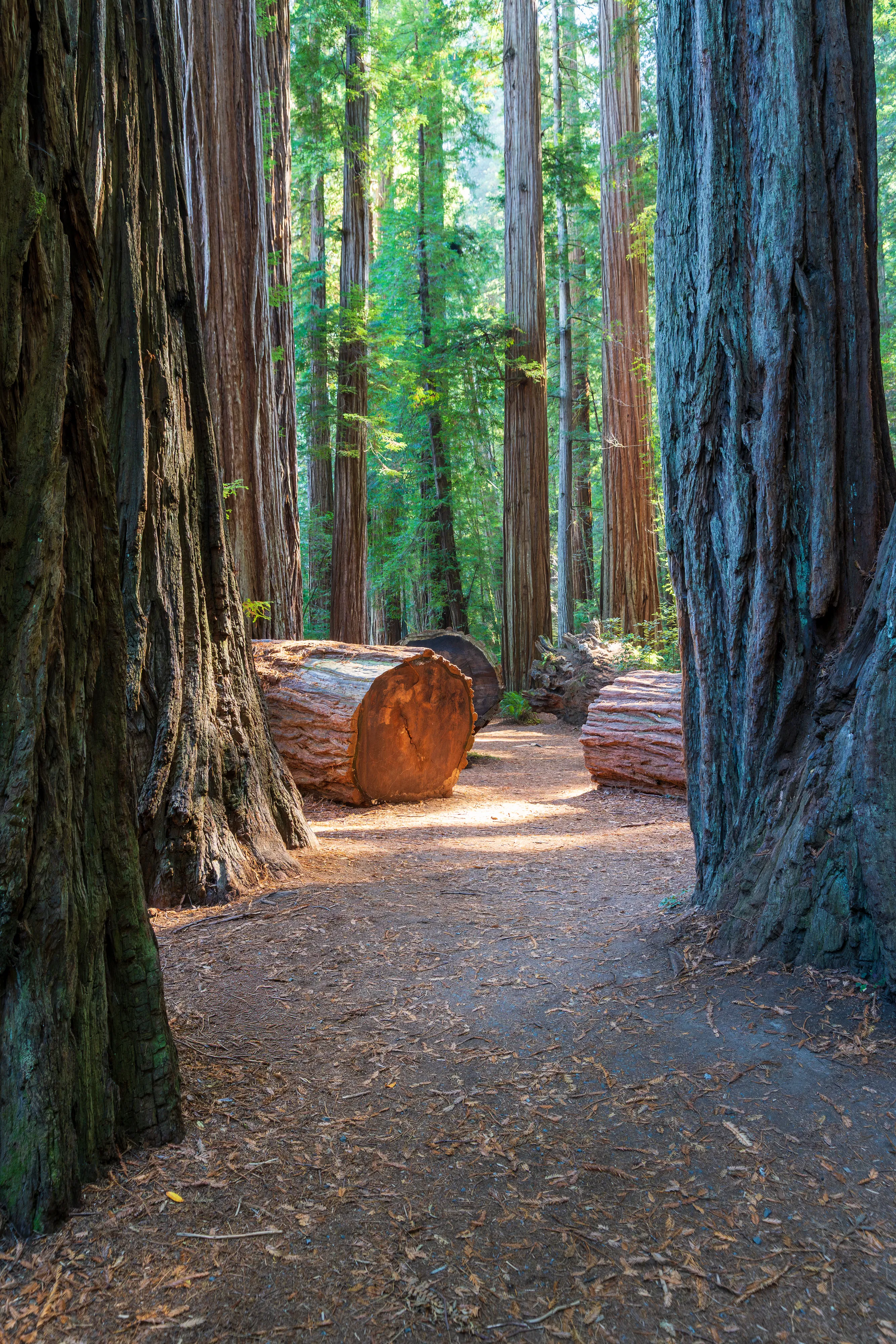 Der Küstenmammutbaum alias Coast Redwood (Sequoia sempervirens) ist vom Aussterben bedroht und nur noch an wenigen Orten zu finden, da sie in der Vergangenheit großflächig wegen ihres Holzes gefällt wurden. Das Holz ist wegen seiner Langlebigkeit und Feuerfestigkeit beliebt. Dadurch, dass Redwoods in ihrer Rinde hauptsächlich Wasser anstelle von Harz haben, ist die Rinde feuerfest und schmort eher als dass sie brennt. So kann es sein, dass ein Redwood durch wiederholte Waldbrände “innerlich” verkohlt und sogar hohl ausbrennt, die Rinde jedoch bestehen bleibt, den Baum weiterhin stützt und dieser weiterlebt. Die Mammutbäume können mehr als 2000 Jahre alt werden und während dieser Zeit eine stolze Größe von etwa 115 m und einen Umfang von 8 bis 9 m erreichen. Ganz schön beeindruckende Riesen.