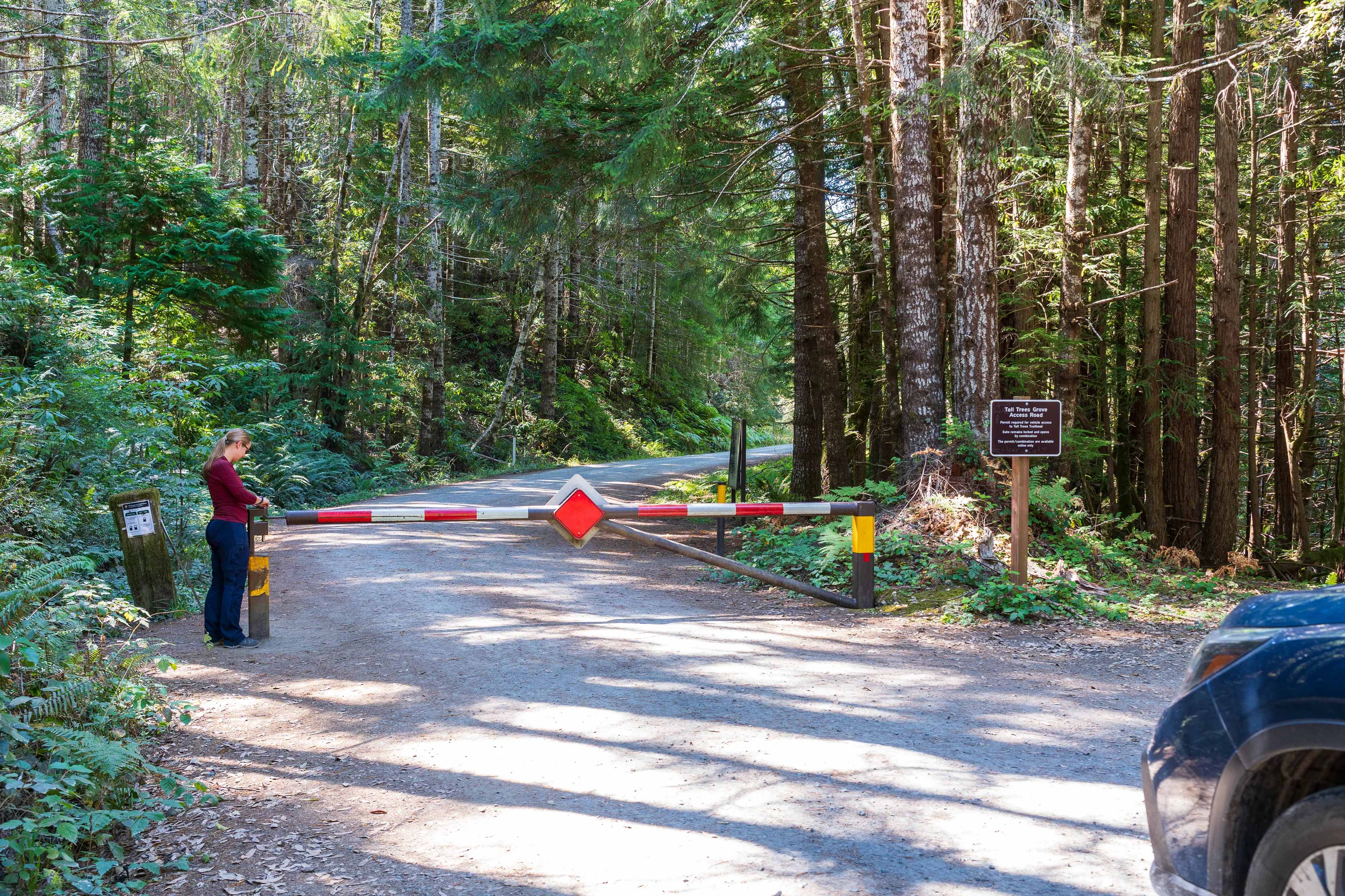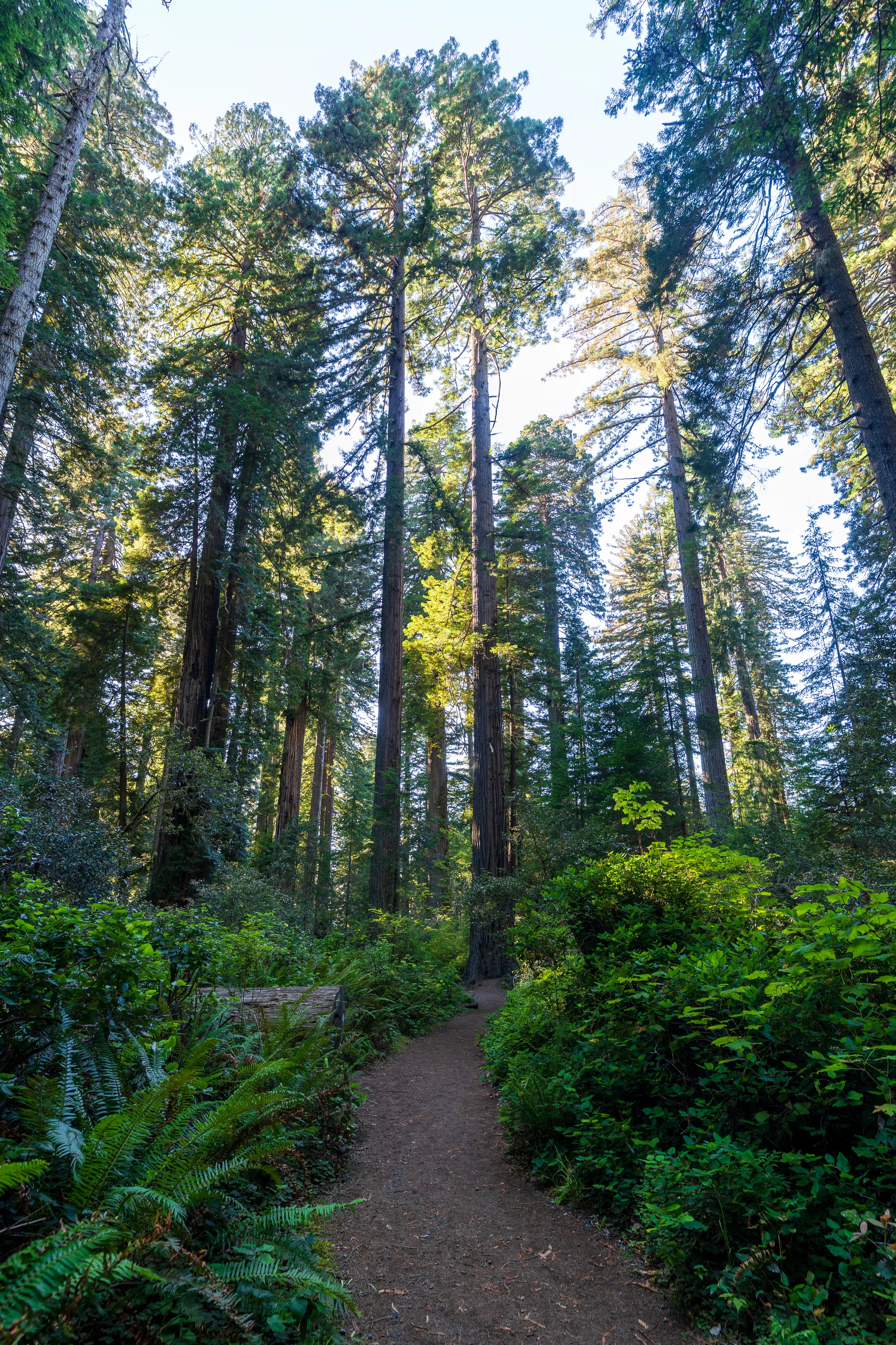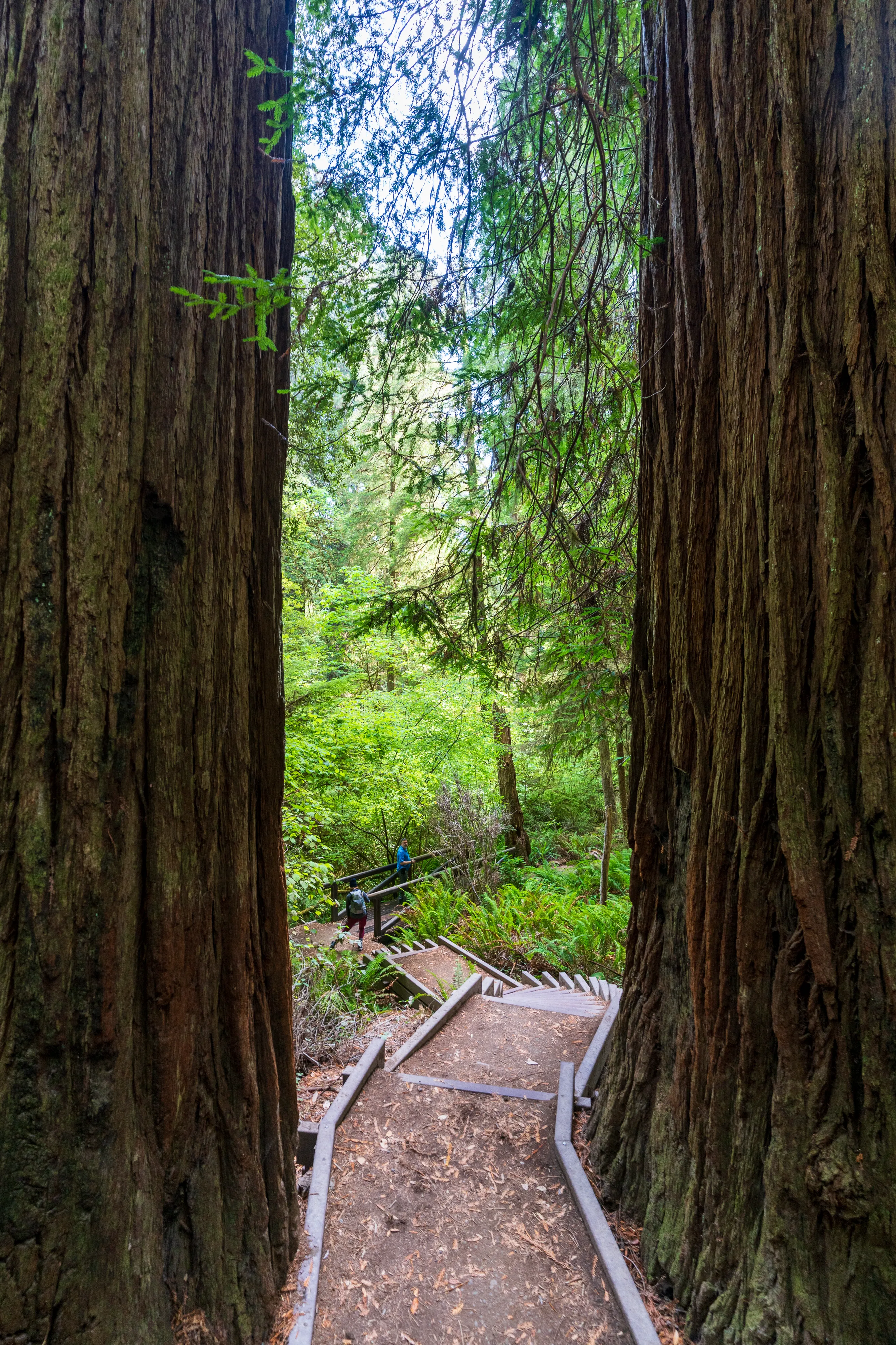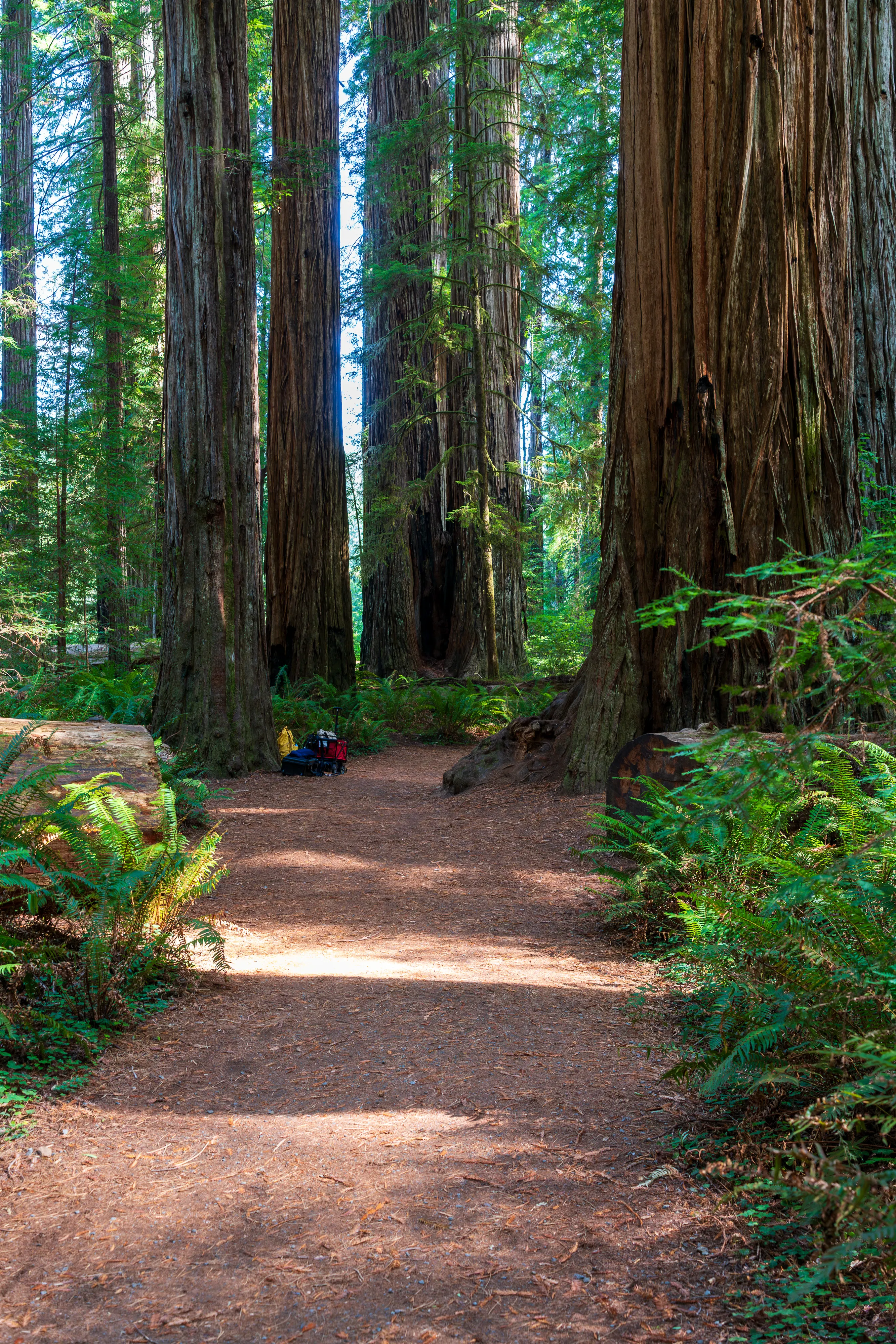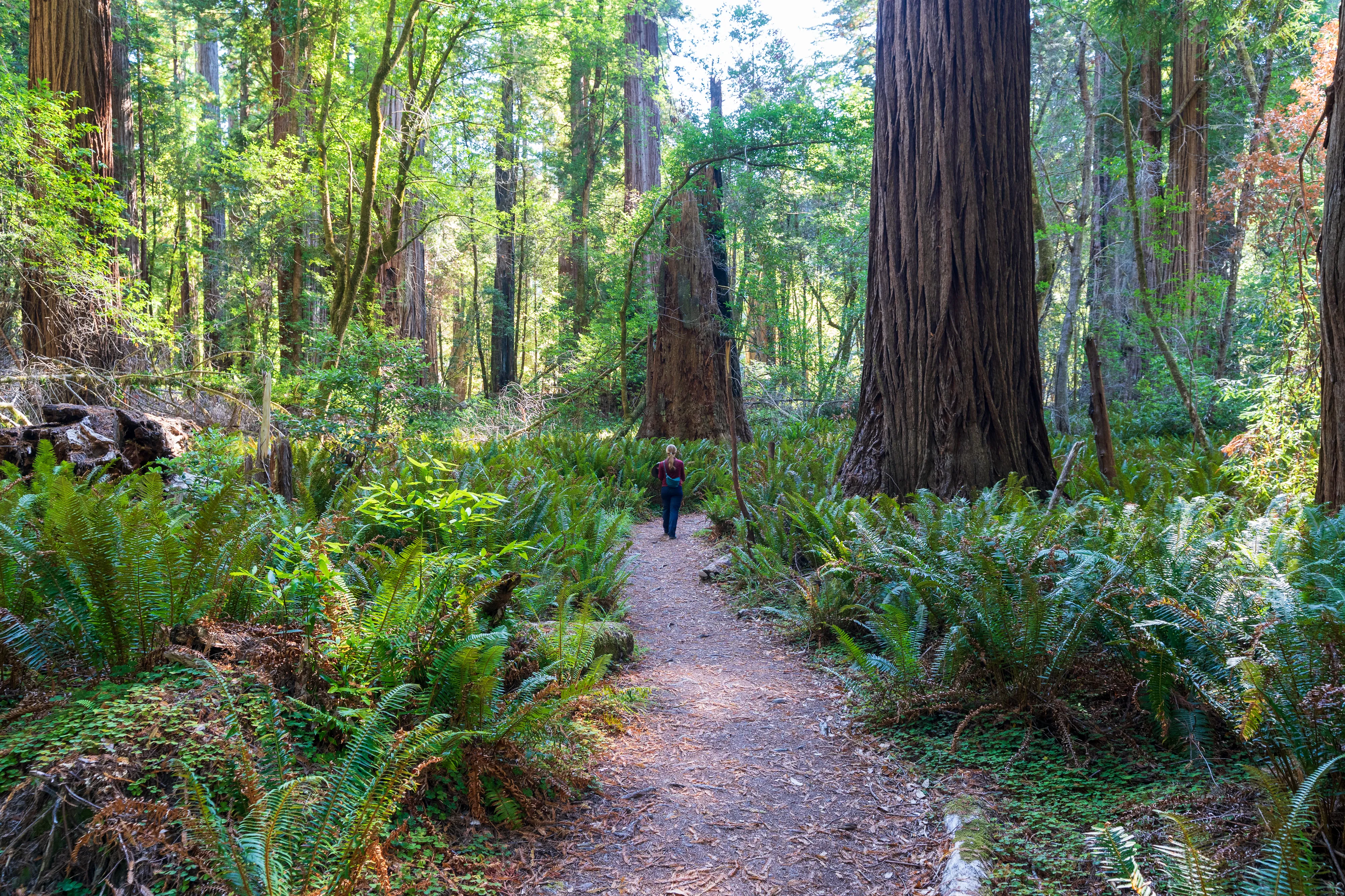 Wir folgen der, doch sehr kurvigen und rumpeligen, Bald Hill Road bis zum Tall Tree Trailhead. Hierfür haben wir uns gestern spontan noch einen Permit für den Nachmittag geholt - mit diesem, und dem zugehörigen Zahlencode, können wir uns selbst die Schranke öffnen und die circa 10 km lange Schotterstraße bis zum Start des Wanderwegs hinabfahren. Vom Trailhead geht es dann hinab zum Ufer des Redwood Creek, umgeben von riesigen Bäumen.