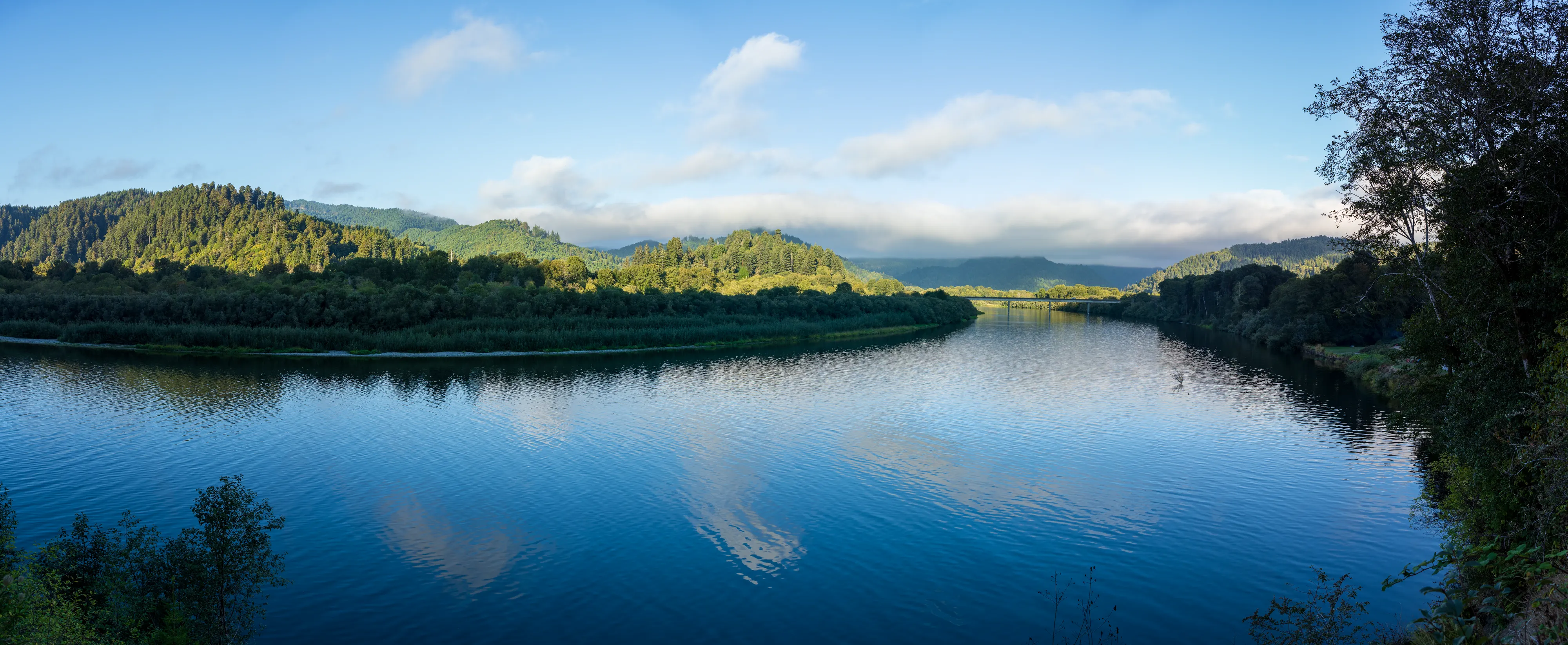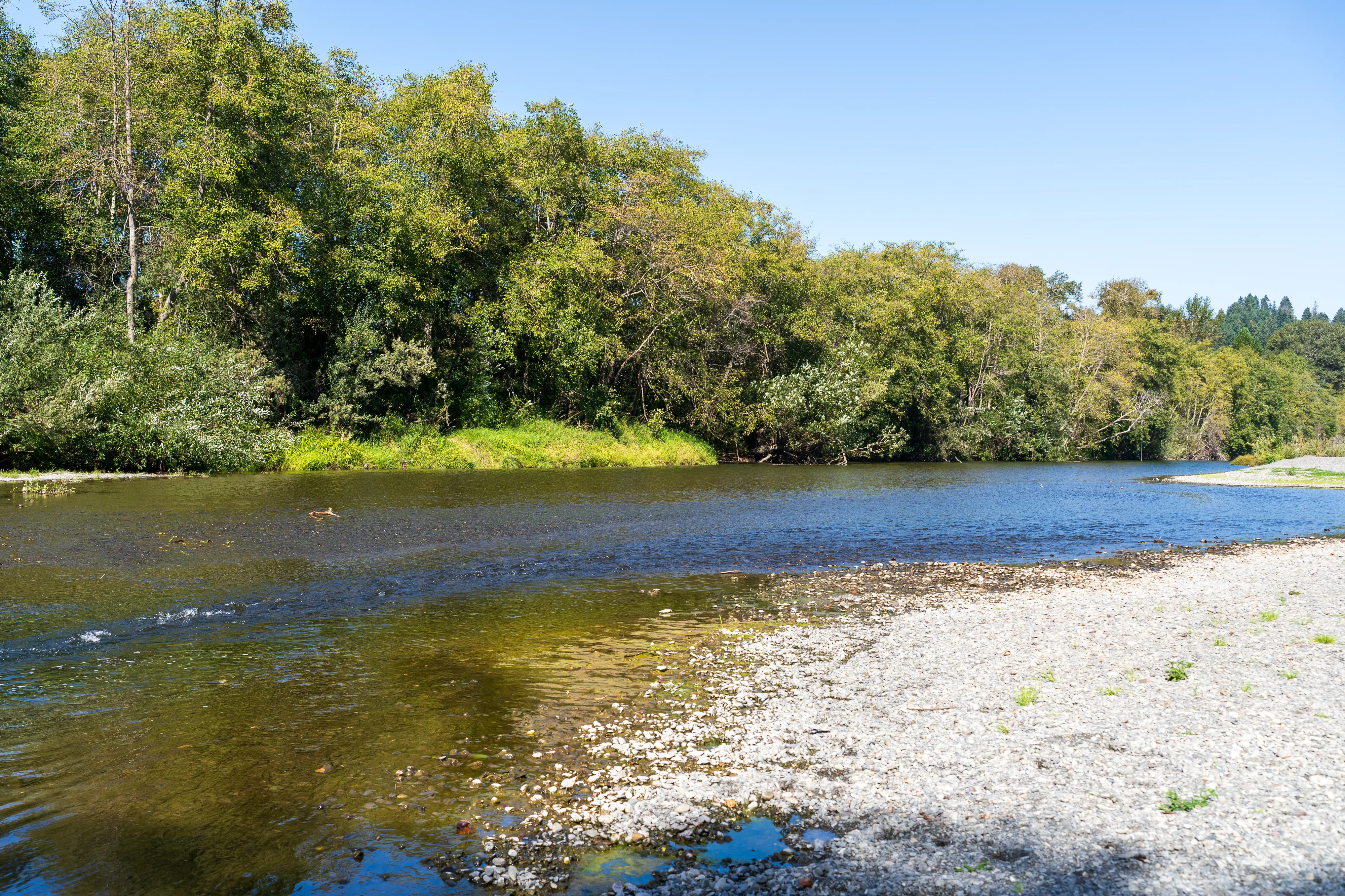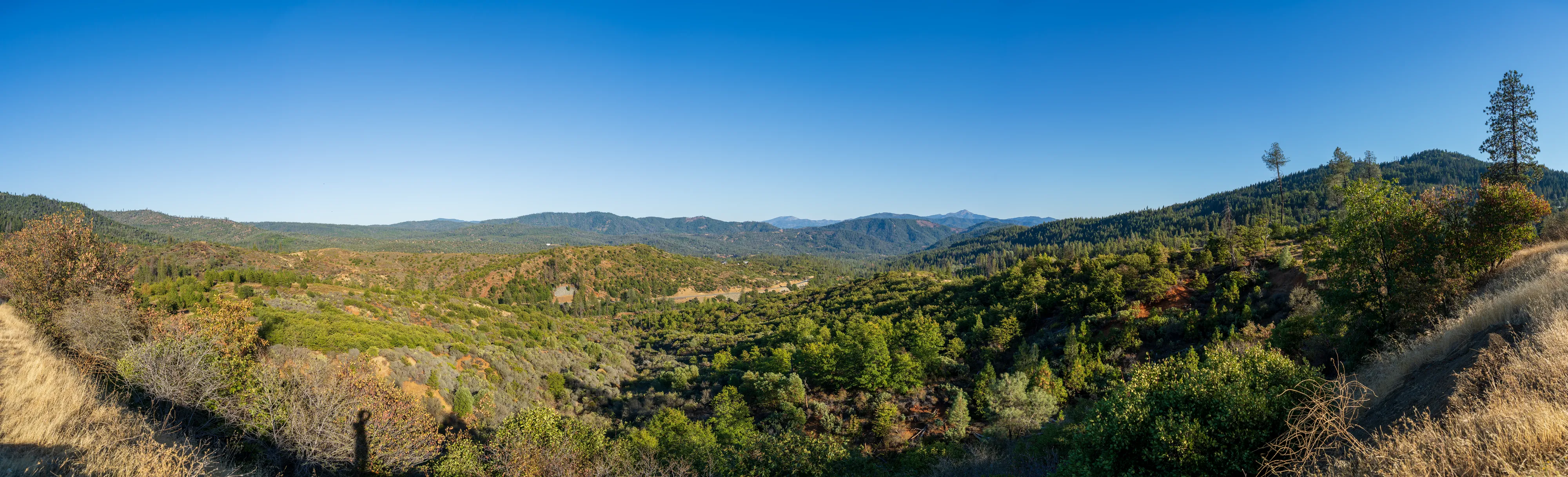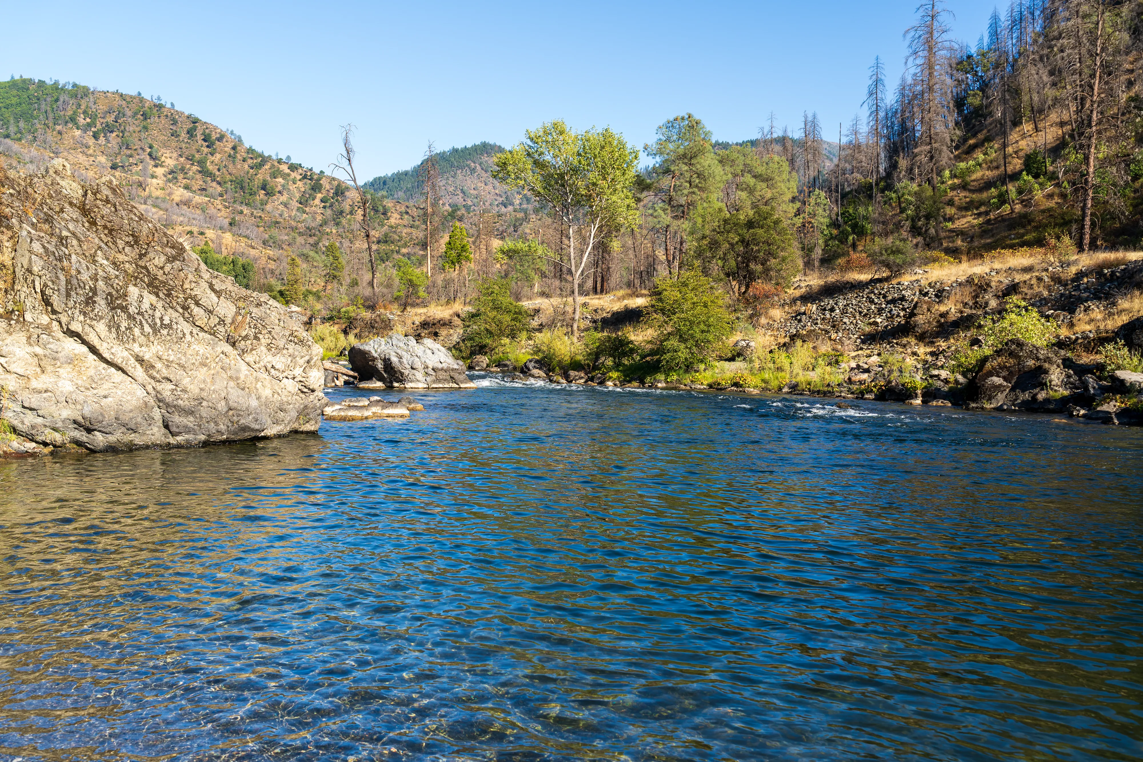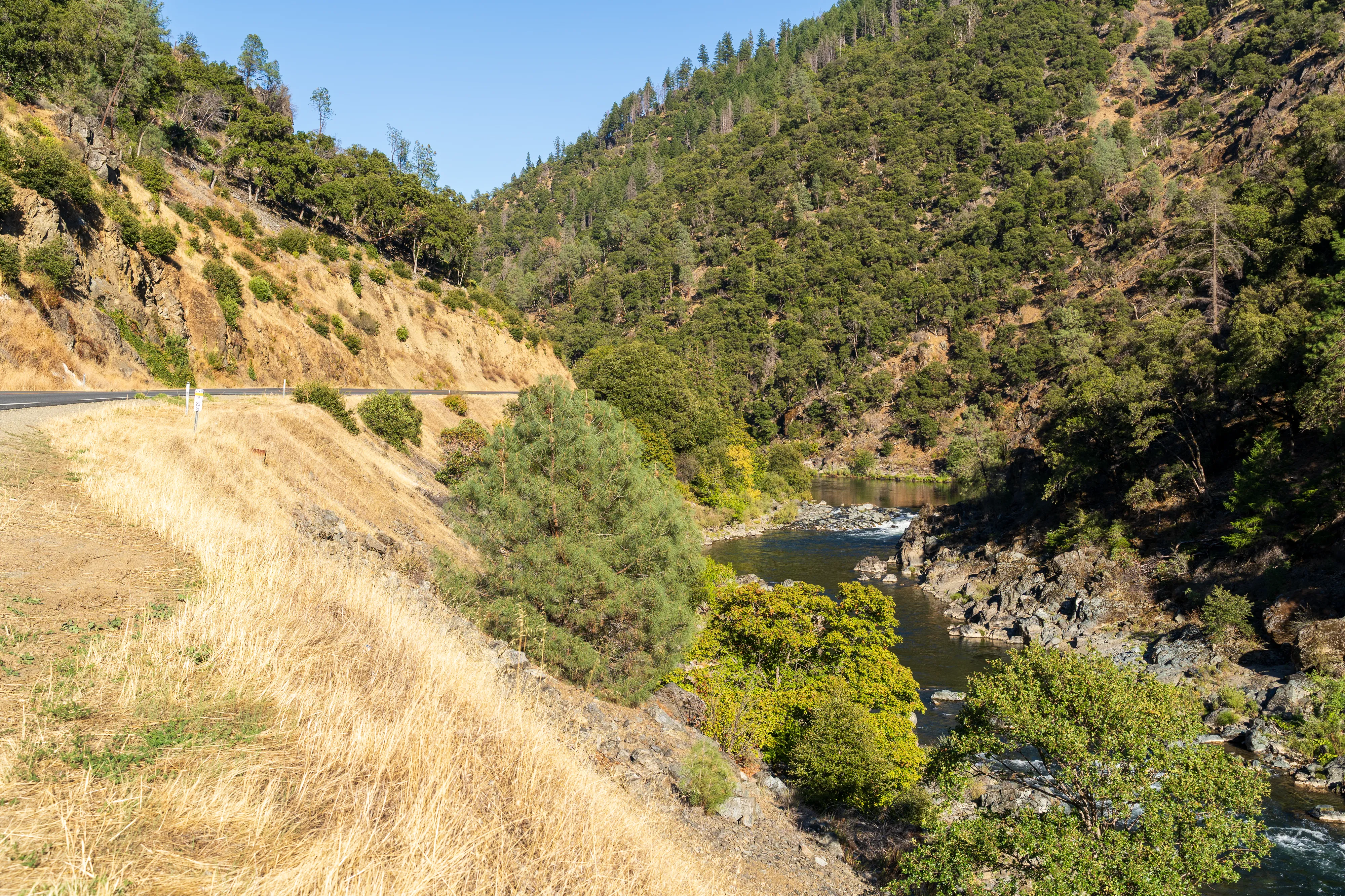Nach einem Mittagessen am Ufer eines Flusses geht es dann weiter ins Landesinnere durch den Six Rivers National Forest auf der CA 299 Richtung Osten. Hier ändert sich die Landschaft wieder einmal gänzlich: statt feuchter Küste nun trockenes Mittelgebirge. Das Autothermometer klettert auf 38 ºC - hier kommt eine Abkühlung im parallel zur Straße fließenden Fluss genau richtig.