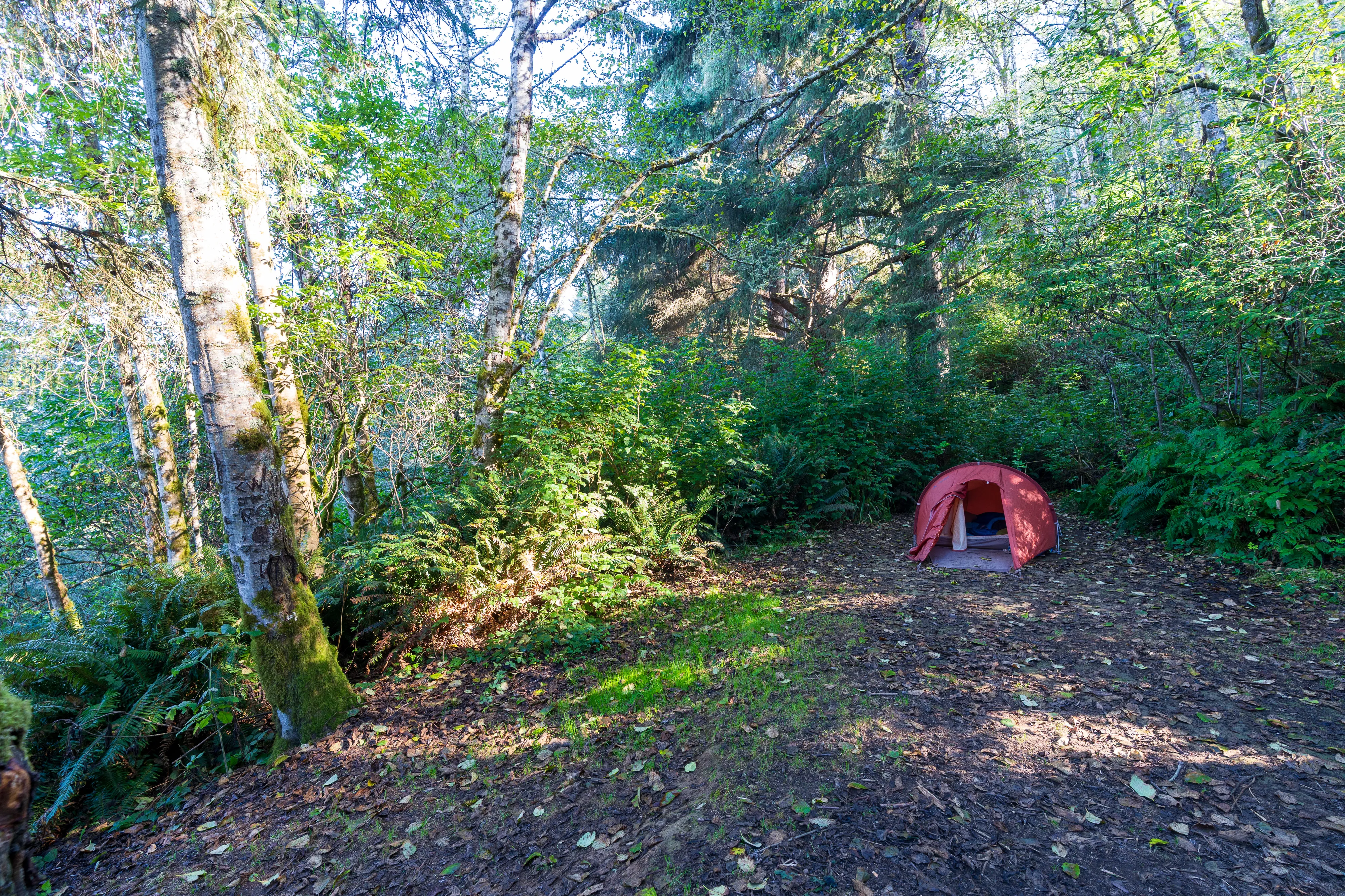 Entlang des Coastal Drives werden wir unser Auto für die Nacht parken und ein kurzes Stück den Berg hinauf zu unserem Backcountry Camp Flint Ridge wandern. Das Camp ist schön im Wald gelegen mit kleinen Ausblicken aufs Meer und vor allem inklusive Meeresrauschen - und das sogar vollkommen kostenlos.