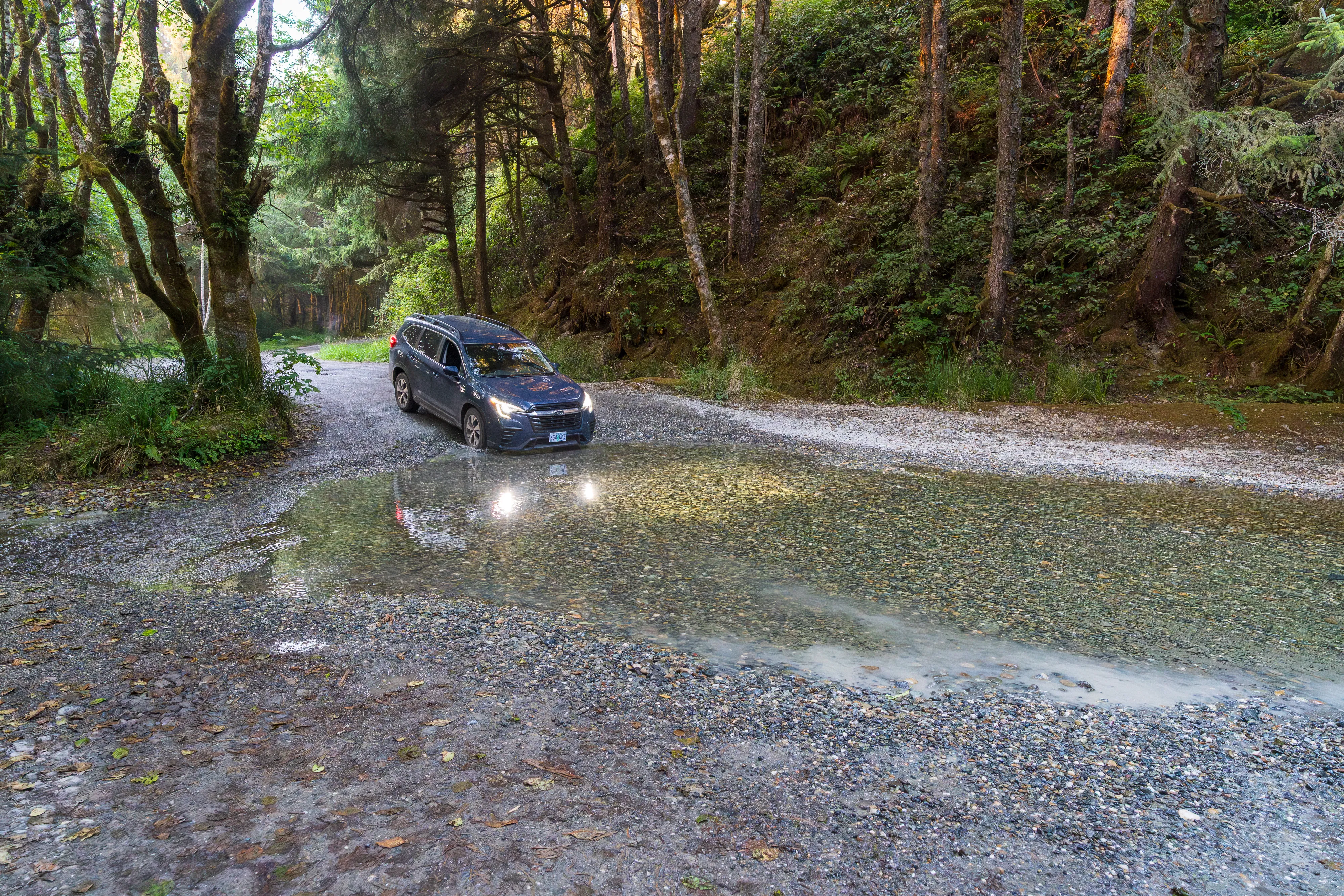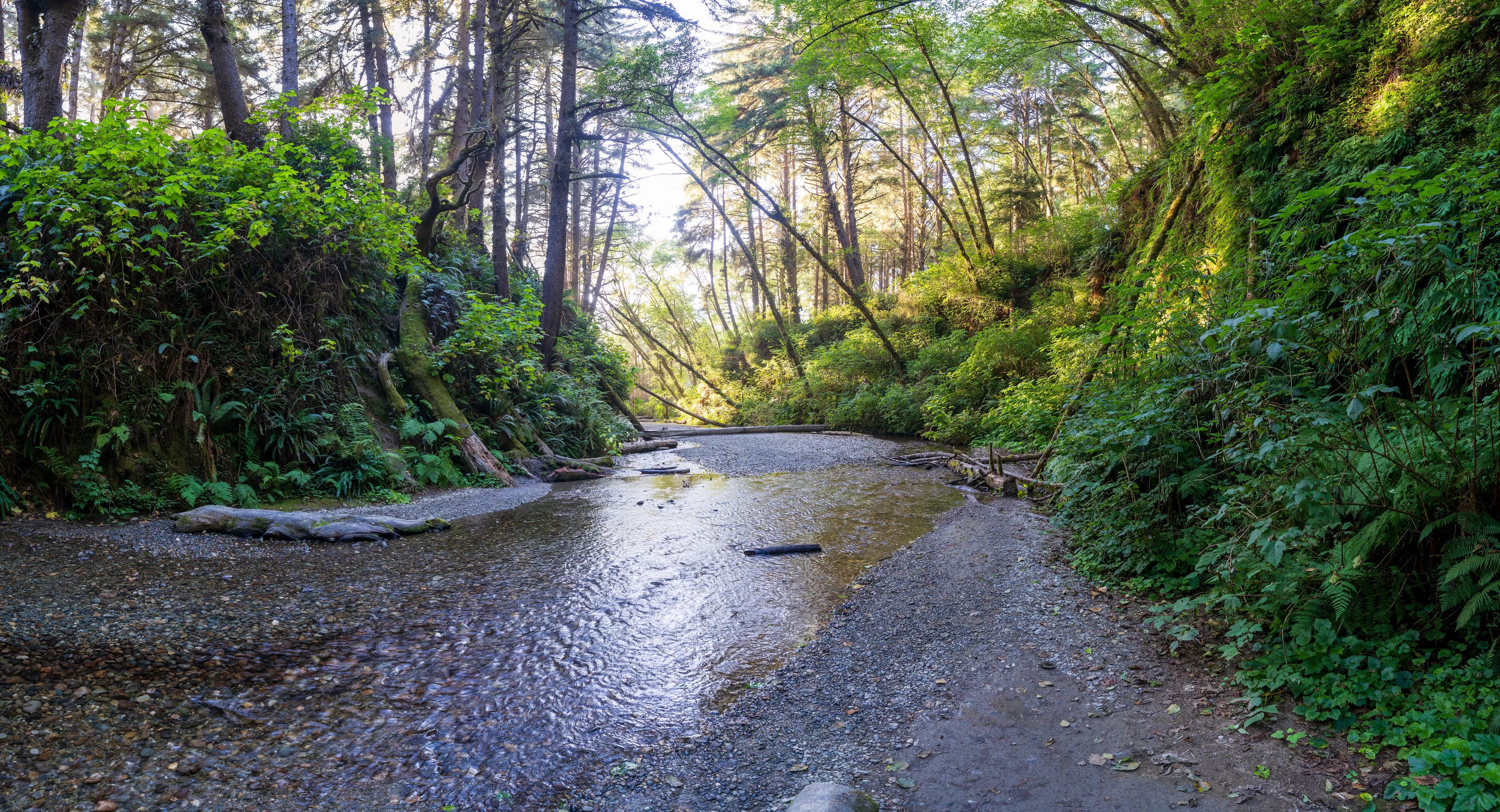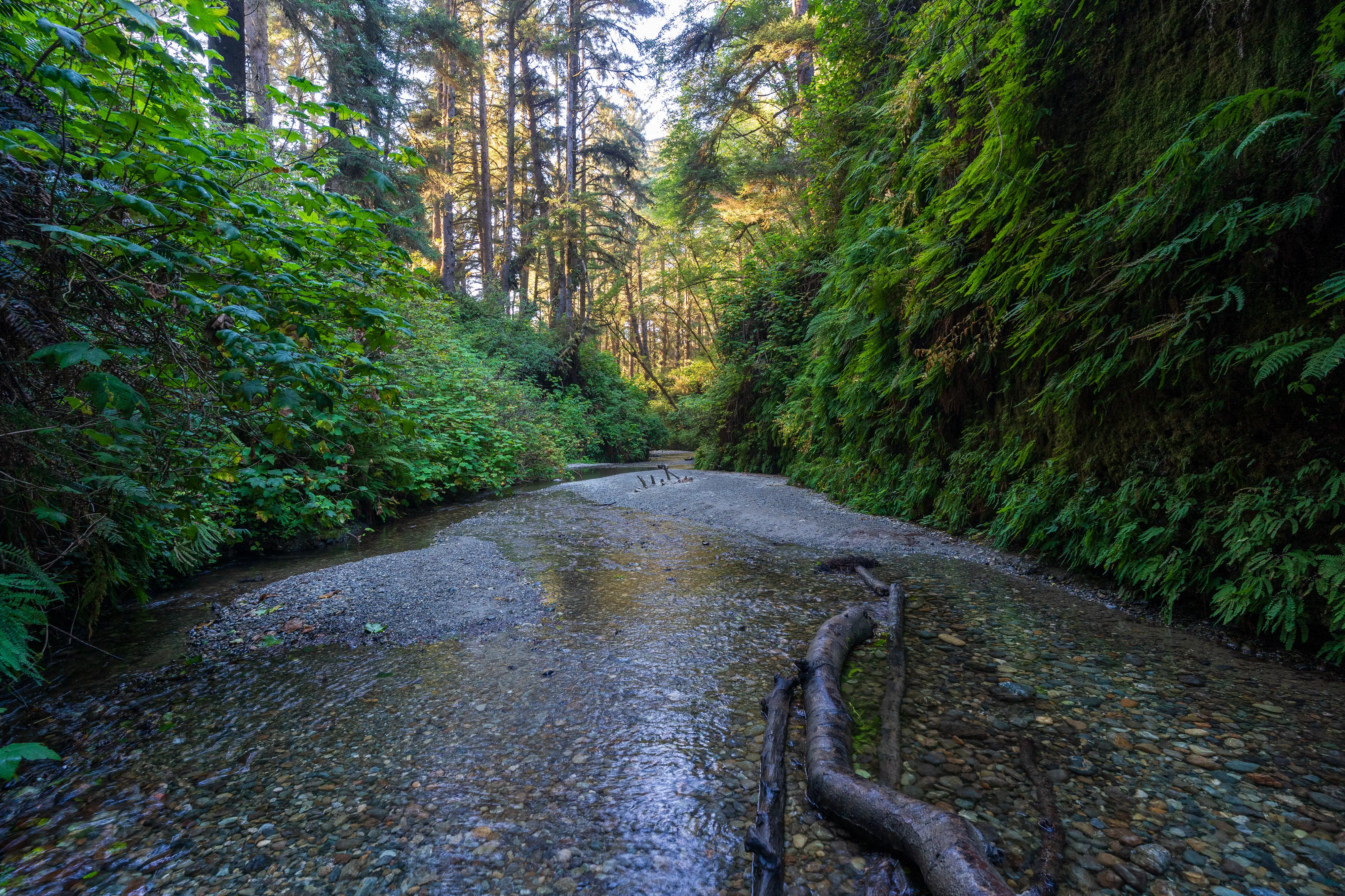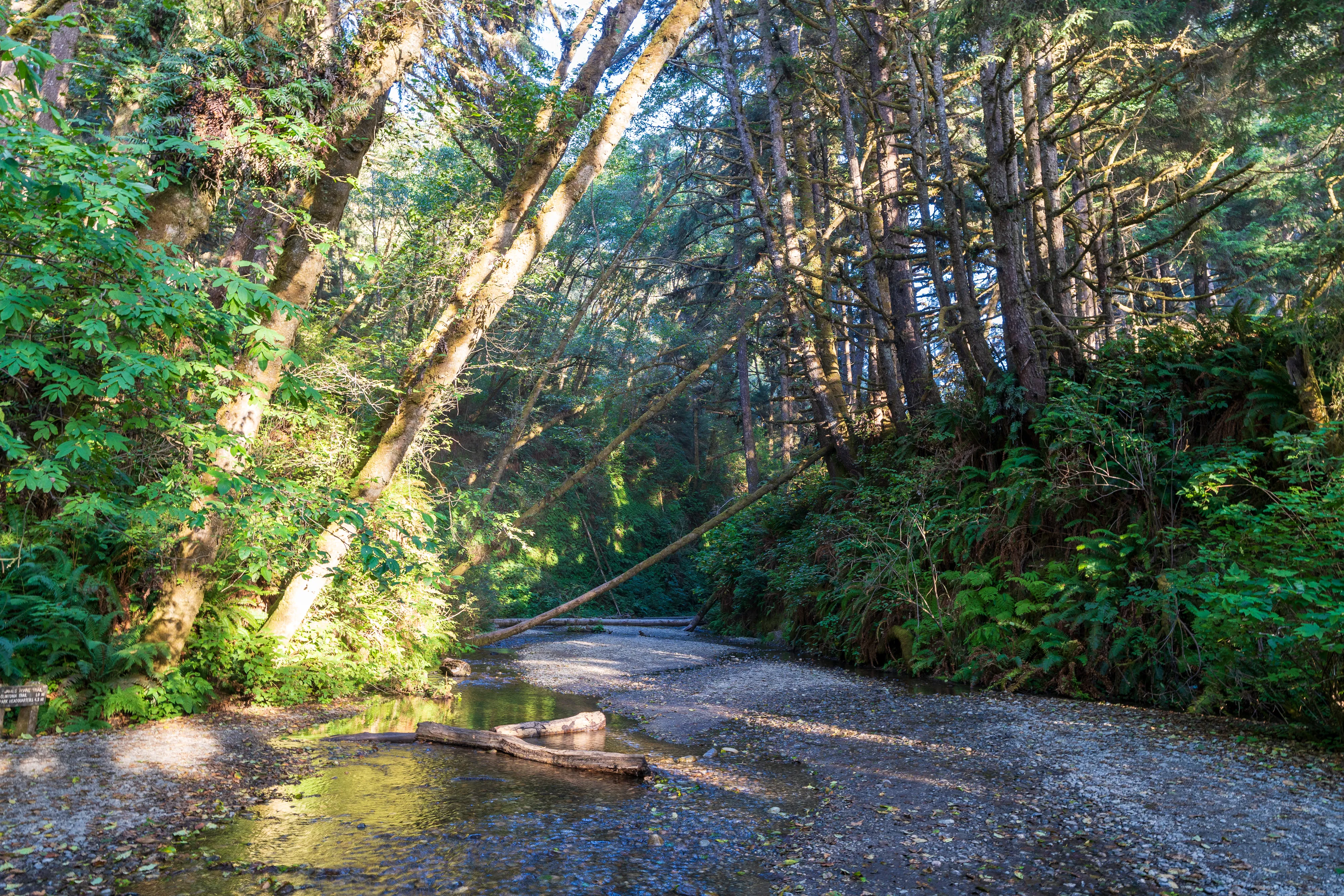 Eigentlich war das für den folgenden Morgen geplant - jedoch erfahren wir, dass die Straße zum Canyon ab heute Abend für mehrere Tage geschlossen sein wird. Auf dem Weg zum Fern Canyon müssen wir auf der Schotterpiste noch mehrere Schlaglöcher und flache Bäche durchqueren, wieder einmal sind wir froh, dass wir einen SUV als Mietwagen haben.