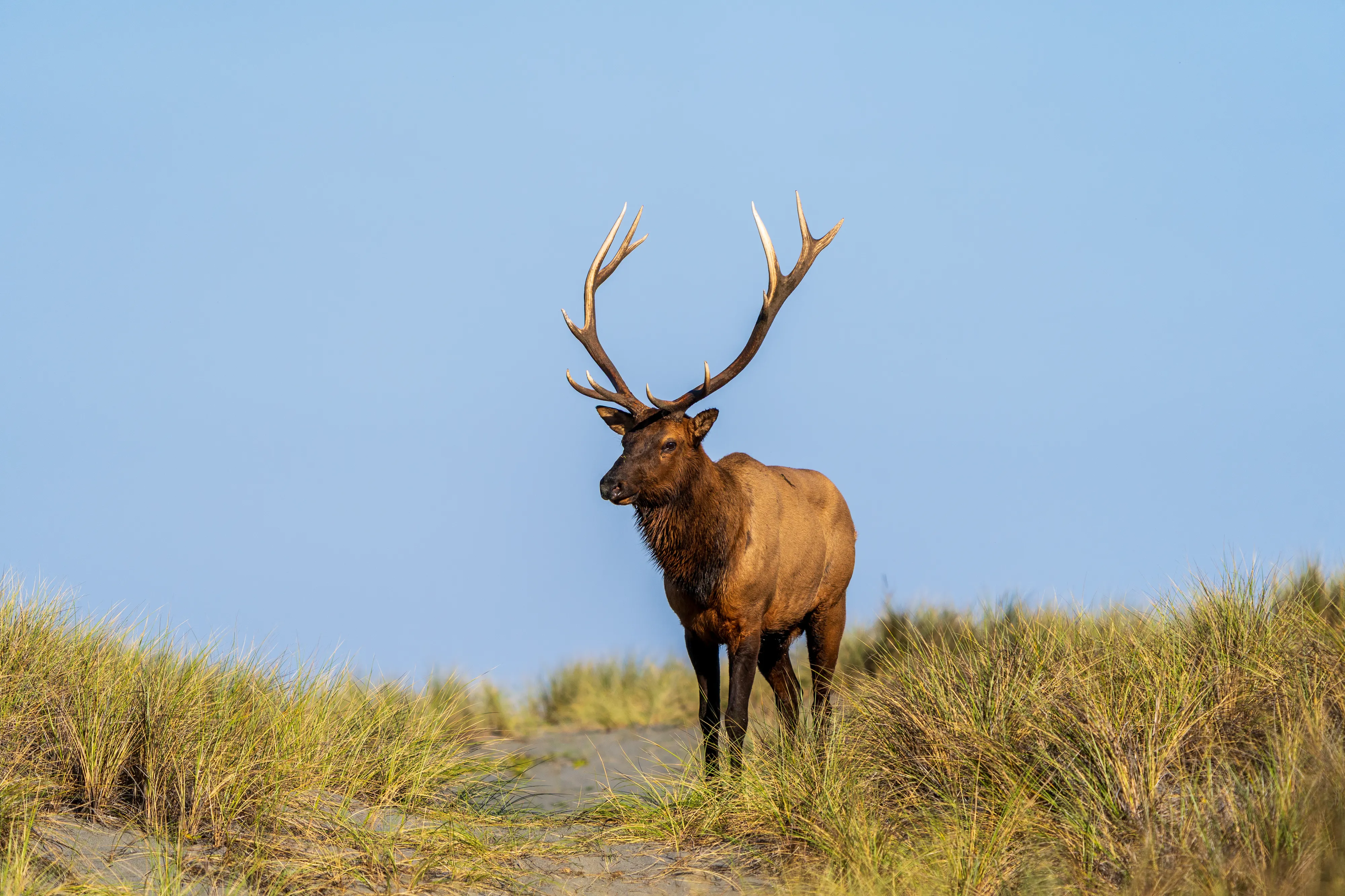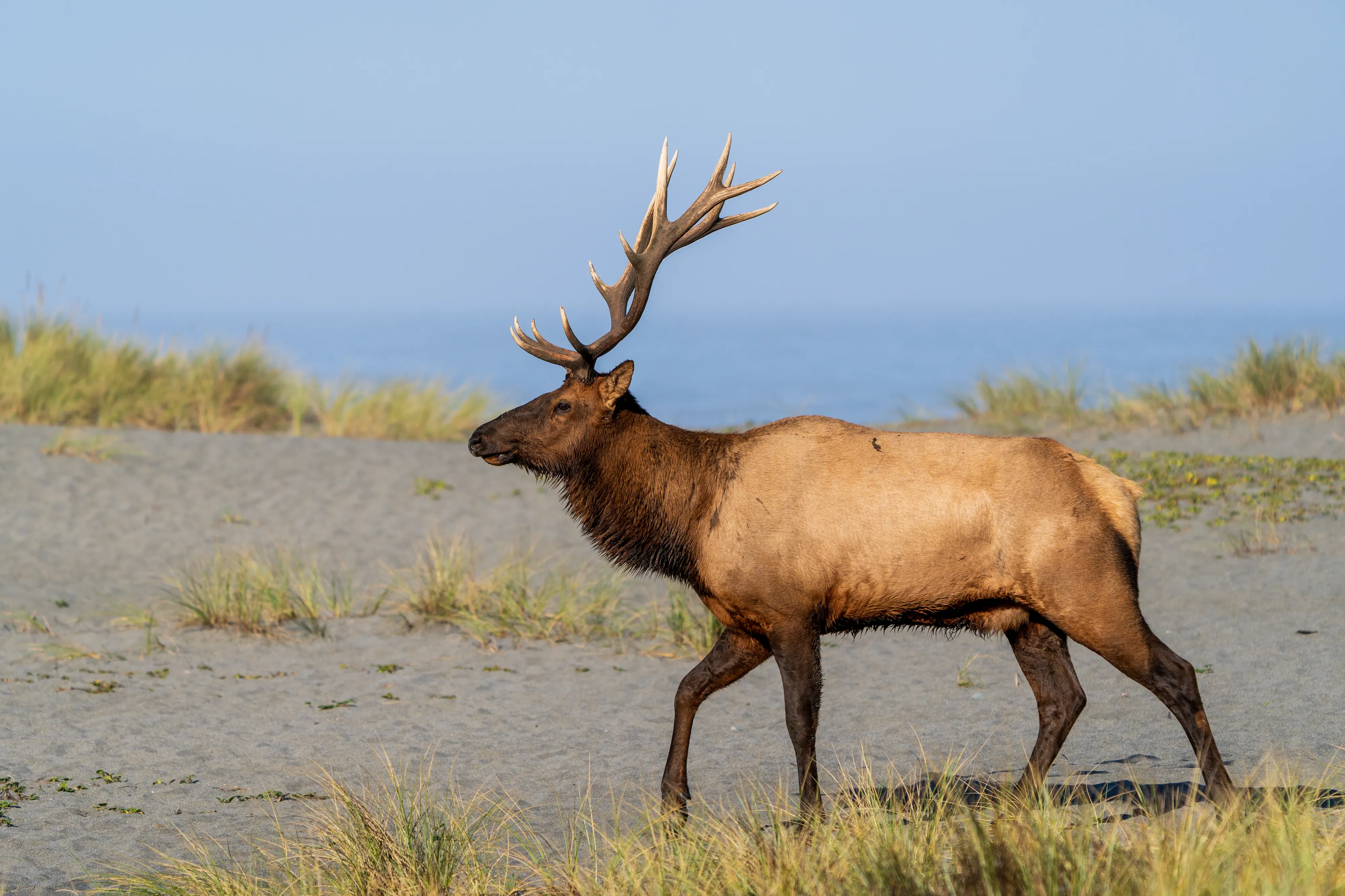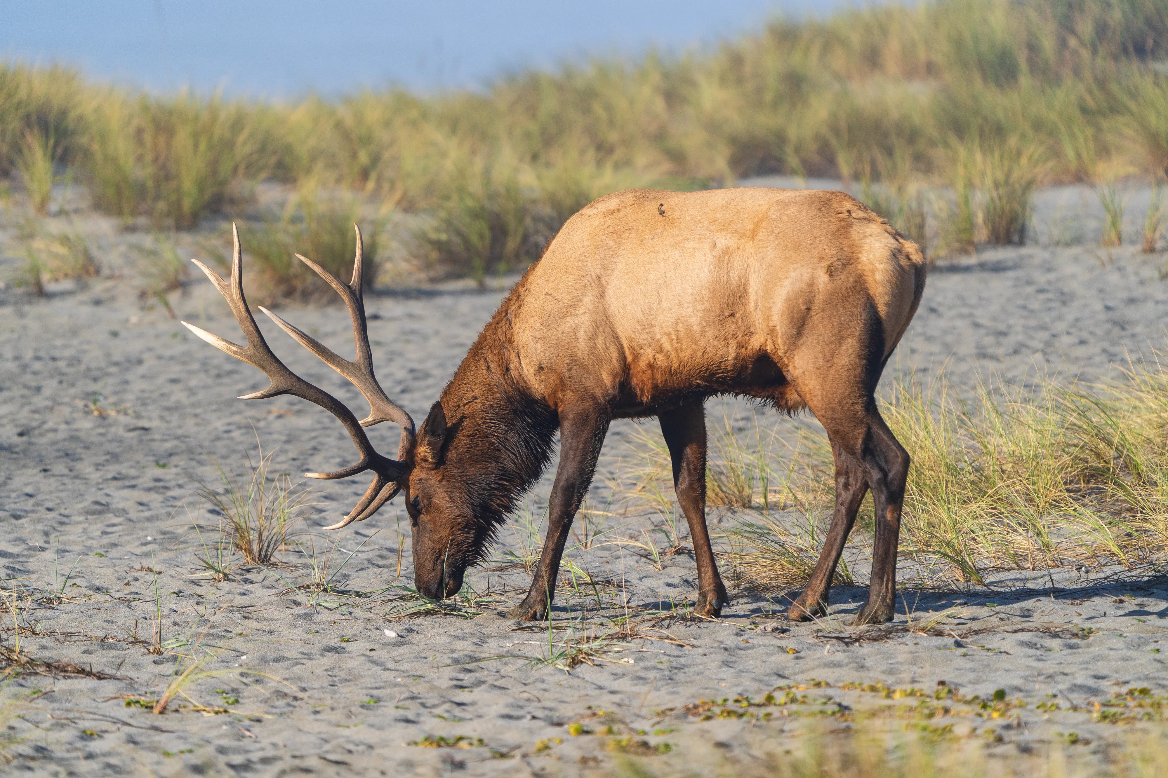 Nach einer, abgesehen vom Meeresrauschen, ruhigen Nacht bekommen wir am nächsten Morgen Besuch von einem Wapitibullen, der unweit unseres Campingplatzes durch die Dünen läuft und sein beachtliches Geweih präsentiert.