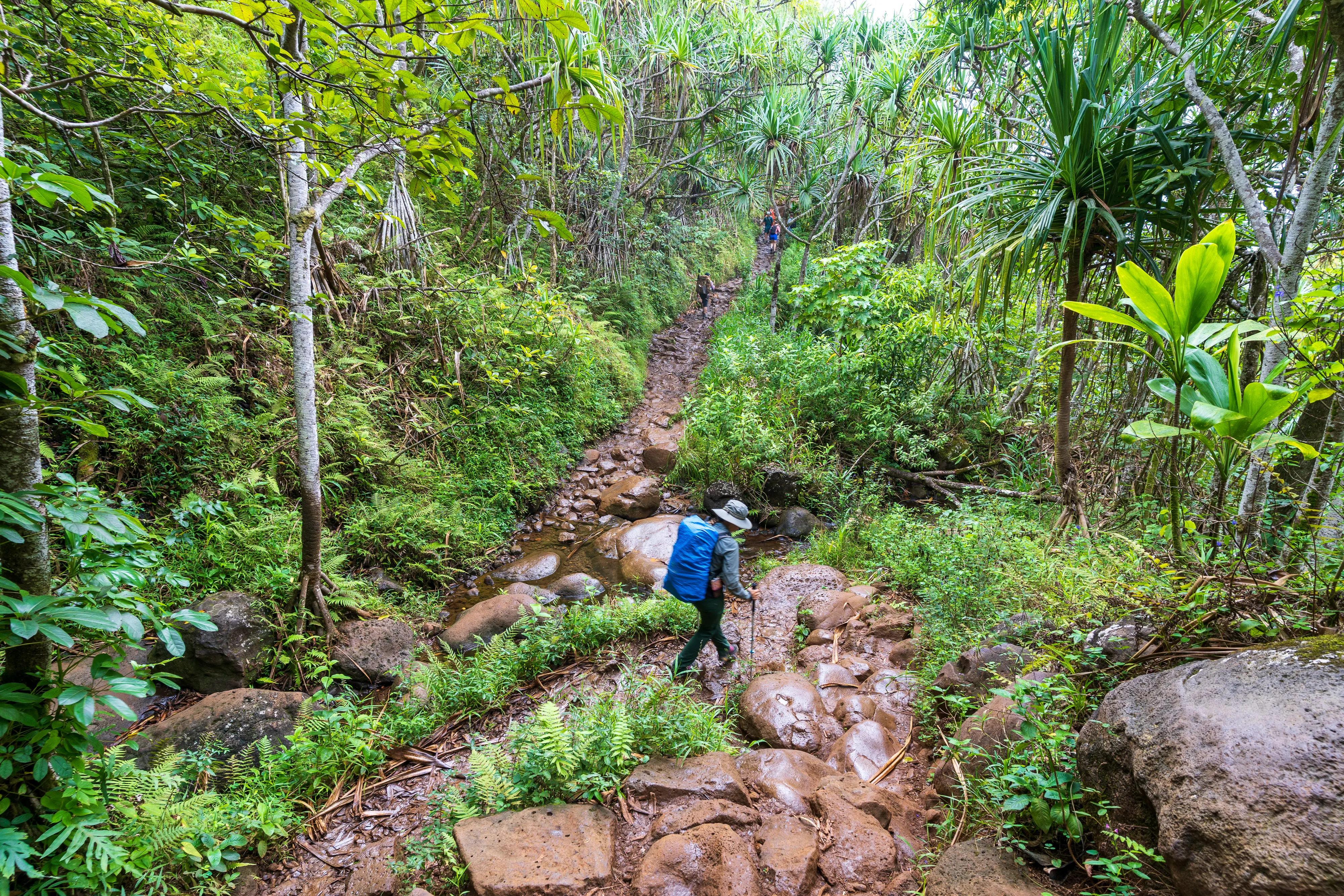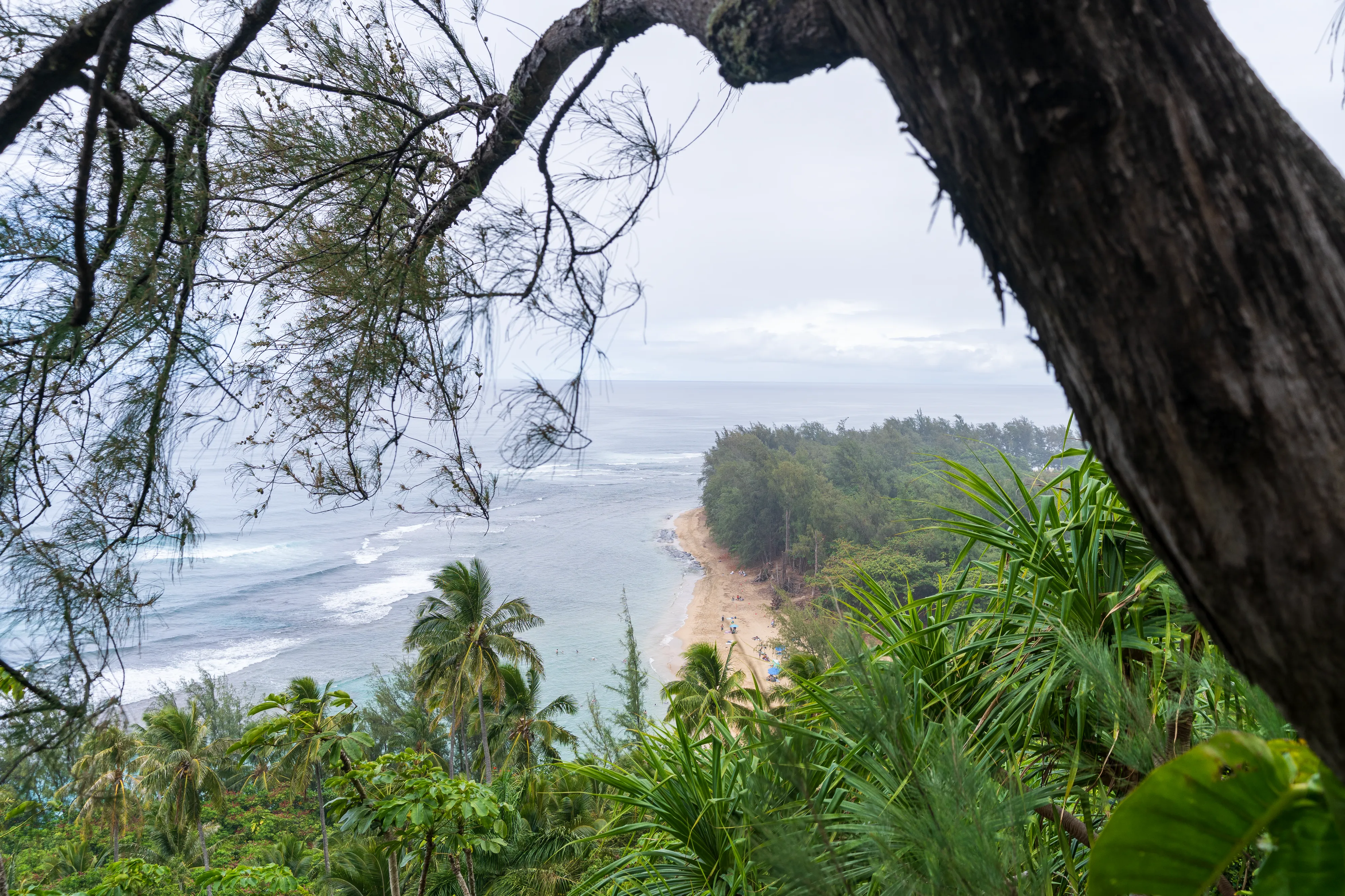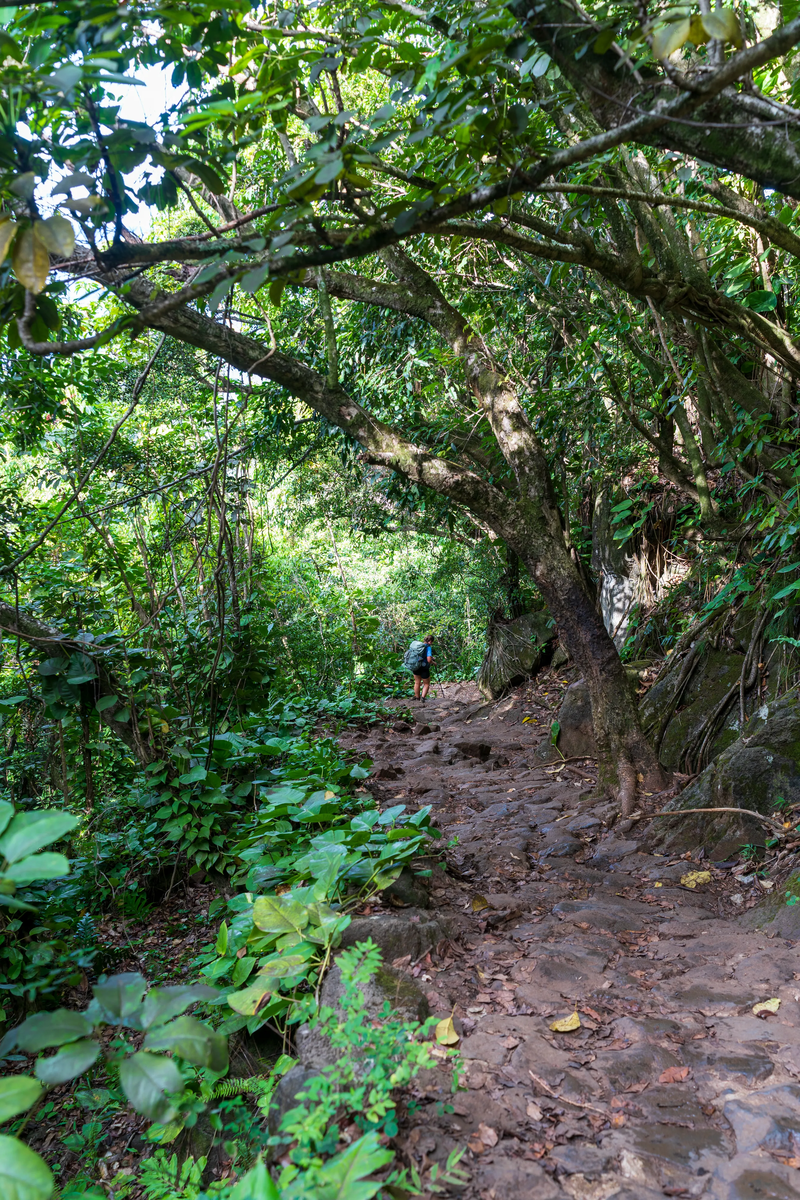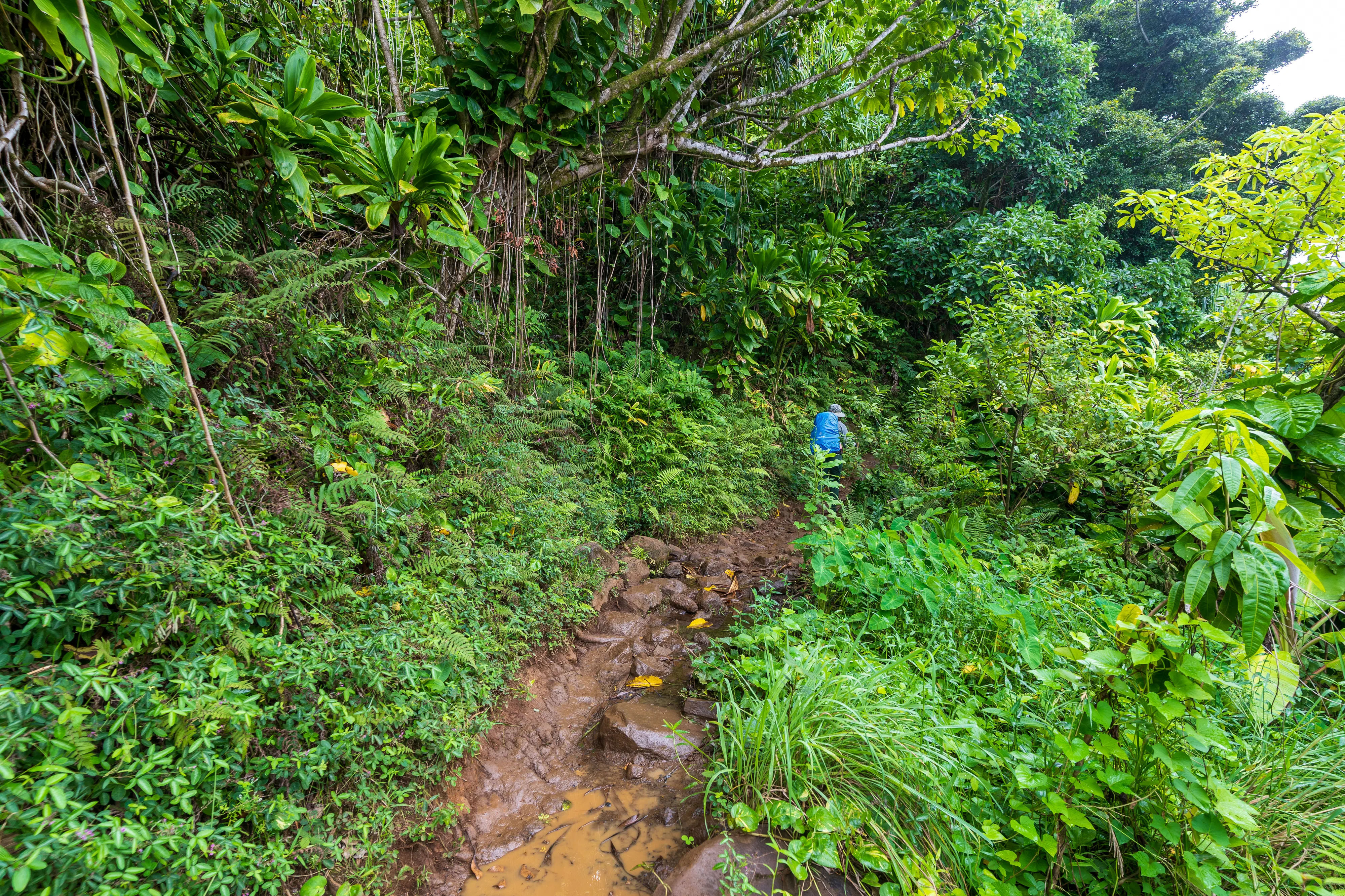 Kurz danach geht es auf den eigentlichen Kalalau Trail. Dieser ist teilweise nur ein schmaler Trampelpfad, erfordert gute Trittsicherheit und ist ein ständiges Auf und Ab. Die Wanderung startet hinter dem Hā’ena Beach Park und führt durch den Regenwald entlang der Nā Pali Coast. Nach ein paar Kilometern gelangen wir zum Hanakapīʻai Beach. Bis hierhin kann man auch ohne Permit wandern und dementsprechend finden sich einige Tagestouristen auf dem Weg und am Strand. Leider werden wir hier auch von einem Regenguss überrascht und stellen uns schützend unter die Bäume. Anschließend geht es auf einem deutlich weniger gelaufenen Weg die nächste Küstenflanke hoch. Dank Nieselregen steigt die Luftfeuchtigkeit noch weiter an und wir kommen mit unserem Gepäck nur noch langsam voran.