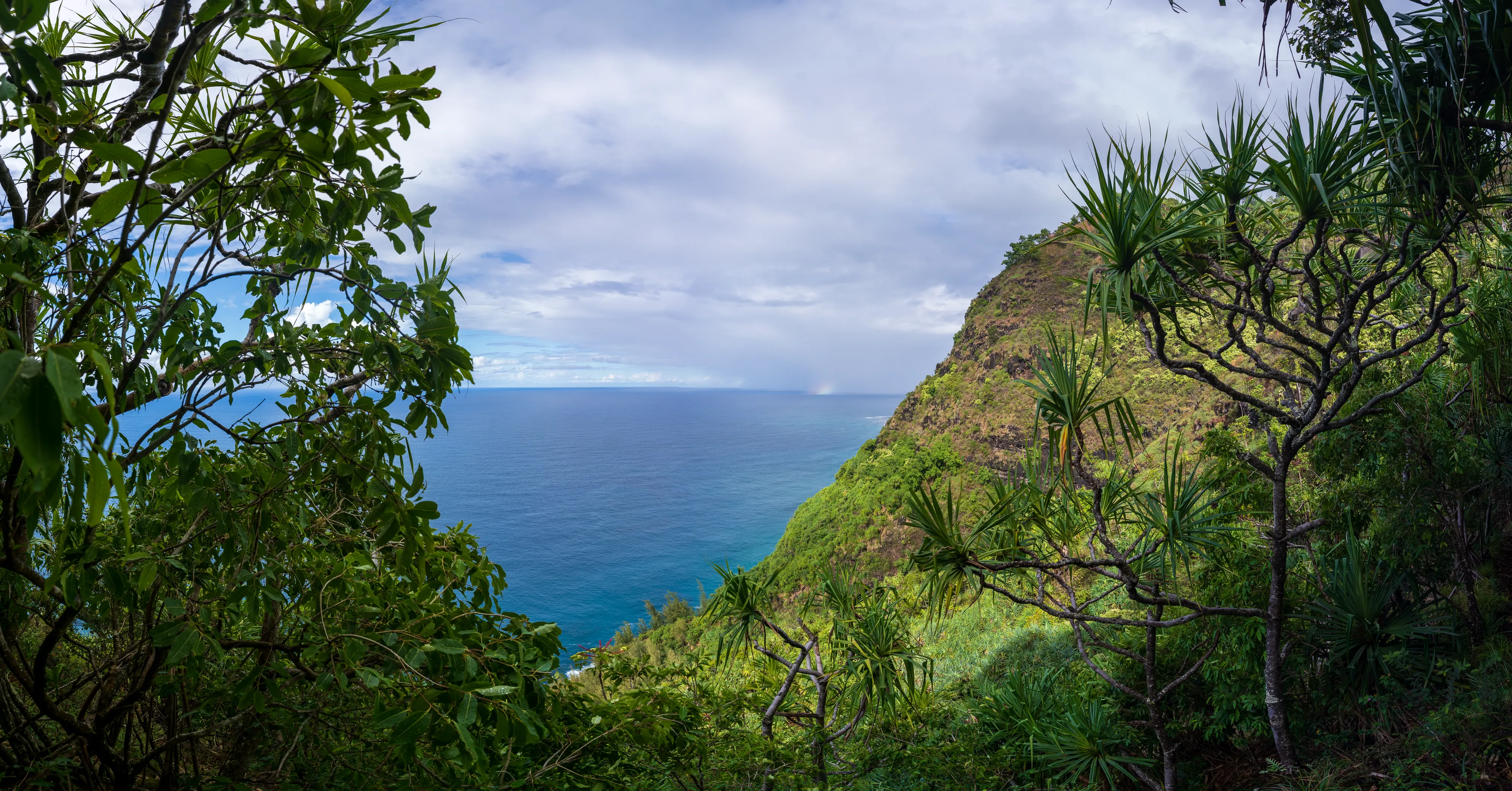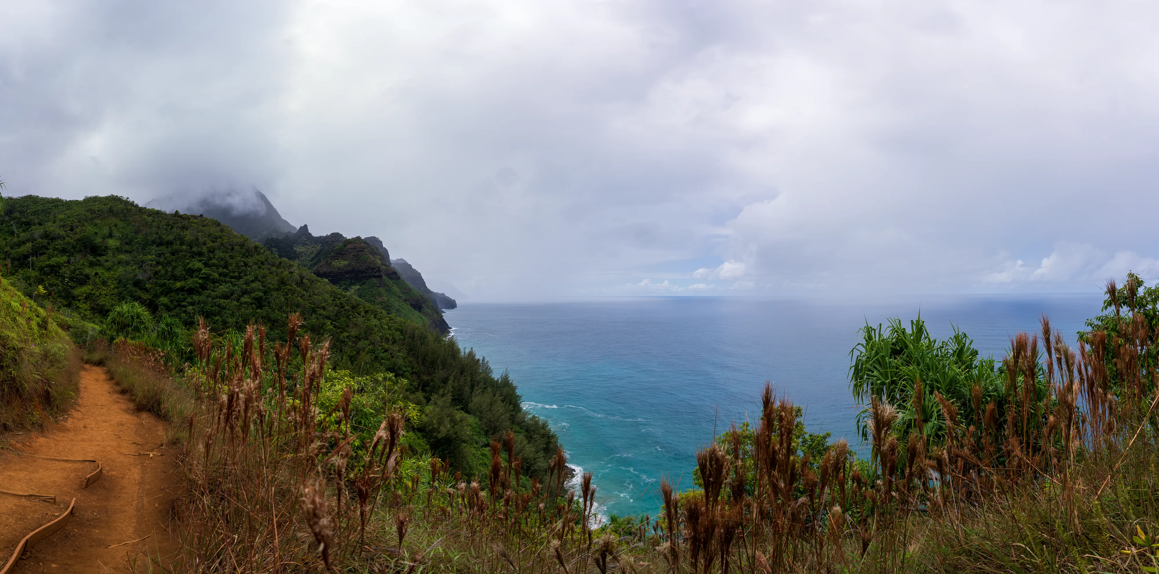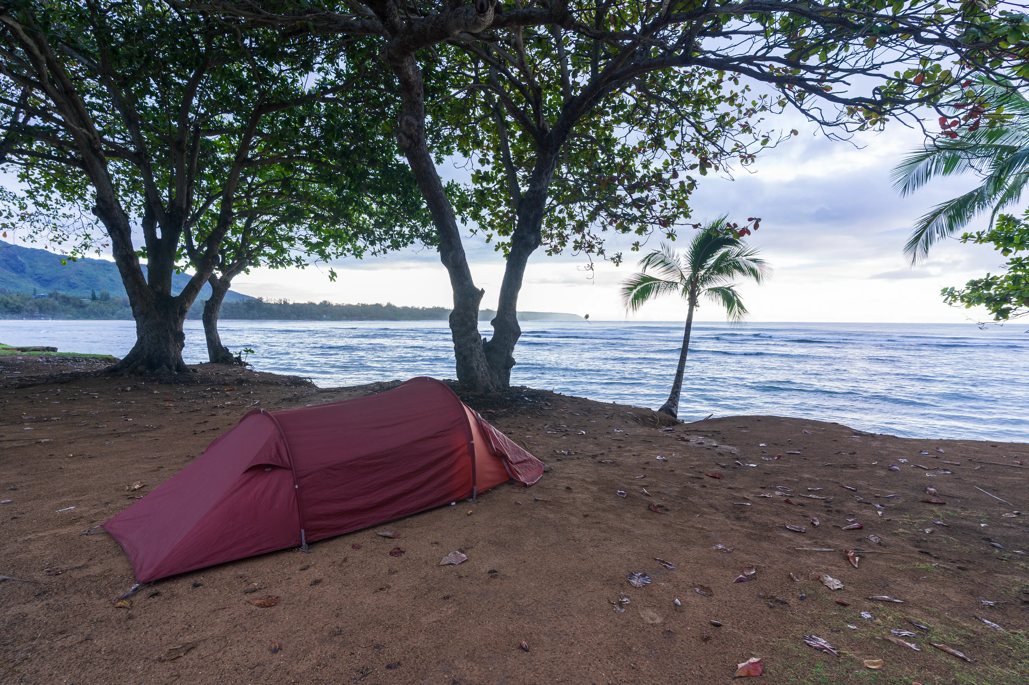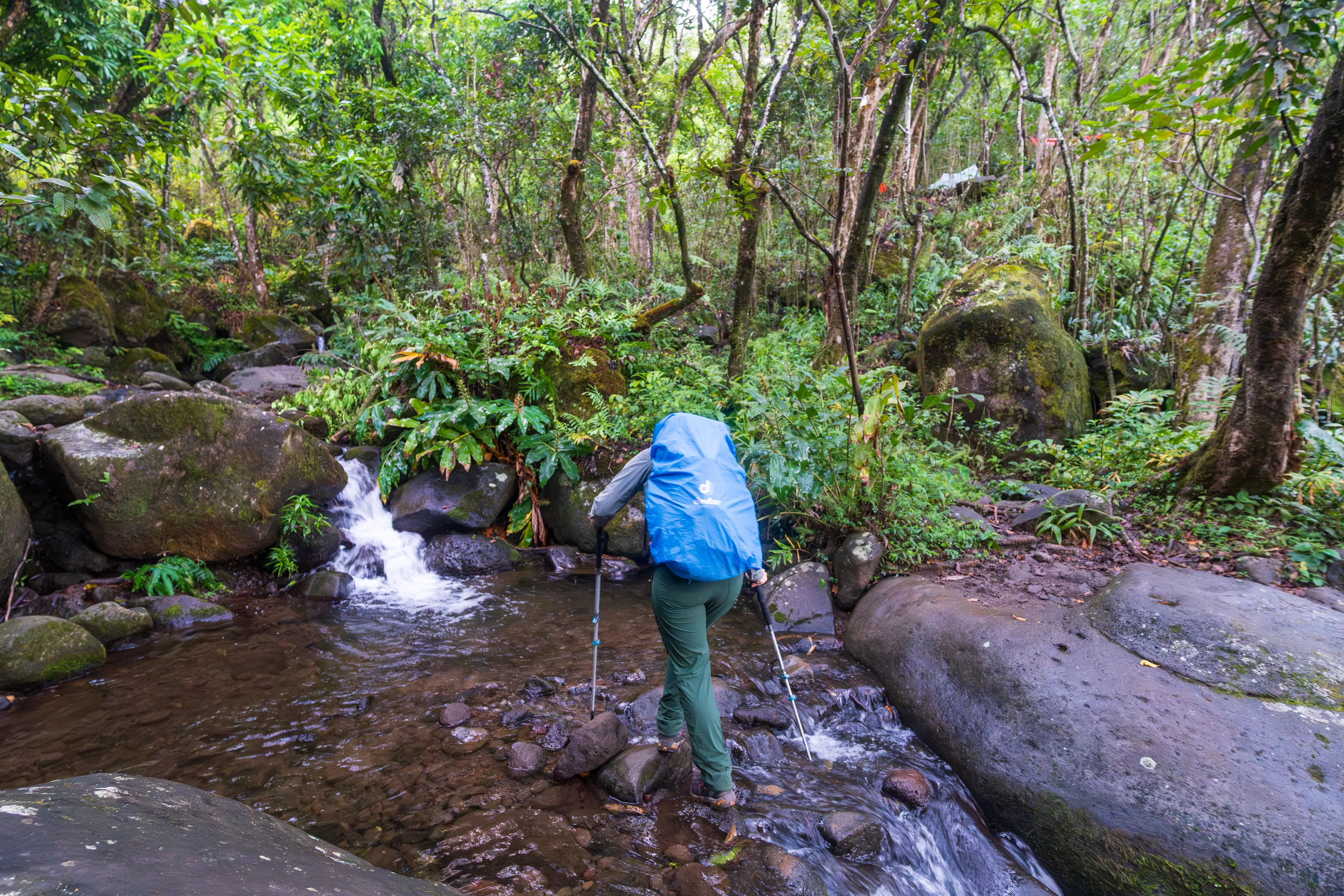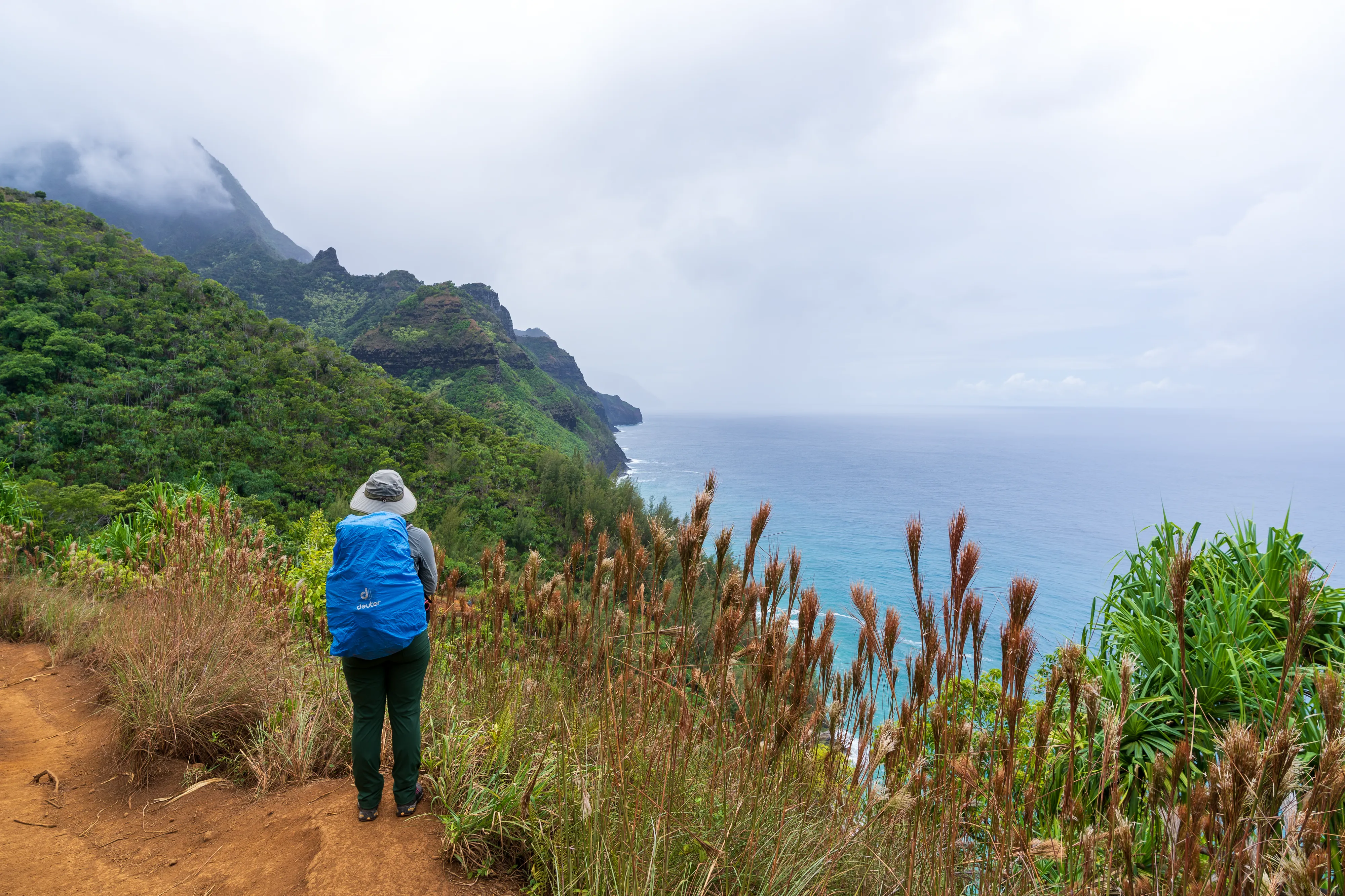 Kurz danach geht es auf den eigentlichen Kalalau Trail. Dieser ist teilweise nur ein schmaler Trampelpfad, erfordert gute Trittsicherheit und ist ein ständiges Auf und Ab. Die Wanderung startet hinter dem Hā’ena Beach Park und führt durch den Regenwald entlang der Nā Pali Coast. Nach ein paar Kilometern gelangen wir zum Hanakapīʻai Beach. Bis hierhin kann man auch ohne Permit wandern und dementsprechend finden sich einige Tagestouristen auf dem Weg und am Strand. Leider werden wir hier auch von einem Regenguss überrascht und stellen uns schützend unter die Bäume. Anschließend geht es auf einem deutlich weniger gelaufenen Weg die nächste Küstenflanke hoch. Dank Nieselregen steigt die Luftfeuchtigkeit noch weiter an und wir kommen mit unserem Gepäck nur noch langsam voran.