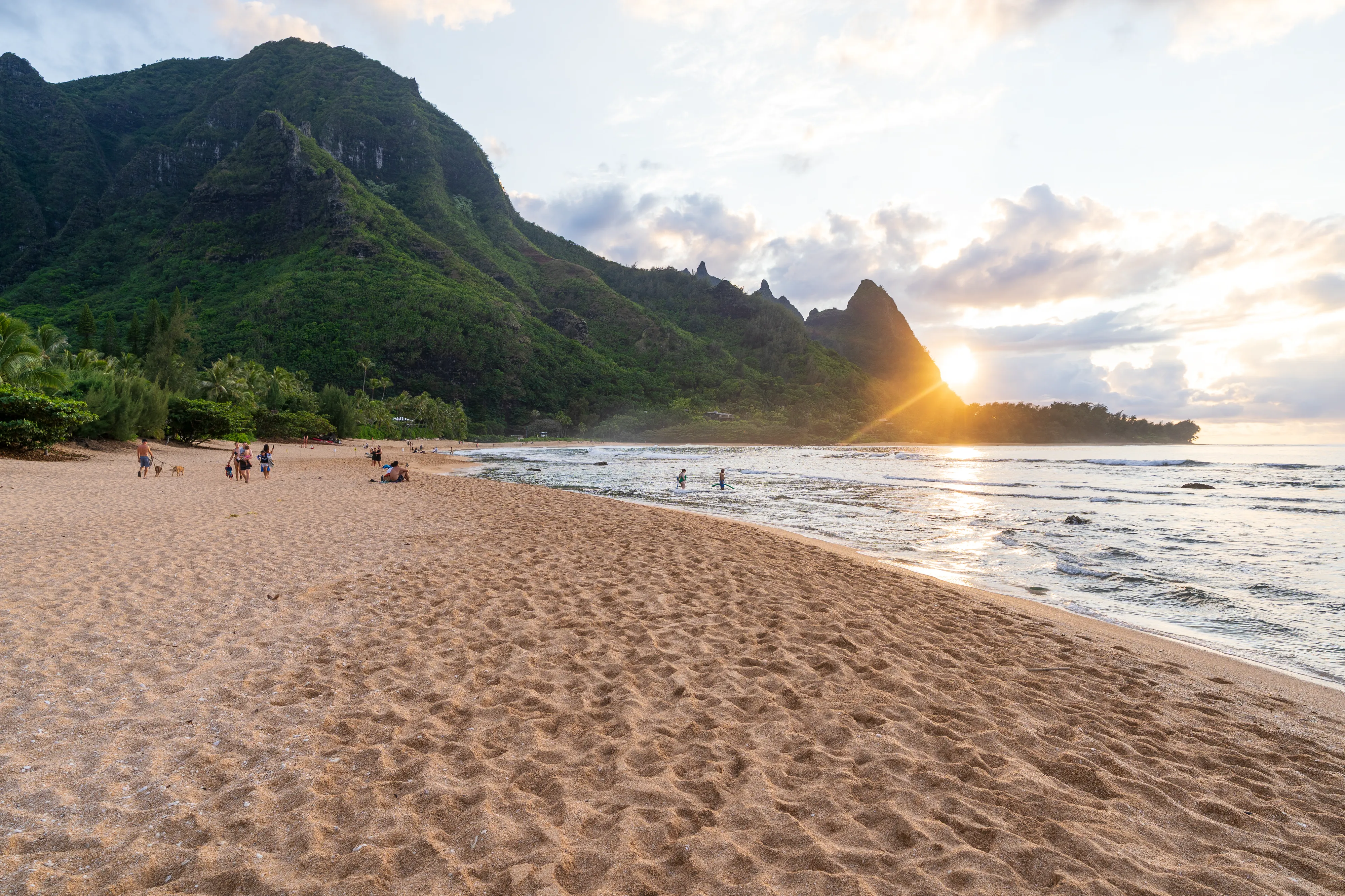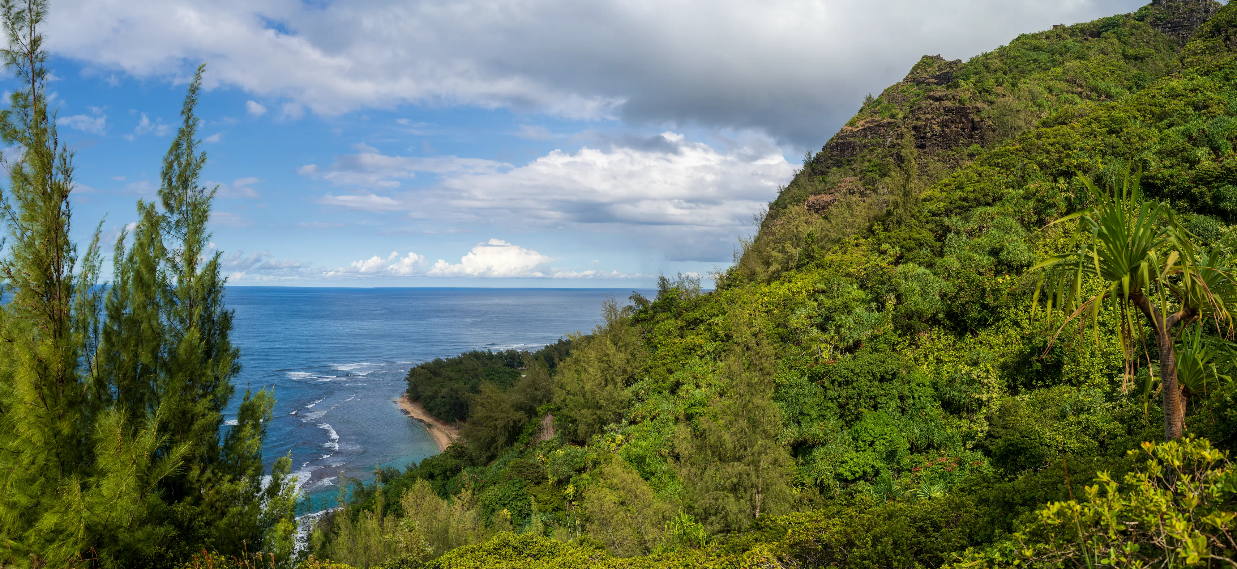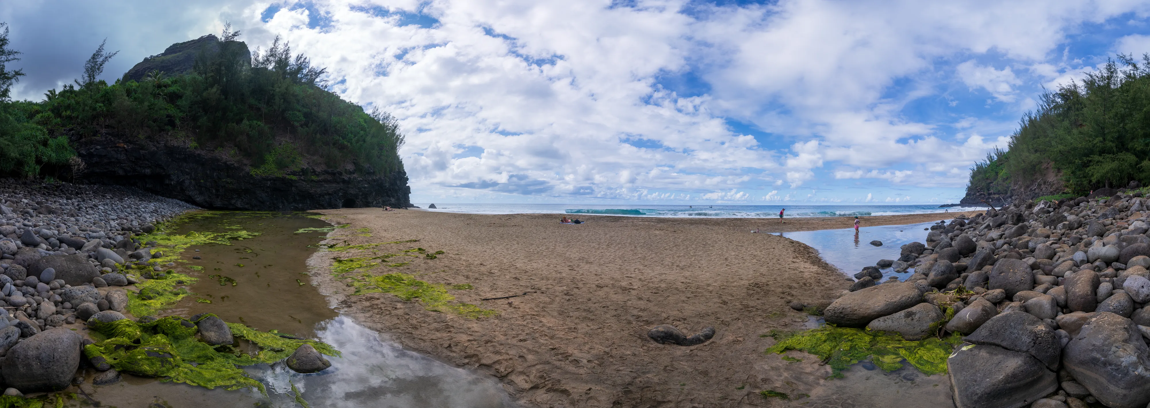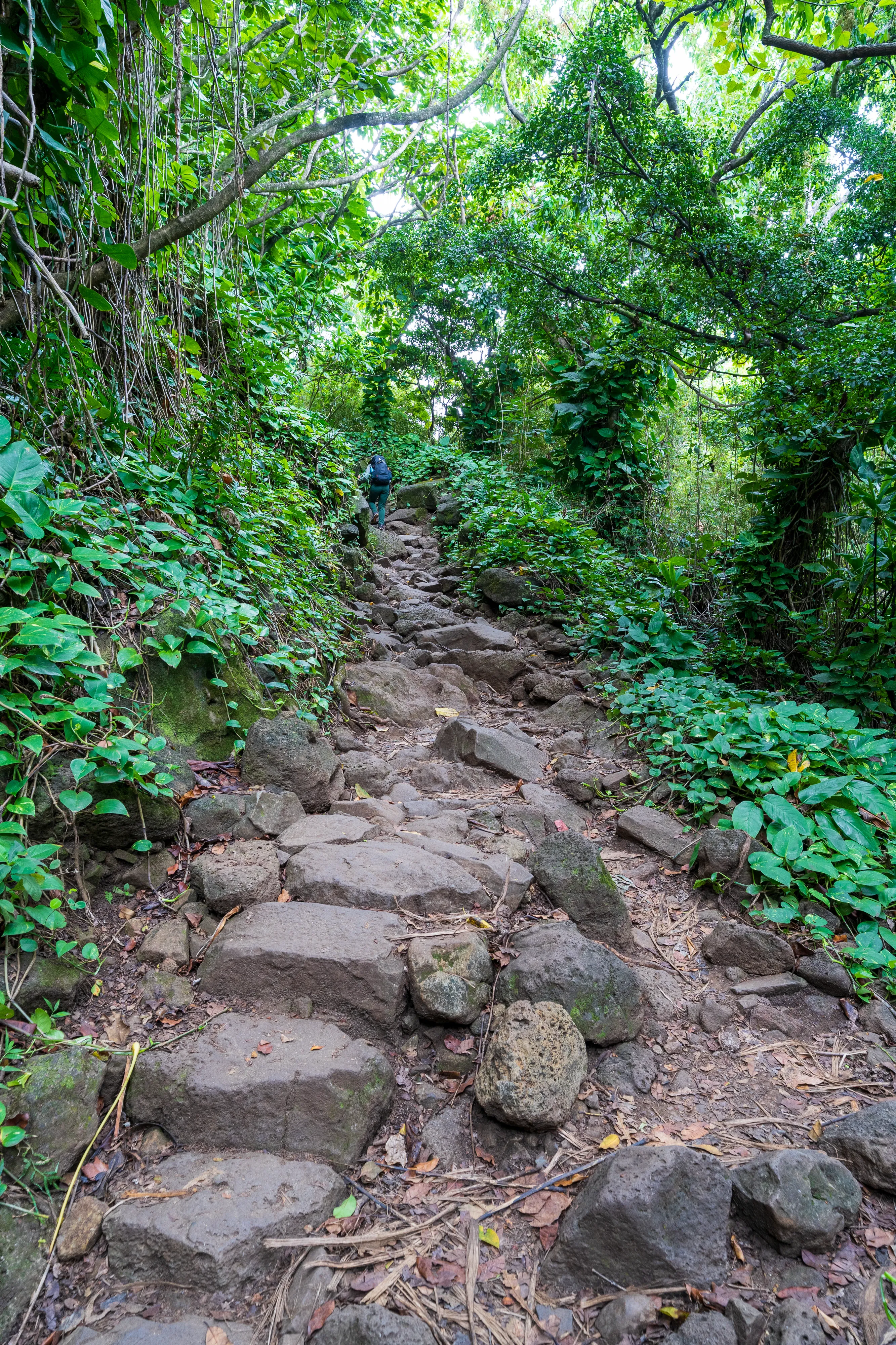 Kurz danach geht es auf den eigentlichen Kalalau Trail. Dieser ist teilweise nur ein schmaler Trampelpfad, erfordert gute Trittsicherheit und ist ein ständiges Auf und Ab. Die Wanderung startet hinter dem Hā’ena Beach Park und führt durch den Regenwald entlang der Nā Pali Coast. Nach ein paar Kilometern gelangen wir zum Hanakapīʻai Beach. Bis hierhin kann man auch ohne Permit wandern und dementsprechend finden sich einige Tagestouristen auf dem Weg und am Strand. Leider werden wir hier auch von einem Regenguss überrascht und stellen uns schützend unter die Bäume. Anschließend geht es auf einem deutlich weniger gelaufenen Weg die nächste Küstenflanke hoch. Dank Nieselregen steigt die Luftfeuchtigkeit noch weiter an und wir kommen mit unserem Gepäck nur noch langsam voran.