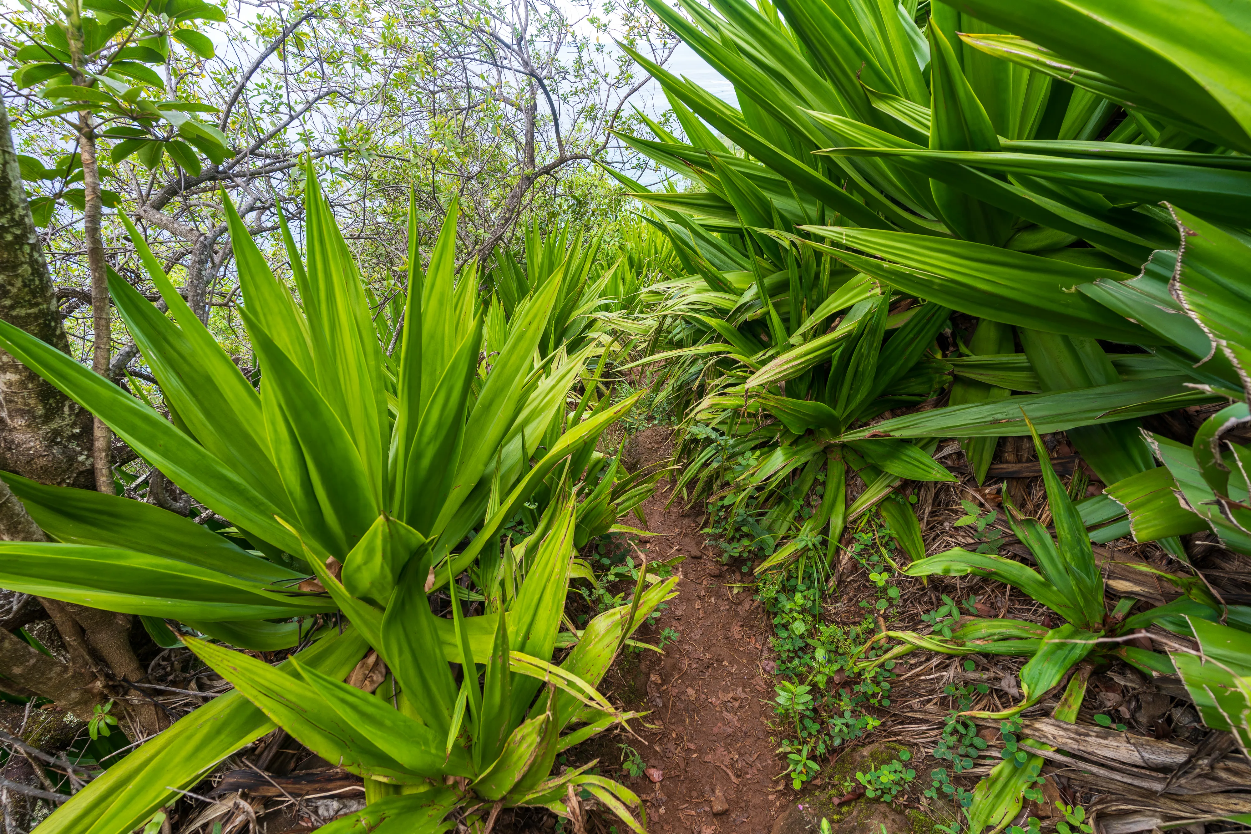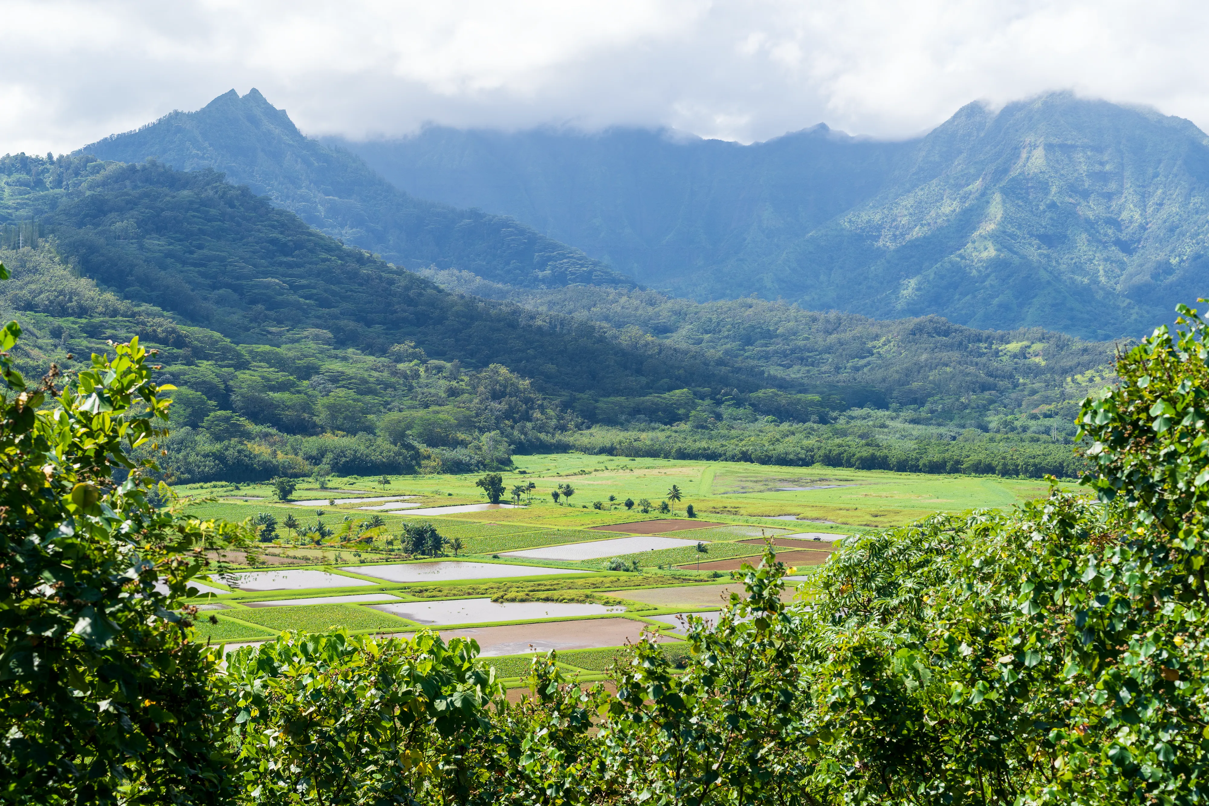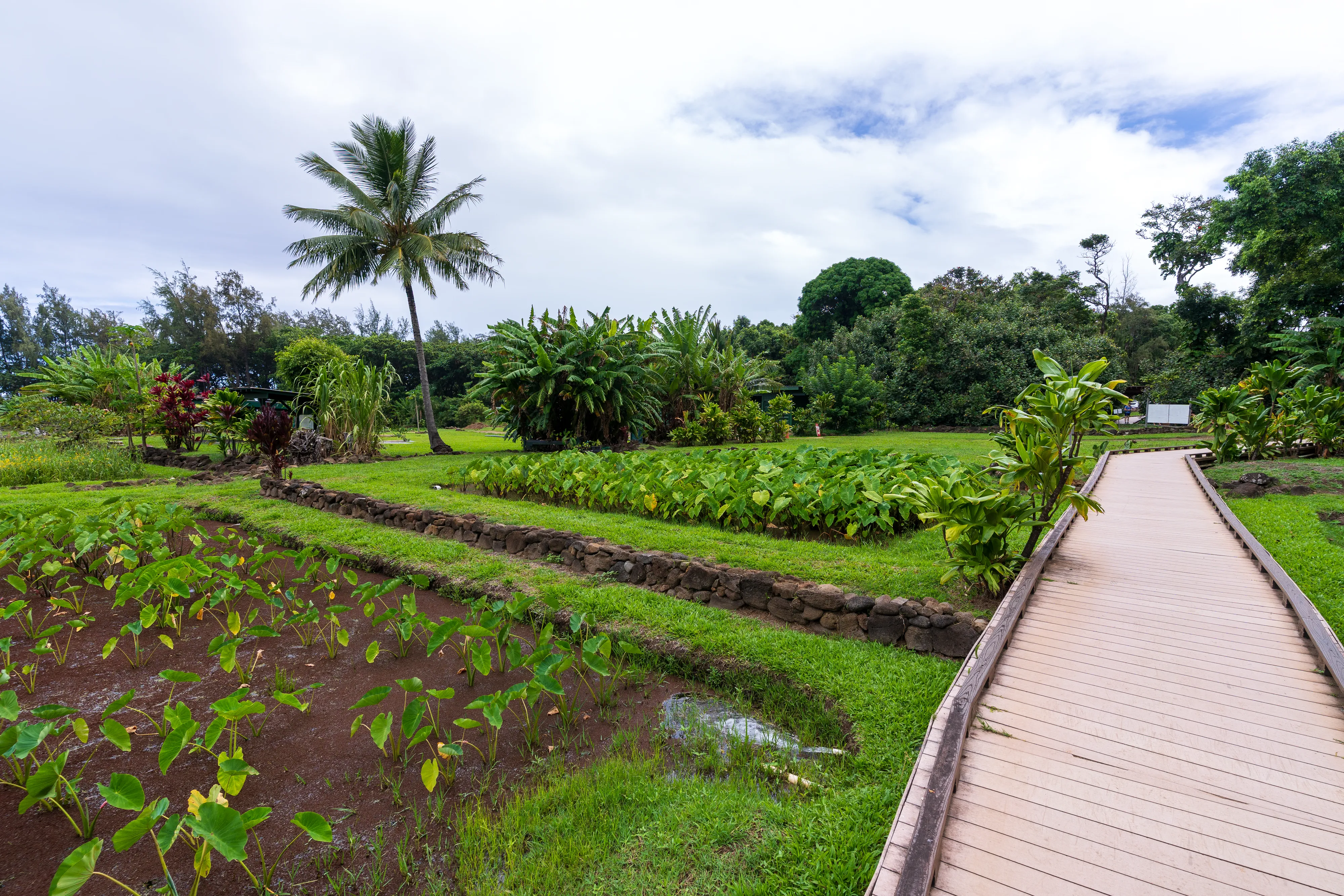 Am Parkplatz packen wir unsere Rucksäcke um, sodass wir auch wirklich nur das Nötigste mitnehmen. Dann geht es durch einen angelegten Schaugarten, in welchem Taro und andere, traditionelle Nutzpflanzen der Hawai’ianer nach traditionellen Methoden angebaut und diese an die nächsten Generationen weitergereicht werden.