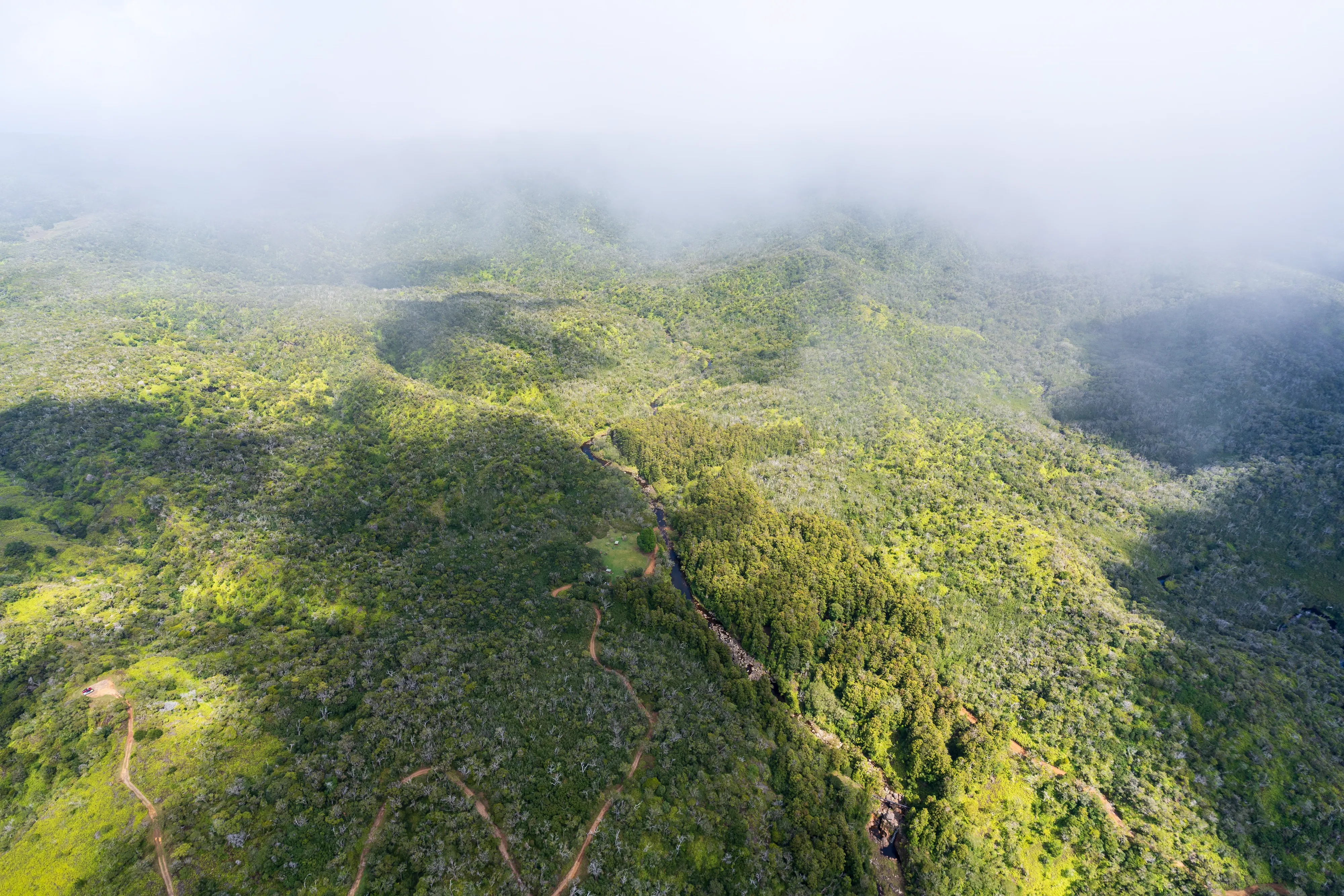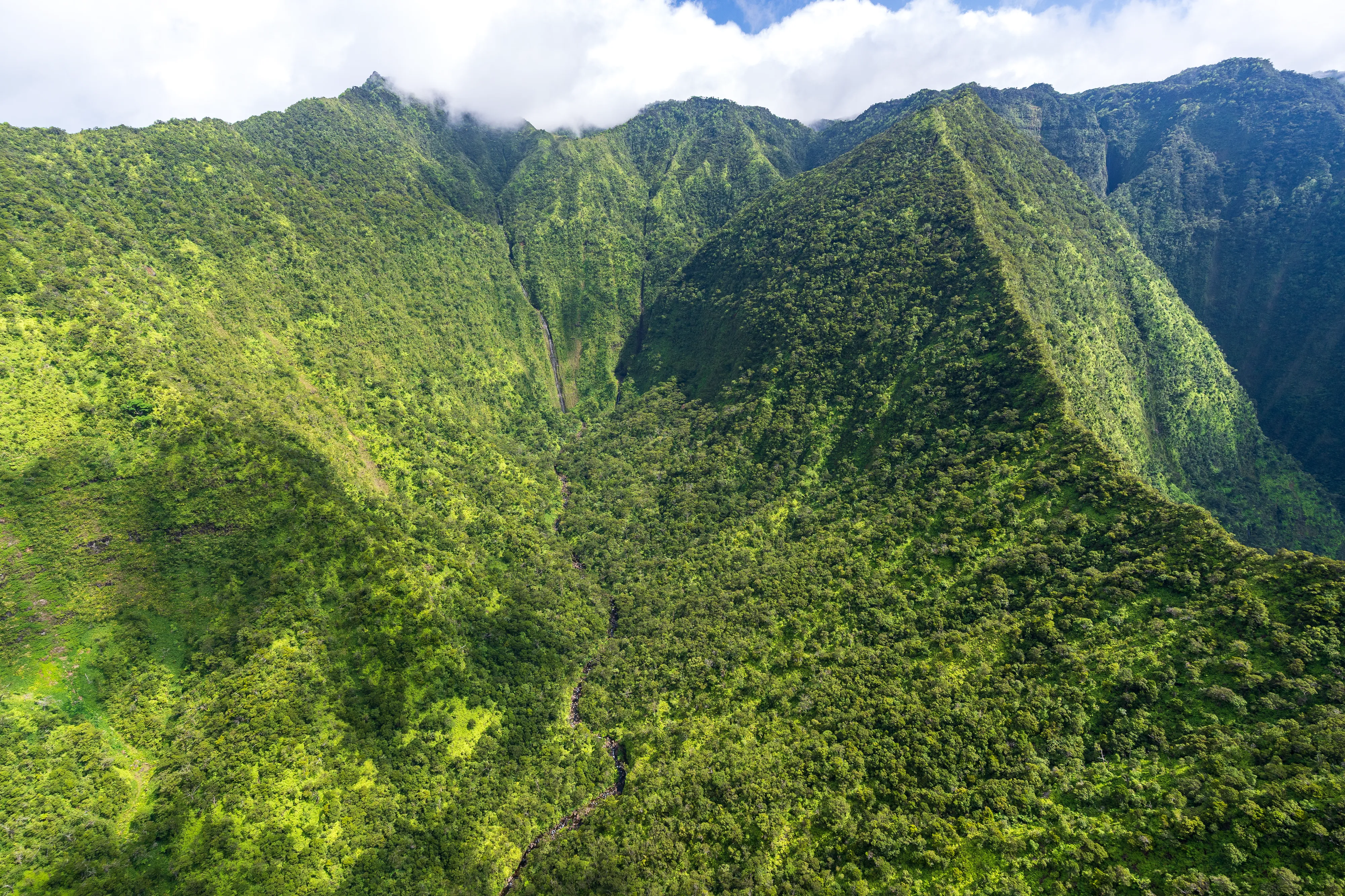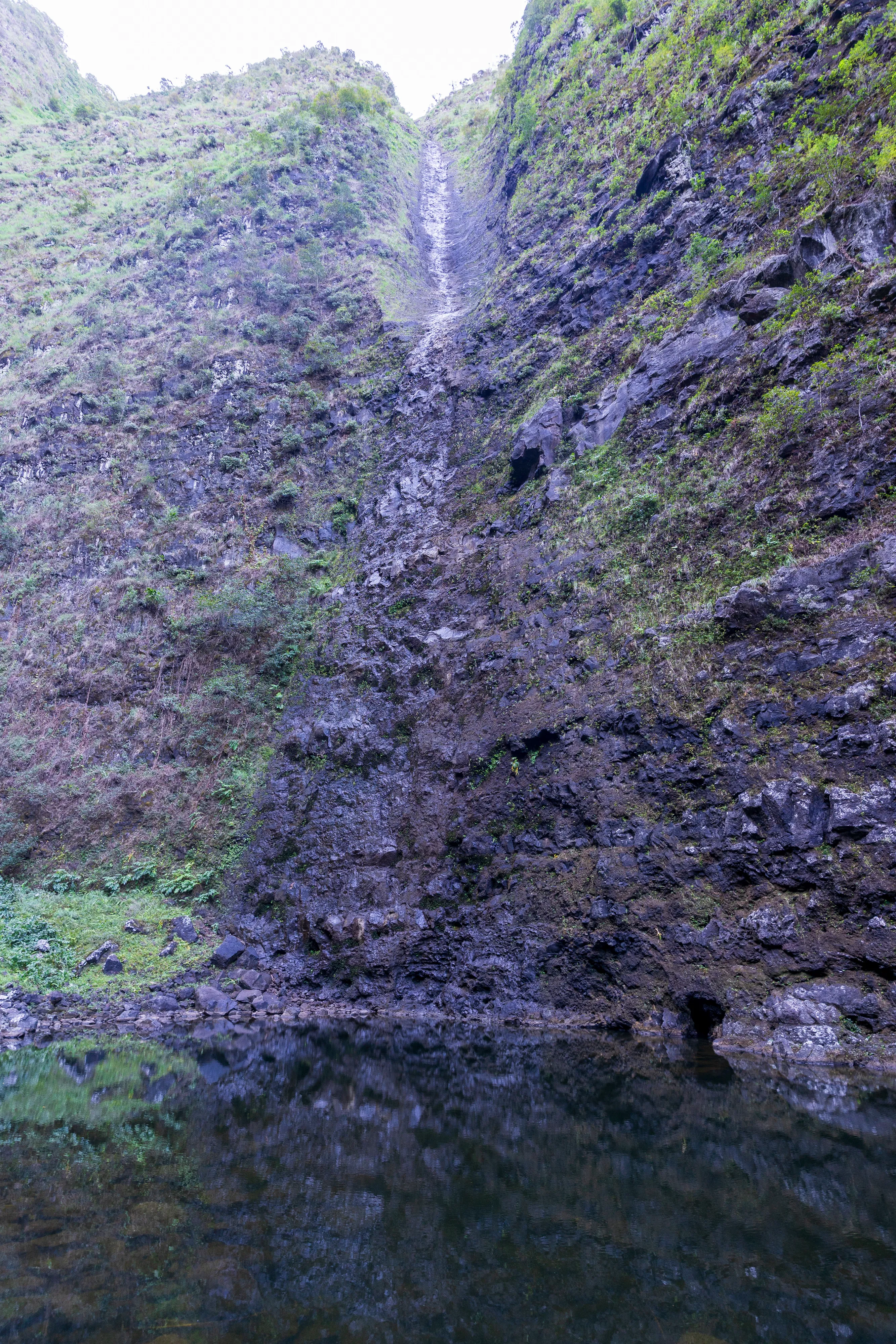 Am nächsten Morgen wandern wir den gleichen Weg zurück zu unserem Auto, diesmal zum Glück ohne Regen und sogar mit etwas Sonne. Vorher machen wir jedoch noch einen Abstecher zu den Hanakoa Falls - allerdings kann man den Wasserfall nur erahnen, denn er ist gänzlich trockengefallen.