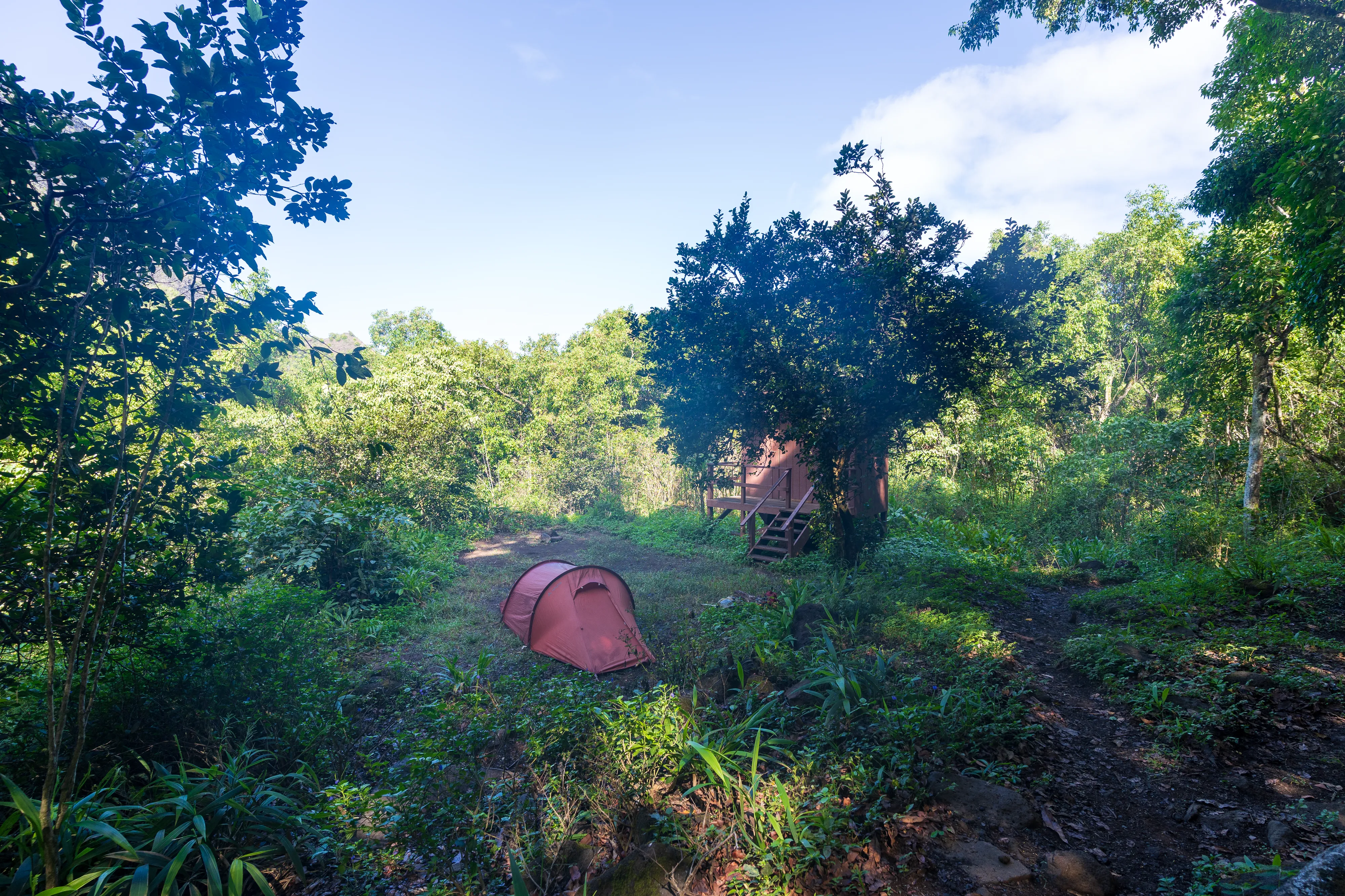 Auch wenn die Landschaft und die Ausblicke während unserer Wanderung sehr schön sind, so sind wir dennoch sehr froh, als wir mit einsetzender Dunkelheit den Campingplatz erreichen (wobei “Campingplatz” etwas hochgegriffen ist, denn es handelt sich lediglich um ein paar früher für den Anbau von Taro genutzte Terrassen und ein Plumpsklo).