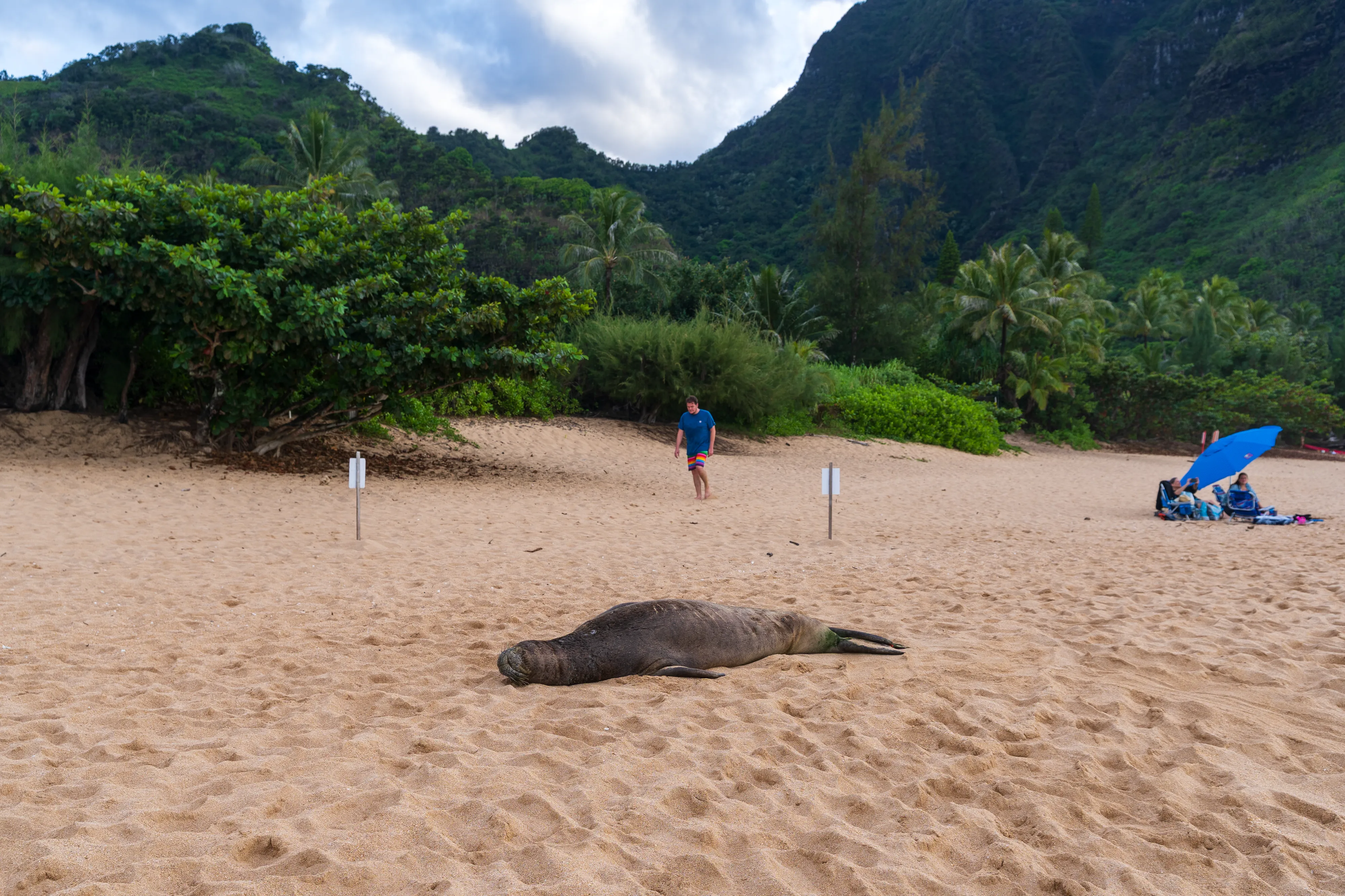 Vom Infekt, dem Klima und der anstrengenden Wanderung ziemlich erledigt kommen wir endlich wieder beim Auto an - sogar schneller als gedacht. Zur Erholung gehen wir noch eine Runde am Tunnels Beach schnorcheln - hier geht das Riff bis direkt an den Strand und es finden sich einige Fische - und legen uns in den Sand. Dass sich so herrlich entspannen lässt, weiß auch die Robbe, die sich zum, von Fressfeinden ungestörten, Schlafen auf den Strand gelegt hat.