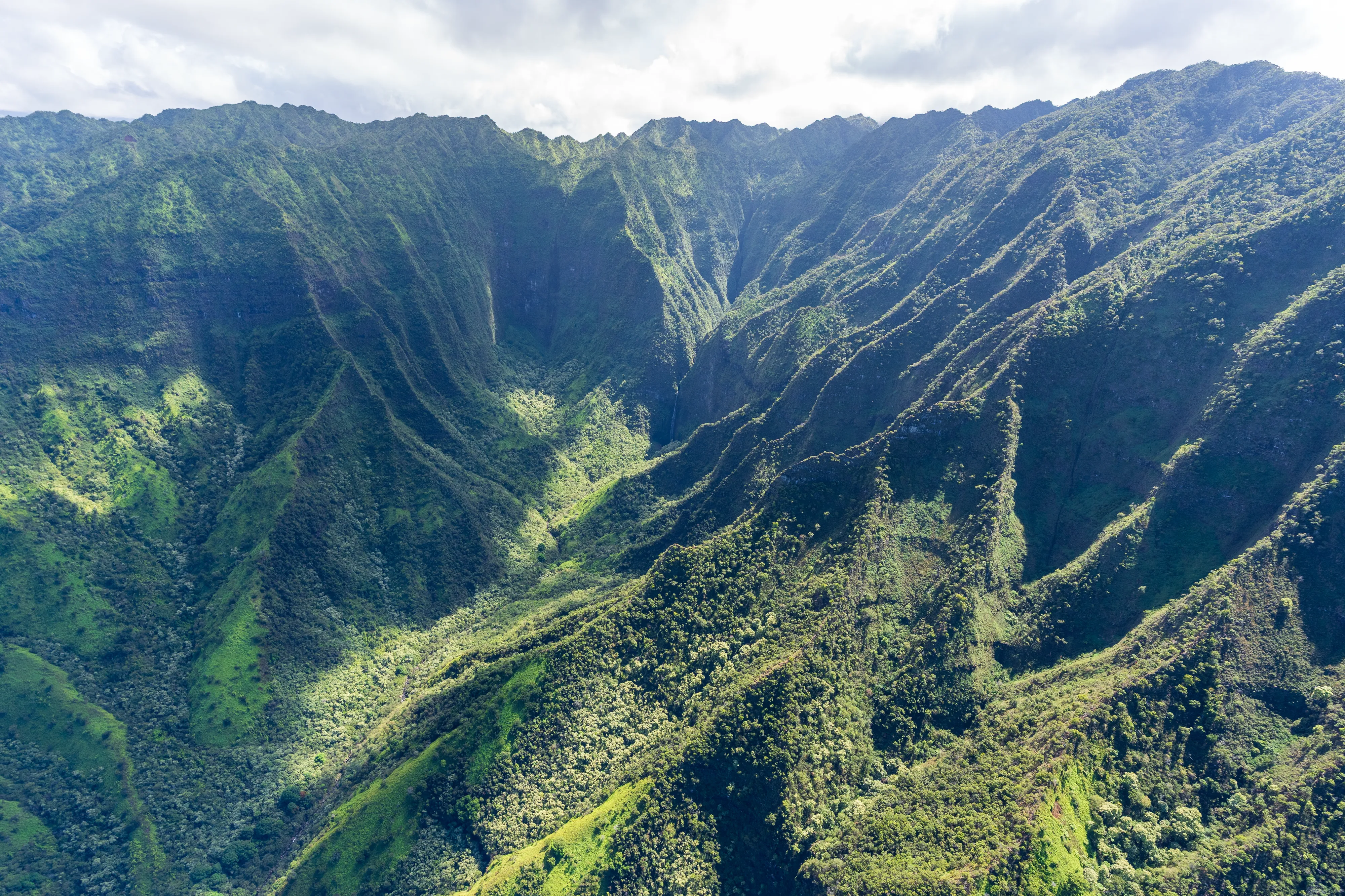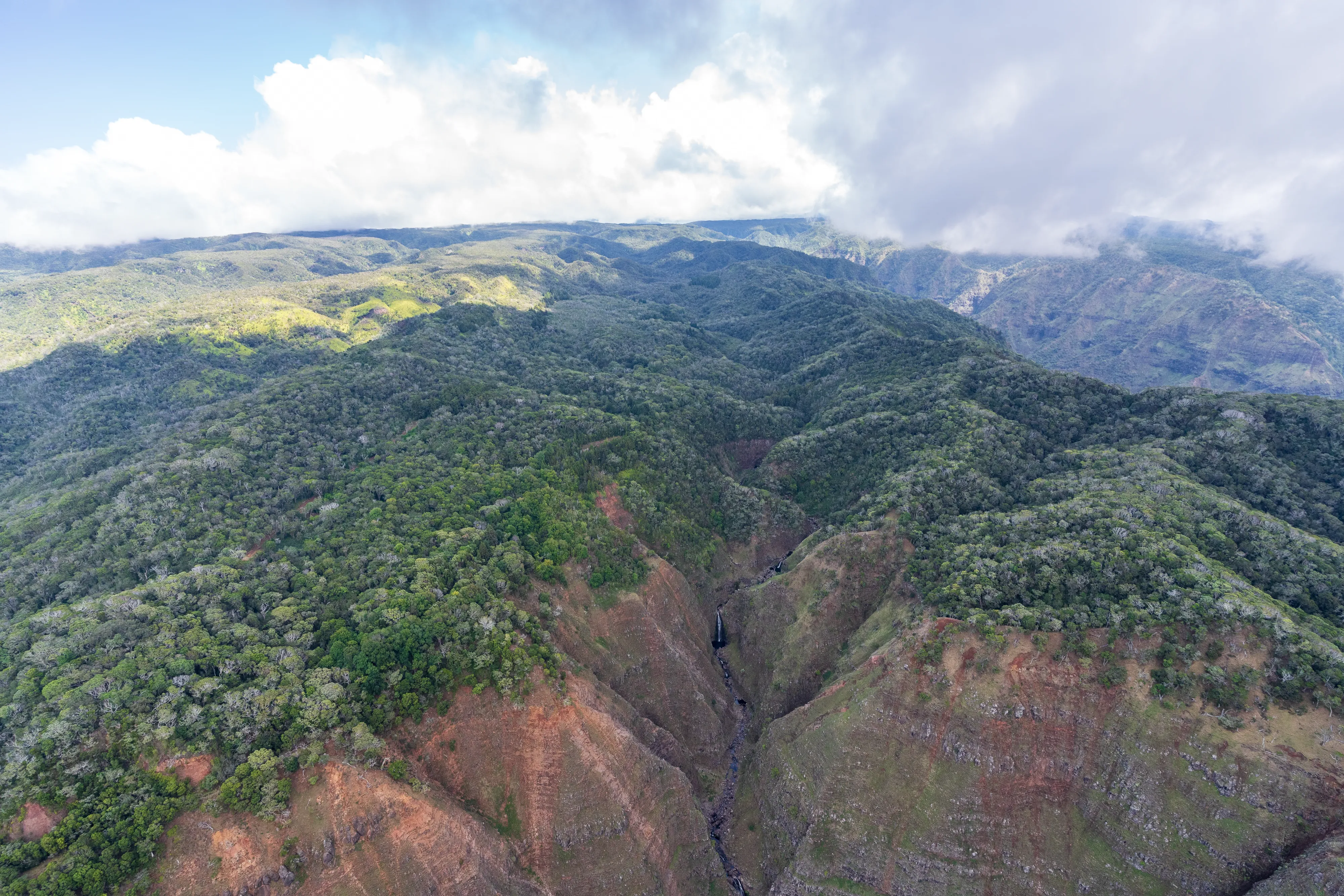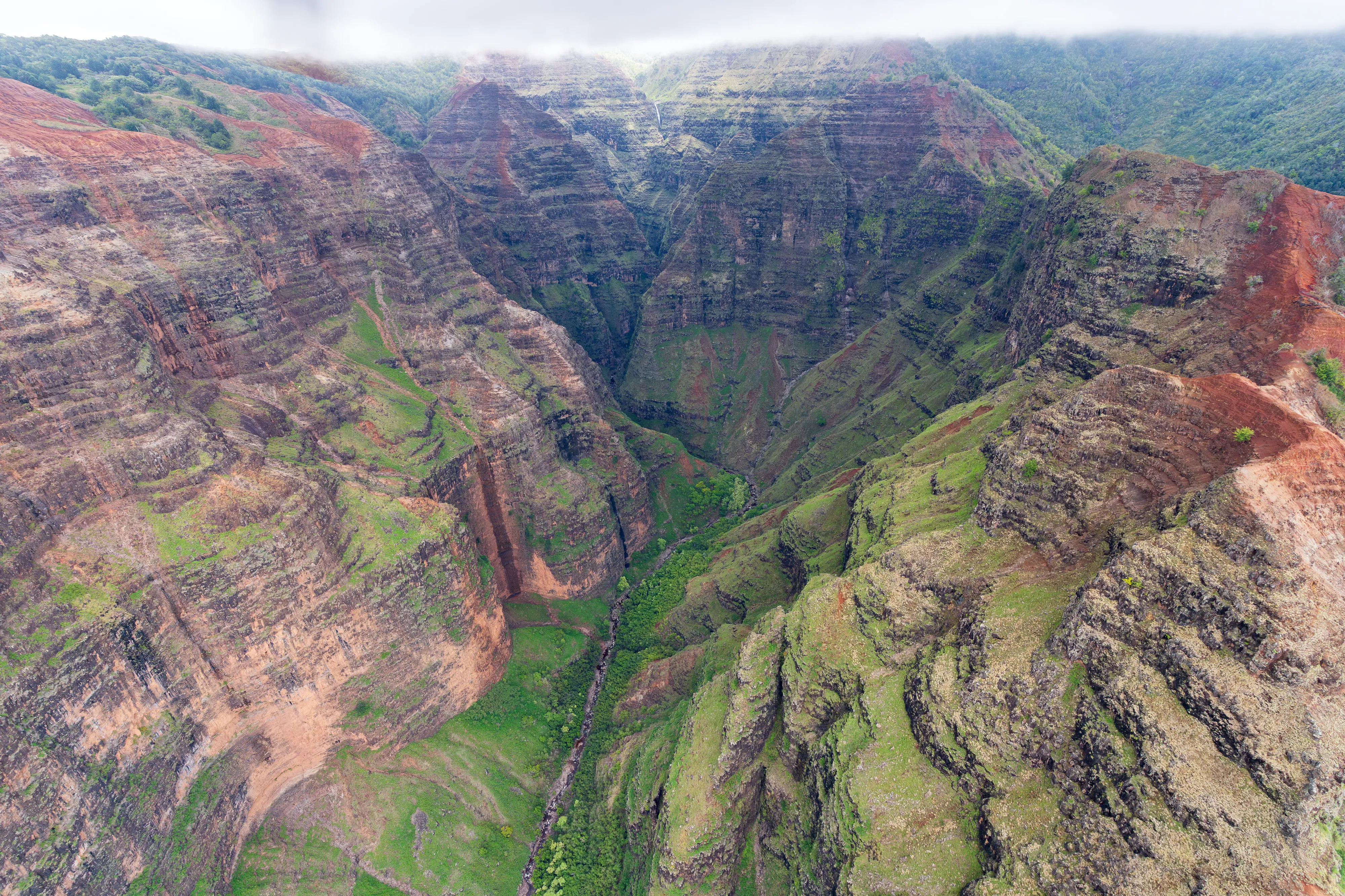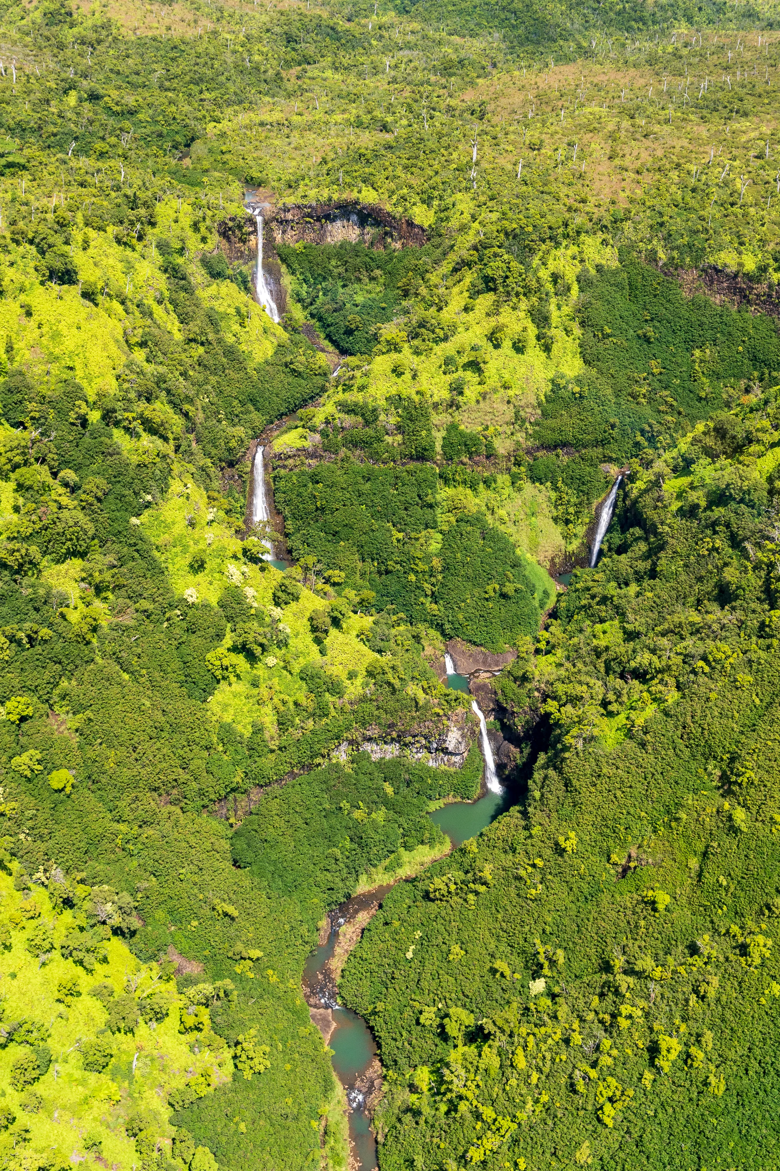 Die Nā Pali Coast und den Waimea Canyon von oben zu sehen ist einfach atemberaubend, da man so die grünen, schmalen Bergflanken erst so richtig wahrnimmt und auch Wasserfälle sieht, die man sonst niemals erreicht und gesehen hätte. Über Kopfhörer bekommen wir vom Piloten noch Information zu den jeweils überflogenen Gebieten - auch wenn wir diese akustisch kaum verstehen, denn es ist doch ziemlich laut. Als wir jedoch den aus dem Film Jurassic Park bekannten Wasserfall, eingebettet in eine spektakuläre Landschaft, überfliegen und dazu über die Kopfhörer die entsprechende Filmmusik kommt, ist es beinahe ein magischer Moment. Wir fliegen einmal quer über die Insel und kommen aus dem Staunen und Fotografieren gar nicht mehr heraus. Sind diese Rundflüge durchaus nicht unumstritten (Anwohner fühlen sich vom Lärm gestört; auf dem viel überflogenen Na Pali Trail konnten wir das durchaus nachvollziehen), so ist das Erlebnis für den Passagier dennoch atemberaubend, einzigartig und vermutlich auch einmalig.
