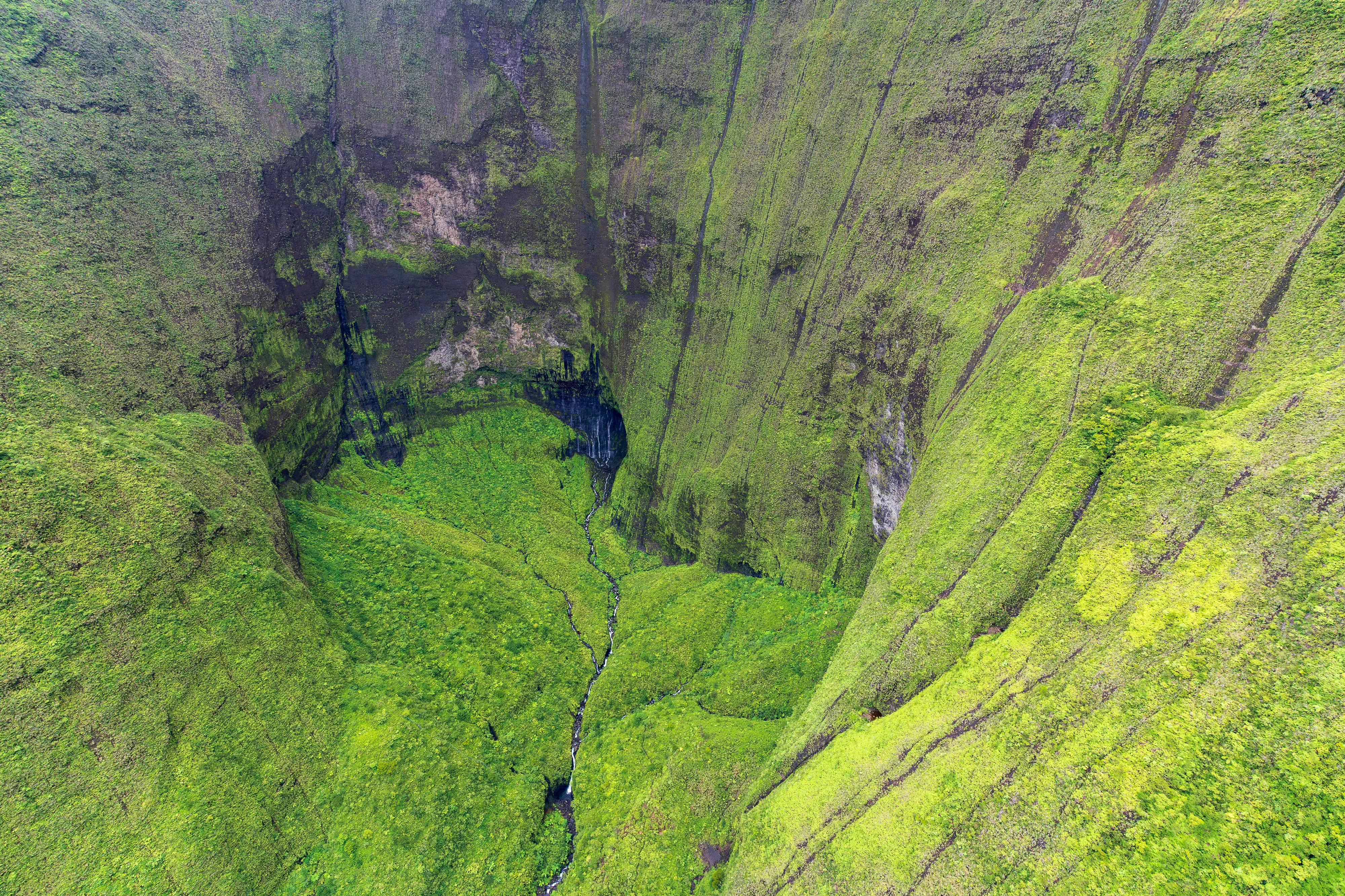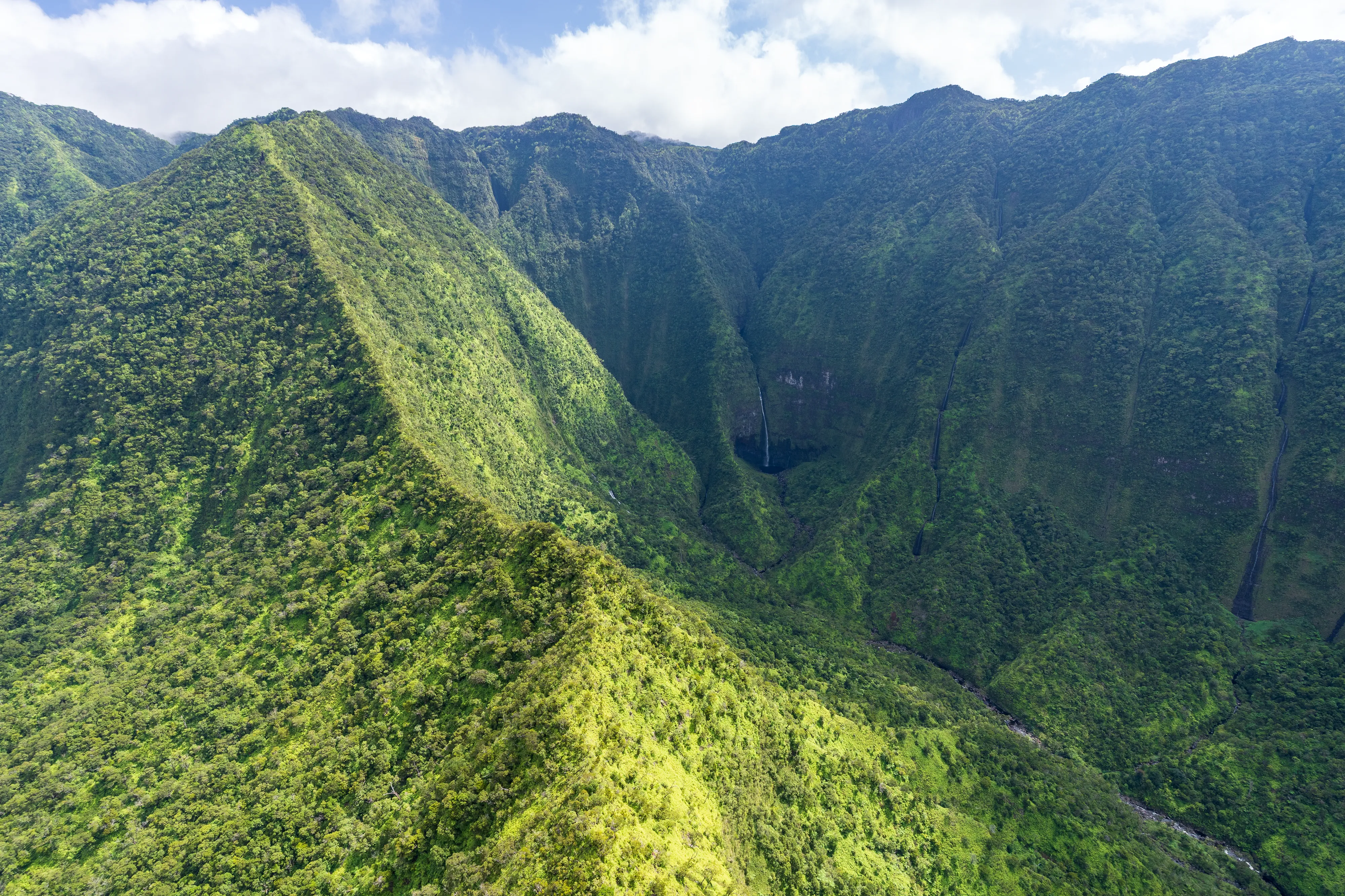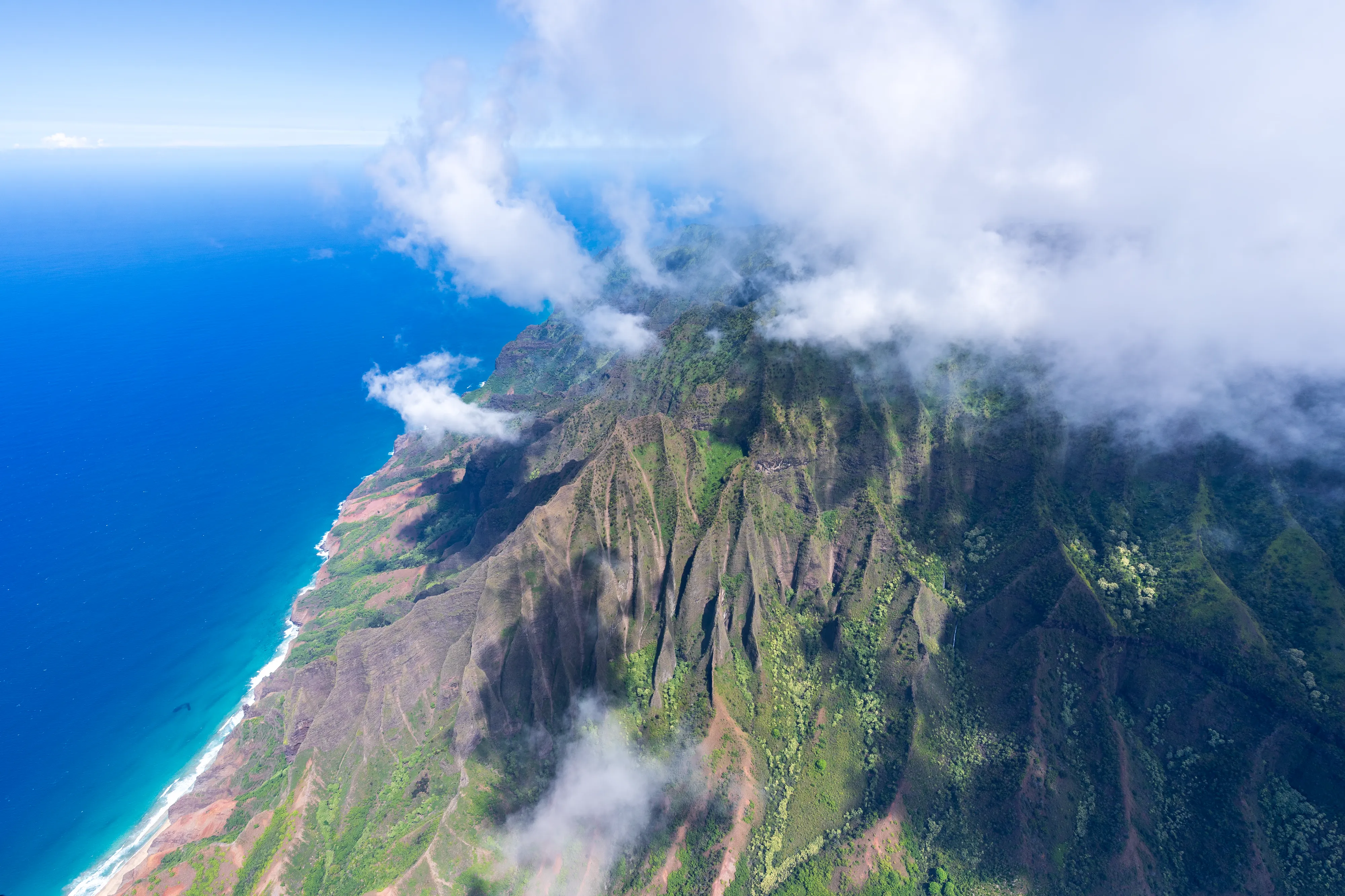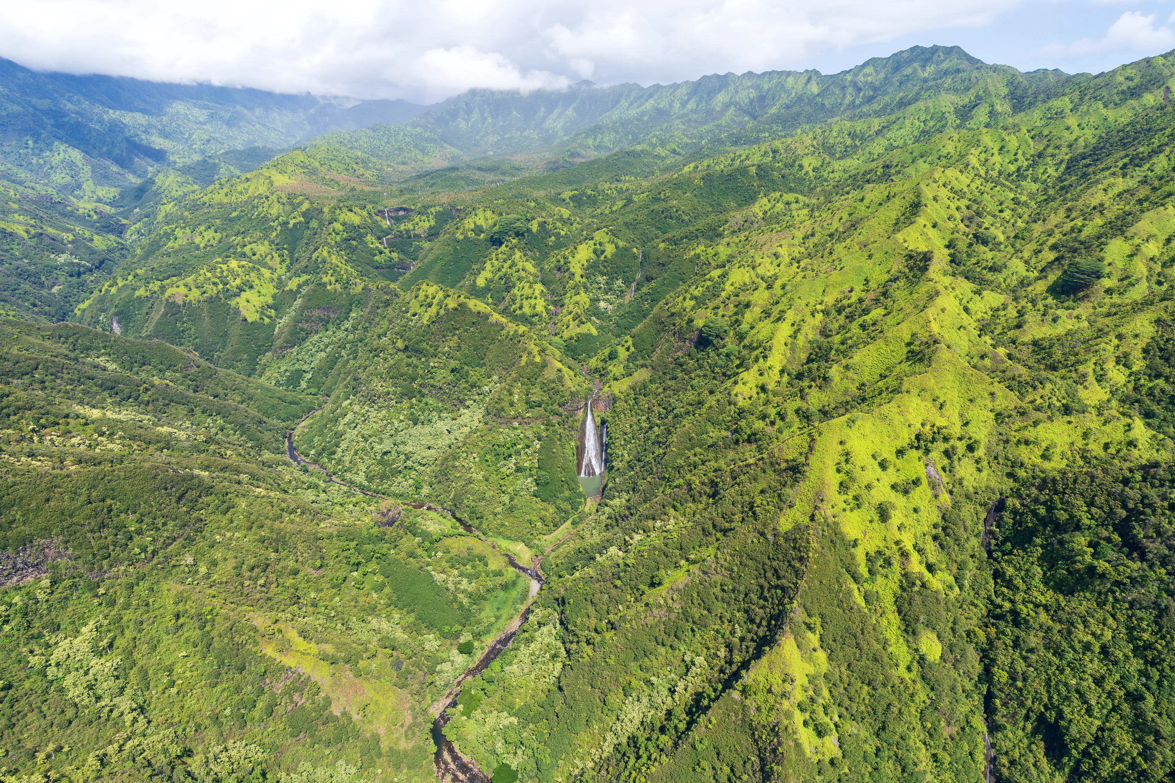 Die Nā Pali Coast und den Waimea Canyon von oben zu sehen ist einfach atemberaubend, da man so die grünen, schmalen Bergflanken erst so richtig wahrnimmt und auch Wasserfälle sieht, die man sonst niemals erreicht und gesehen hätte. Über Kopfhörer bekommen wir vom Piloten noch Information zu den jeweils überflogenen Gebieten - auch wenn wir diese akustisch kaum verstehen, denn es ist doch ziemlich laut. Als wir jedoch den aus dem Film Jurassic Park bekannten Wasserfall, eingebettet in eine spektakuläre Landschaft, überfliegen und dazu über die Kopfhörer die entsprechende Filmmusik kommt, ist es beinahe ein magischer Moment. Wir fliegen einmal quer über die Insel und kommen aus dem Staunen und Fotografieren gar nicht mehr heraus. Sind diese Rundflüge durchaus nicht unumstritten (Anwohner fühlen sich vom Lärm gestört; auf dem viel überflogenen Na Pali Trail konnten wir das durchaus nachvollziehen), so ist das Erlebnis für den Passagier dennoch atemberaubend, einzigartig und vermutlich auch einmalig.