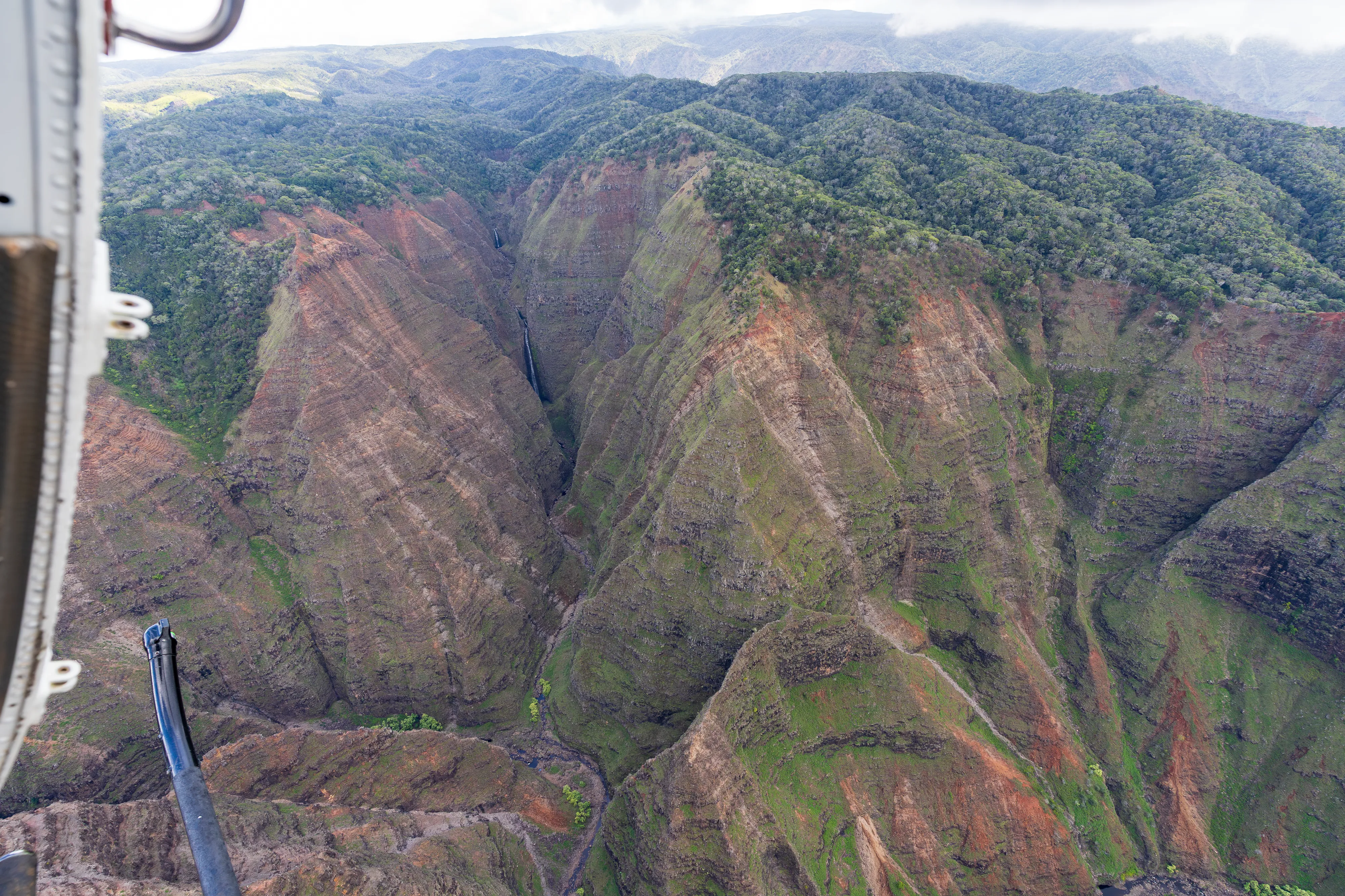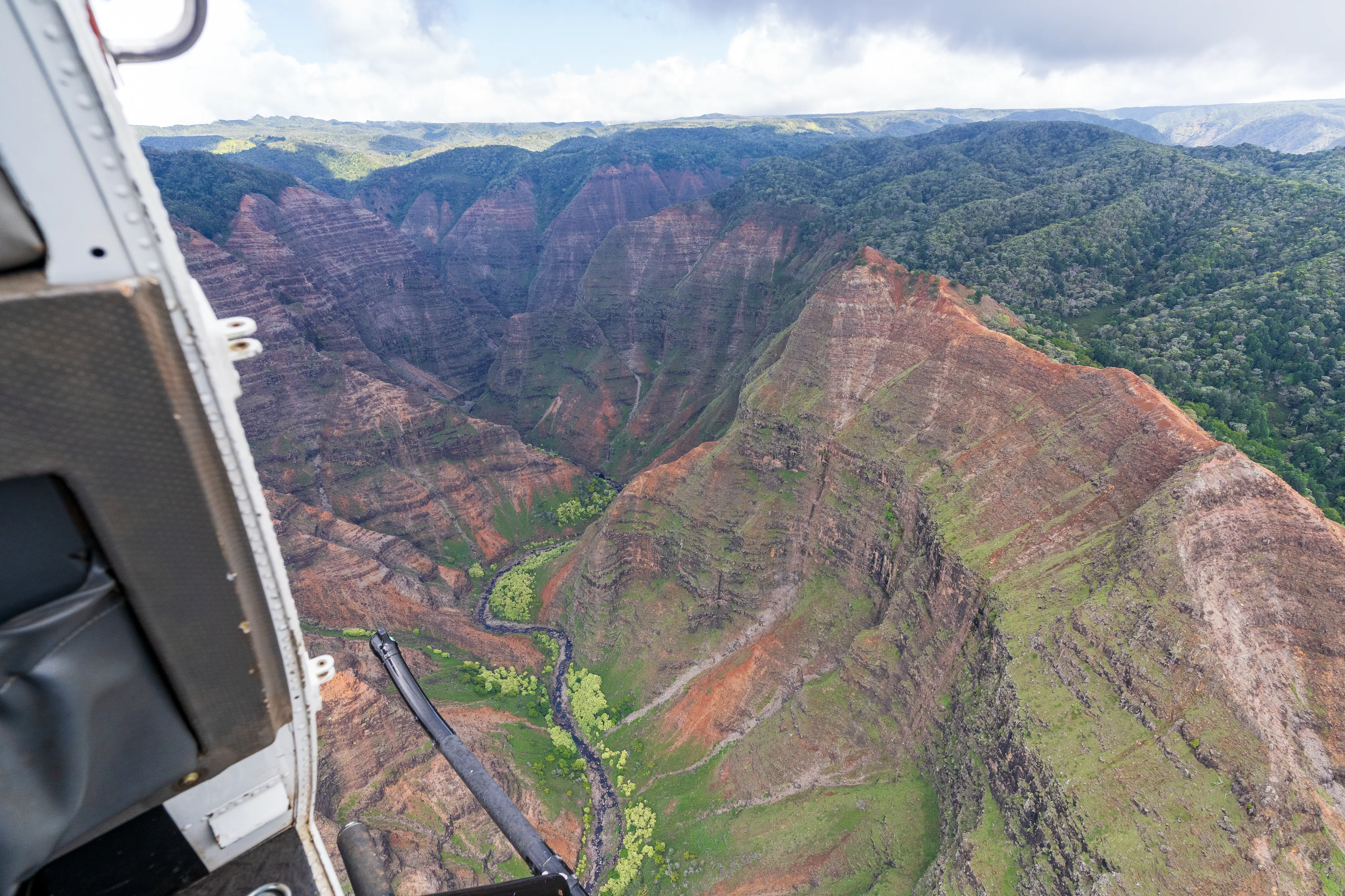 Für den heutigen Mittag steht nämlich ein absolutes Highlight an: ein Hubschrauberflug über Kaua’i, noch dazu ohne Türen (damit man einen ungetrübten Blick hat und besser Fotos schießen kann). Der Flug ist wirklich beeindruckend und auch die fehlenden Türen machen uns weniger aus als gedacht, im Gegenteil, dadurch kann man viel besser Fotos machen und hat ein viel größeres Sichtfeld. Und da man natürlich angeschnallt ist, braucht es die Türen ohnehin nicht.