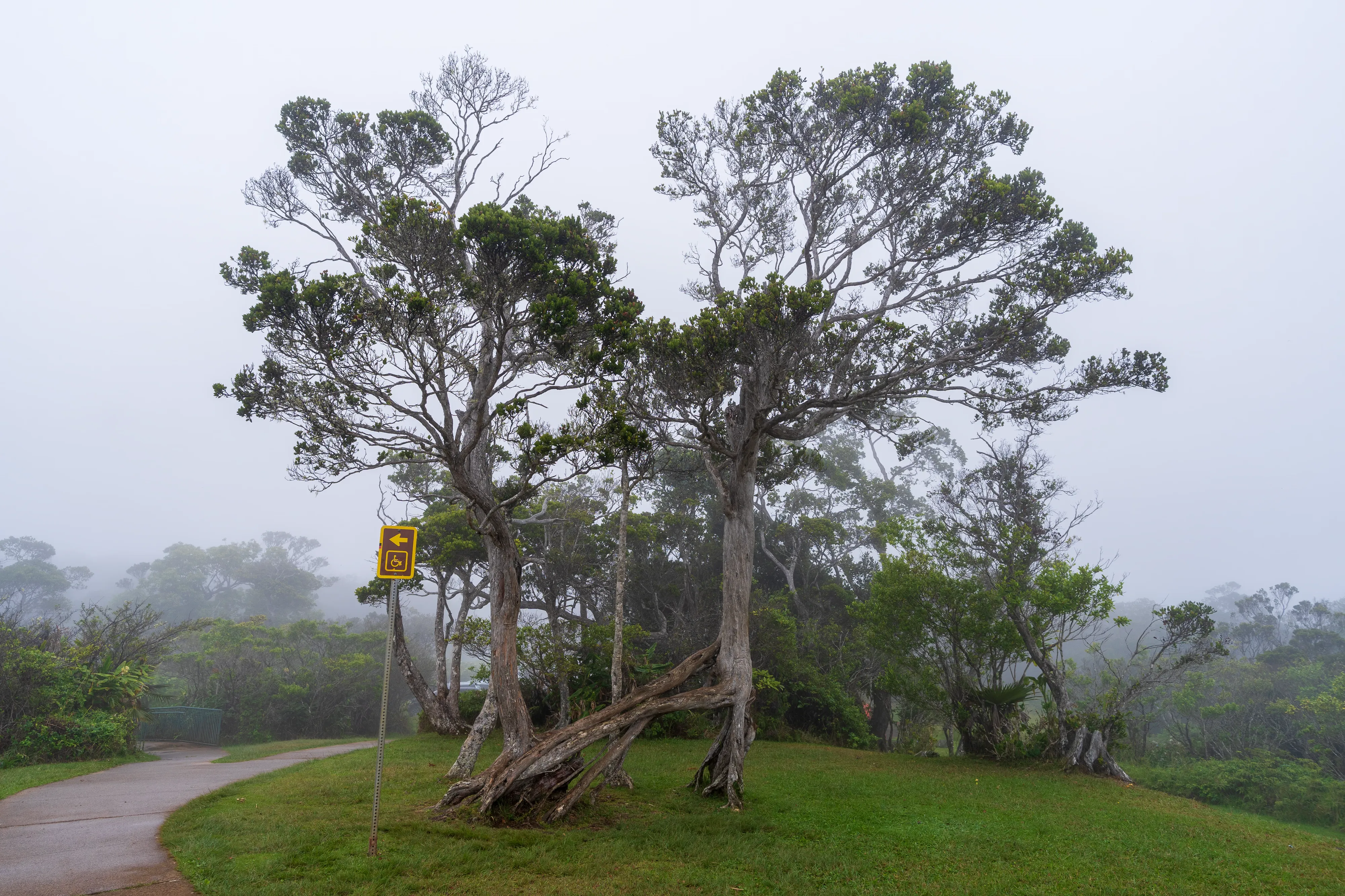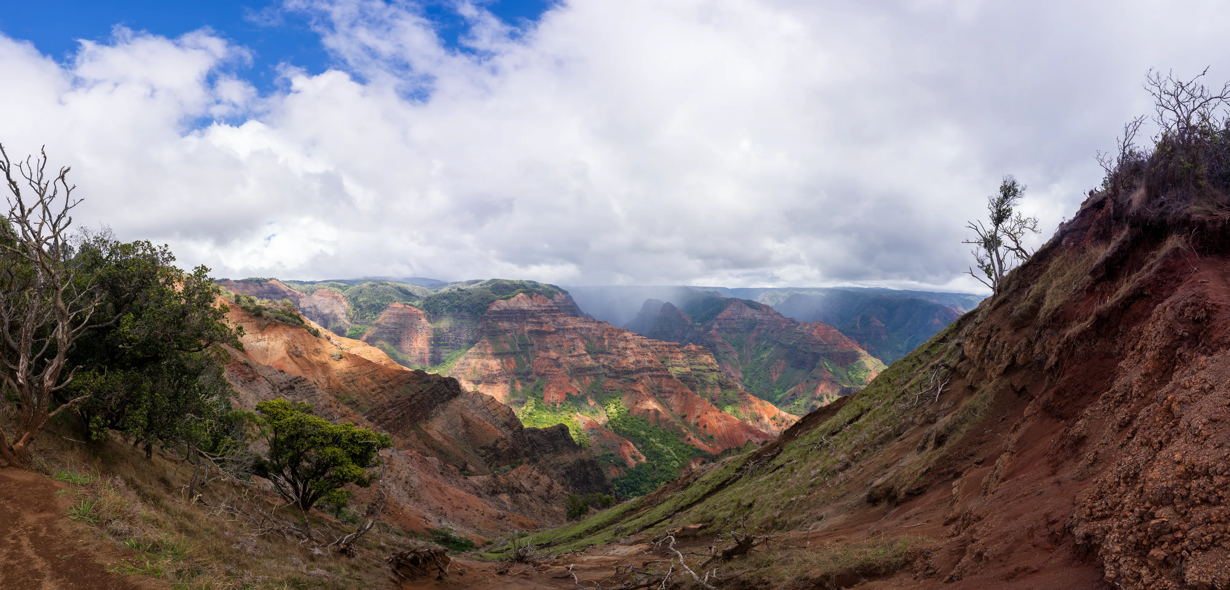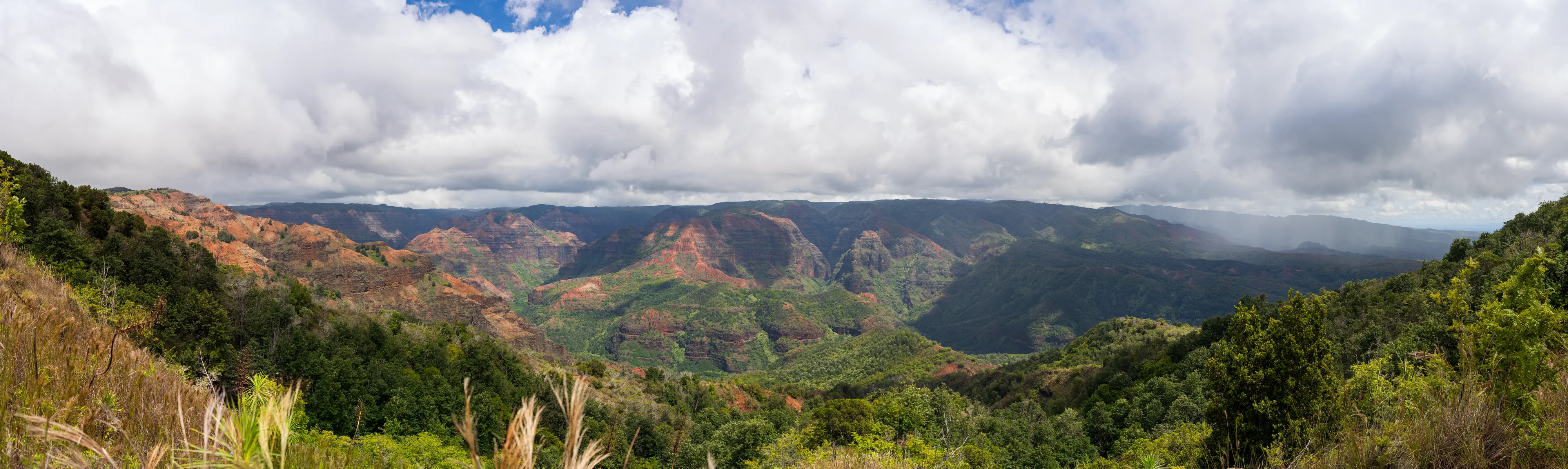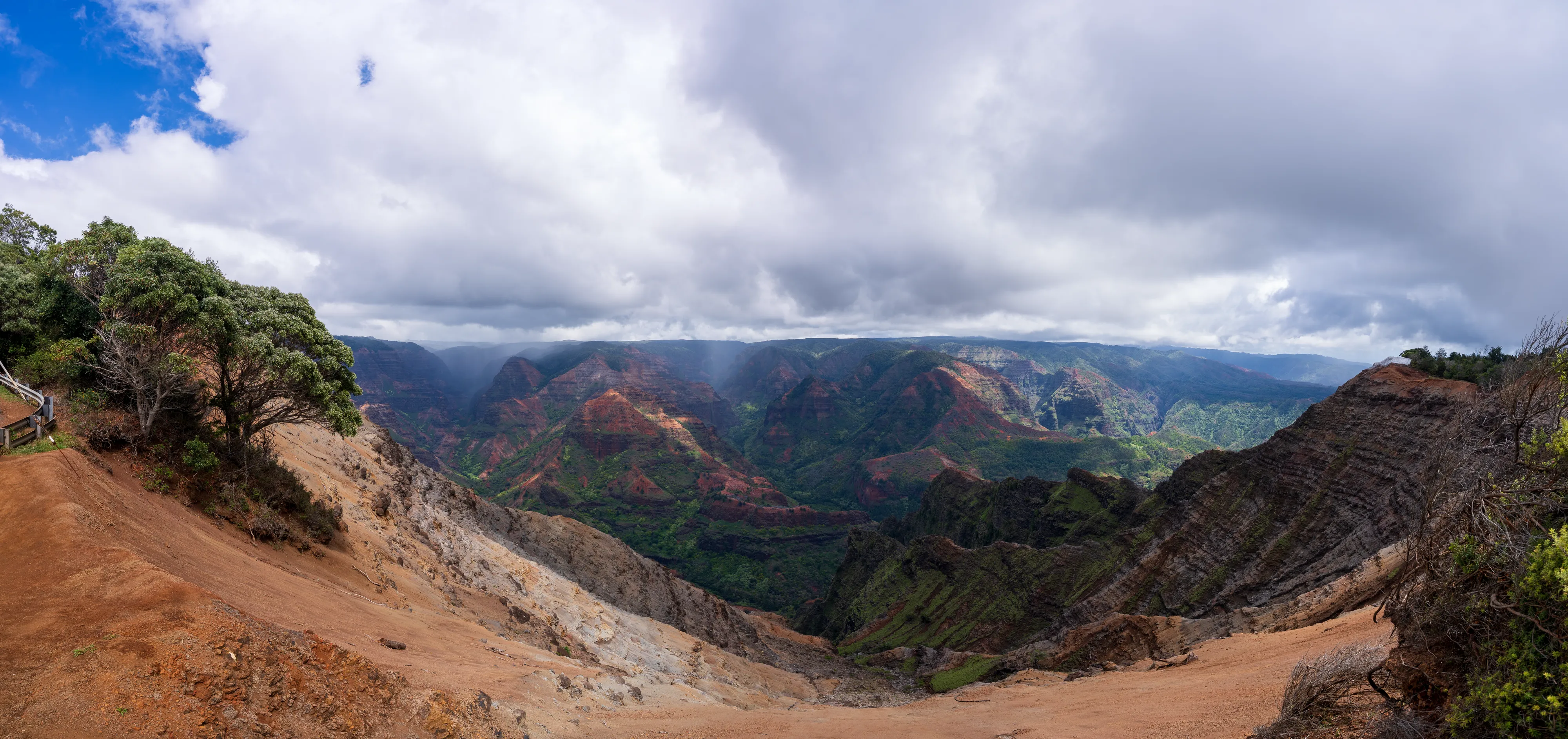 Am nächsten Morgen fahren wir zum Waimea Canyon bzw. auf den ihn umgebenden, auf gut 1000 m gelegenen, Rand, welcher Teil des gleichnamigen State Parks ist. Man nennt ihn auch den “Grand Canyon des Pazifiks” - und das passt durchaus. Hier finden sich tolle Ausblicke auf Schluchten mit mehrfarbigen Hängen. Leider wird das Wetter immer schlechter, sodass wir am Ende der Straße beim Kalalau Lookout im Koke’e State Park nur noch eine weiße Wand sehen - anstatt des südlichen Endes der Na Pali Coast. Zusätzlich regnet es immer wieder - aber irgendwoher muss das viele Grün auf Kaua’i schließlich ja auch kommen.