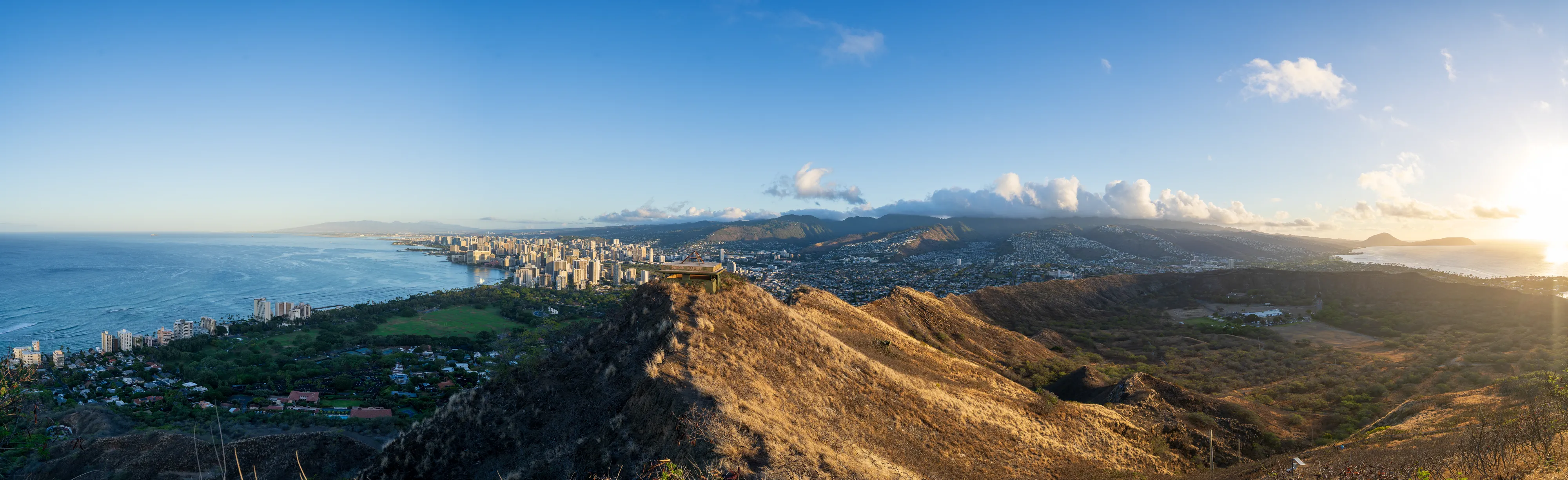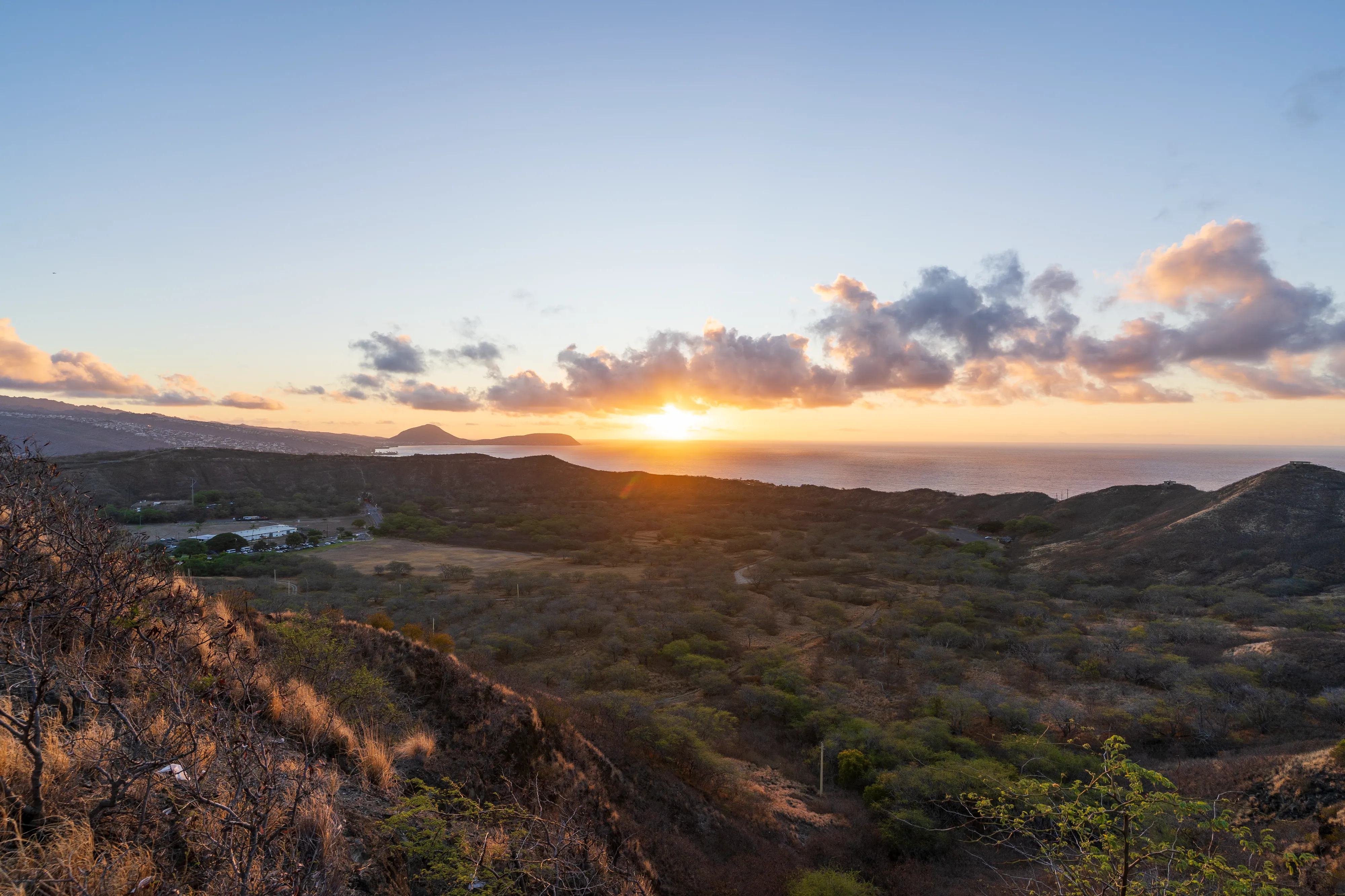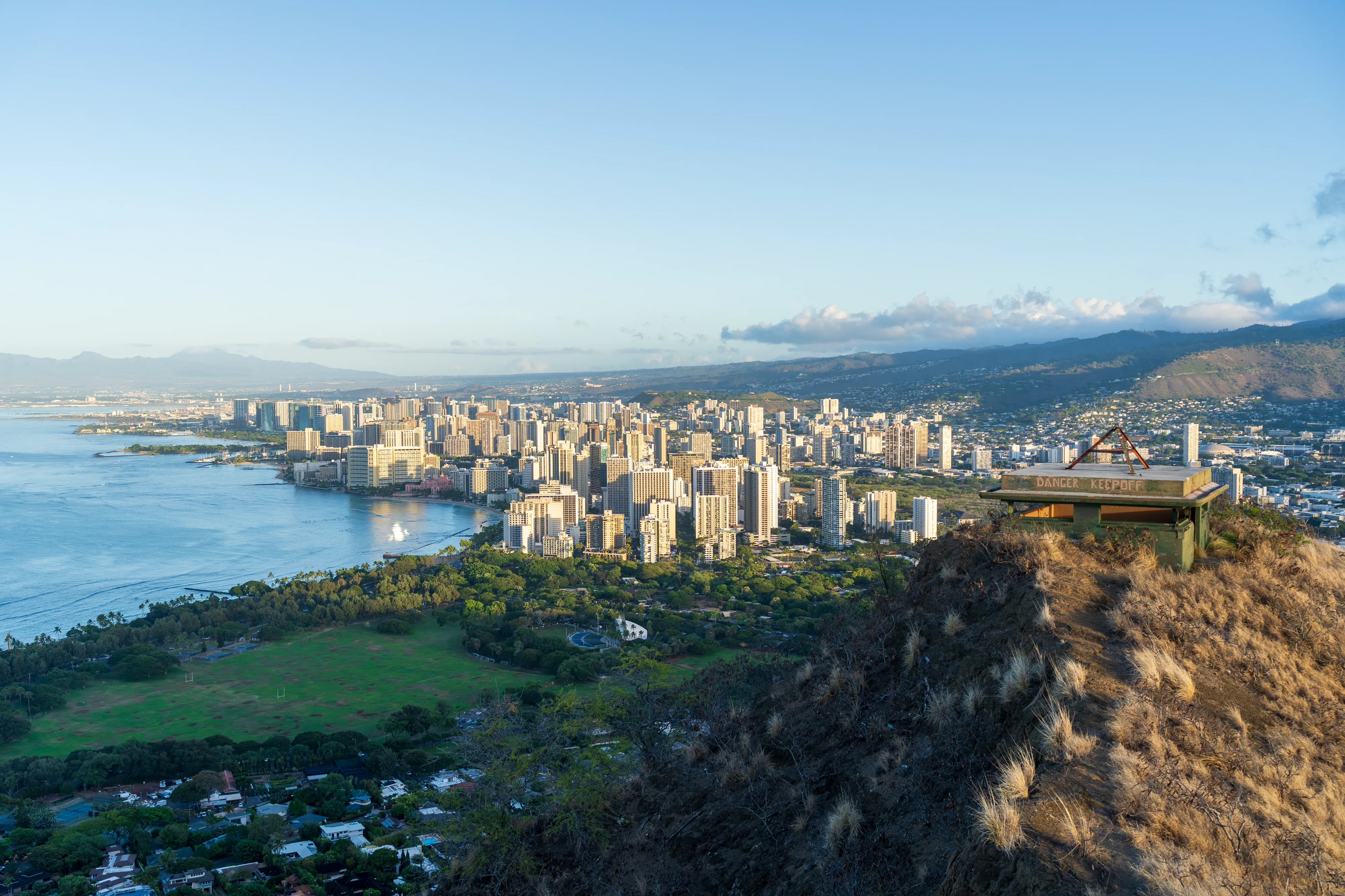 Zurück im Süden der Insel checken wir in unserer Unterkunft in Waikīkī ein - ganz in der Nähe des weltberühmten Waikīkī-Beach. Der nächste Morgen beginnt für uns bereits gegen 5 Uhr, denn wir wollen zum Sonnenaufgang am Diamond Head State Park bzw. einem der Aussichtspunkte sein. Der Diamond Head ist ein aus Tuffstein bestehender Ring um einen Vulkankrater, ein Wahrzeichen Honolulus und heute ein State Park. Seit Anfang des 20ten Jahrhunderts wurde er zu militärischen Zwecken genutzt und es wurden Wege, Bunker und Tunnel gebaut. Mittlerweile werden diese allerdings nur noch von Touristen genutzt - denn die Bunkeranlagen können Teils betreten werden. Von dort aus hat man einen schönen Blick auf die Skyline von Honolulu im aufgehenden Licht der Sonne. Dafür muss man dann eben im Dunkeln aufstehen.