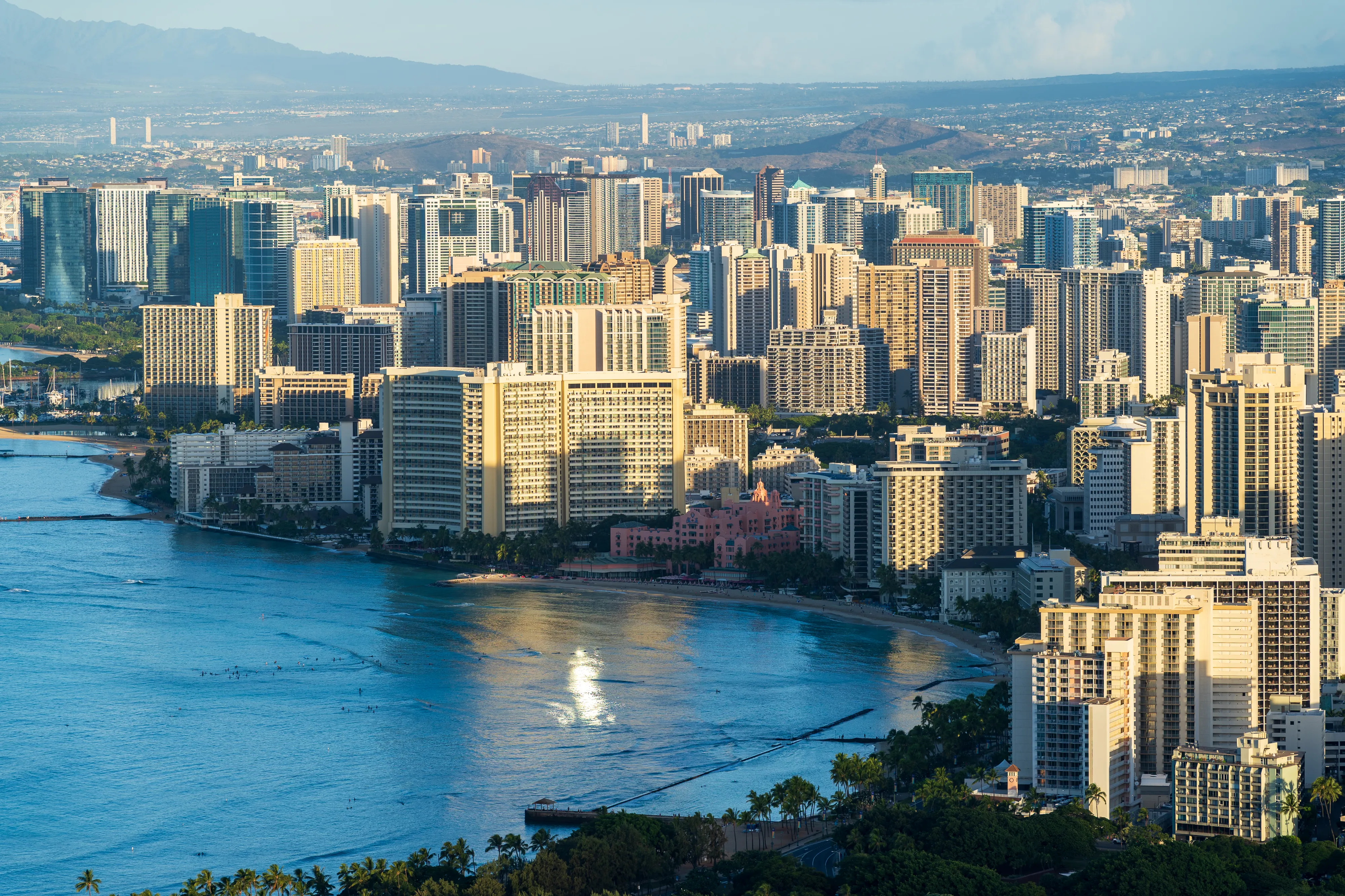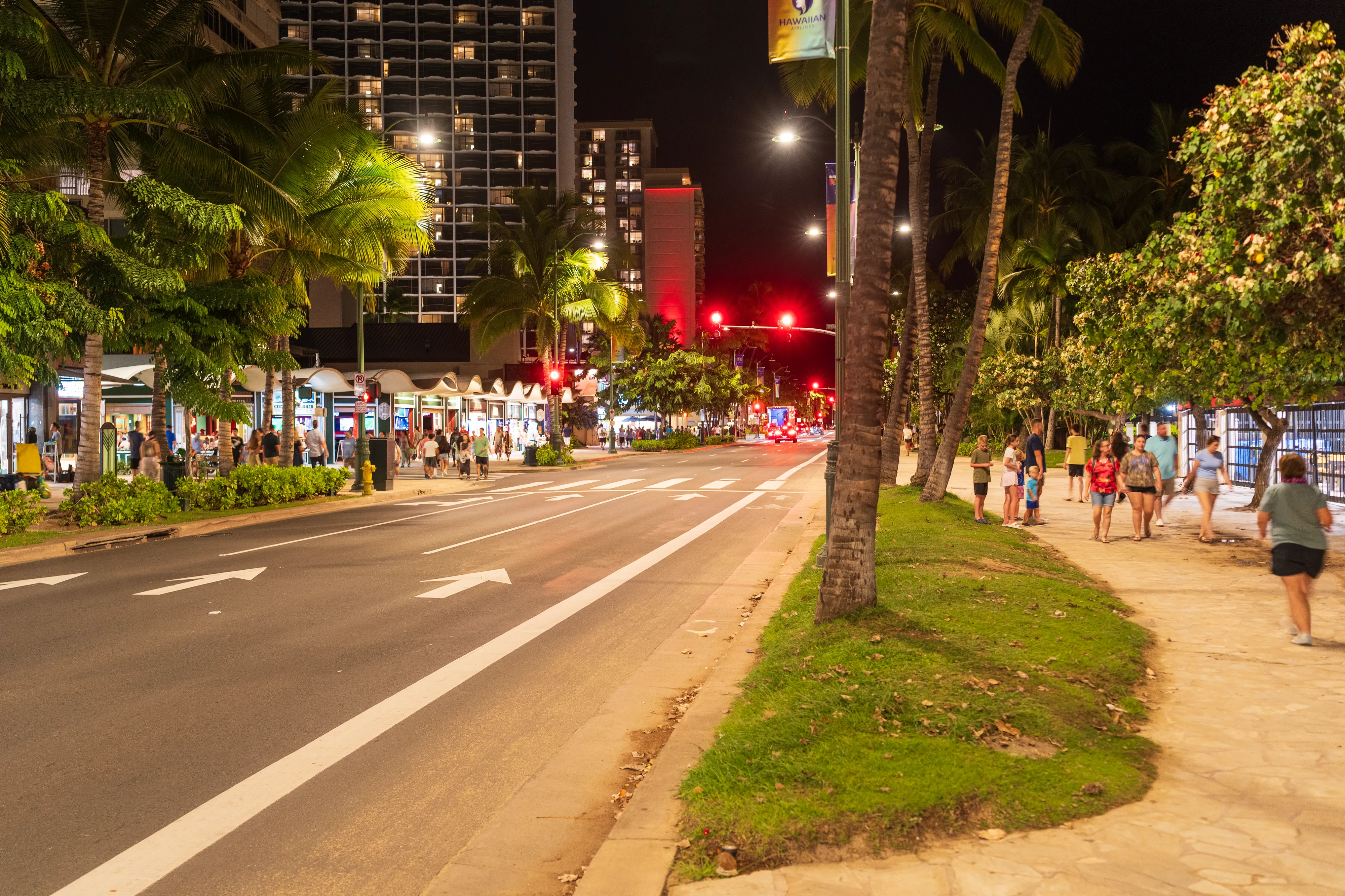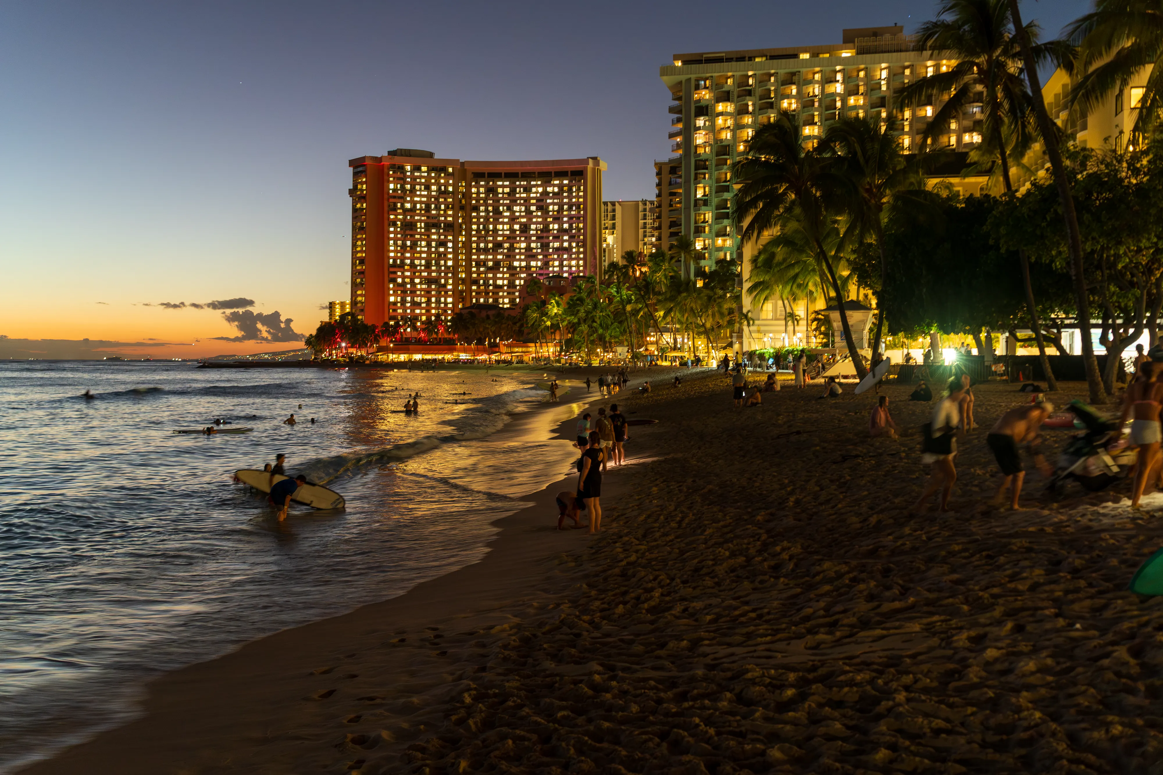 Abends erreichen wir wieder das berühmte Waikīkī. Entlang der von Palmen gesäumten Prachtstraße reihen sich namhafte Hotels aneinander und flanieren allerlei Menschen. Während die Sonne untergeht landen die letzten Surfer am Stadtstrand an, reinigen ihre Ausrüstung und packen ein.