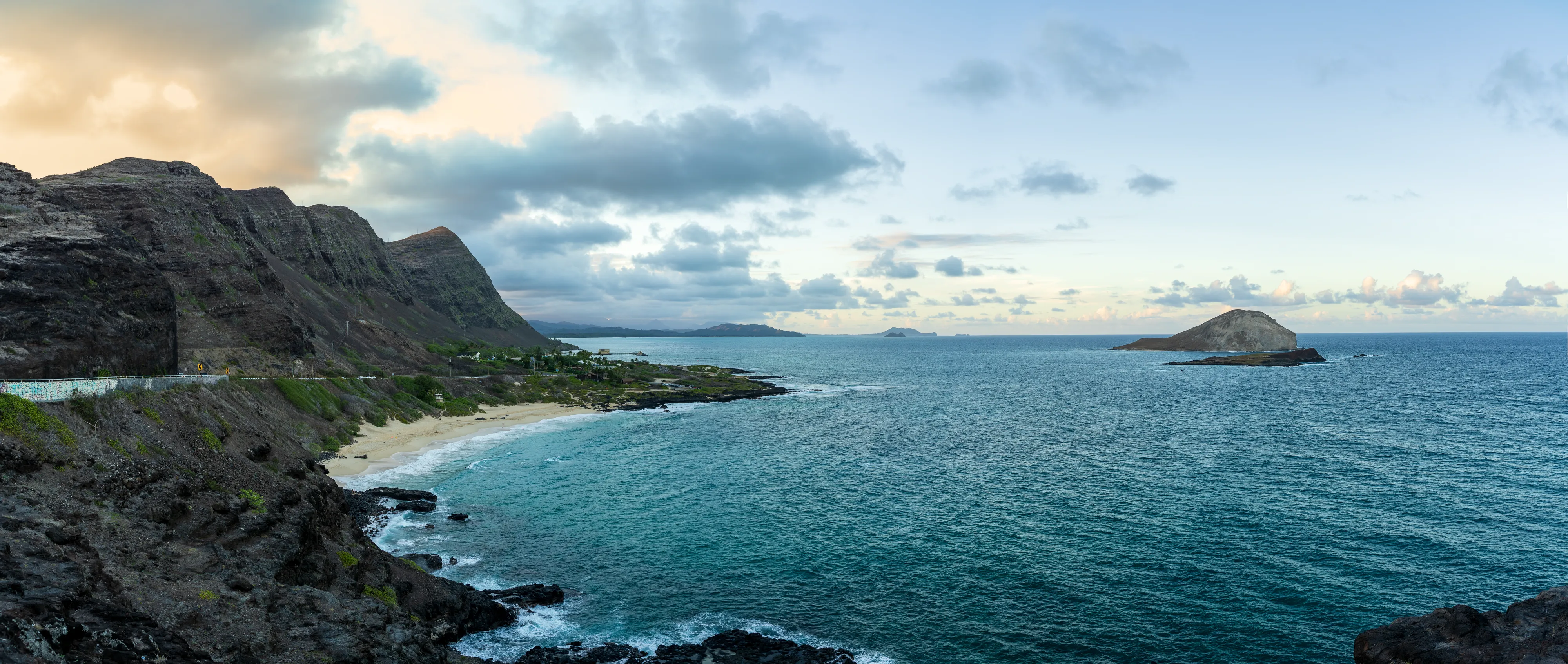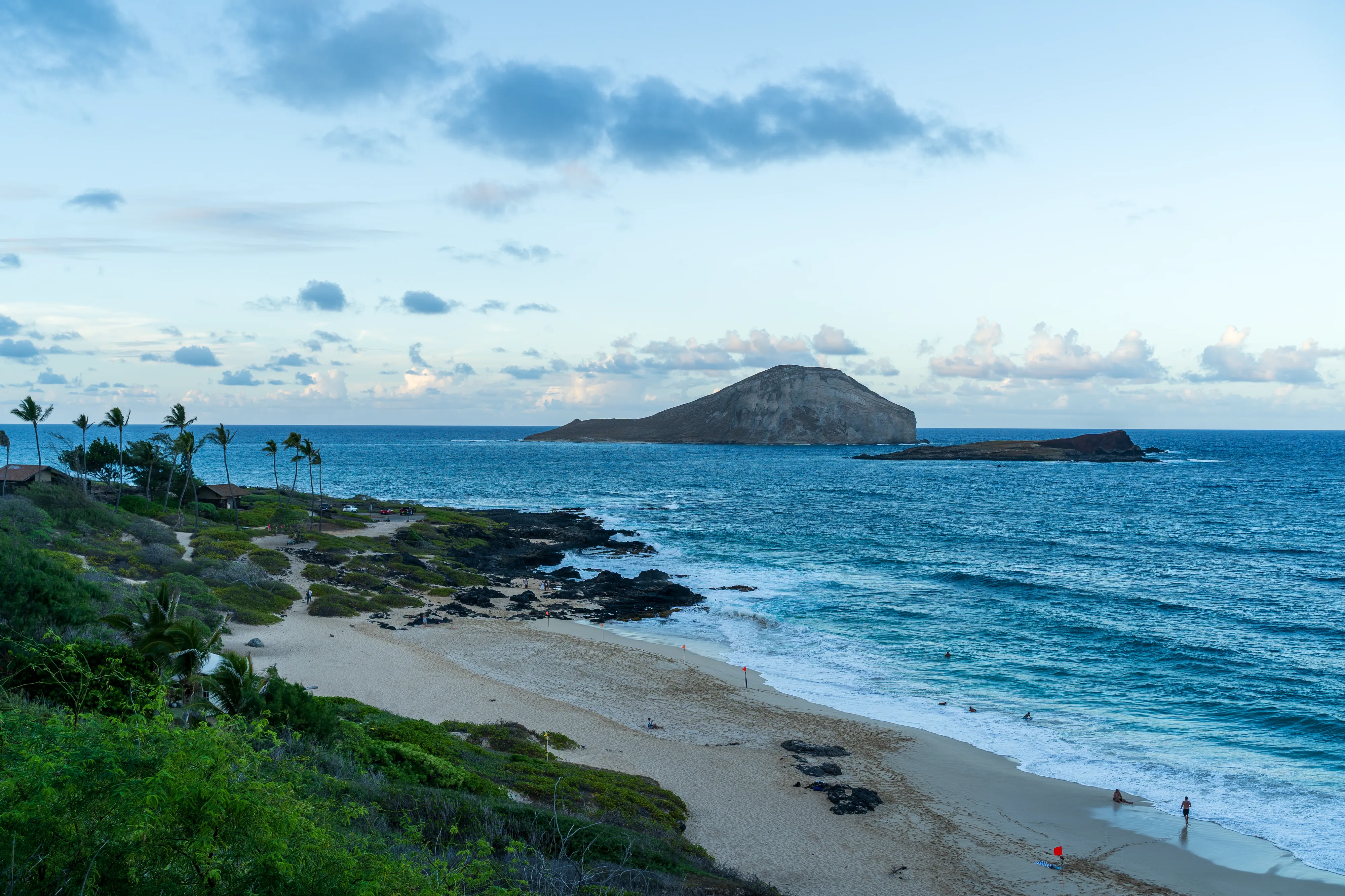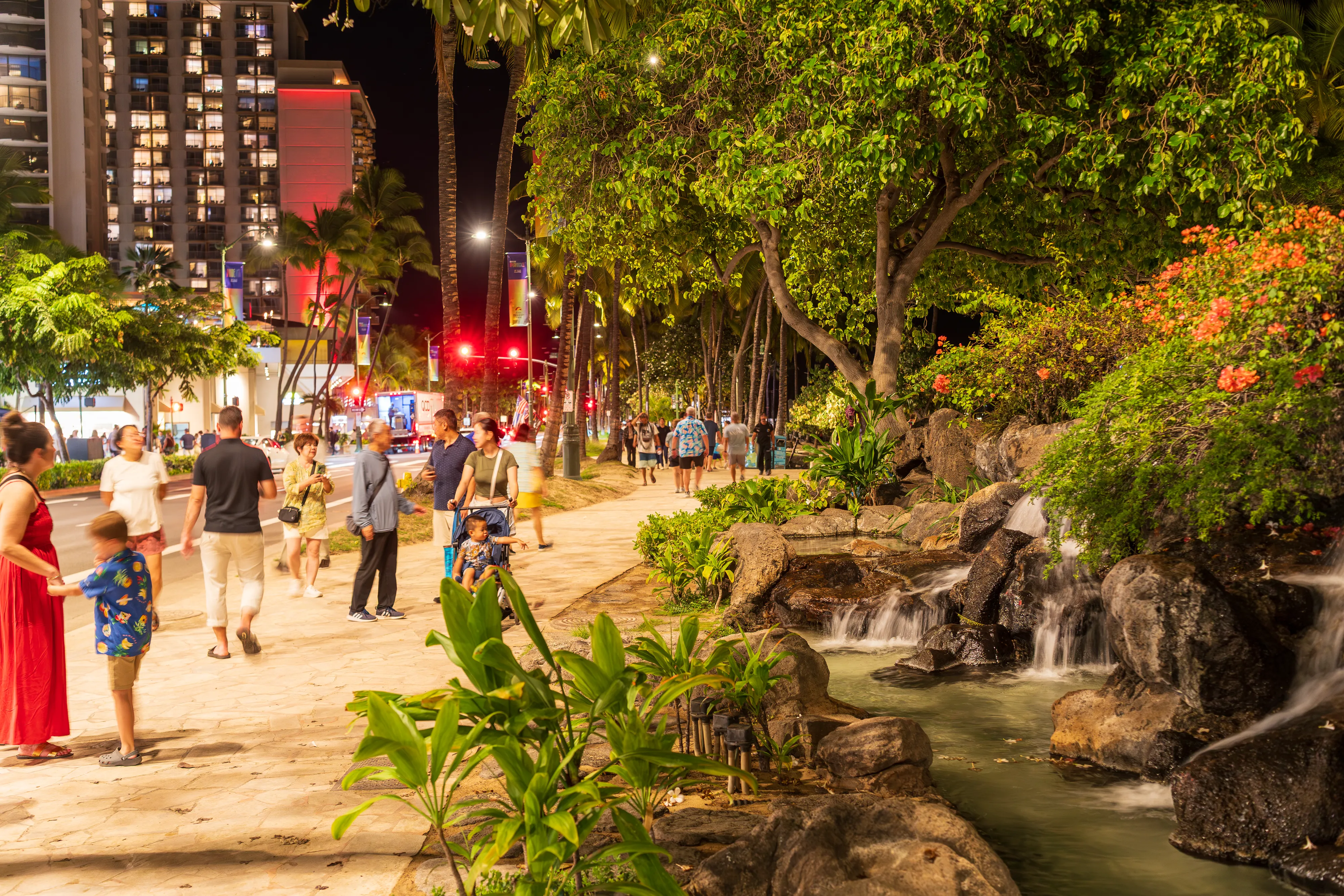 Abends erreichen wir wieder das berühmte Waikīkī. Entlang der von Palmen gesäumten Prachtstraße reihen sich namhafte Hotels aneinander und flanieren allerlei Menschen. Während die Sonne untergeht landen die letzten Surfer am Stadtstrand an, reinigen ihre Ausrüstung und packen ein.