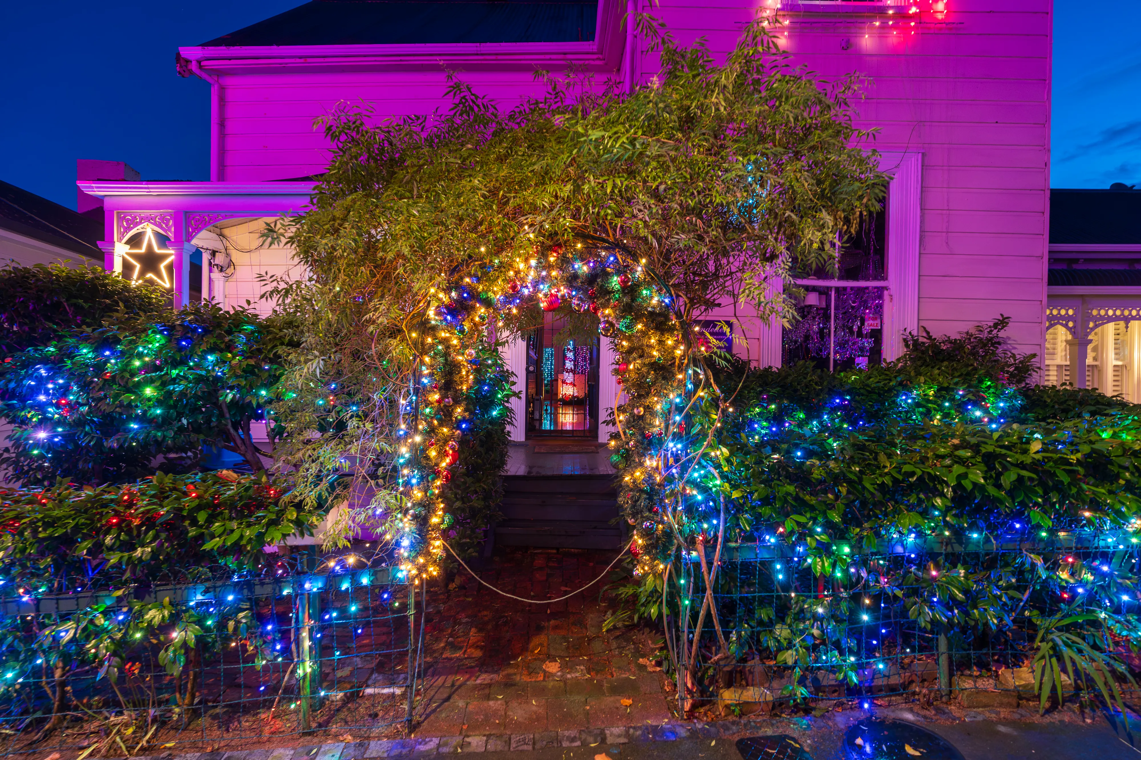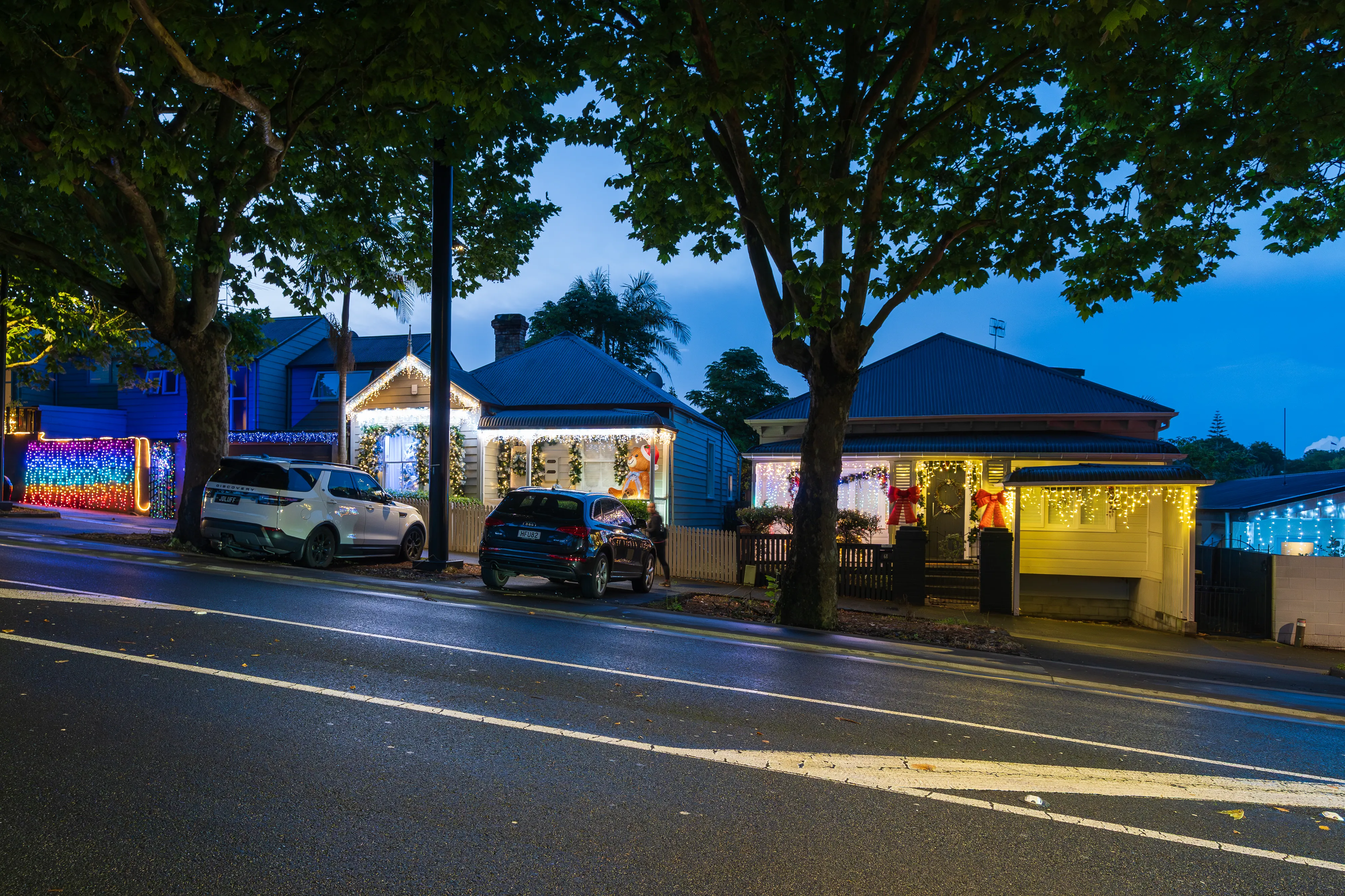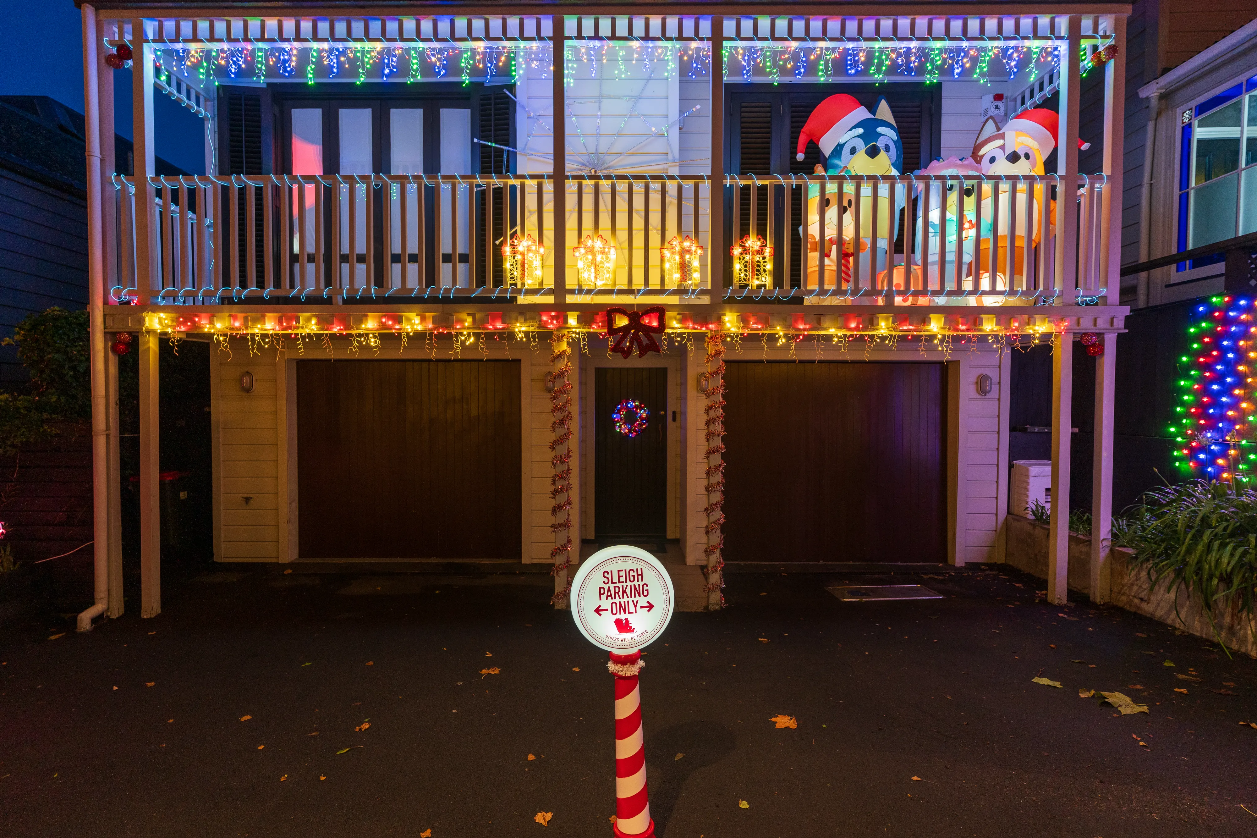 Abends geht es nach dem Essen noch in die Franklin Rd, wo sich allerlei ausgefallene Weihnachtsdekorationen finden lassen. Es erstaunt uns immer wieder, dass Weihnachten hier und auch in Australien genauso wie bei uns - womöglich sogar noch mehr - mit Schnee, einem dickeingepackten Weihnachtsmann sowie am Polarkreis lebenden Rentieren assoziiert wird, wo das Fest hier doch mitten im Sommer liegt und die meisten Gegenden 20 - 30 ºC von Schnee entfernt sind.