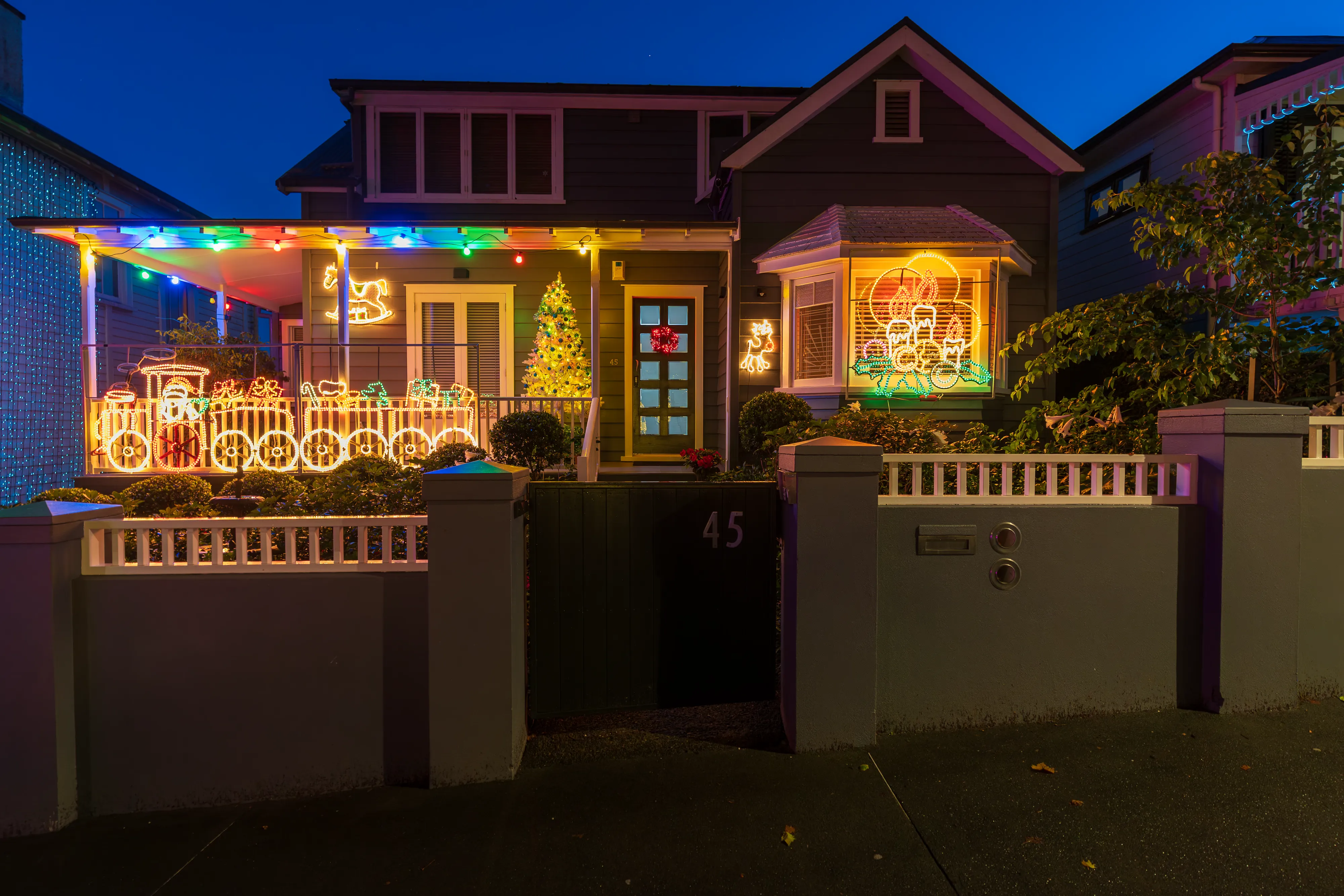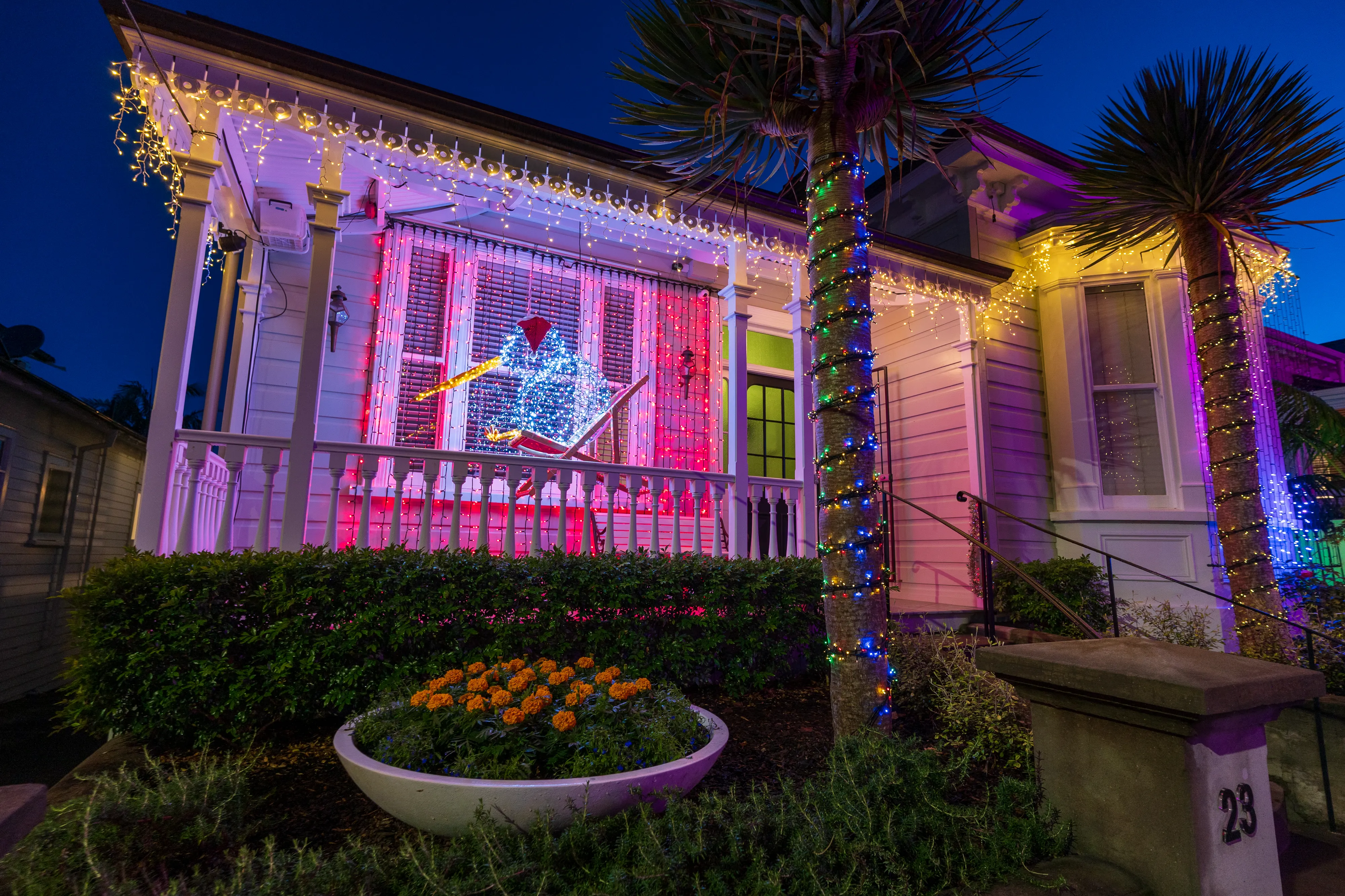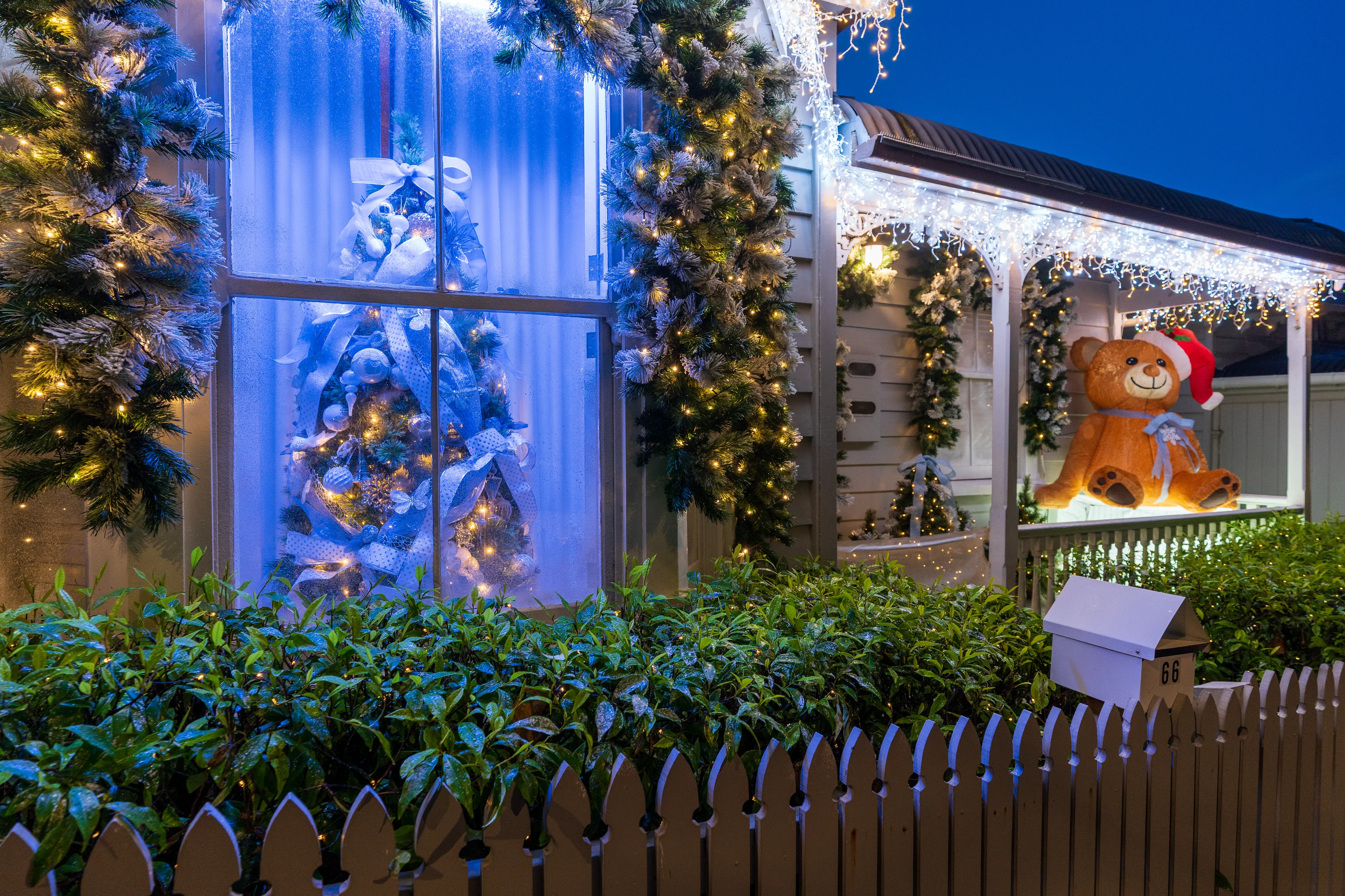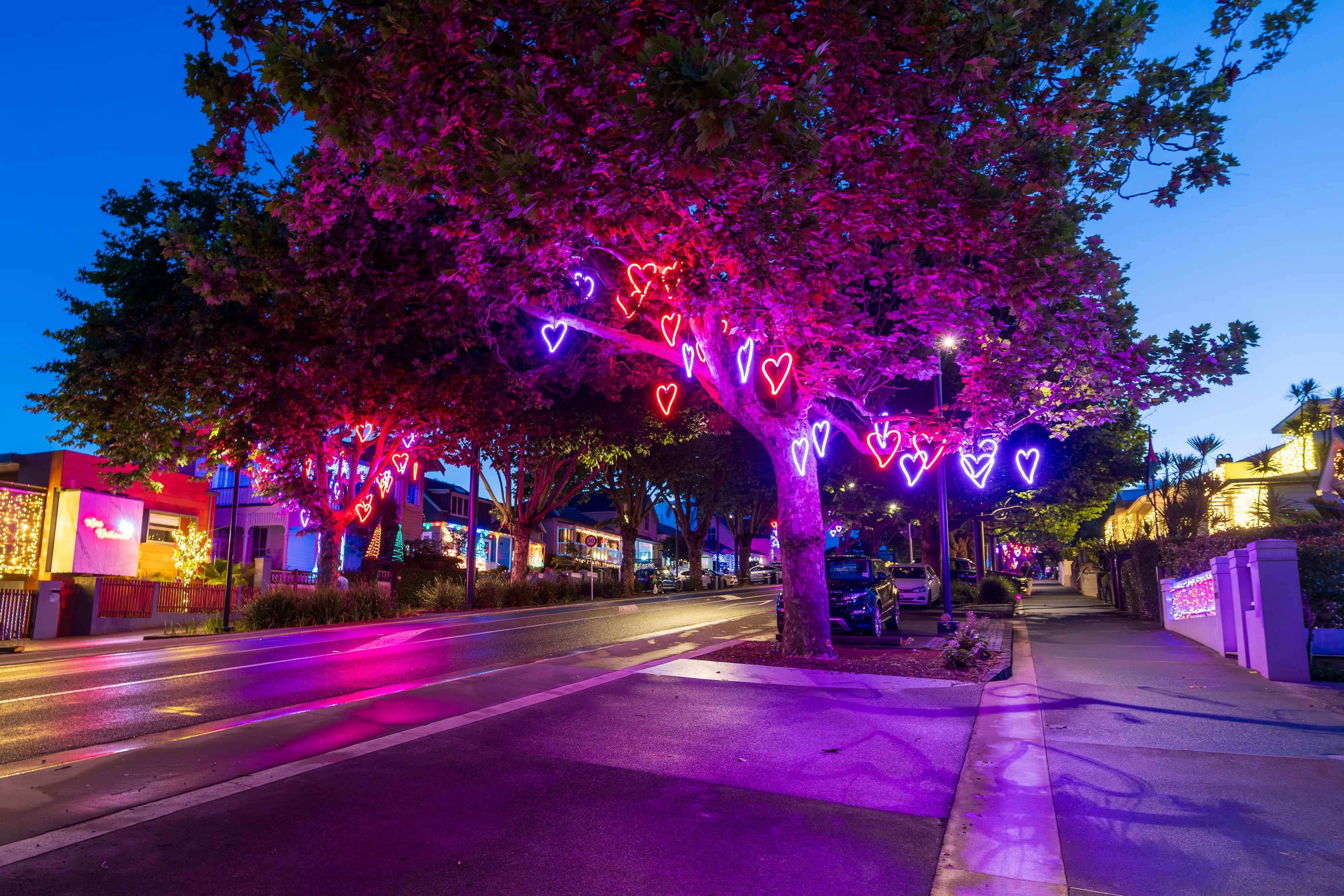 Abends geht es nach dem Essen noch in die Franklin Rd, wo sich allerlei ausgefallene Weihnachtsdekorationen finden lassen. Es erstaunt uns immer wieder, dass Weihnachten hier und auch in Australien genauso wie bei uns - womöglich sogar noch mehr - mit Schnee, einem dickeingepackten Weihnachtsmann sowie am Polarkreis lebenden Rentieren assoziiert wird, wo das Fest hier doch mitten im Sommer liegt und die meisten Gegenden 20 - 30 ºC von Schnee entfernt sind.
