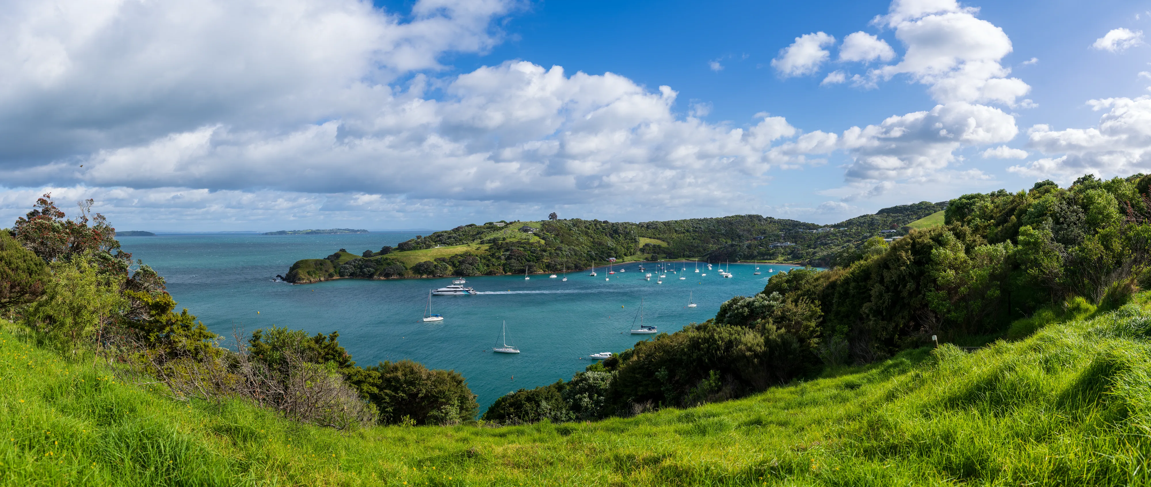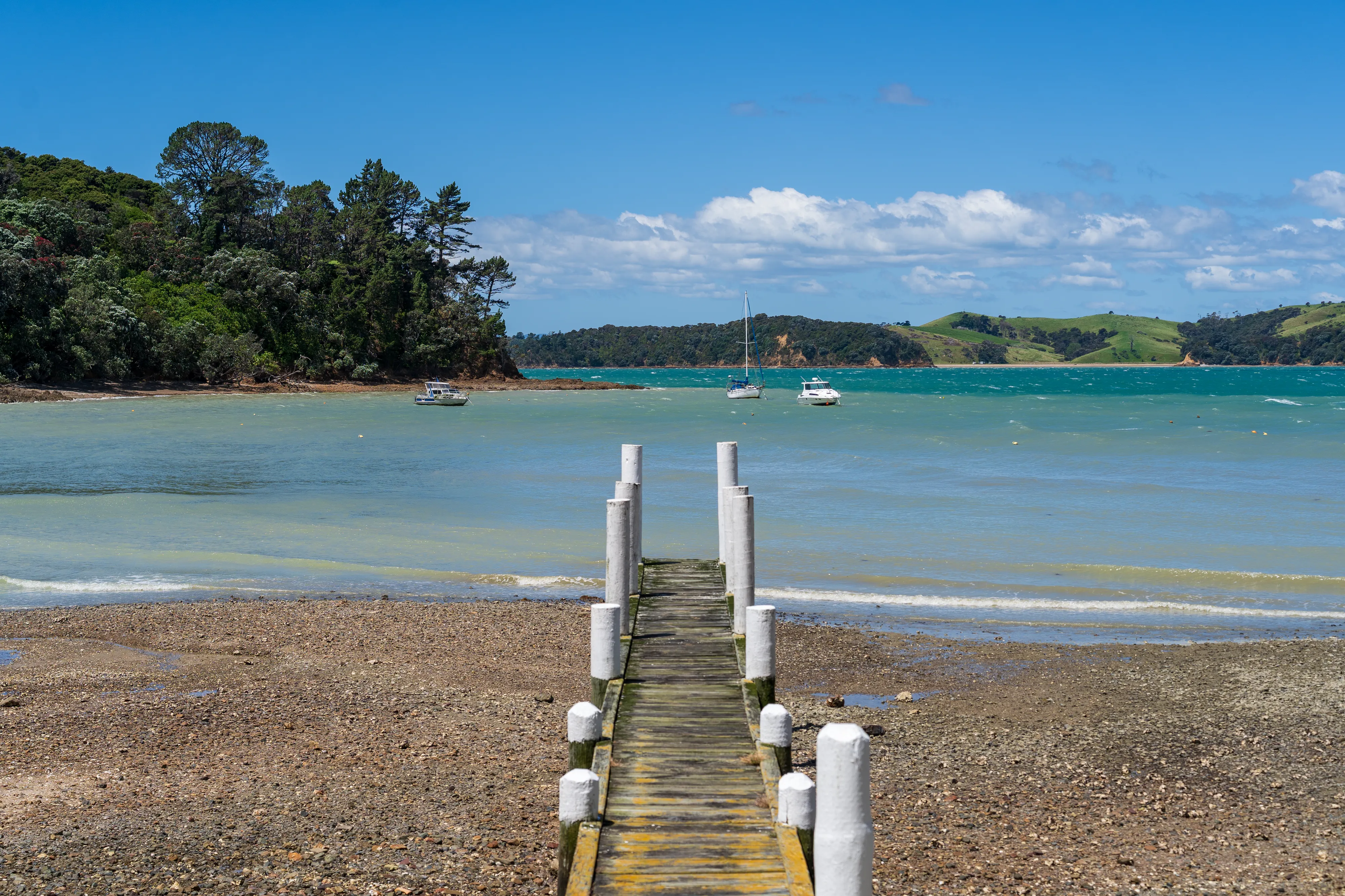 Der nächste Morgen beginnt früh mit einer Fährfahrt, denn wir wollen den Tag auf Waiheke Island verbringen. Waiheke Island ist die zweitgrößte Insel im vor Auckland gelegenen Hauraki Gulf und hat etwa 8700 Einwohner. Sie ist insbesondere für ihre vielen Weingüter bekannt und dementsprechend gibt es viele Tagesausflügler, die für Weinproben übersetzen. Es gibt sogar extra Reisebusse, die die Menschen an der Fähre abholen und von Weingut zu Weingut bringen.