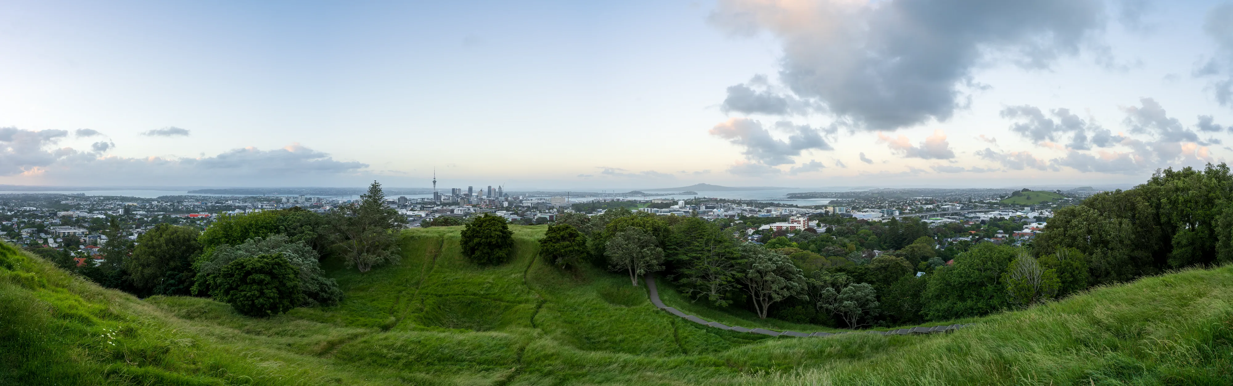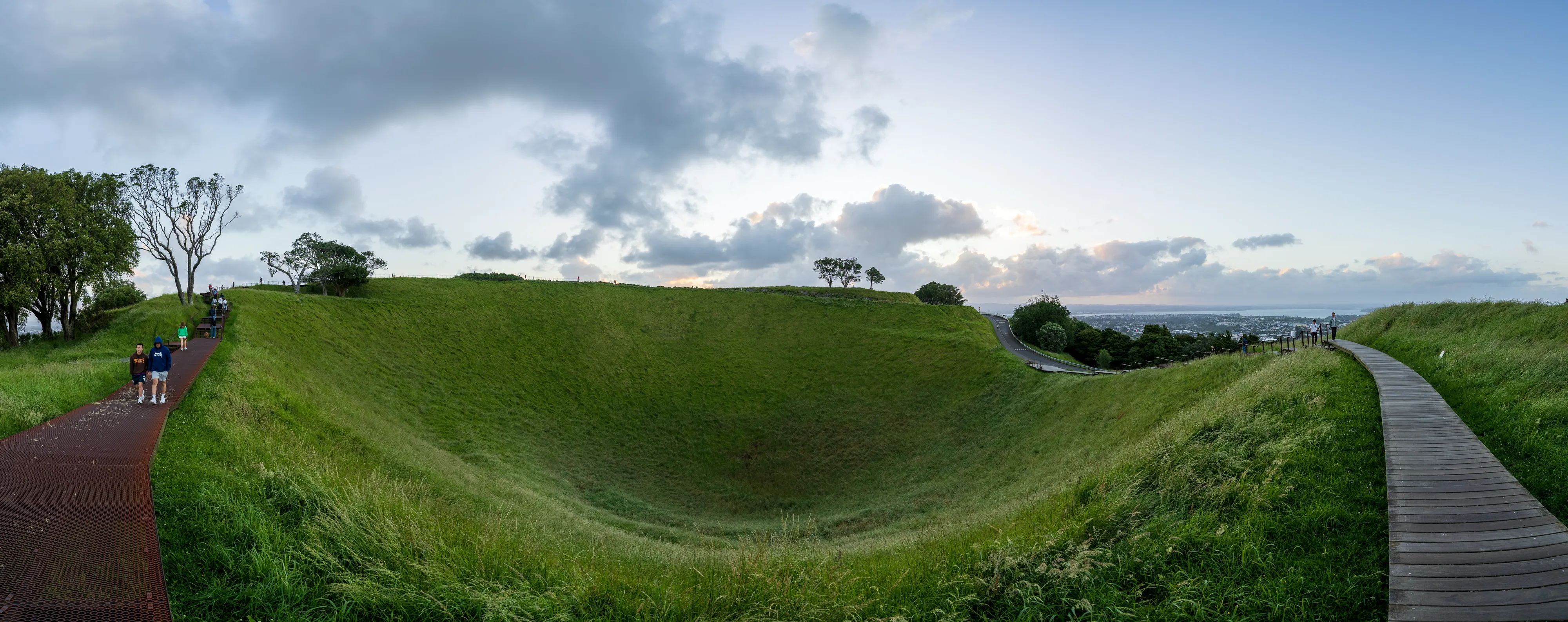 Wir geben unseren Mietwagen ab und fahren mit der Fähre zurück nach Auckland. Wieder auf dem Festland - streng genommen ja lediglich der größeren Insel - nehmen wir einen Bus Richtung Mt. Eden. Aucklands berühmtester Vulkankegel ist mit 146 m über dem Meeresspiegel der höchste natürliche Punkt der Stadt und von hier aus kann man - so das Wetter mitspielt - einen tollen Sonnenuntergang bei gleichzeitigem Rundumblick auf die Stadt genießen.
