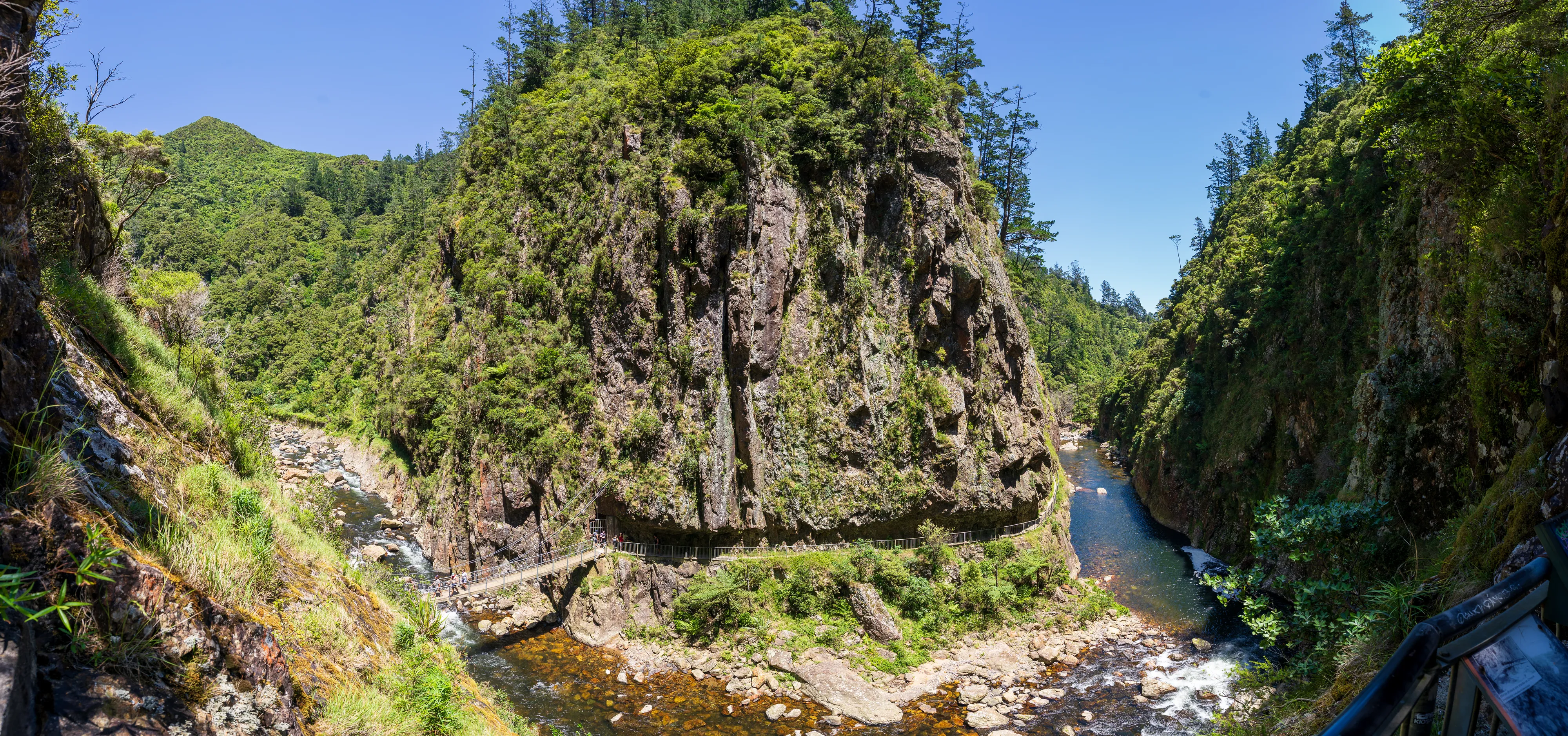 Am nächsten Morgen fahren wir zur Karangahake Gorge, wo sich früher mehrere Goldbergwerke befunden haben. Heute können die alten Stollen, Tunnel und Schienenwege als Fußgänger genutzt werden. Ziemlich cool, dass man einfach so durch Teile eines alten Stollens laufen darf. Der Windows Walk führt uns über alte Bergwerksgleise durch Tunnel und endet an einer Hängebrücke, die die Schlucht bzw. das darin fließende Flüsschen überspannt. Einige Wege sind leider gesperrt, dennoch ein lohnenswerter Abstecher.