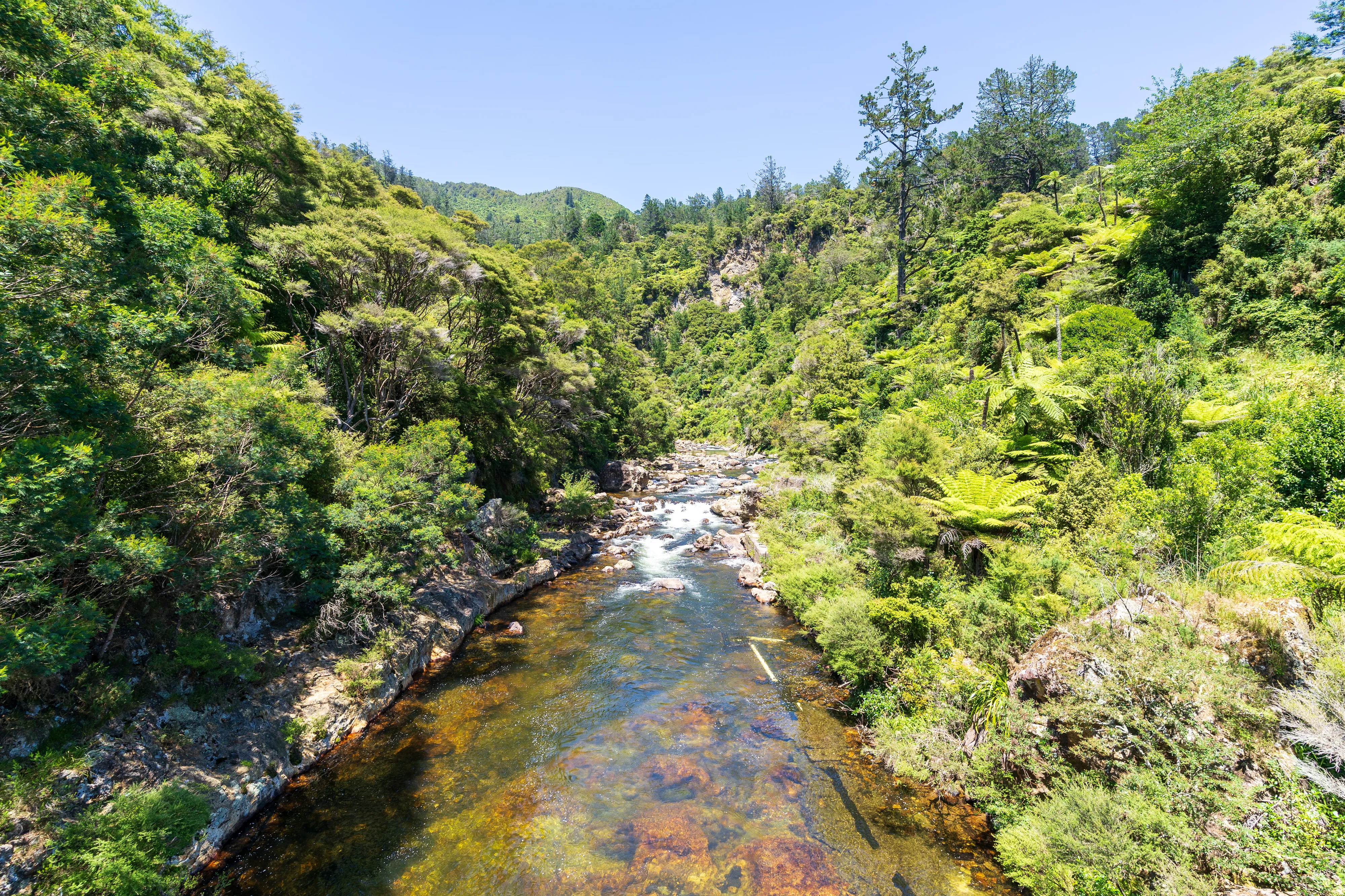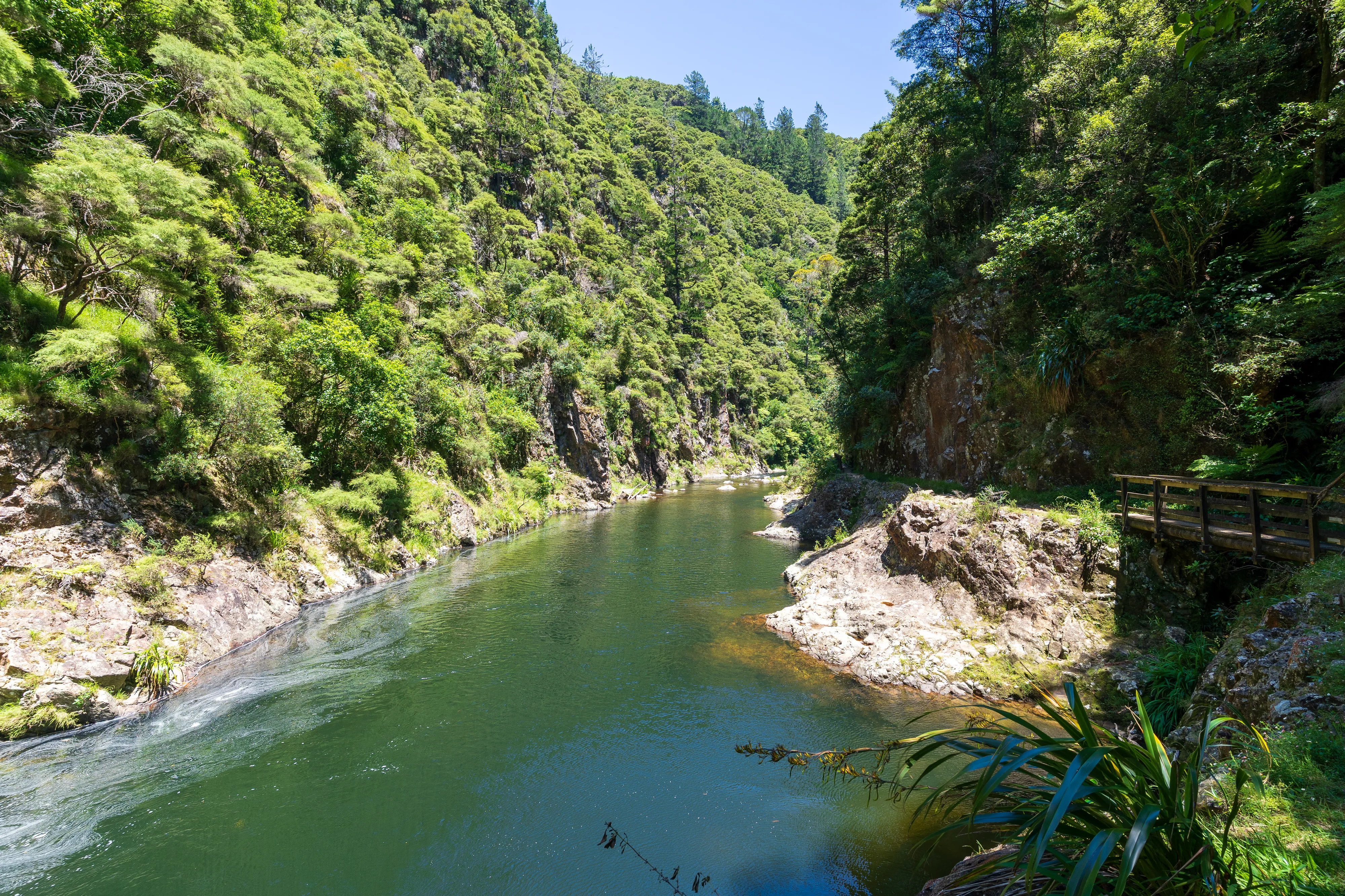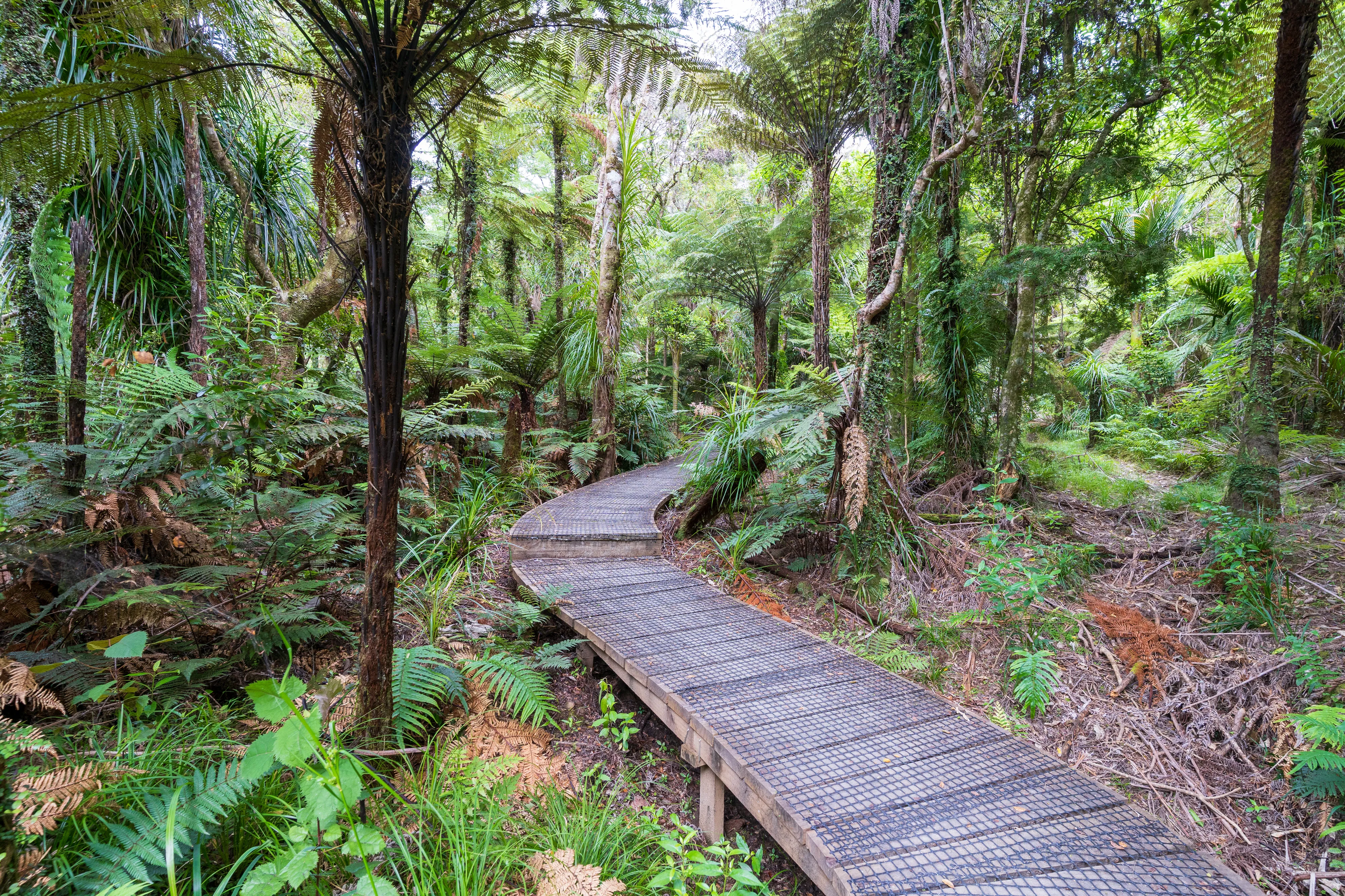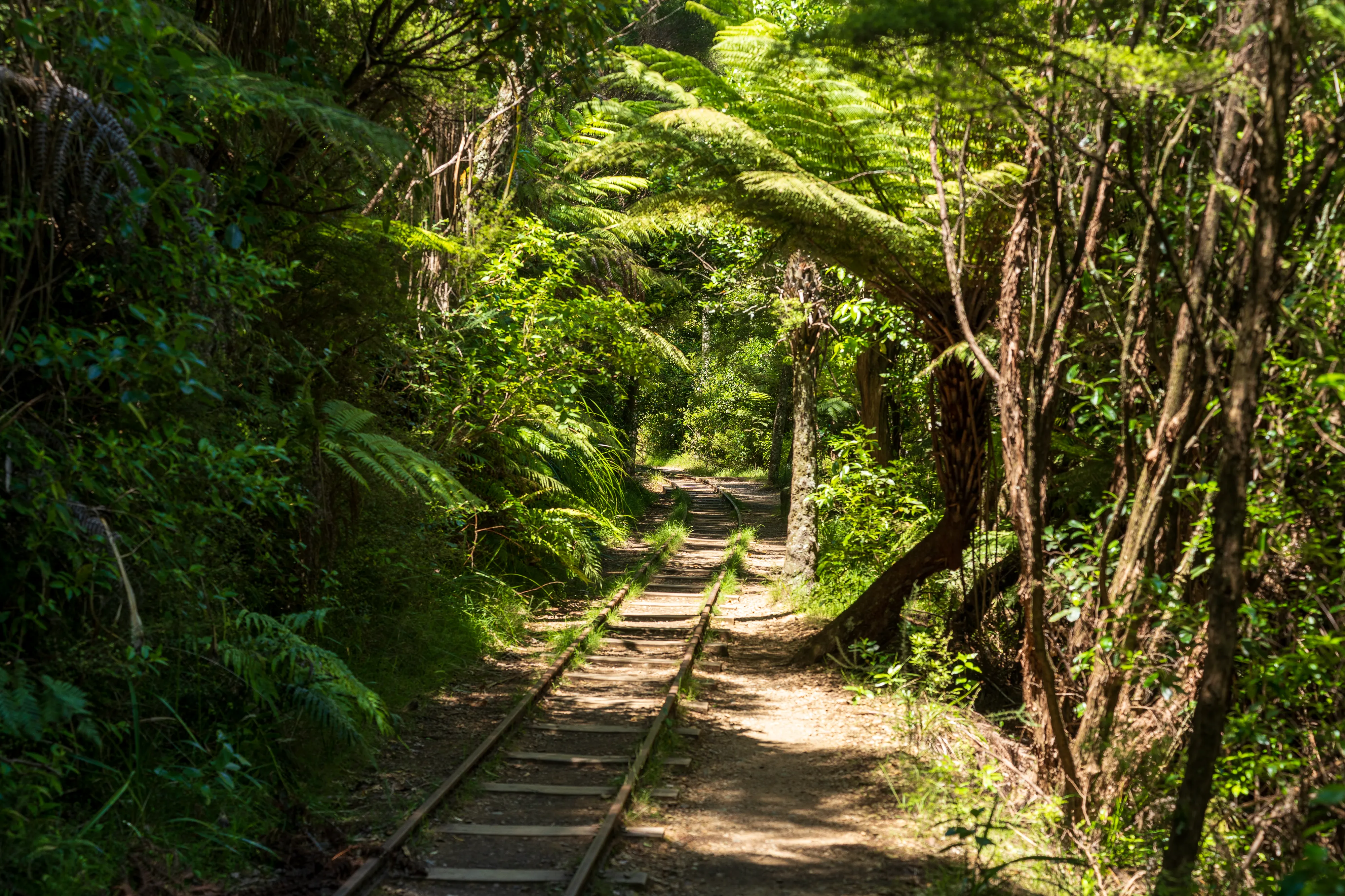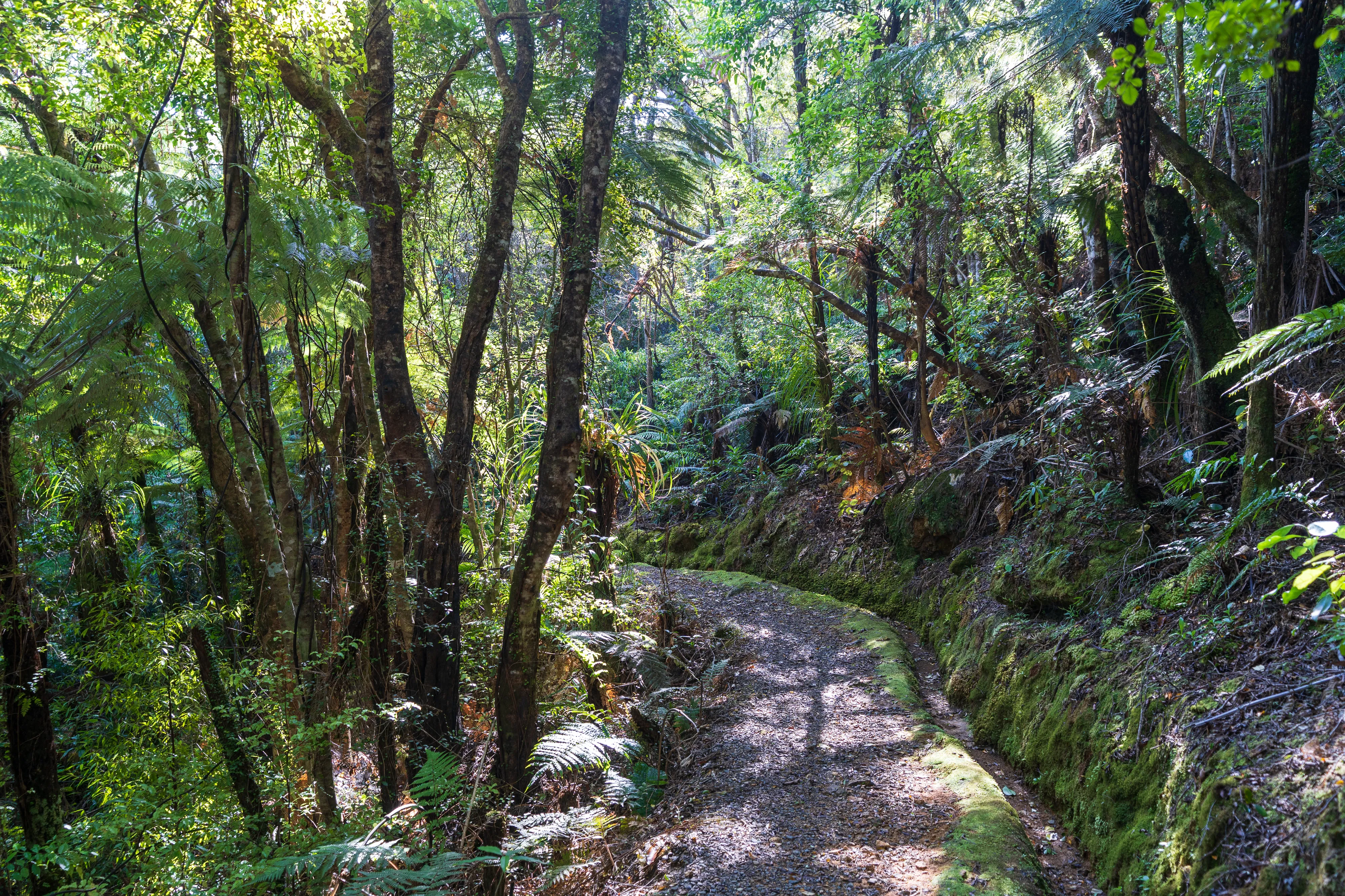Am Ende der Schotterstraße laufen wir noch zu Billy Goat Landing, wo sich neben Wasserfällen auch Informationen zur Geschichte des Tals finden: Bis in die 1940er Jahre wurden hier Kauribäume abgeholzt. Da diese jedoch oben auf dem Bergrücken gewachsen waren, es steil ins Tal geht und zu viele Stämme beim einfachen Hinabwerfen zerbarsten, musste eine Technik her, um die Stämme heil ins Tal zu bekommen. Man entschied sich für eine Kombination aus Wasserwegen mit Dämmen und Schienenwägen.