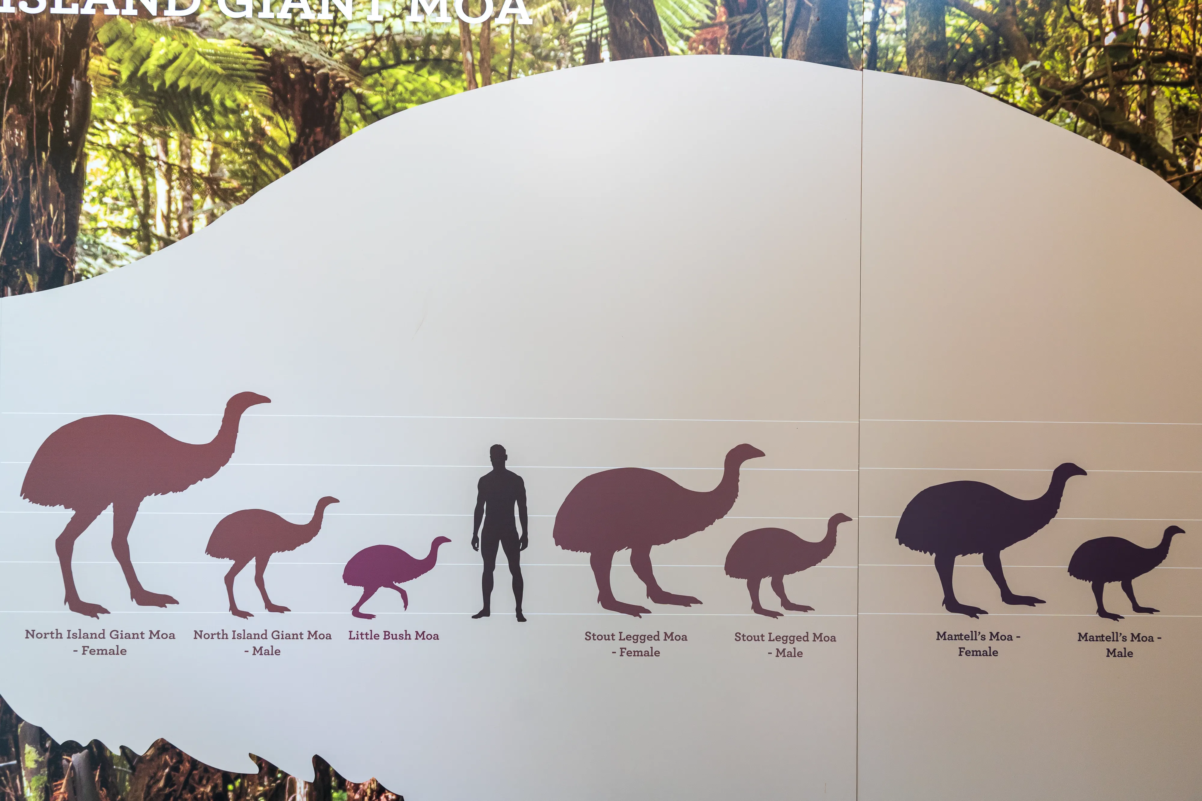 Am nächsten Morgen lernen wir im Besucherzentrum noch etwas über Moas - eine Familie von Laufvögeln, deren größte Exemplare (der North Island Giant Moa; allerdings nur die Weibchen, Männchen waren kaum halb so groß) eine enorme Höhe (mit nach oben gerecktem Kopf) von bis zu 3 Metern erreichten und geschätzt bis zu 250 kg auf die Waage gebracht hätten. Hätten, da die lediglich in Neuseeland heimischen Moas allesamt um das 15te Jahrhundert herum ausgestorben sind, also circa 200 Jahre nachdem die ersten Menschen das heutige Neuseeland besiedelten. Ob direkt durch Jagd, Plündern der Nester oder durch einen eingeschränkten Lebensraum ist bis heute nicht ganz klar - da man jedoch Knochen von Moas zusammen mit Überresten früher Siedlungen gefunden hat, geht man von ersterem aus. Dabei hatten es die Jäger wohl recht einfach: Da die Moas außer dem Haastadler - dem mit bis 3 Metern Spannweite wohl größten Greifvogel der Neuzeit, welcher kurz nach dem Moa ausstarb - keine natürlichen Feinde hatten, hatten sie mutmaßlich auch kein Fluch- und Abwehrverhalten erlernt.