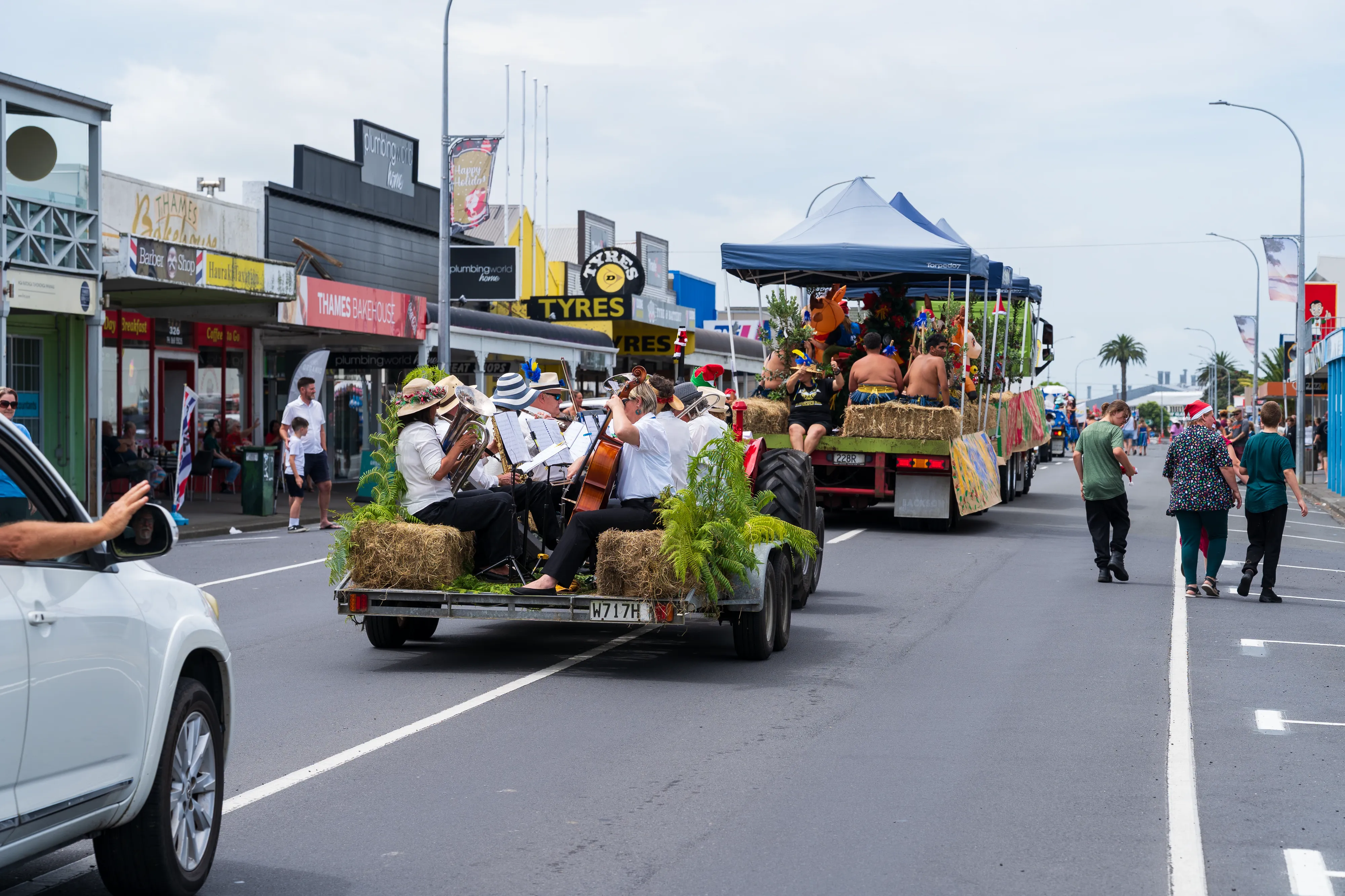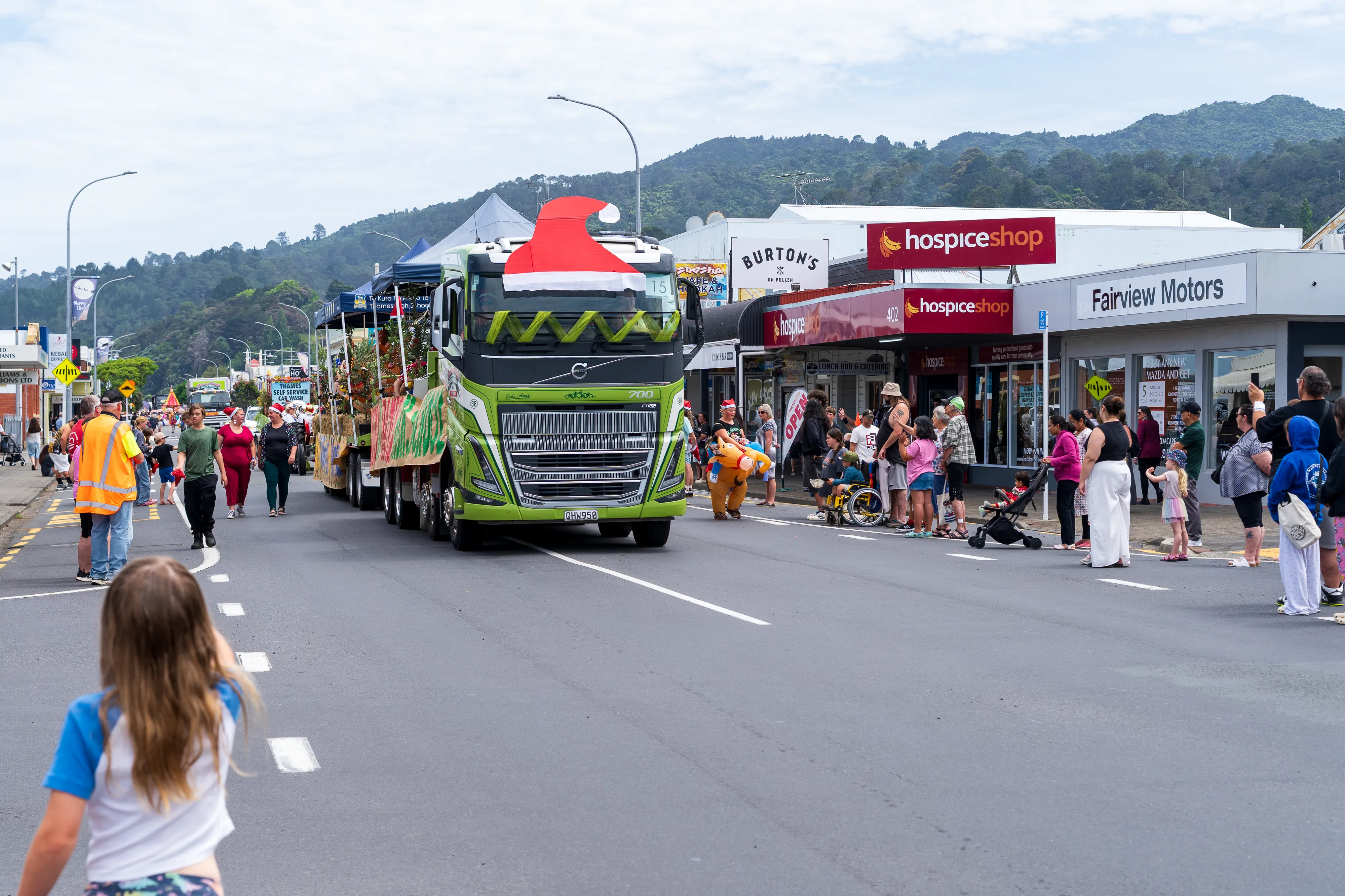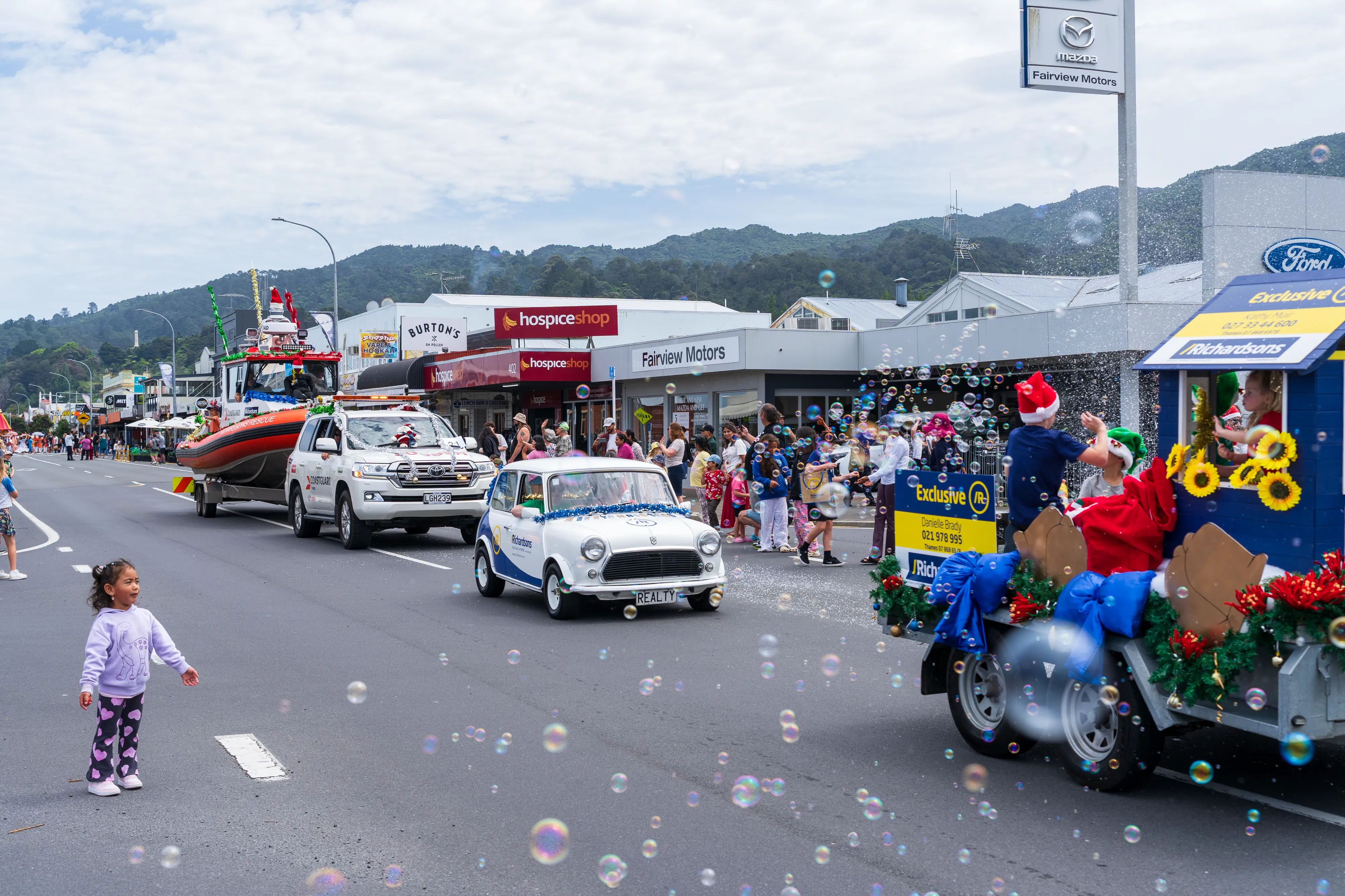 Nach dem Stopp im Besucherzentrum umrunden wir die Halbinsel einmal im Uhrzeigersinn. Los geht es in Thames, wo gerade die alljährliche Santa Parade stattfindet, bei der Vereine und Unternehmen aus der Gegend mit Wägen die Hauptstraße entlang ziehen - so wie man es bei uns von Faschings- oder Festumzügen kennt. Ein glücklicher Zufall, denn so bekommen wir hautnah mit, wie hier Weihnachten zelebriert wird - auch wenn ja noch etwas Zeit bis zum Fest ist.